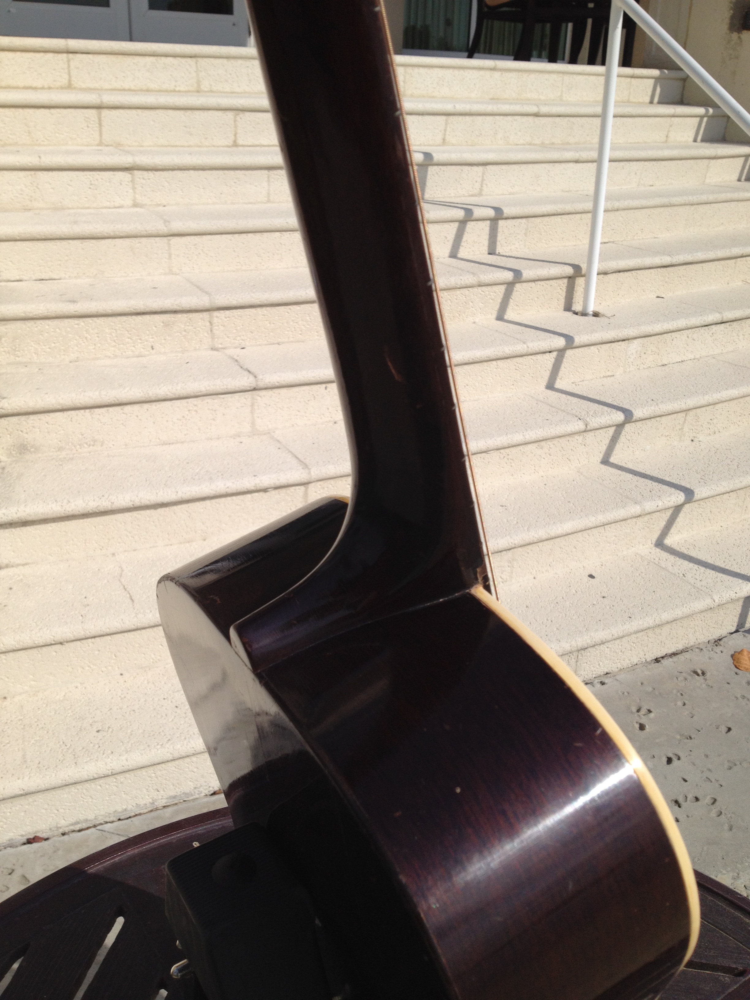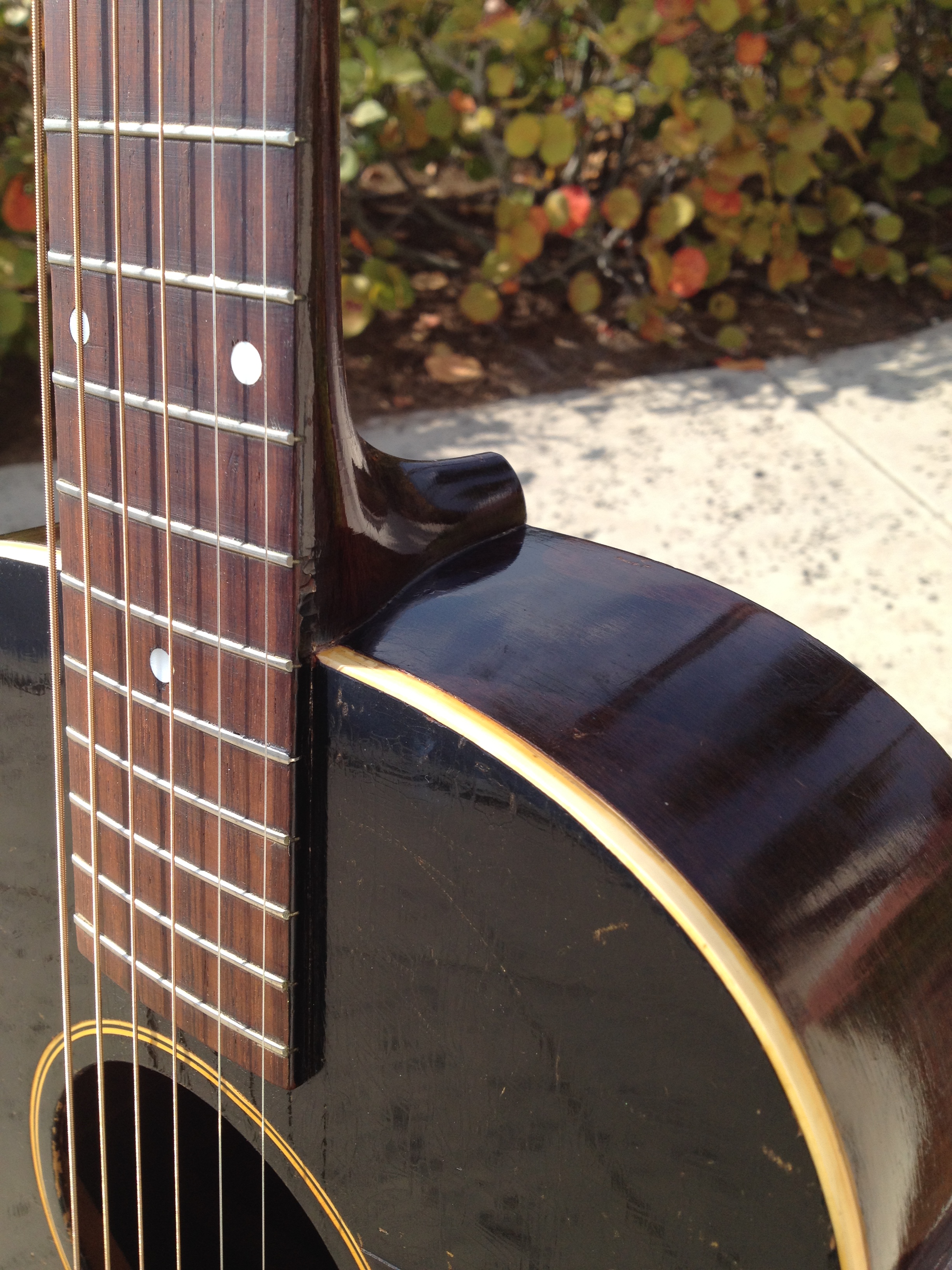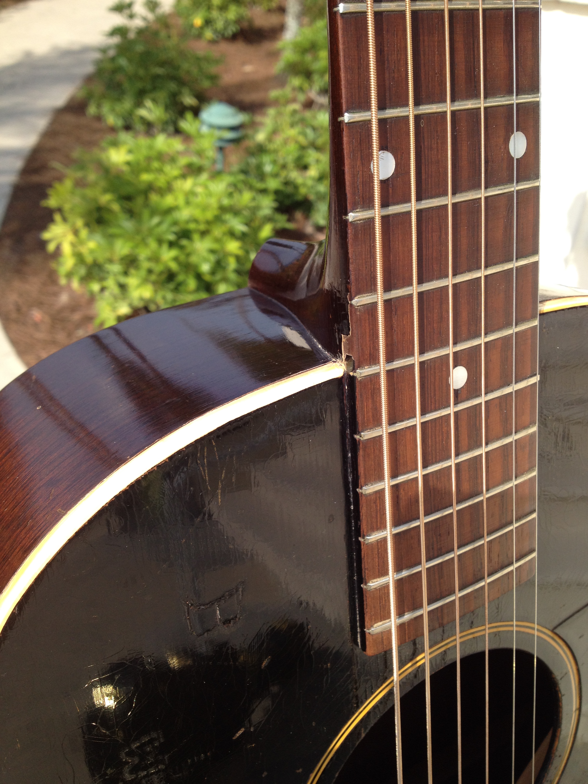 Naples Florida luthier Ross Teigen was the first repairman to work on this guitar. We could detect no prior repairs aside from a replaced bass tuner strip. Ross’s impeccable work included routine Gibson maintenance: re gluing the ends of a couple loose braces and resetting the neck. He also closed a short back crack – the guitar is otherwise crack-free.