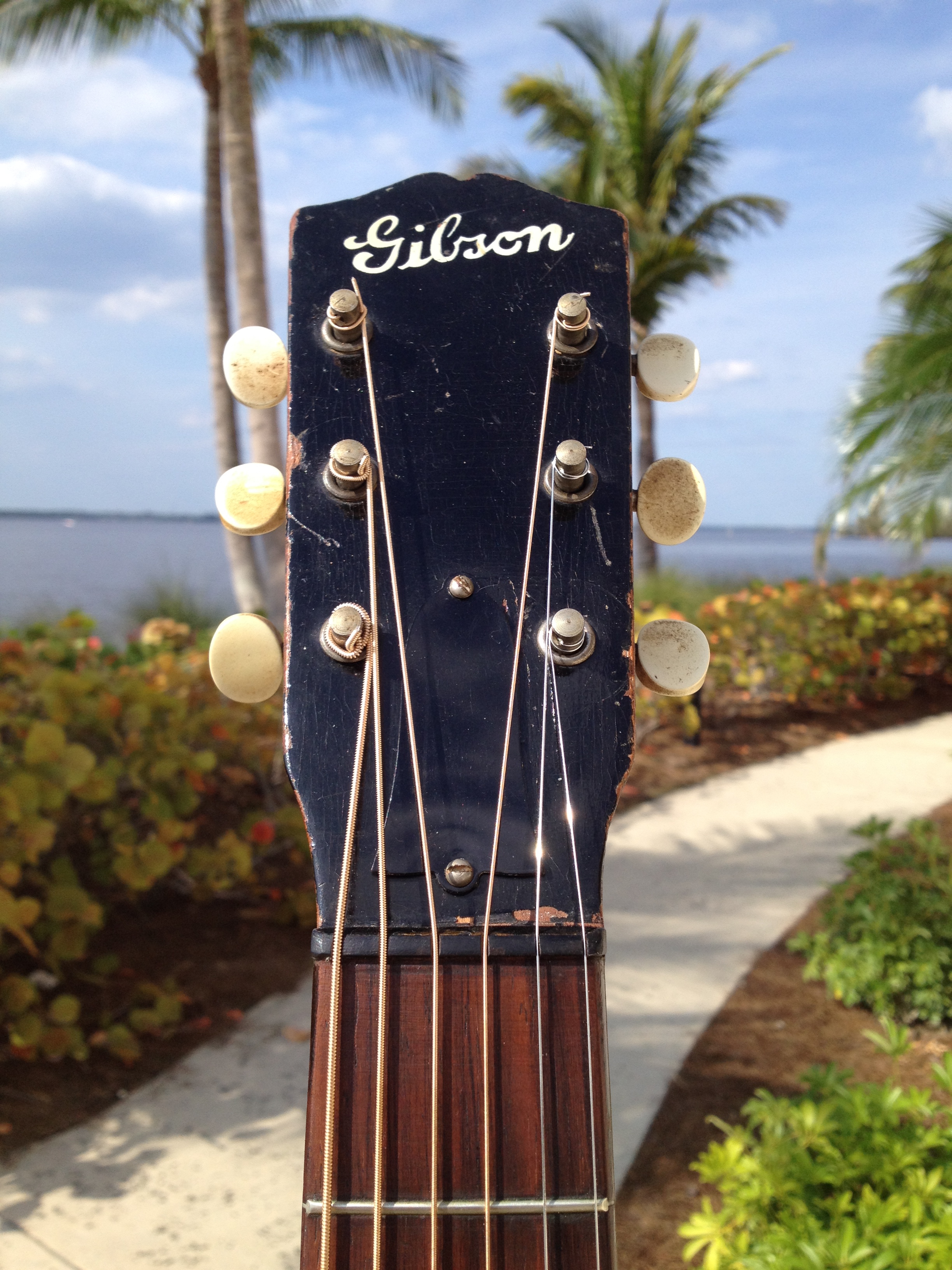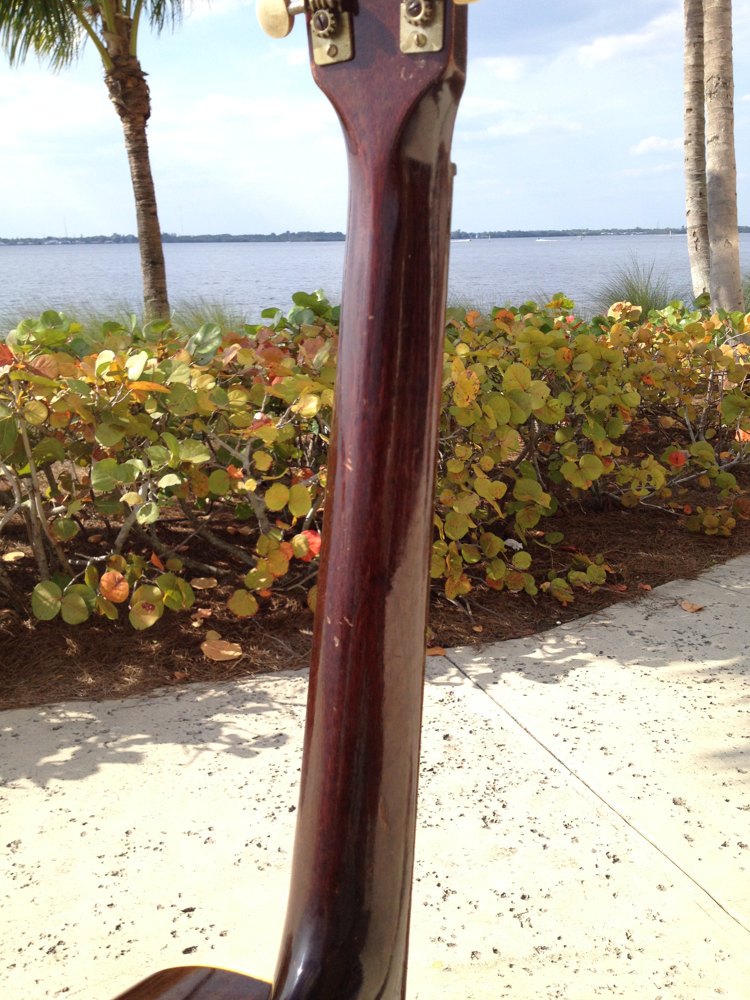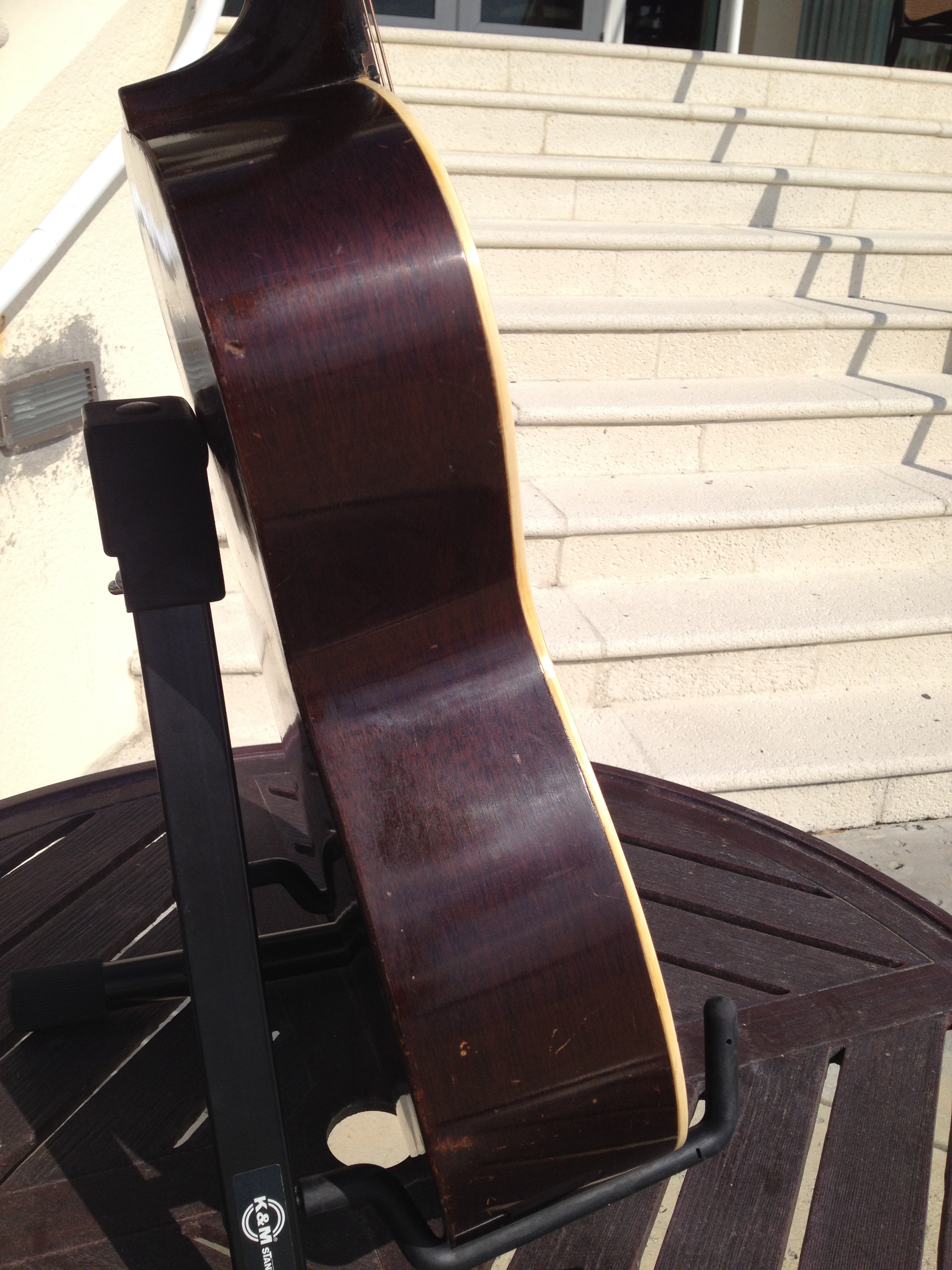 Naples Florida luthier Ross Teigen was the first repairman to work on this guitar. We could detect no prior repairs aside from a replaced bass tuner strip. Ross’s impeccable work included routine Gibson maintenance: re gluing the ends of a couple loose braces and resetting the neck. He also closed a short back crack – the guitar is otherwise crack-free.