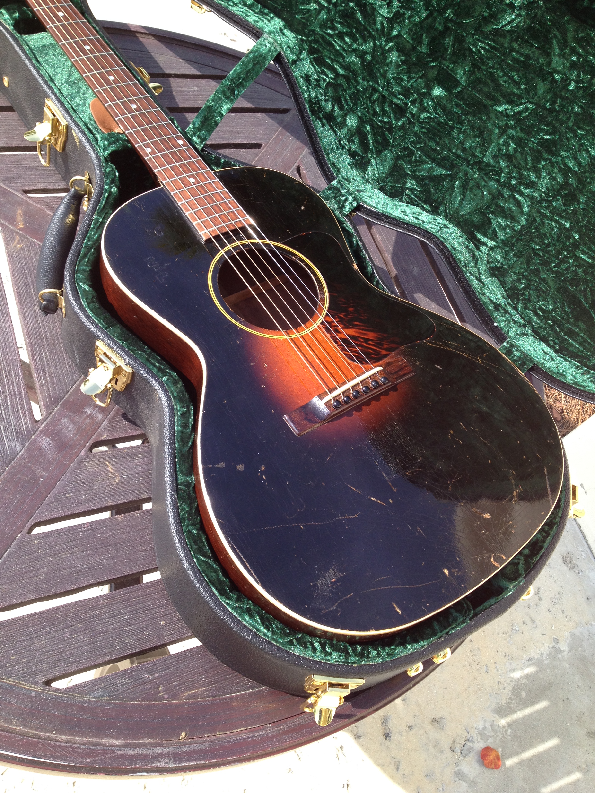 A look inside the sound hole of this small sunburst L-00 reveals solid lining, a Gibson build detail specific to only 1933 and 34. The factory order number points to 1934 and that’s confirmed by the lovely small sunburst pattern of the original finish. We prize these early 14 fret L-00 guitars for their light build, beautiful burst, and lively tone.