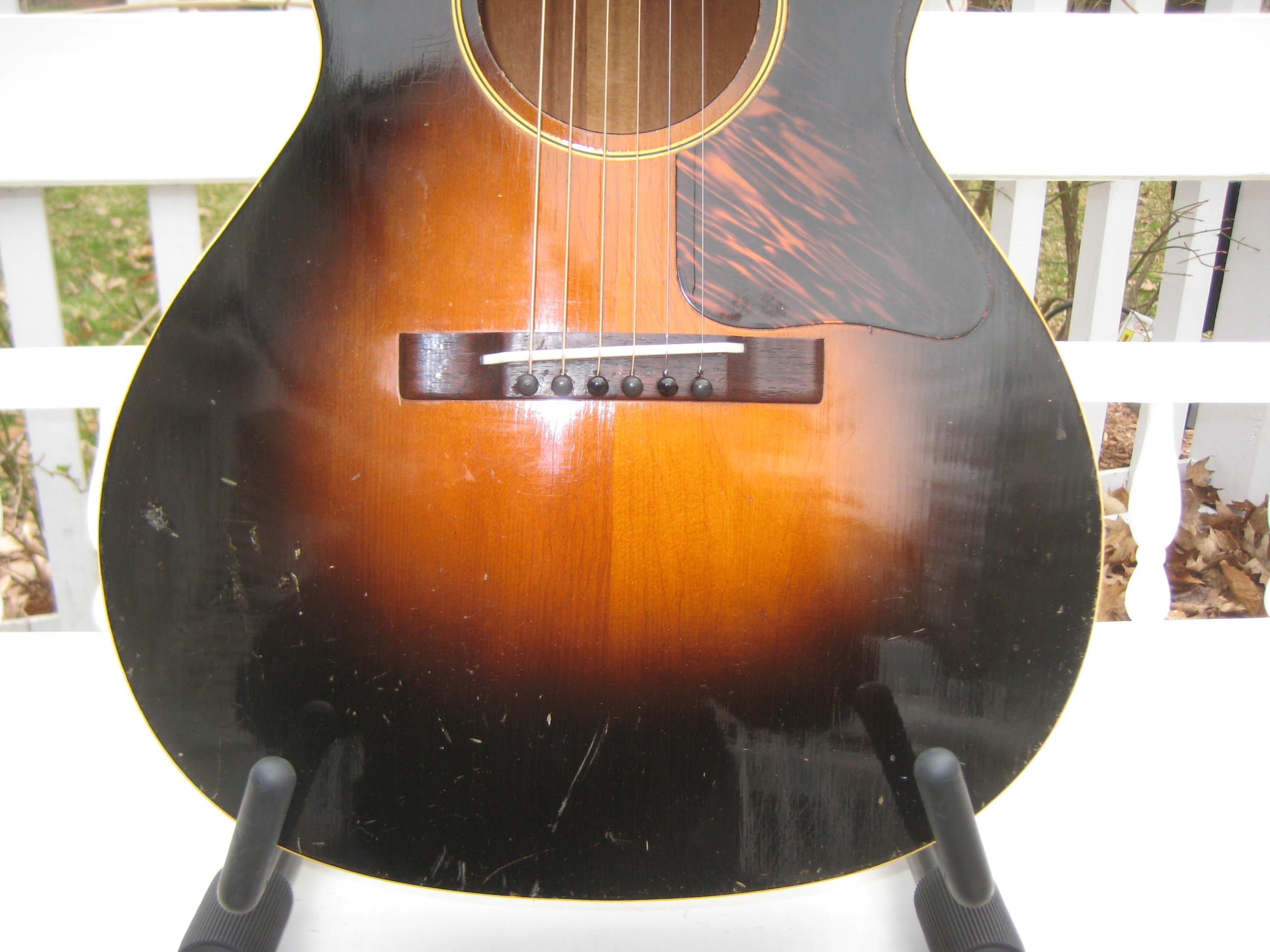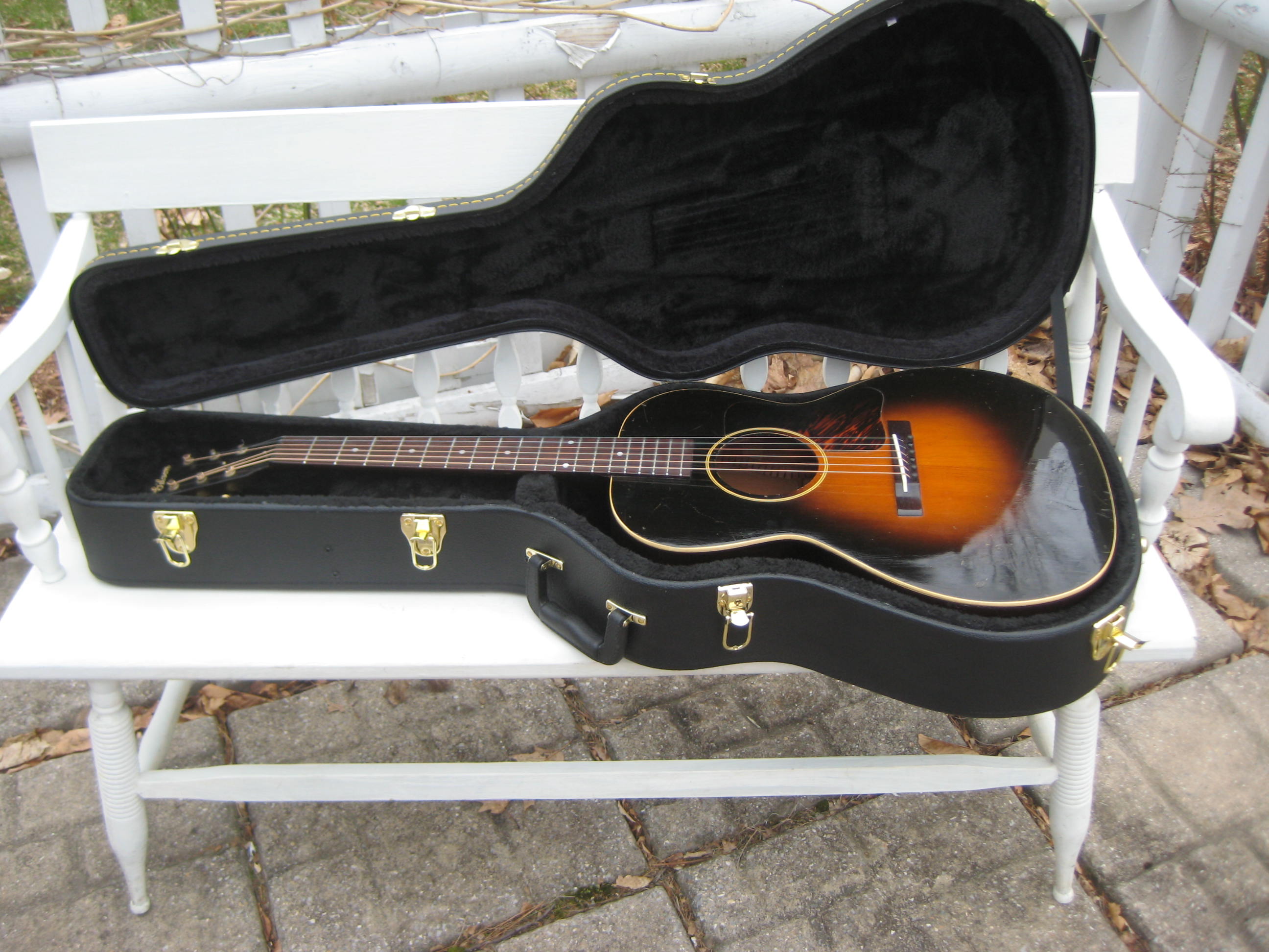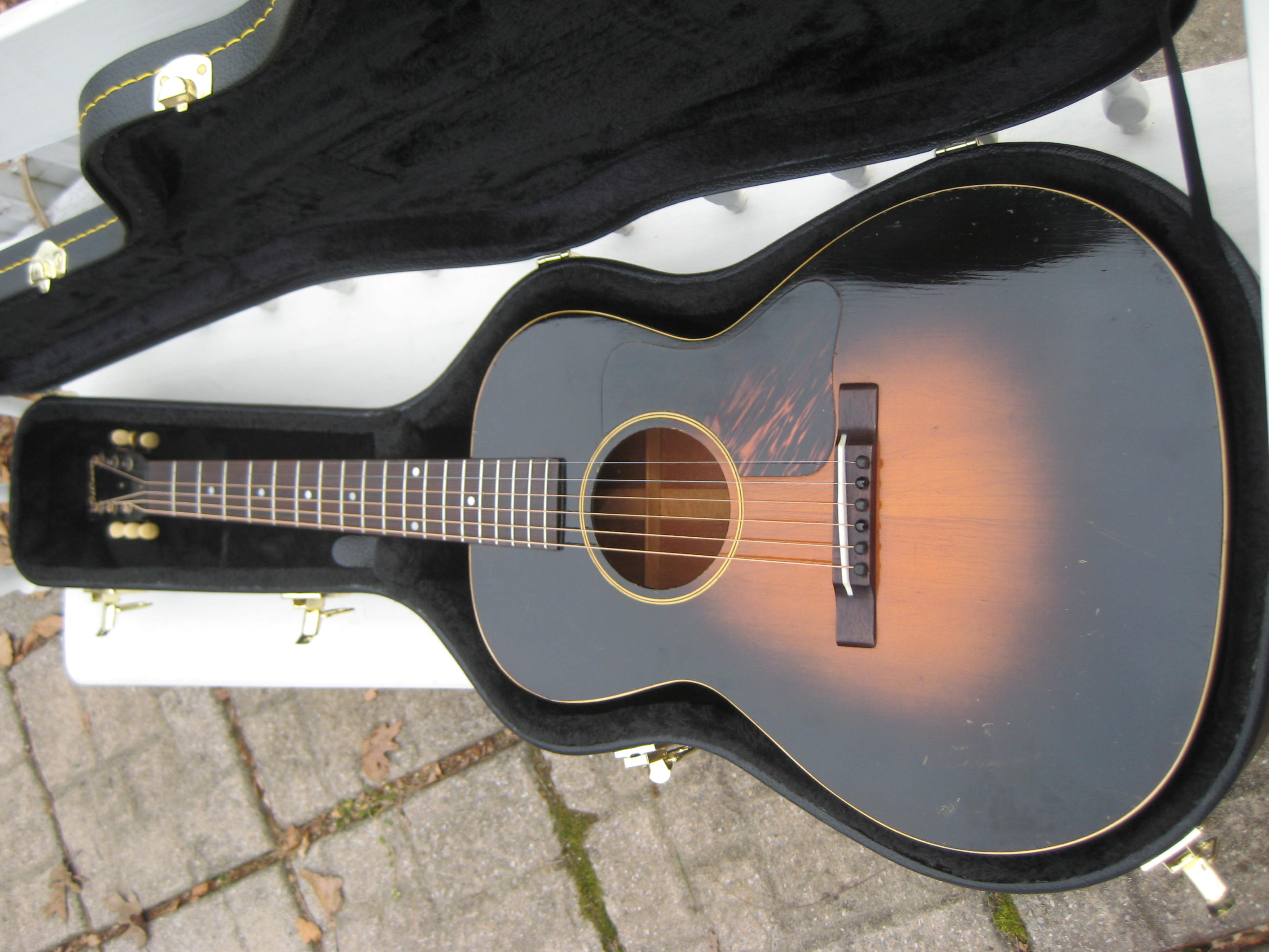 1935 Gibson L-00. 40 years under the bed, an absolutely stunning all-original Totally crack free example with some minor dings and old scratches but no refin or funny business. Nice small-medium burst. Never seen or circulated on the net until now. Impeccable neck set and set up by David Hatchard, one of New England’s most skilled luthiers.