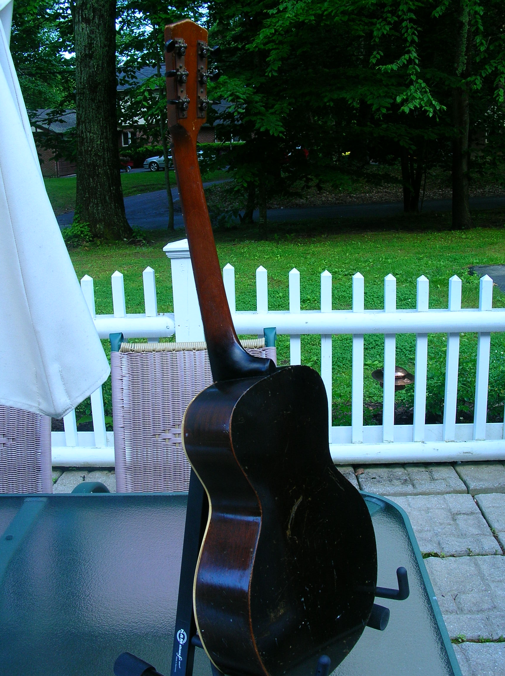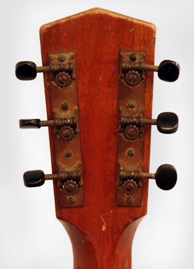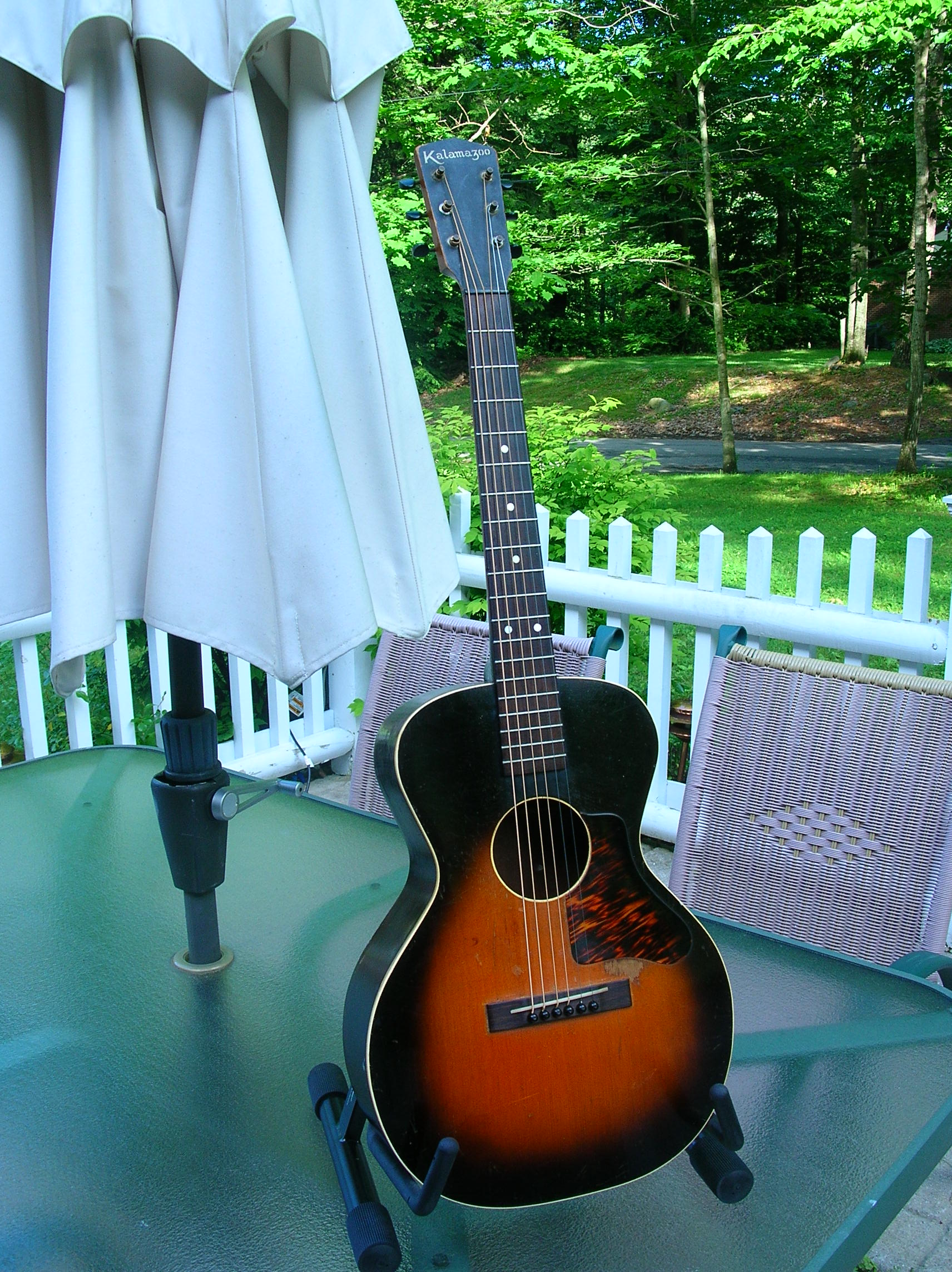 Of course it can be strung with a normal set of light gauge strings and played conventionally. This little 3/4 guitar was a later addition to the Kalamazoo line, available from 1937-41. Built on the pattern of the 1920’s Gibson TG-1 Tenor guitar body, the Sport Model is a dainty girlie girl tight-waisted design.