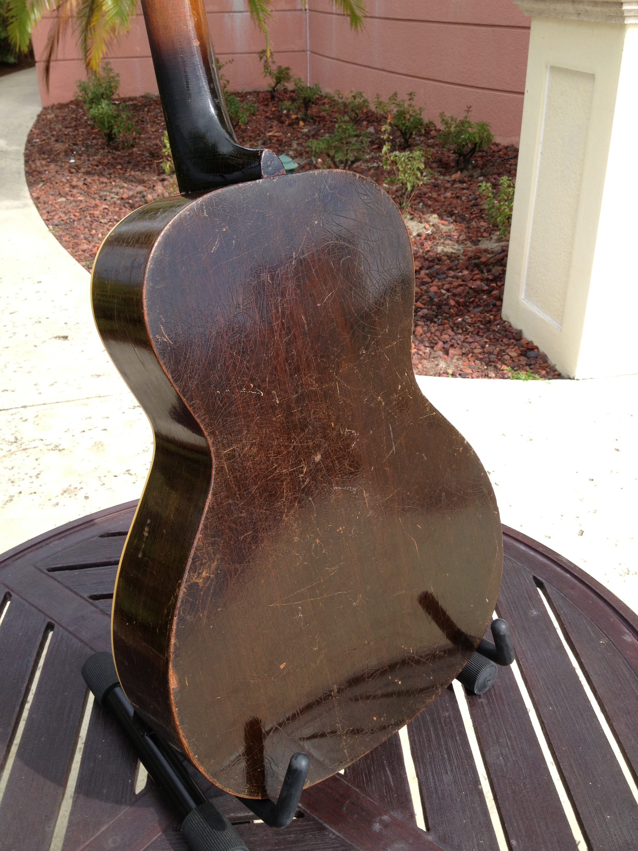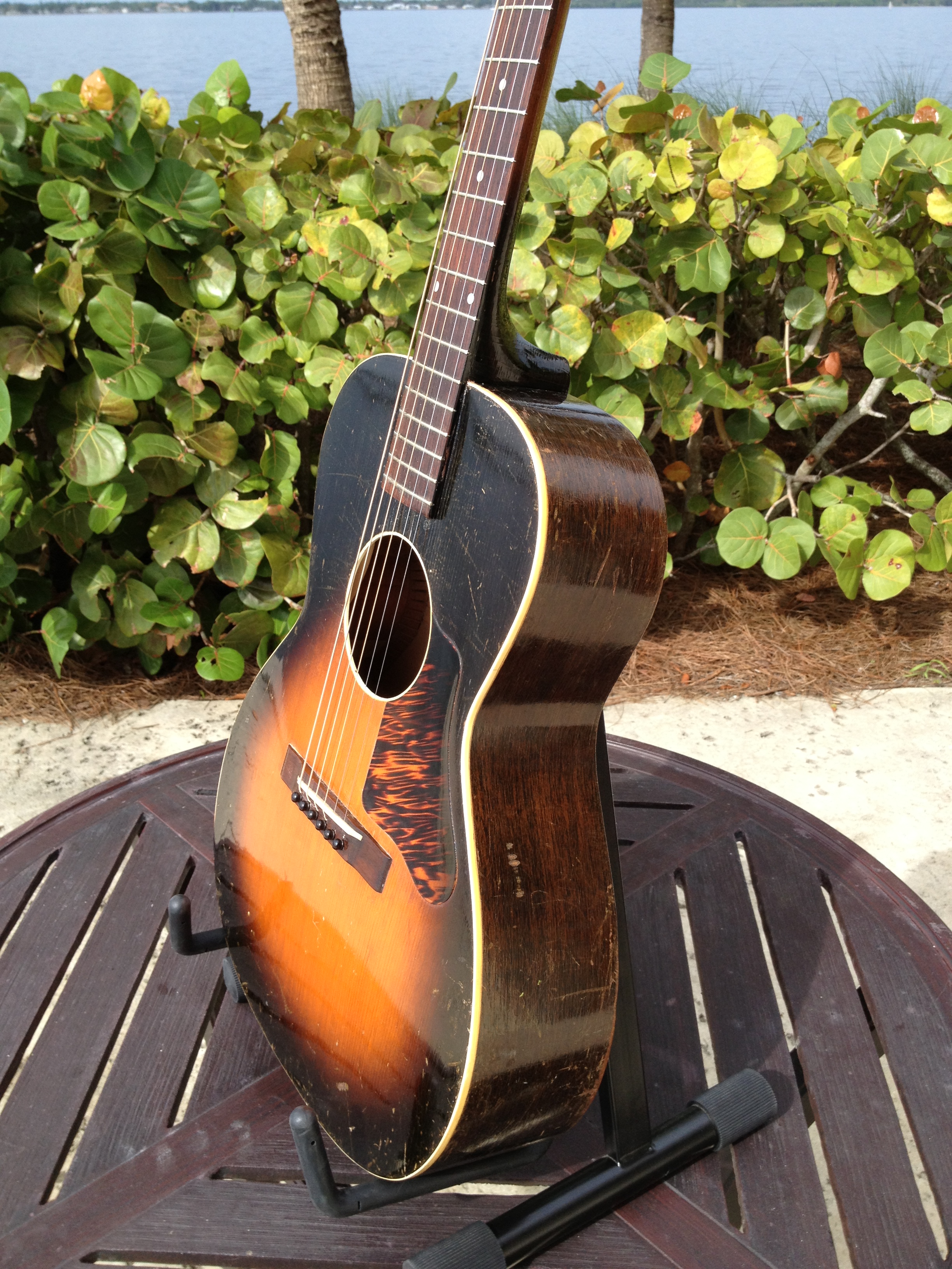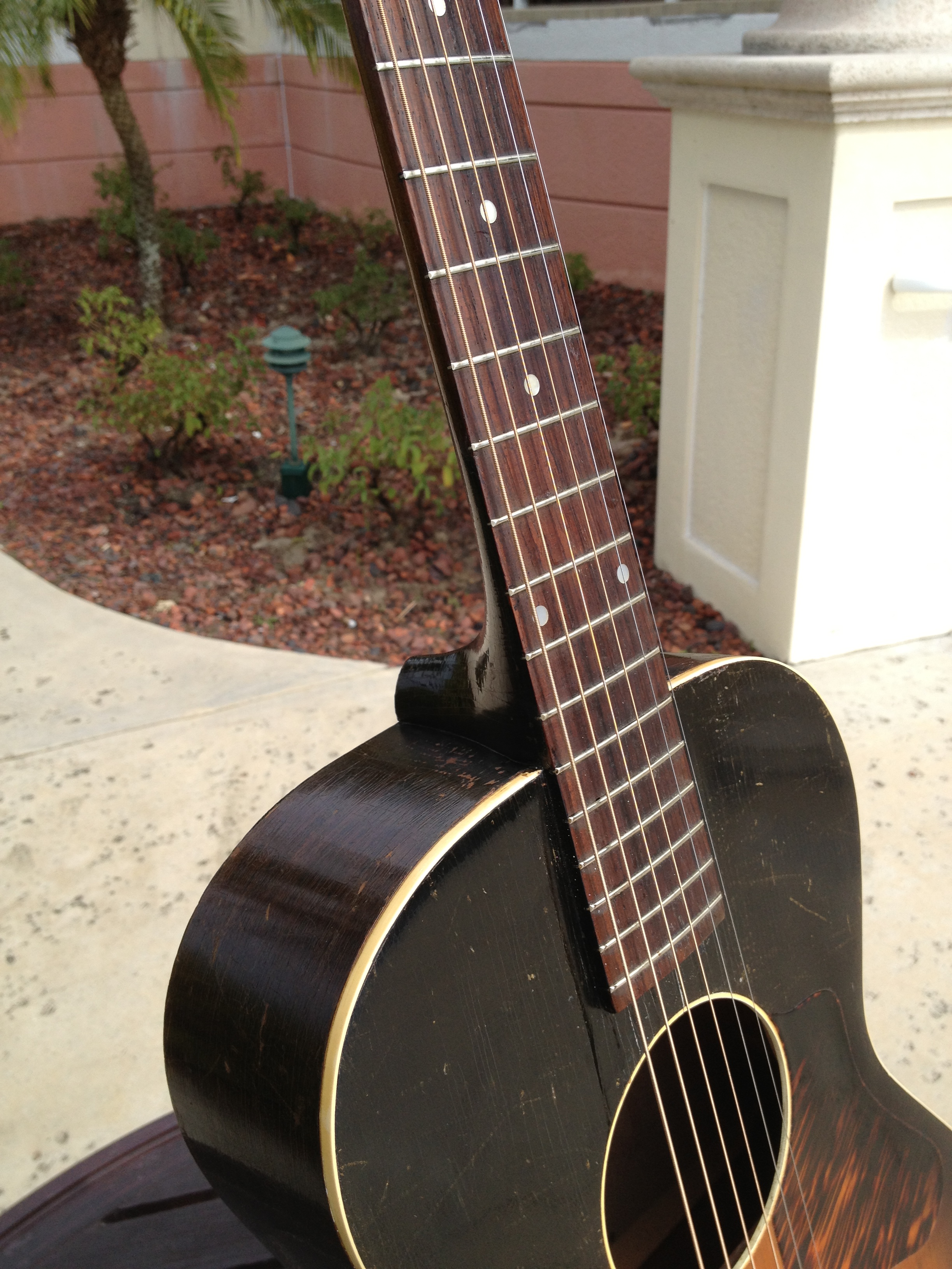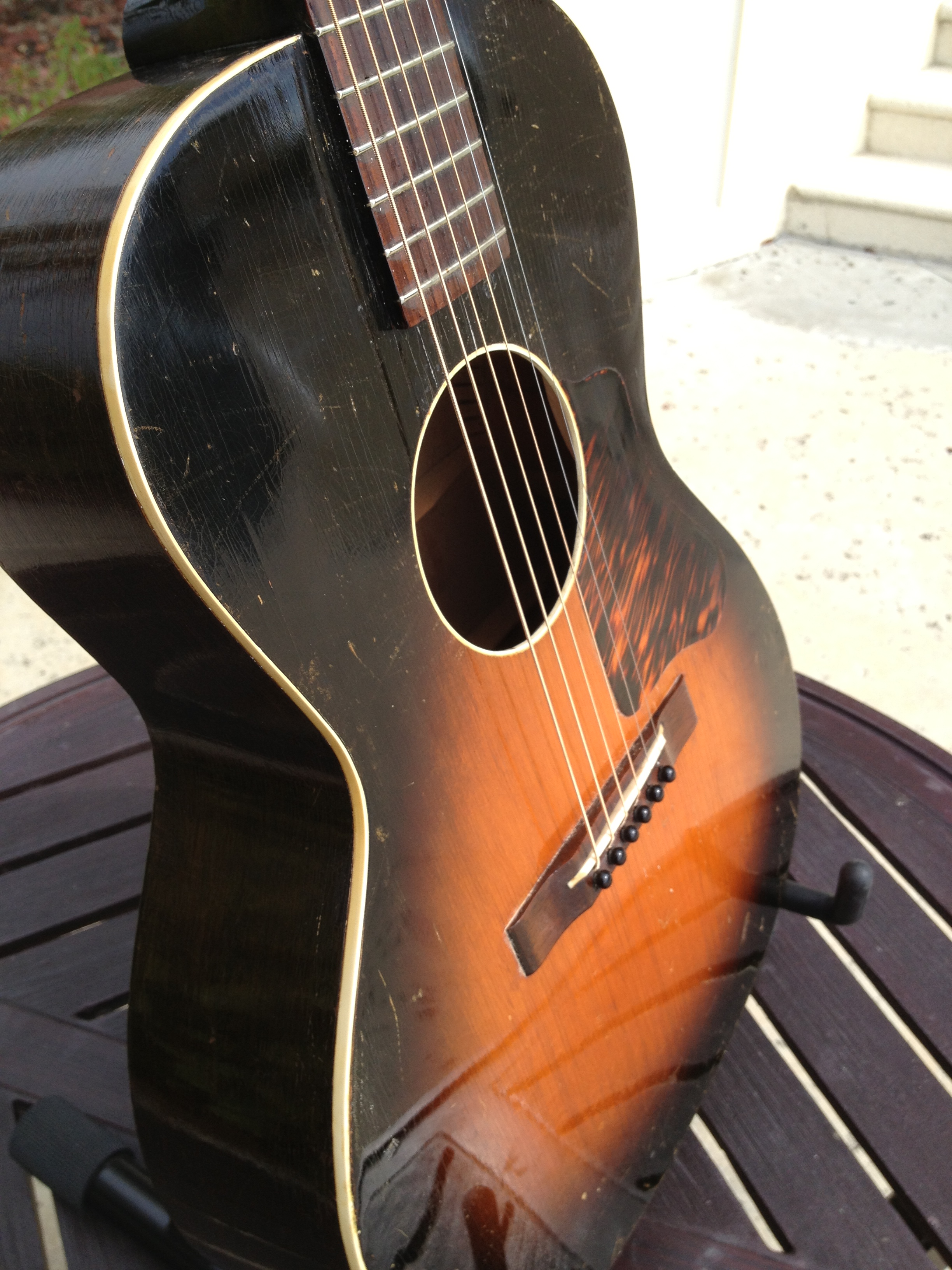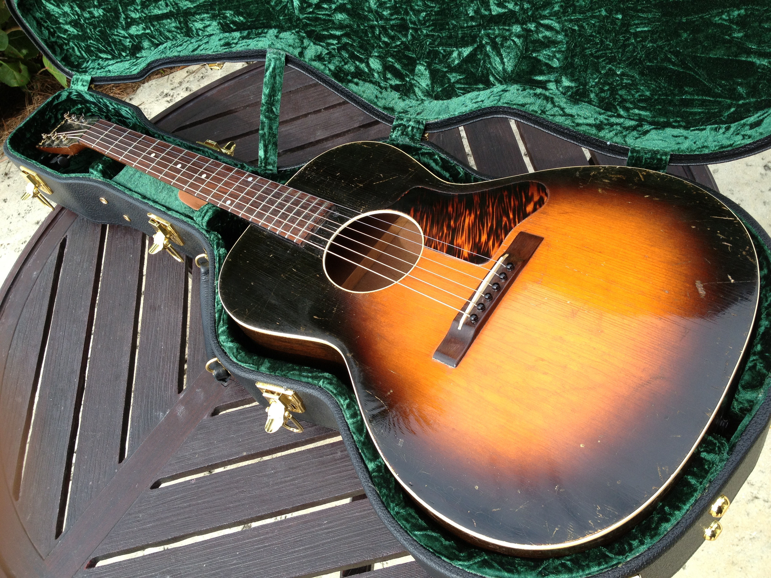 And such the survivor she is, all there and original to the last fret and all cool! Based on the Gibson L-00, yet ladder braced. A stunning depression era legendary finger style / slide blues picker just like Robert Johnson played. Totally cool and did I say she is simply … beautiful?