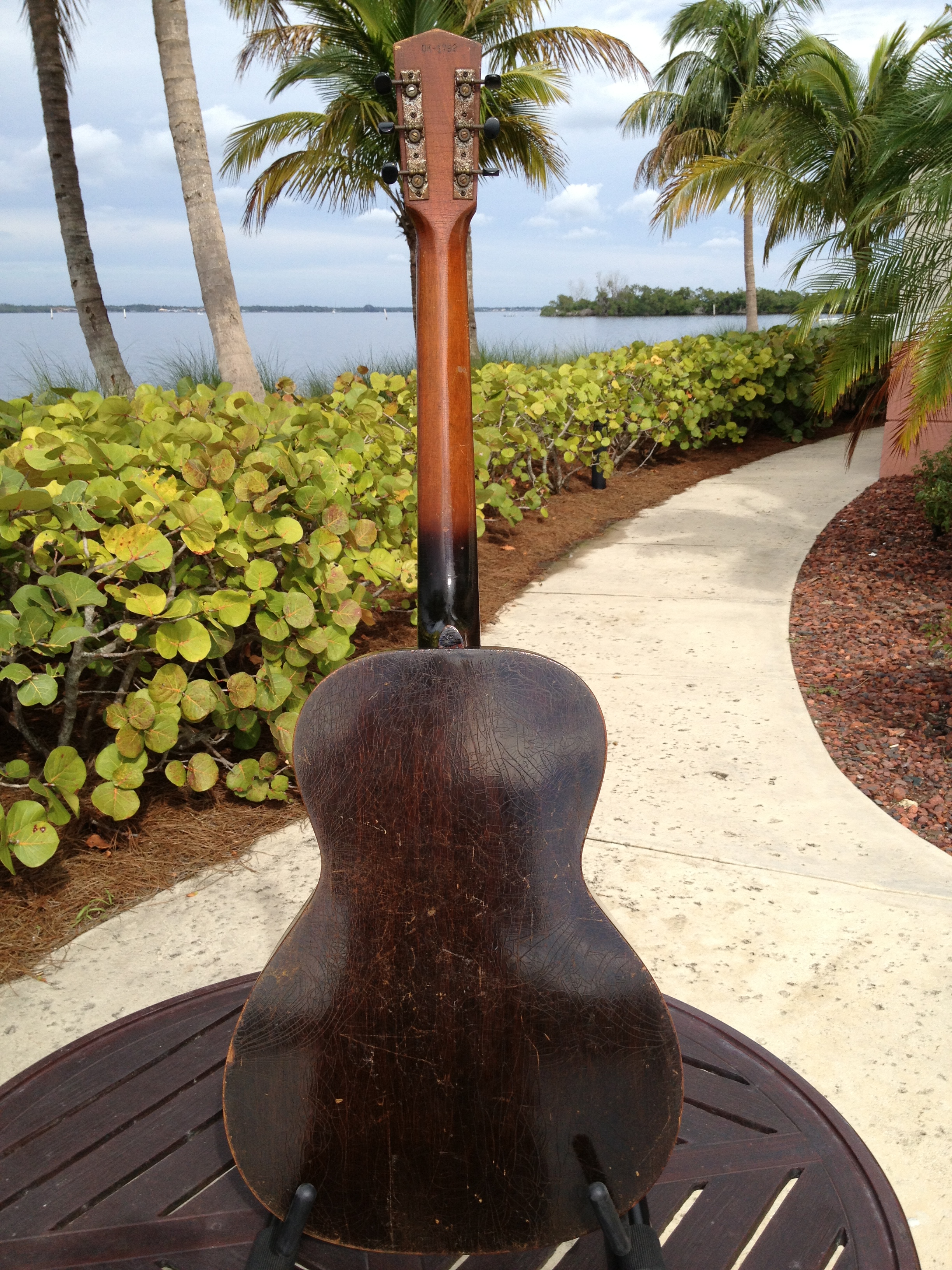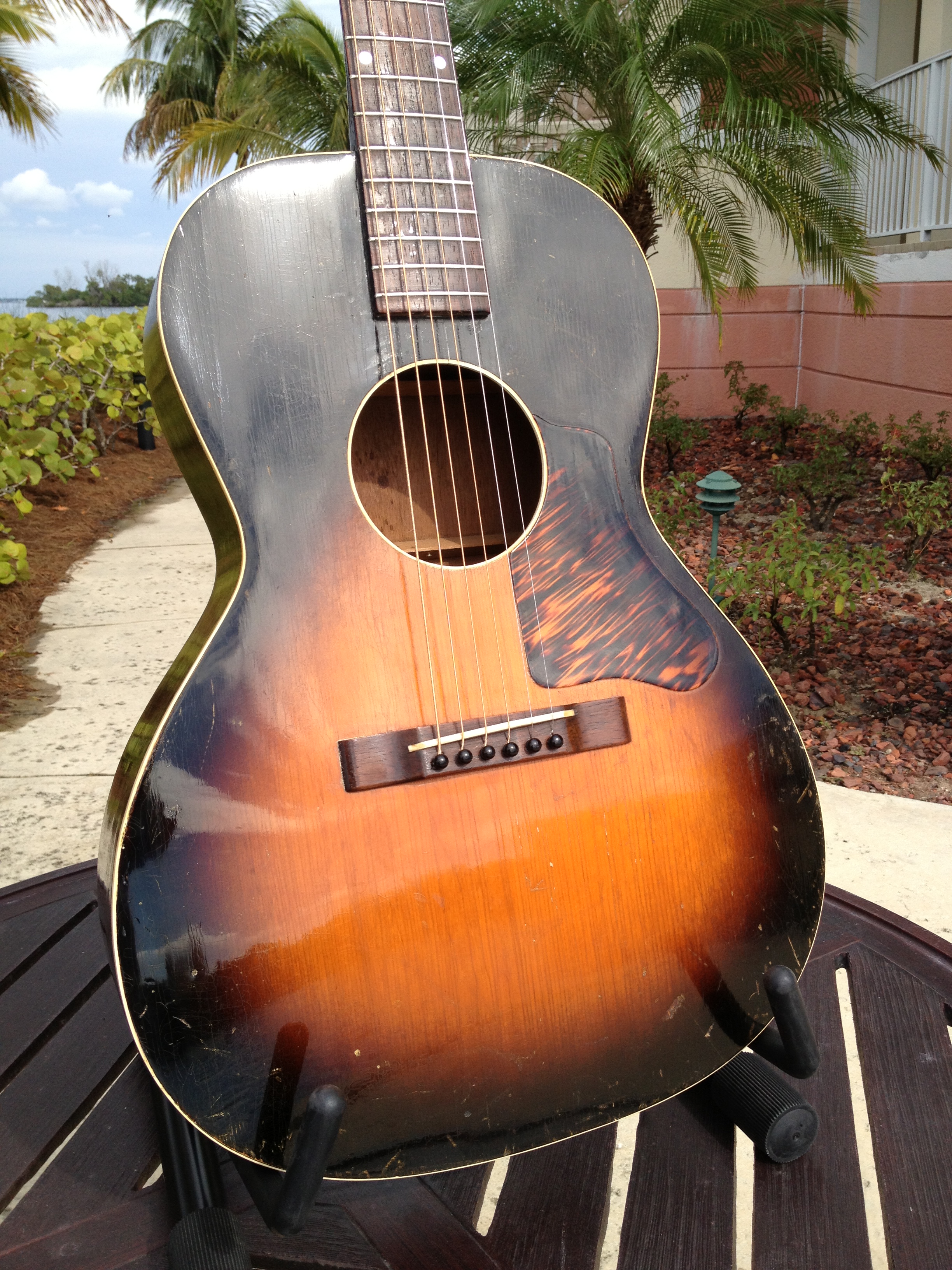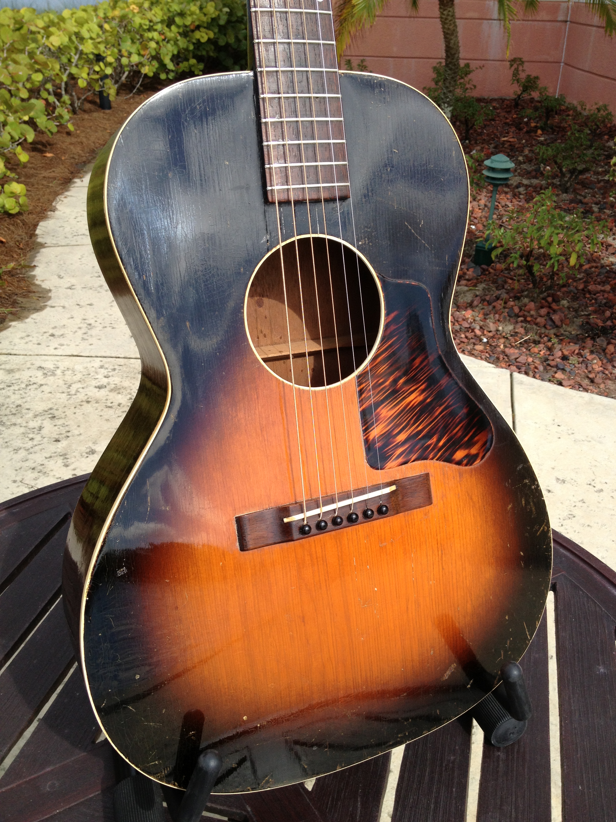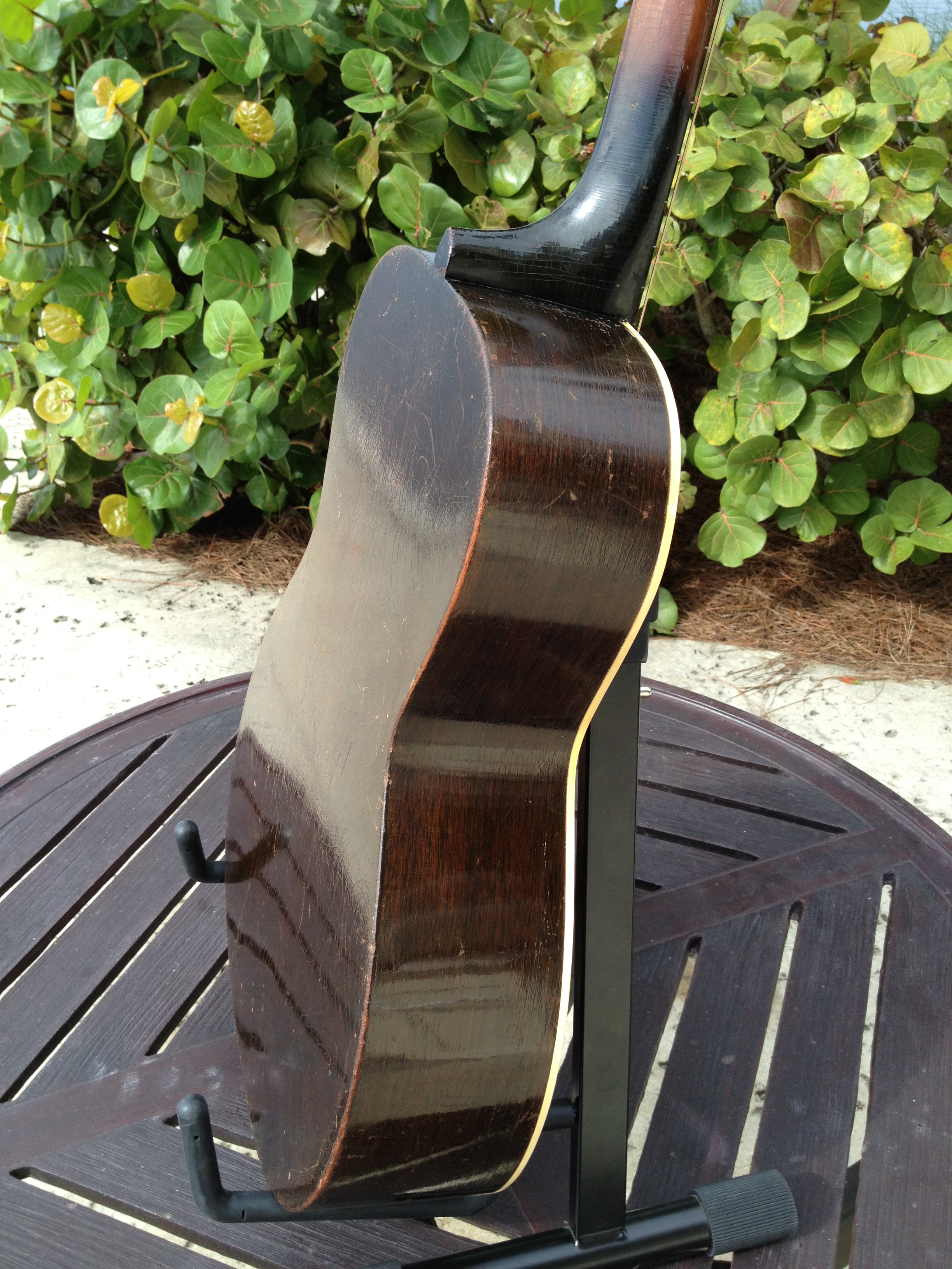 And such the survivor she is, all there and original to the last fret and all cool! Based on the Gibson L-00, yet ladder braced. A stunning depression era legendary finger style / slide blues picker just like Robert Johnson played. Totally cool and did I say she is simply … beautiful?