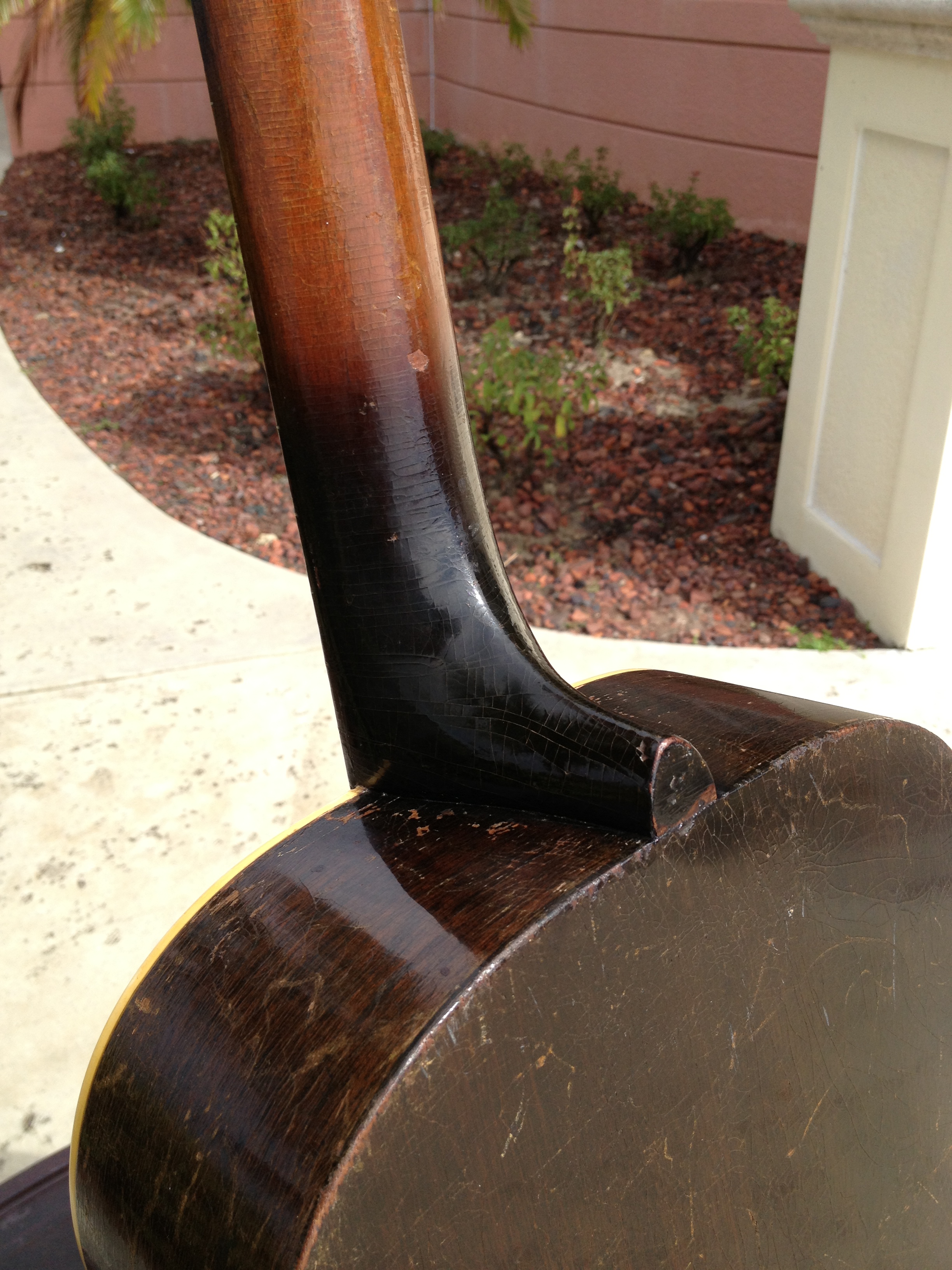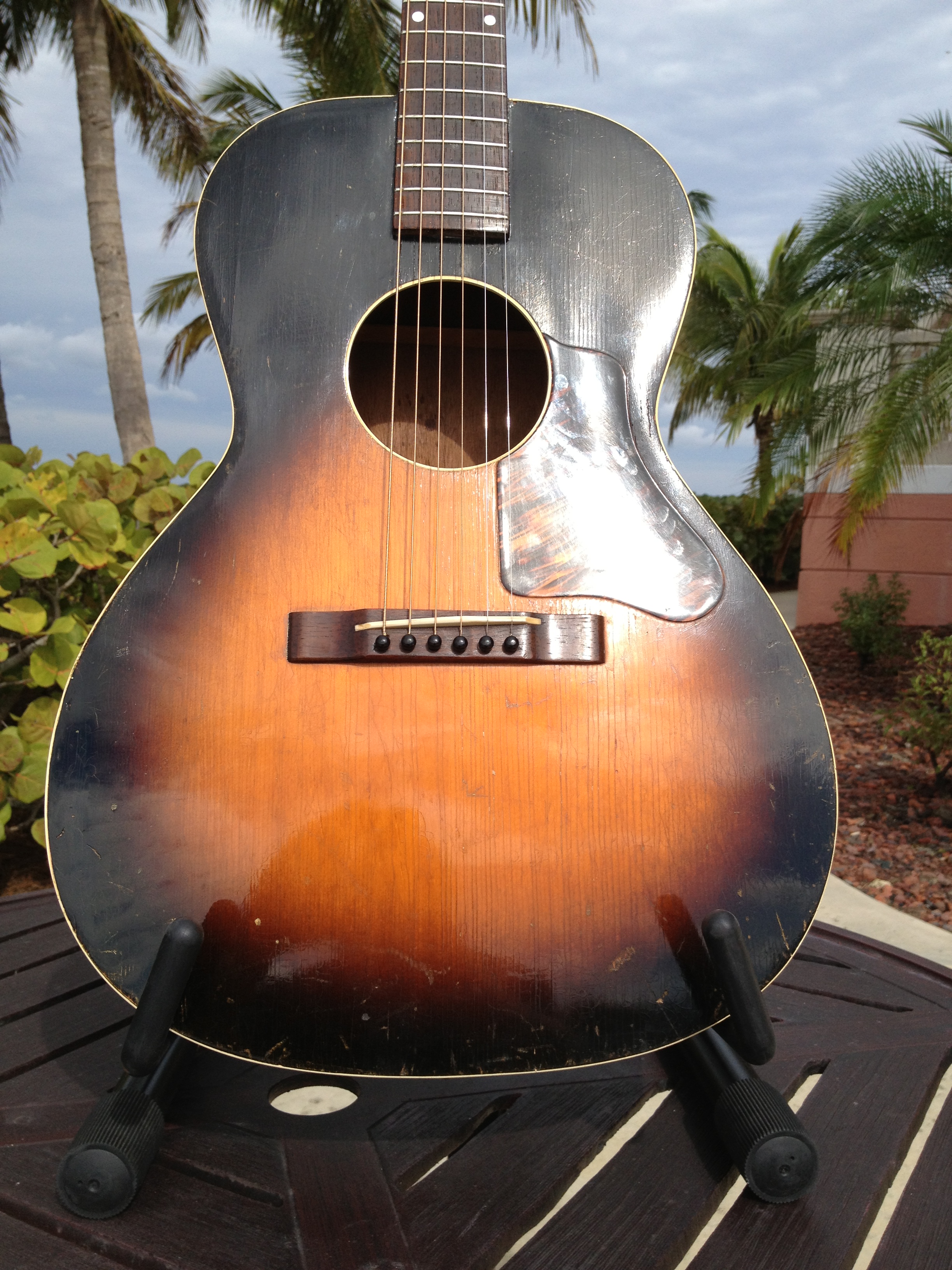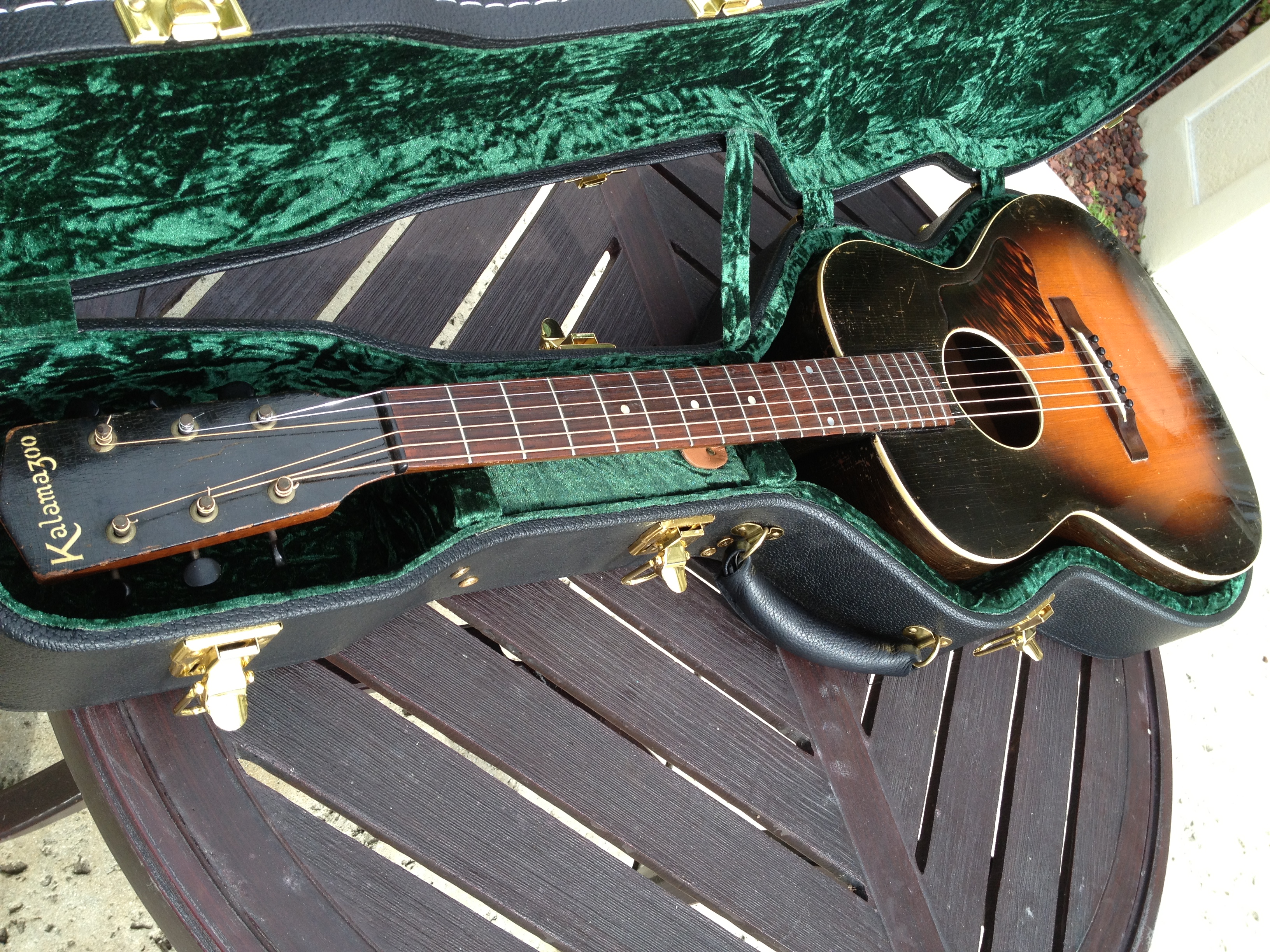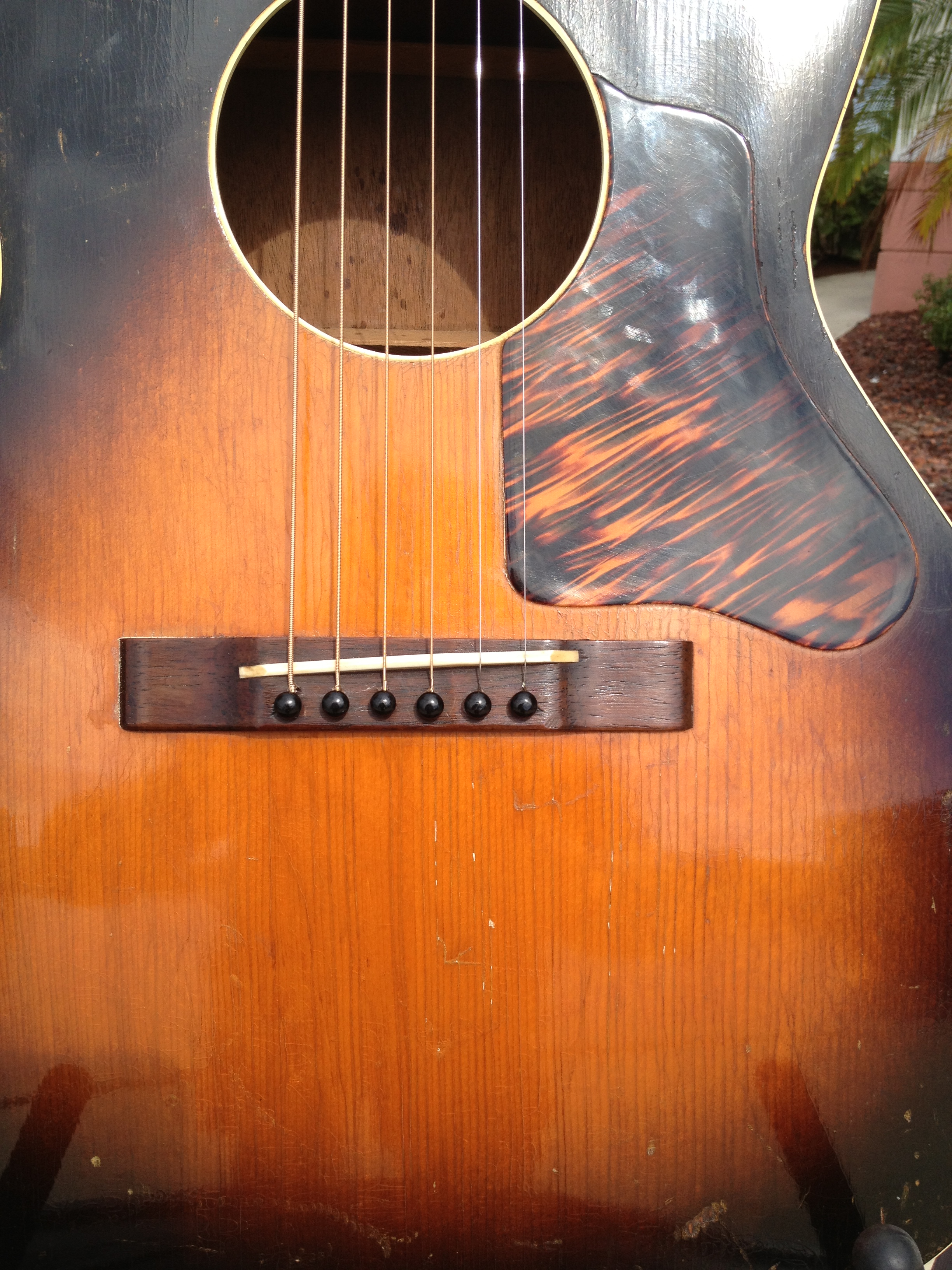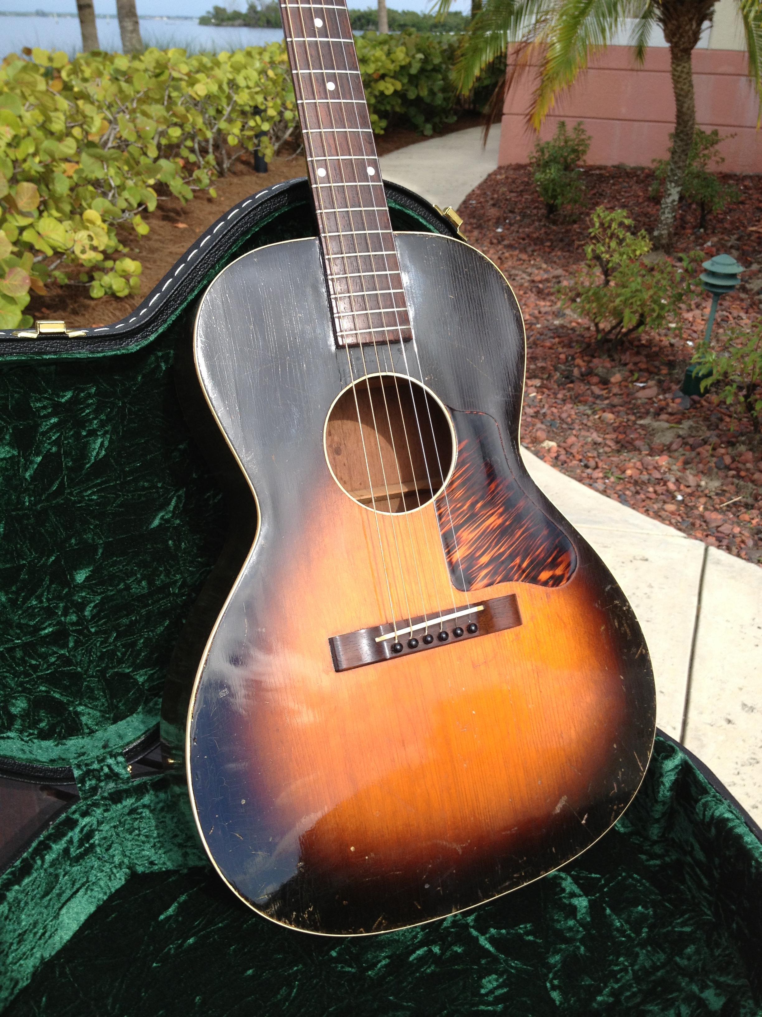 And such the survivor she is, all there and original to the last fret and all cool! Based on the Gibson L-00, yet ladder braced. A stunning depression era legendary finger style / slide blues picker just like Robert Johnson played. Totally cool and did I say she is simply … beautiful?