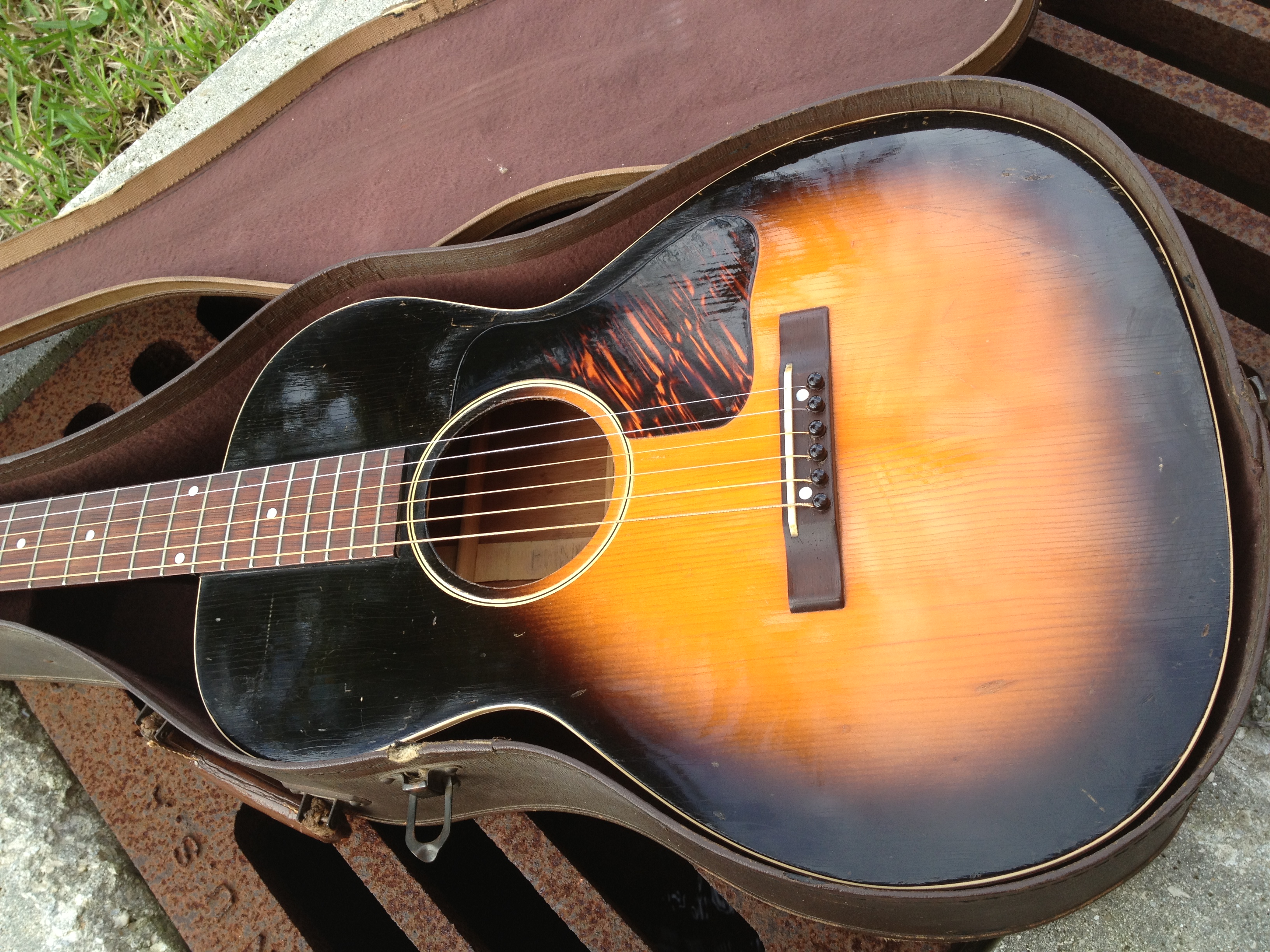 The FON number dates this exceptionally clean HG-00 to 1939. The “Made in the USA” stamp below it indicates an export model, and Gibson records confirm this guitar was sold new through a shop in Toronto, Canada with a Geib Challenge case.