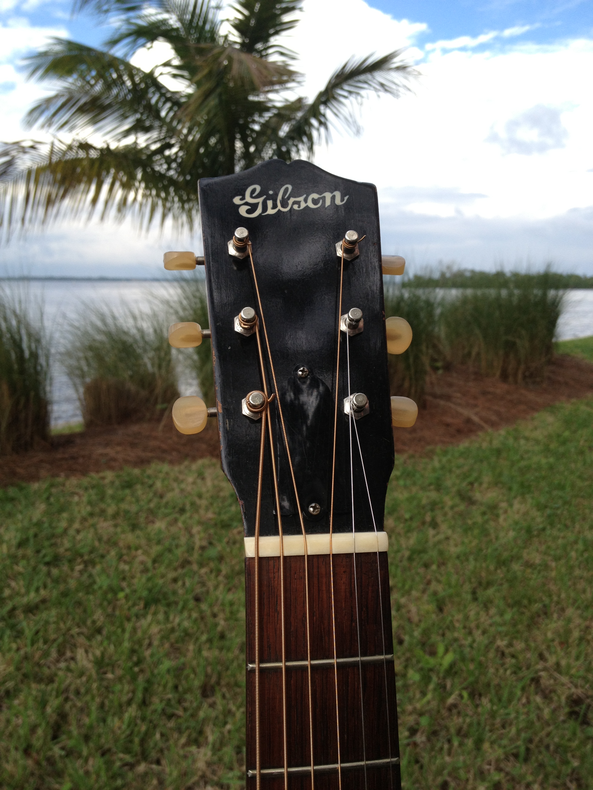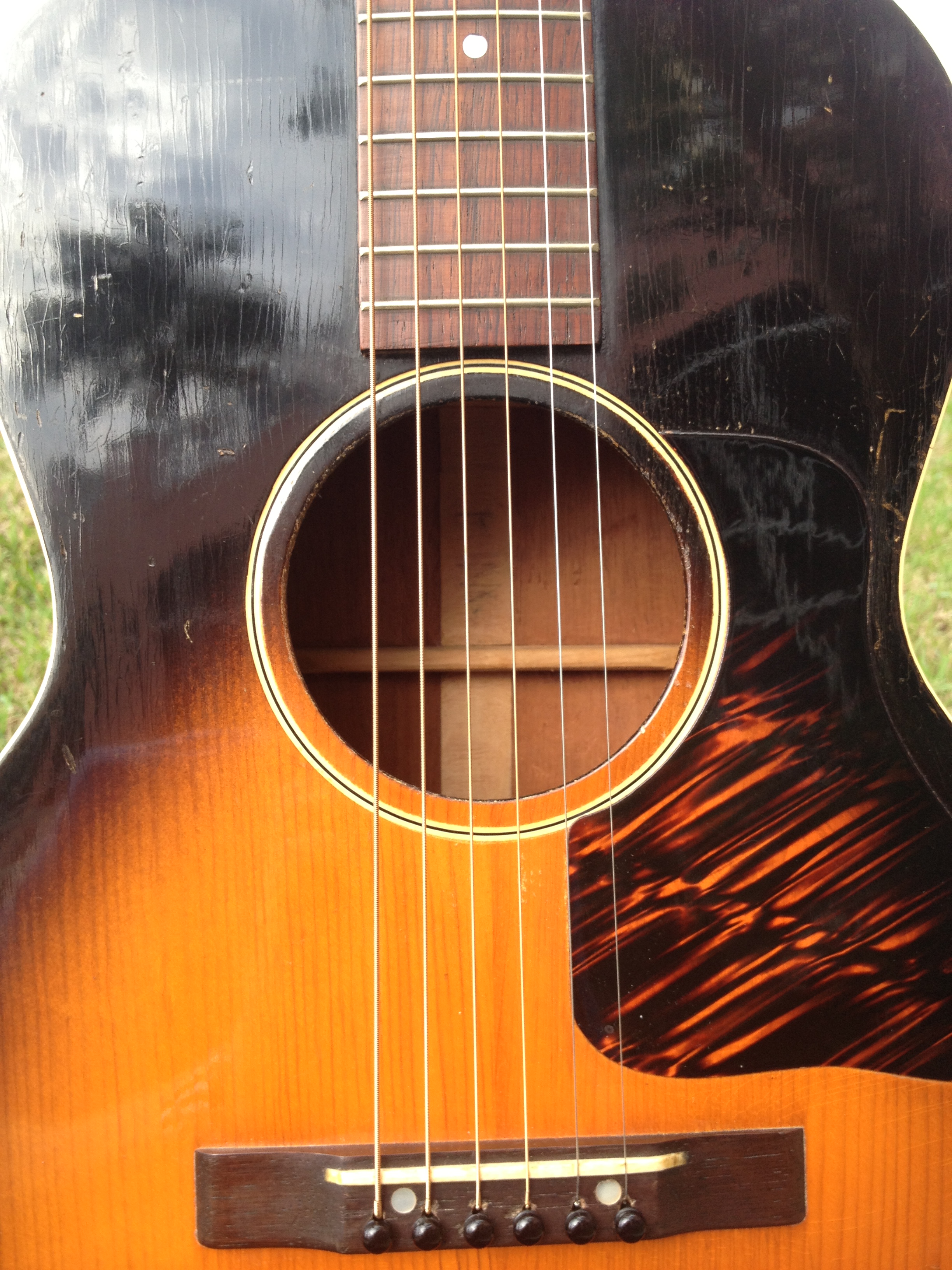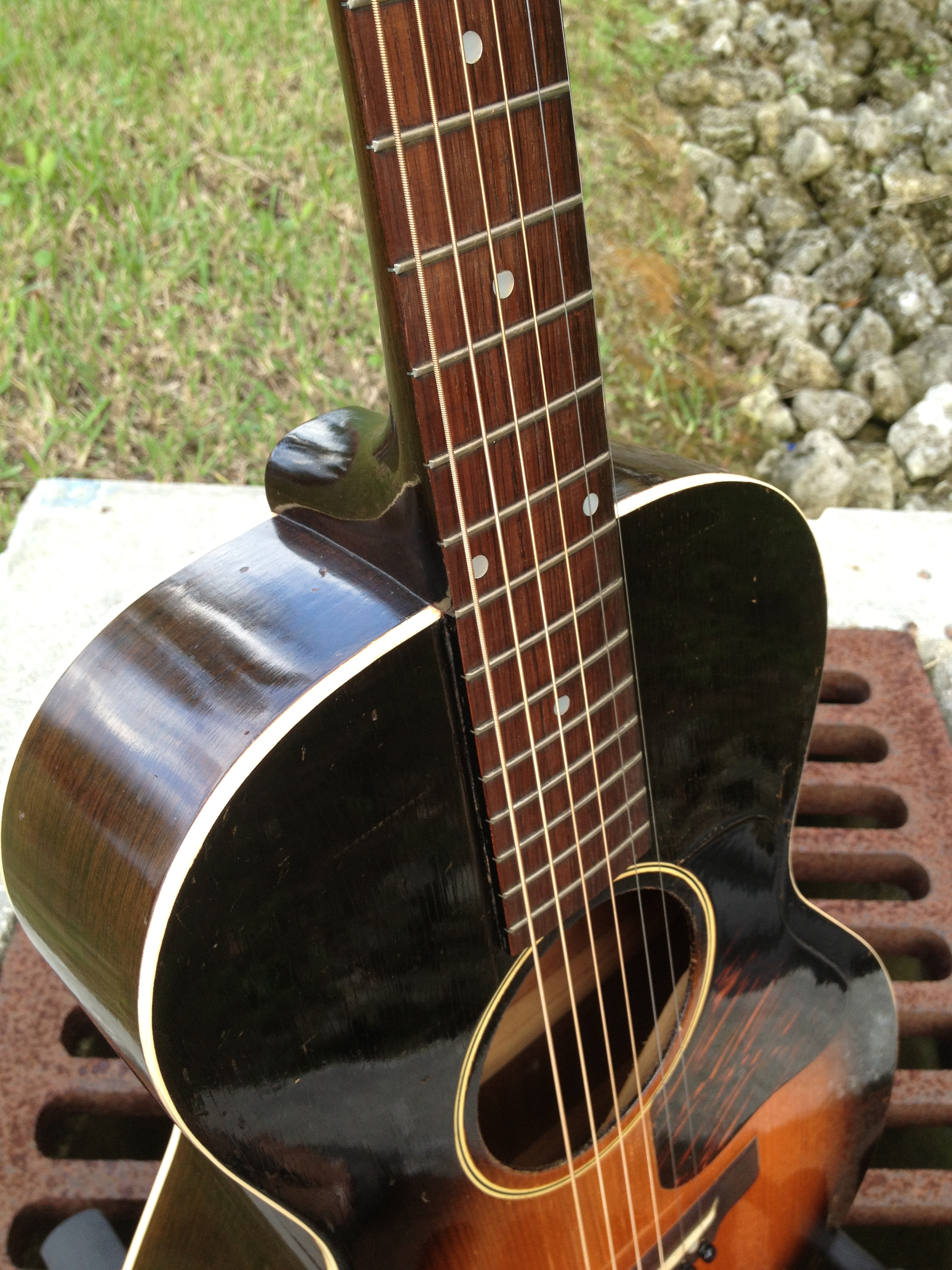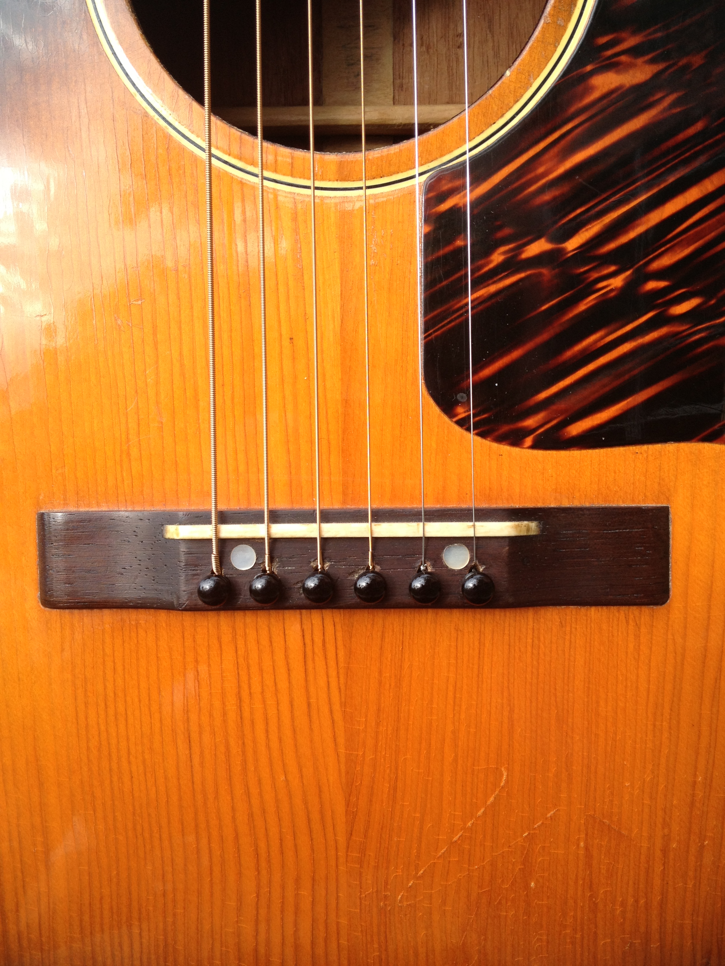 At the time this guitar was built, Hawaiian music was still in vogue and this guitar had a tall bone nut for lap slide play. That original nut is now in the case pocket and our luthier David Hatchard has set the guitar up for standard Spanish play. His work involved fitting an aged bone nut of proper height, re shaping and intonating the original bone saddle to insure a proper set up. The original bridge was just too gorgeous to modify. You’ll notice that the bridge bolts (covered by the pearl dots) are in a slightly different place on a Hawaiian Gibson. David was able to bring the intonation within tolerance without harming the originality. The frets have hardly been touched and the back of the neck is very clean as well, all because of its original Hawaiian heritage.