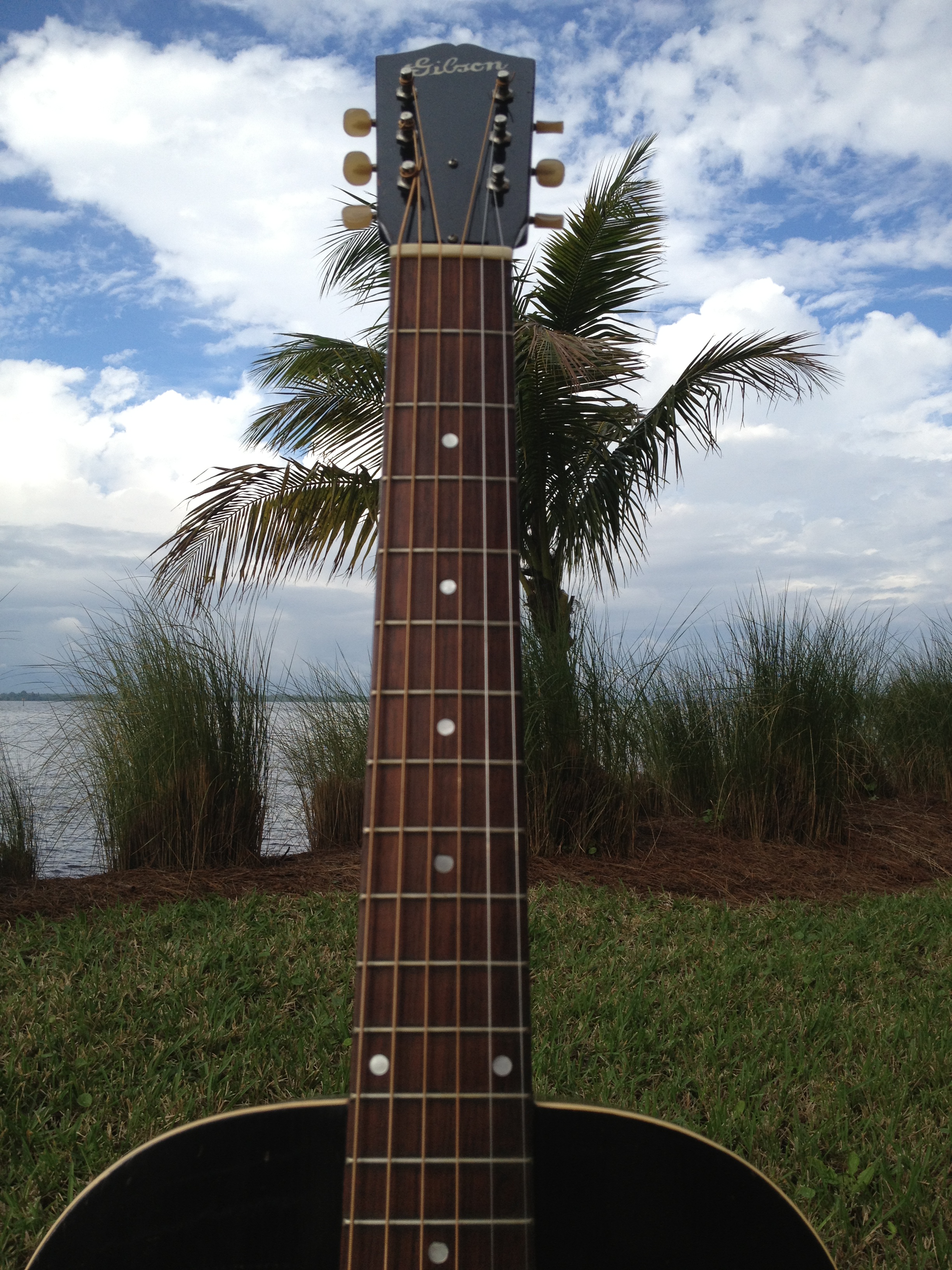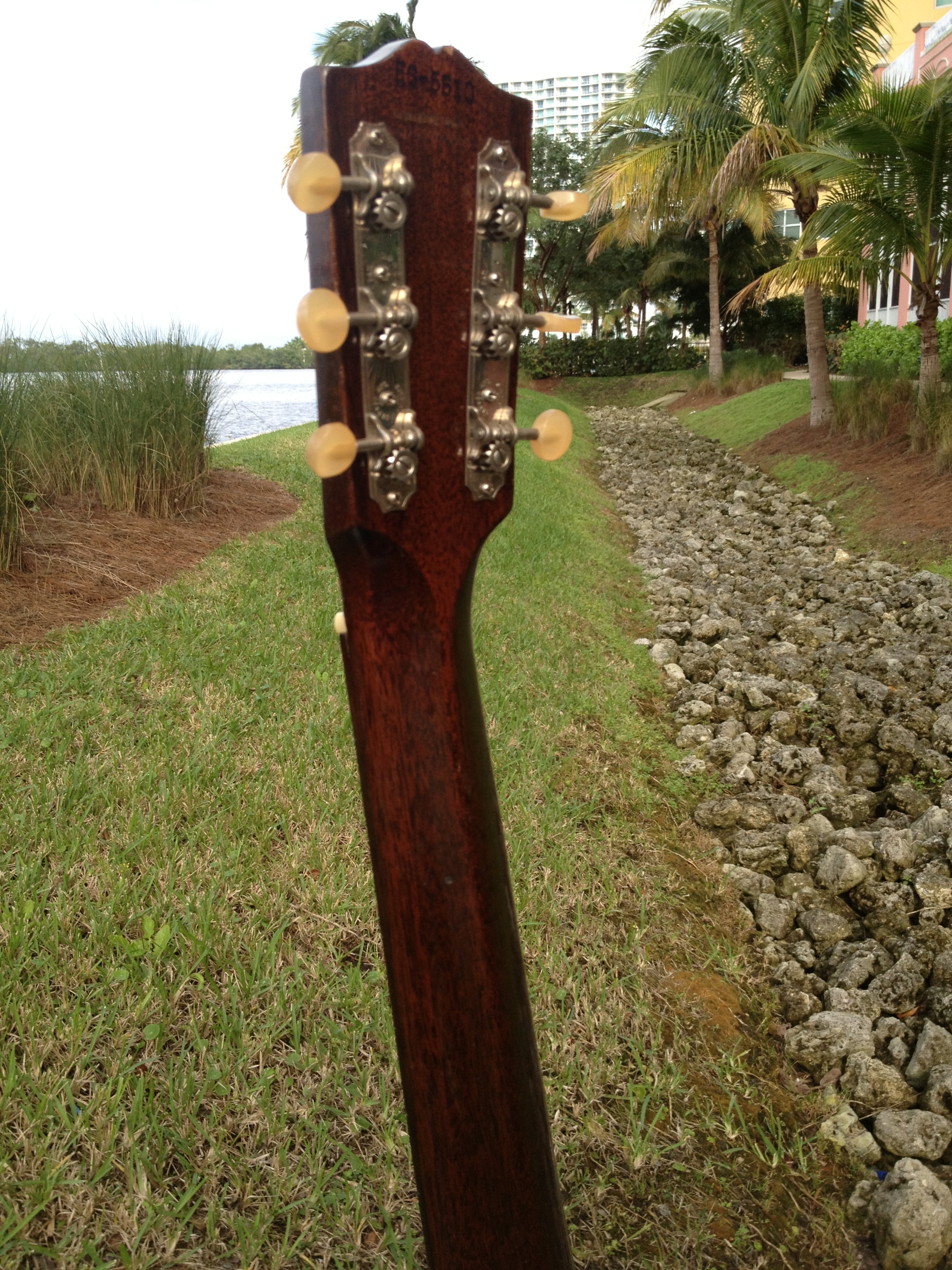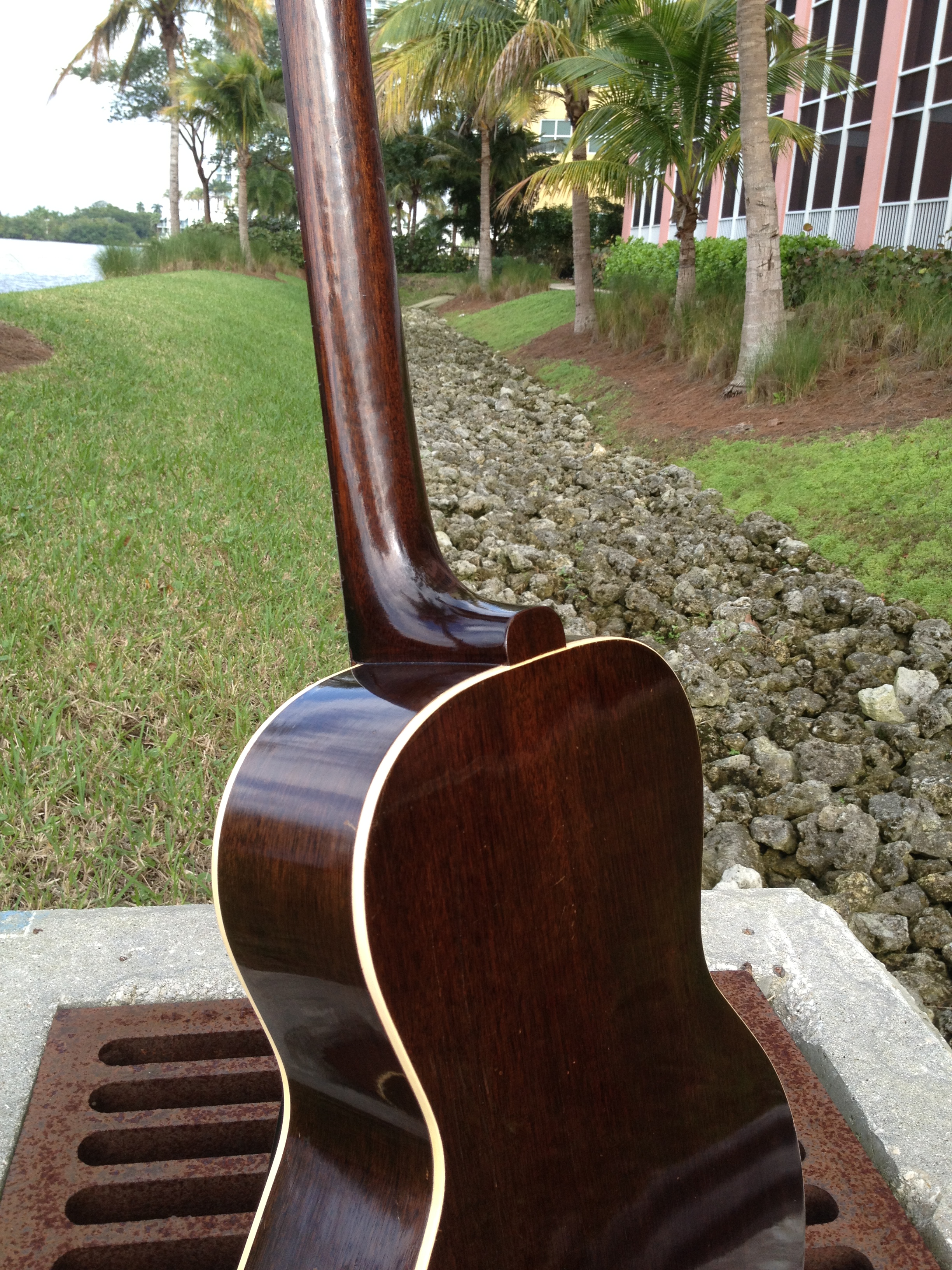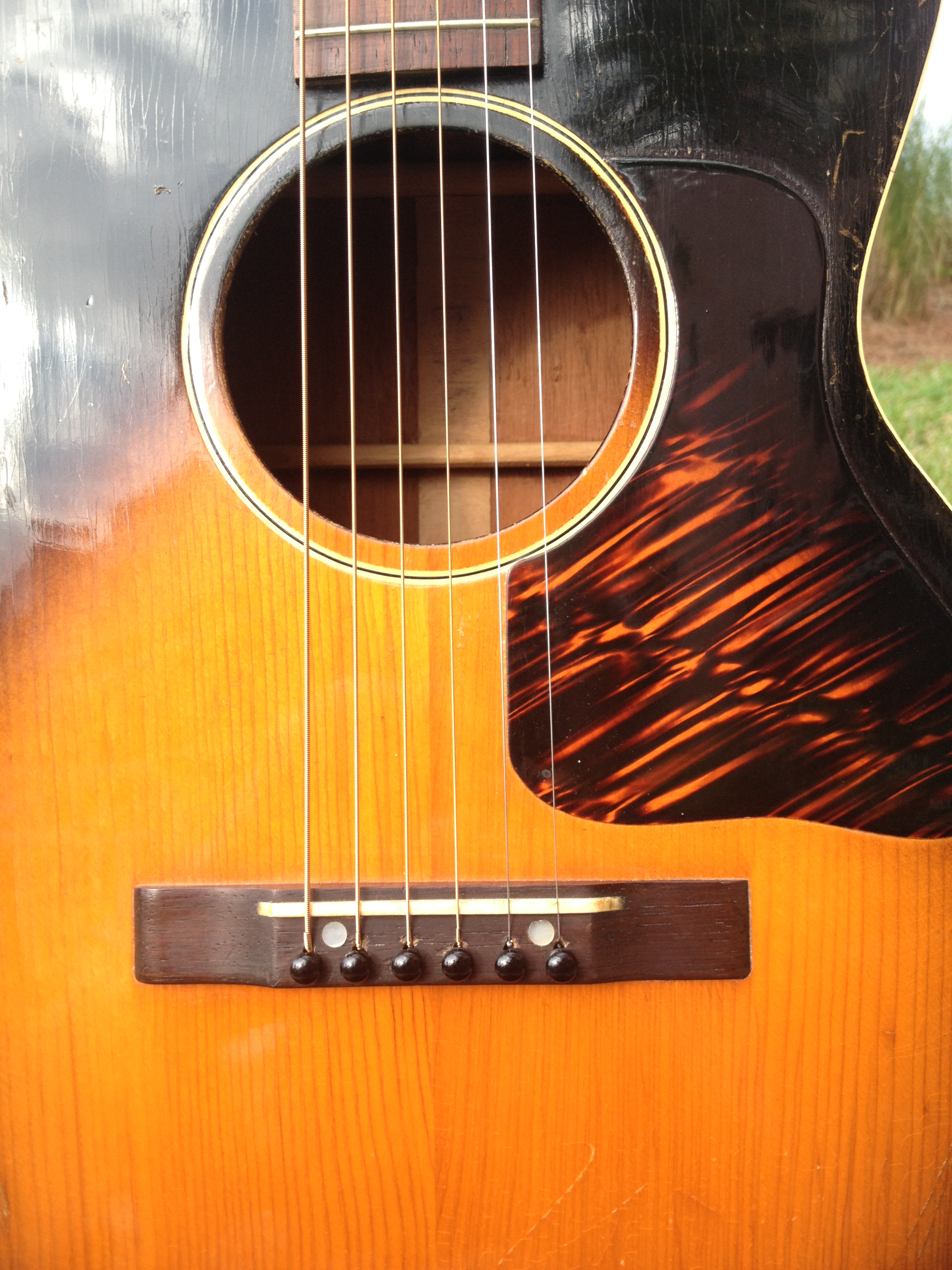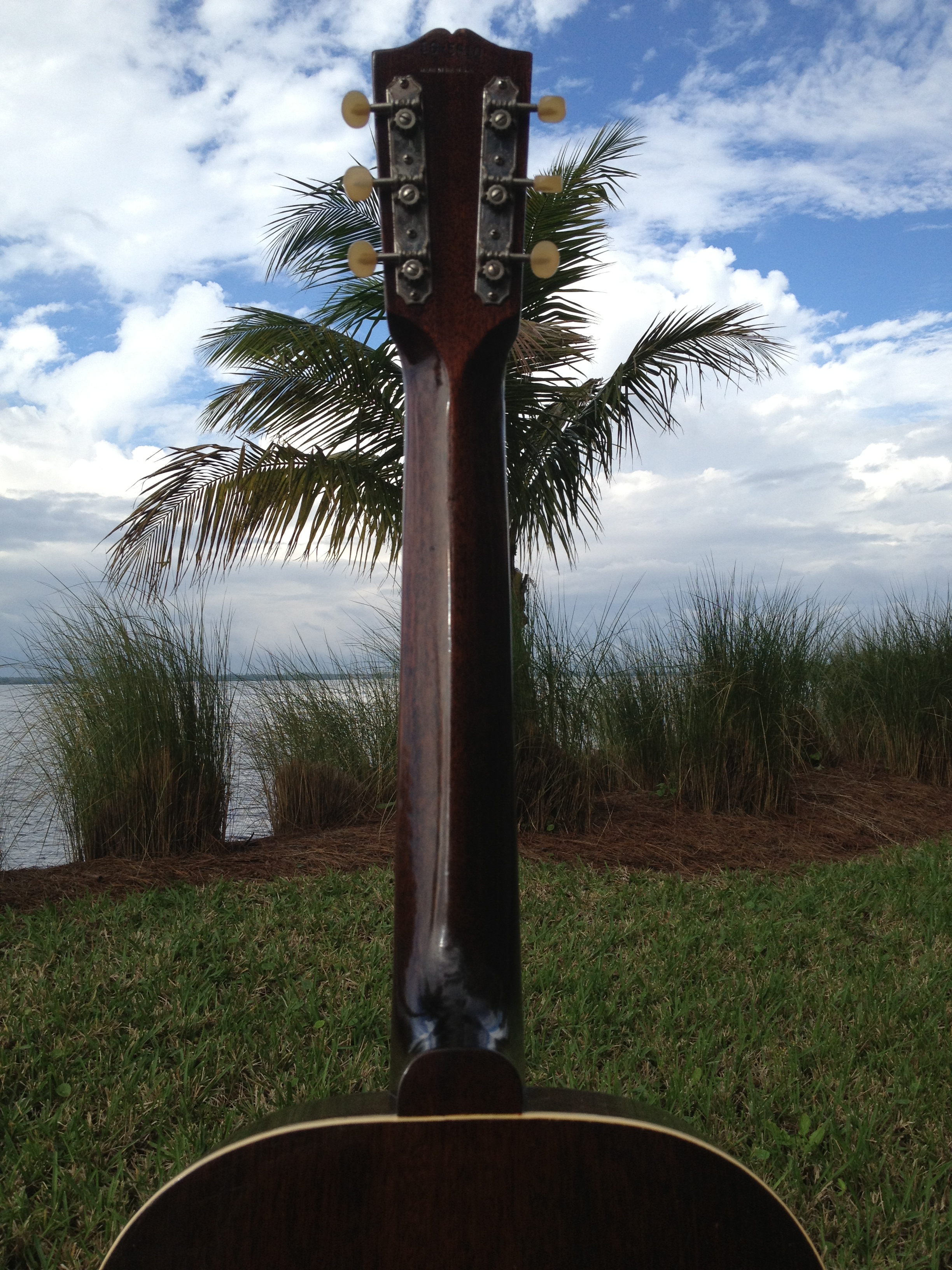 At the time this guitar was built, Hawaiian music was still in vogue and this guitar had a tall bone nut for lap slide play. That original nut is now in the case pocket and our luthier David Hatchard has set the guitar up for standard Spanish play. His work involved fitting an aged bone nut of proper height, re shaping and intonating the original bone saddle to insure a proper set up. The original bridge was just too gorgeous to modify. You’ll notice that the bridge bolts (covered by the pearl dots) are in a slightly different place on a Hawaiian Gibson. David was able to bring the intonation within tolerance without harming the originality. The frets have hardly been touched and the back of the neck is very clean as well, all because of its original Hawaiian heritage.