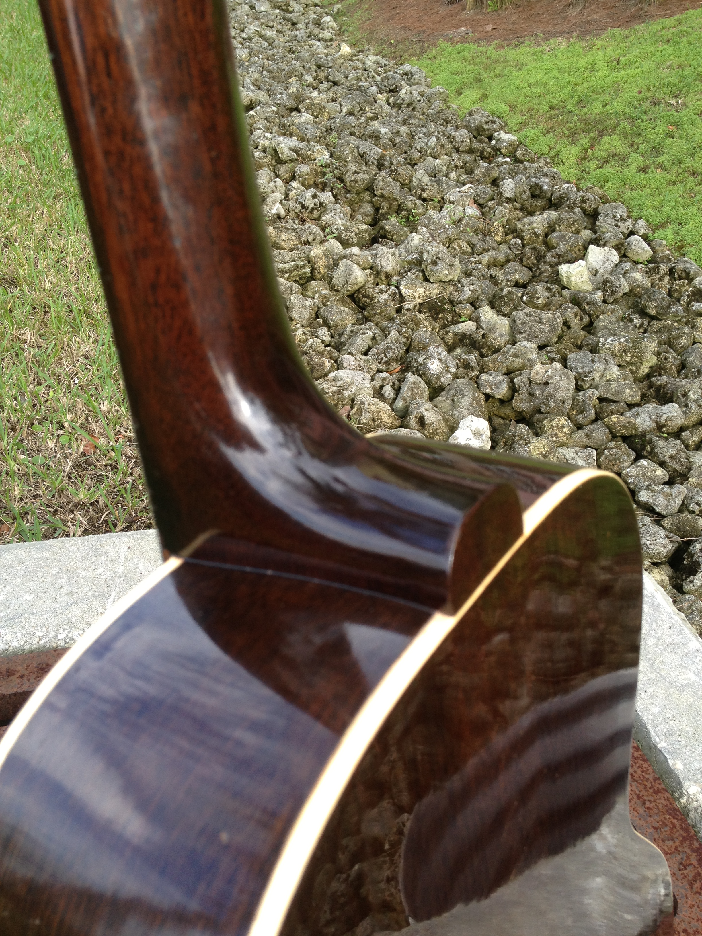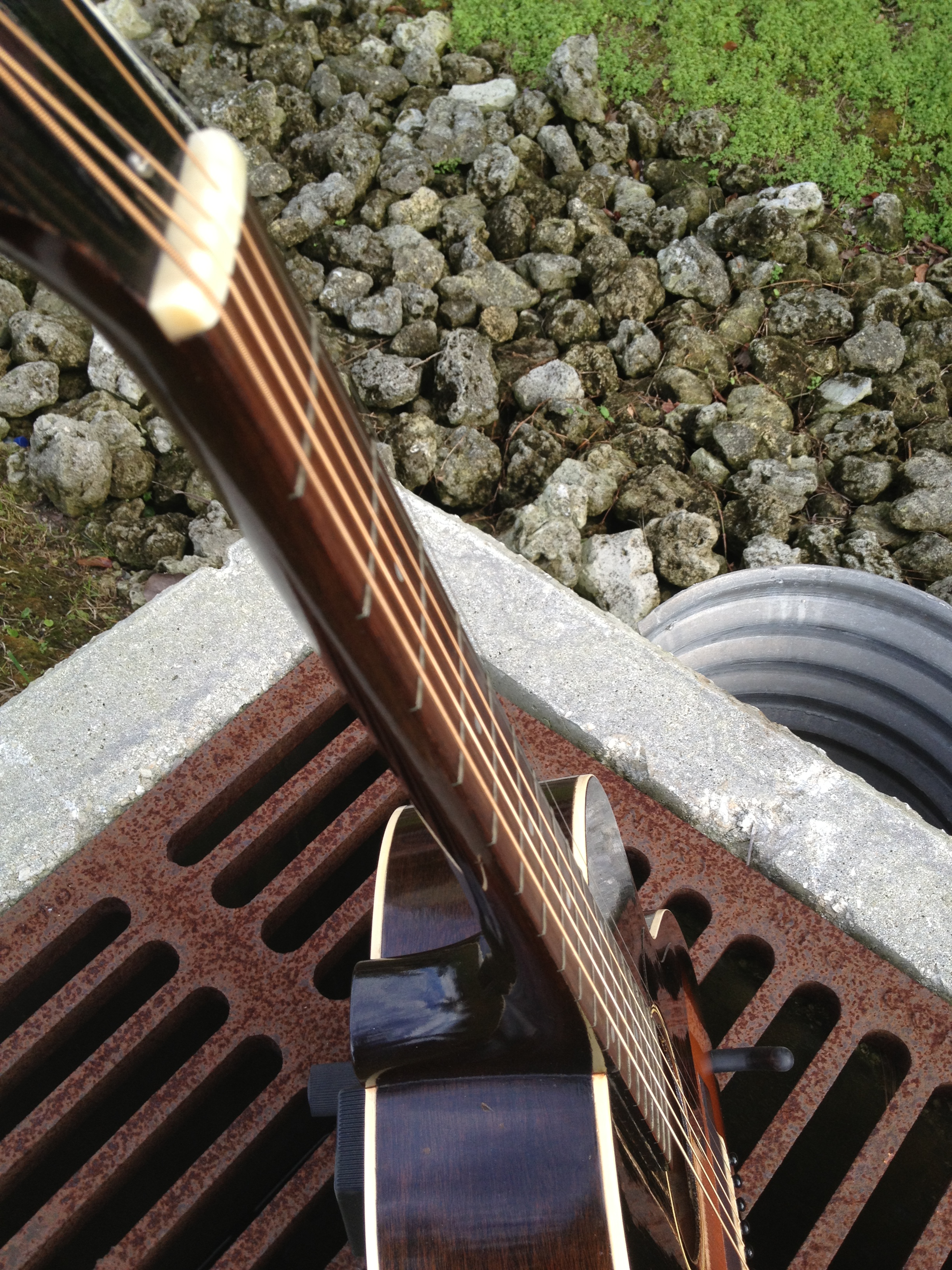 During our recent video session, roots musician Frank Corso gravitated toward this guitar. The wide nut suits his fingerstyle play and the setup with 4/3 action at the octave is just right for bottleneck licks without bottoming out. Watch Frank’s videos from the Youtube links on the left and you’ll hear the haunting tone he gets from this outstanding blues guitar, with plenty of power in the bass register and sustaining slide licks.