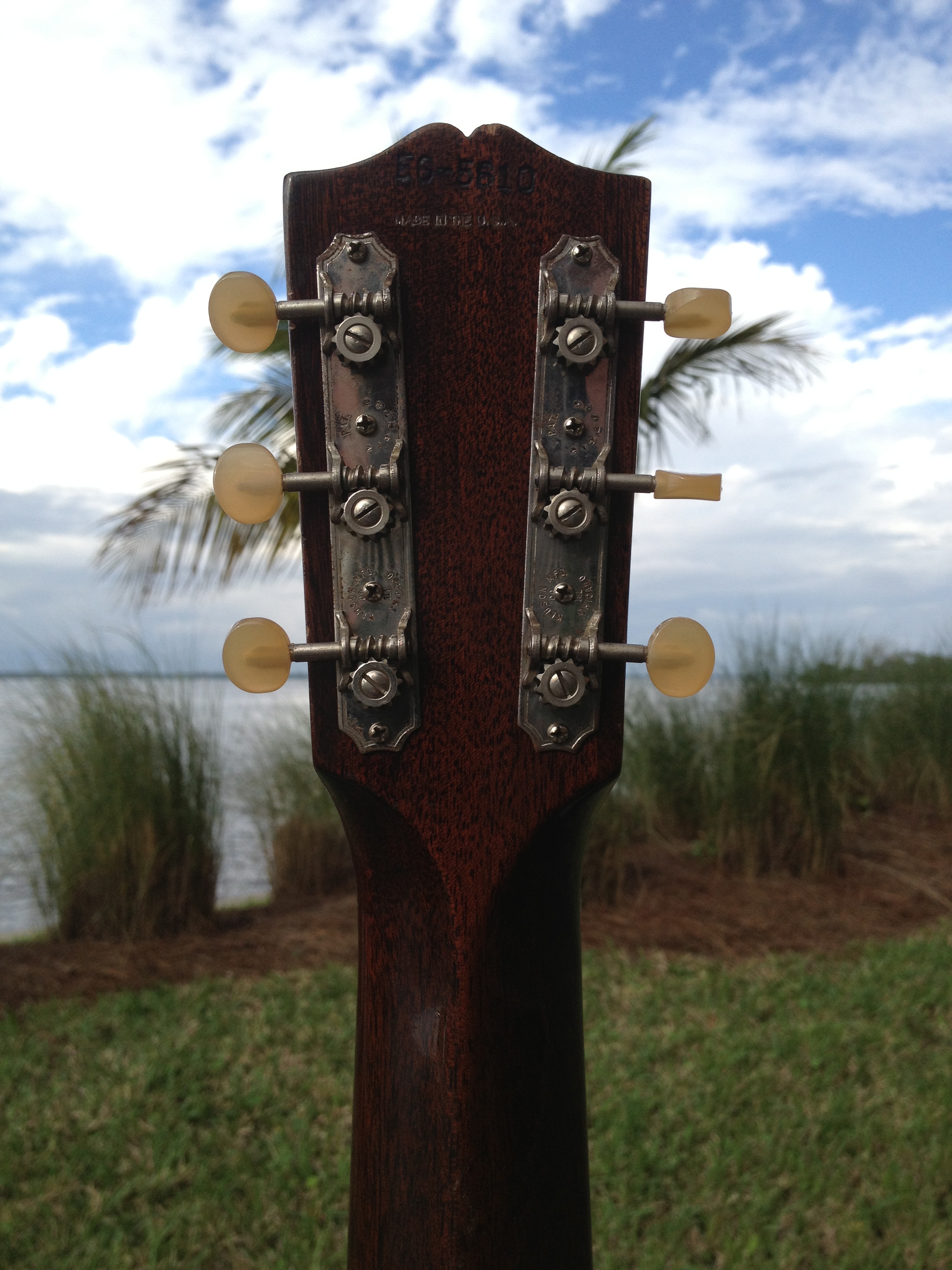 The patent pending engraved Kluson tuners feature the original 6 amber buttons (like the ones seen on the same period J35s) and the guitar is bound top and back. Pretty high style, and additionally this Hawaiian is unique in that it has a fully functional adjustable truss rod. The guitar is completely original down to the bridge pins. Internal bracing is tight and the original bridge plate is in excellent condition. We see evidence of some minor past repairs: a small bump on the edge of the lower bout top and a few minor backside hairlines but all are difficult to detect.
