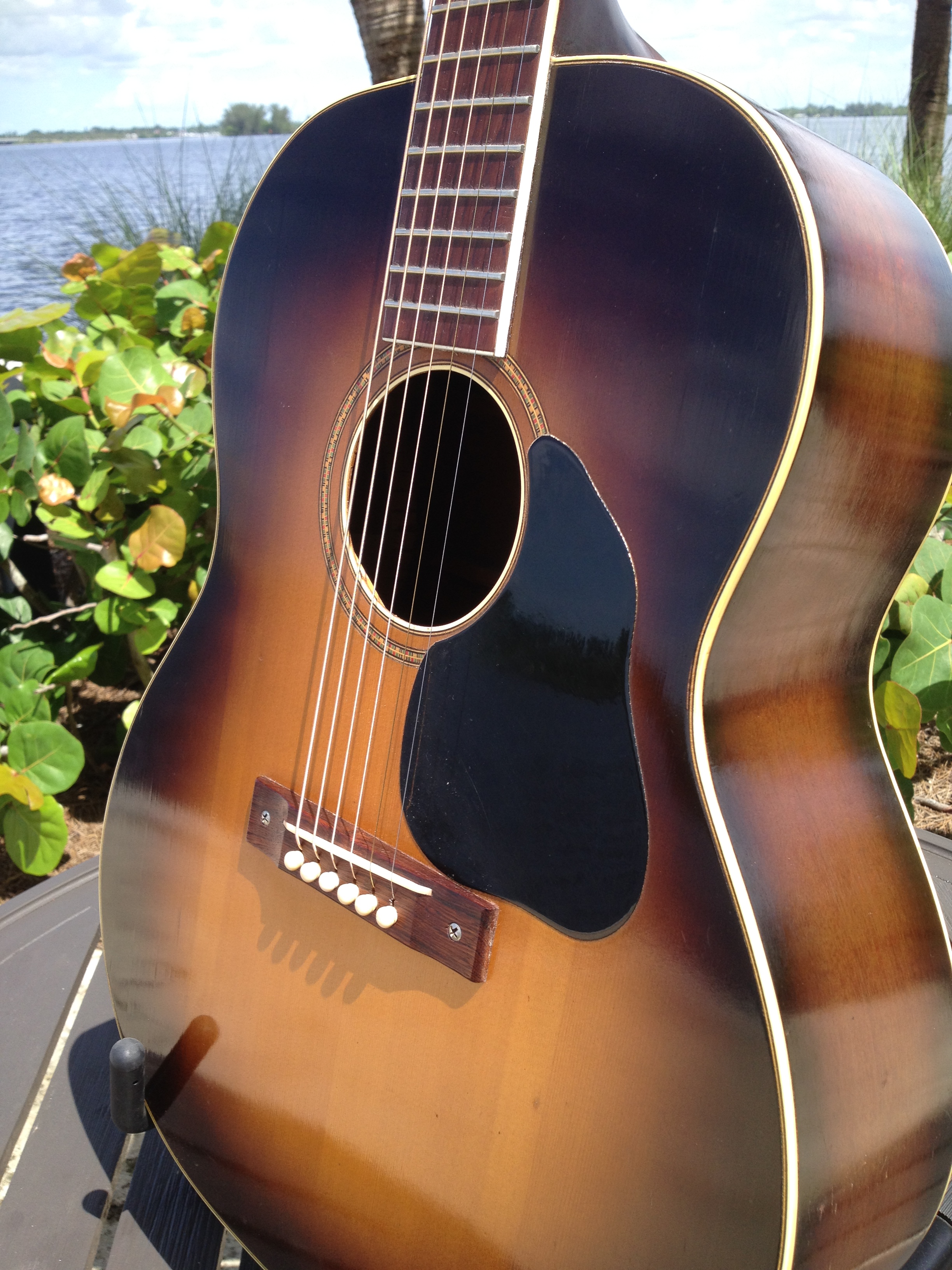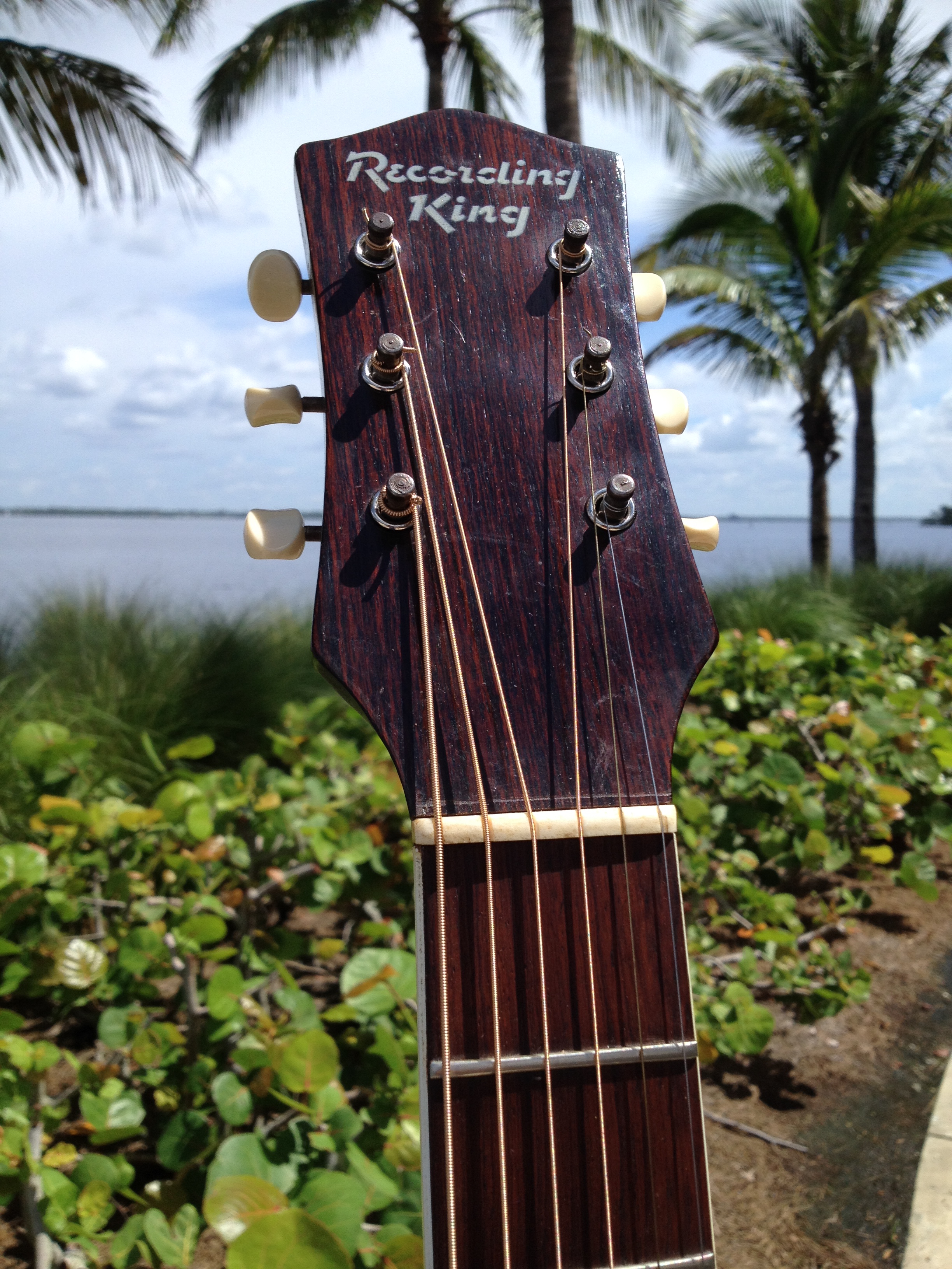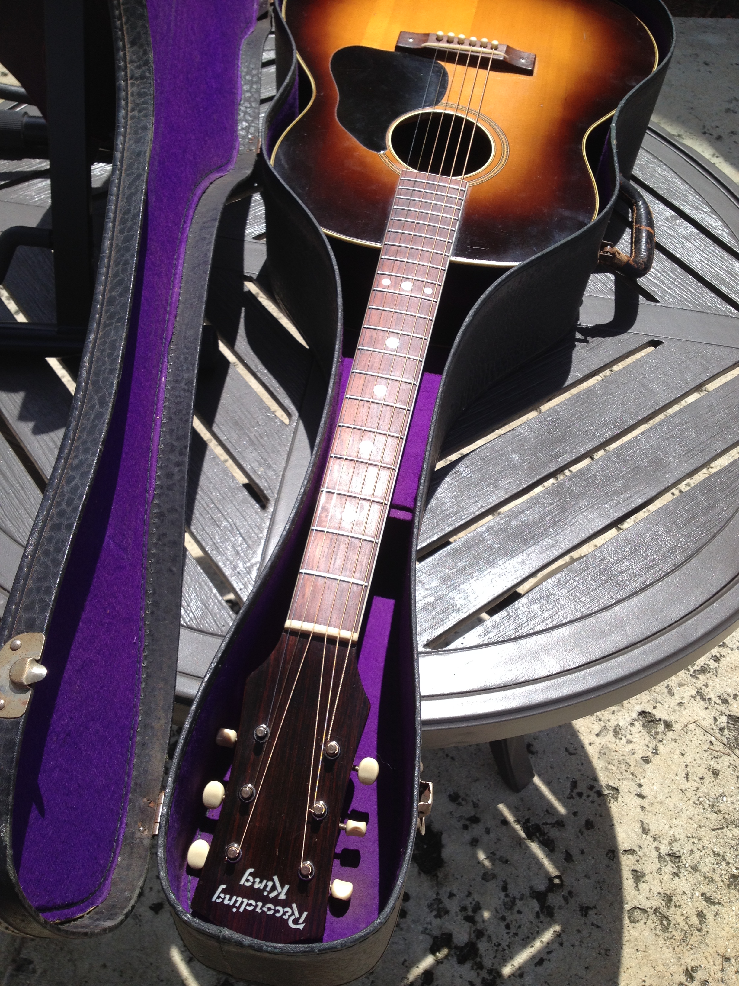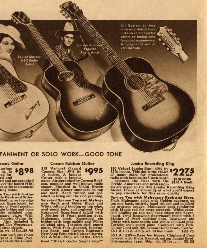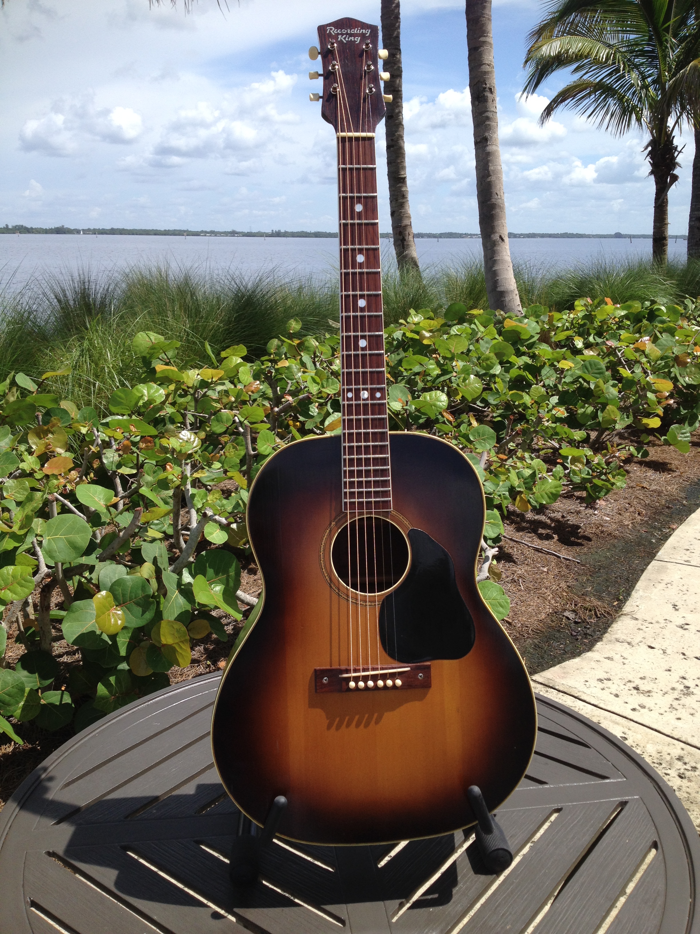 Back in the 1940’s, folks who didn’t live close to a music shop could mail order a guitar from the Montgomery Ward catalog. Ward’s offered a range of instruments branded “Recording King” and built by other makers, including this jumbo size, made by Regal in Chicago.