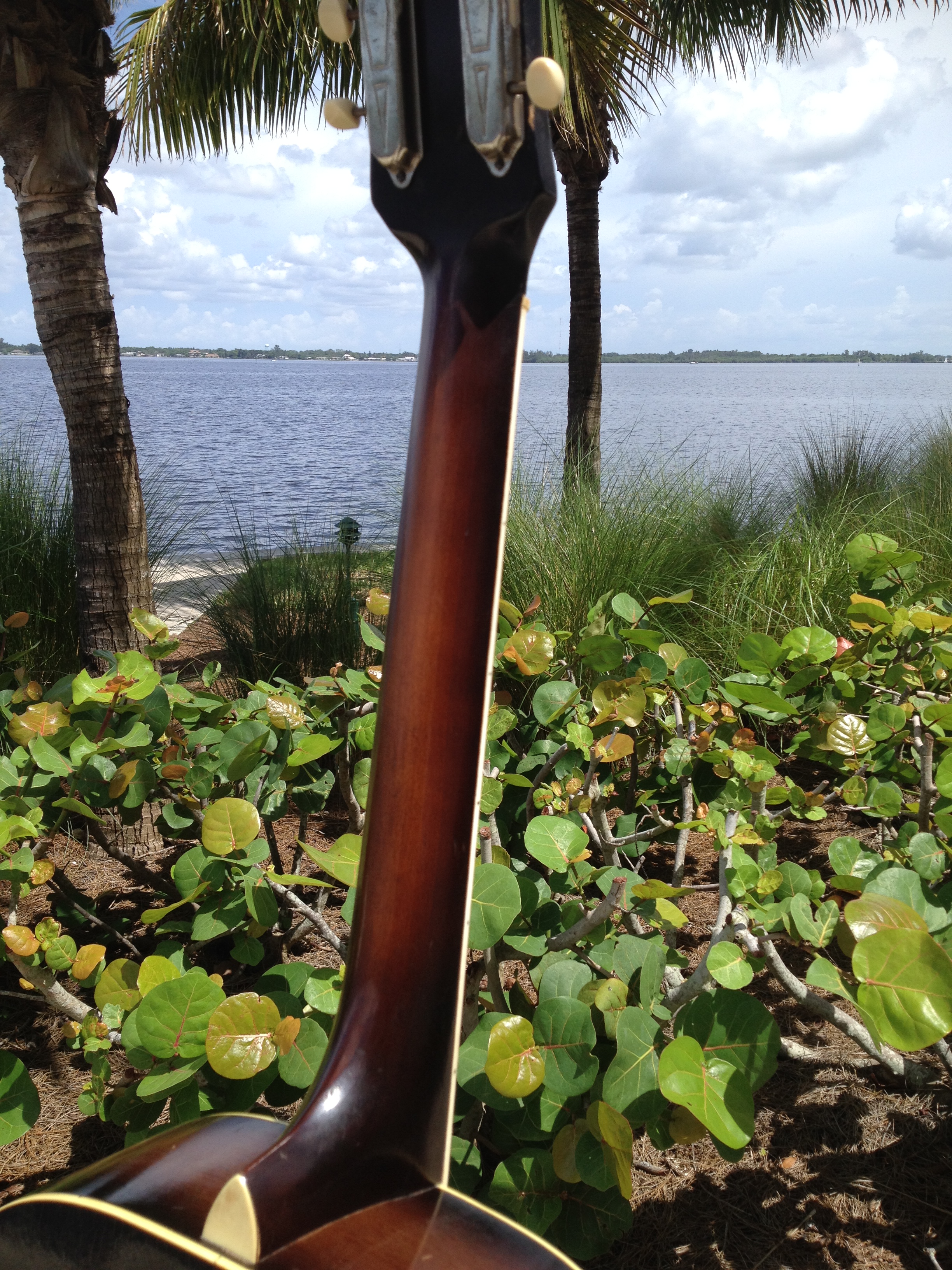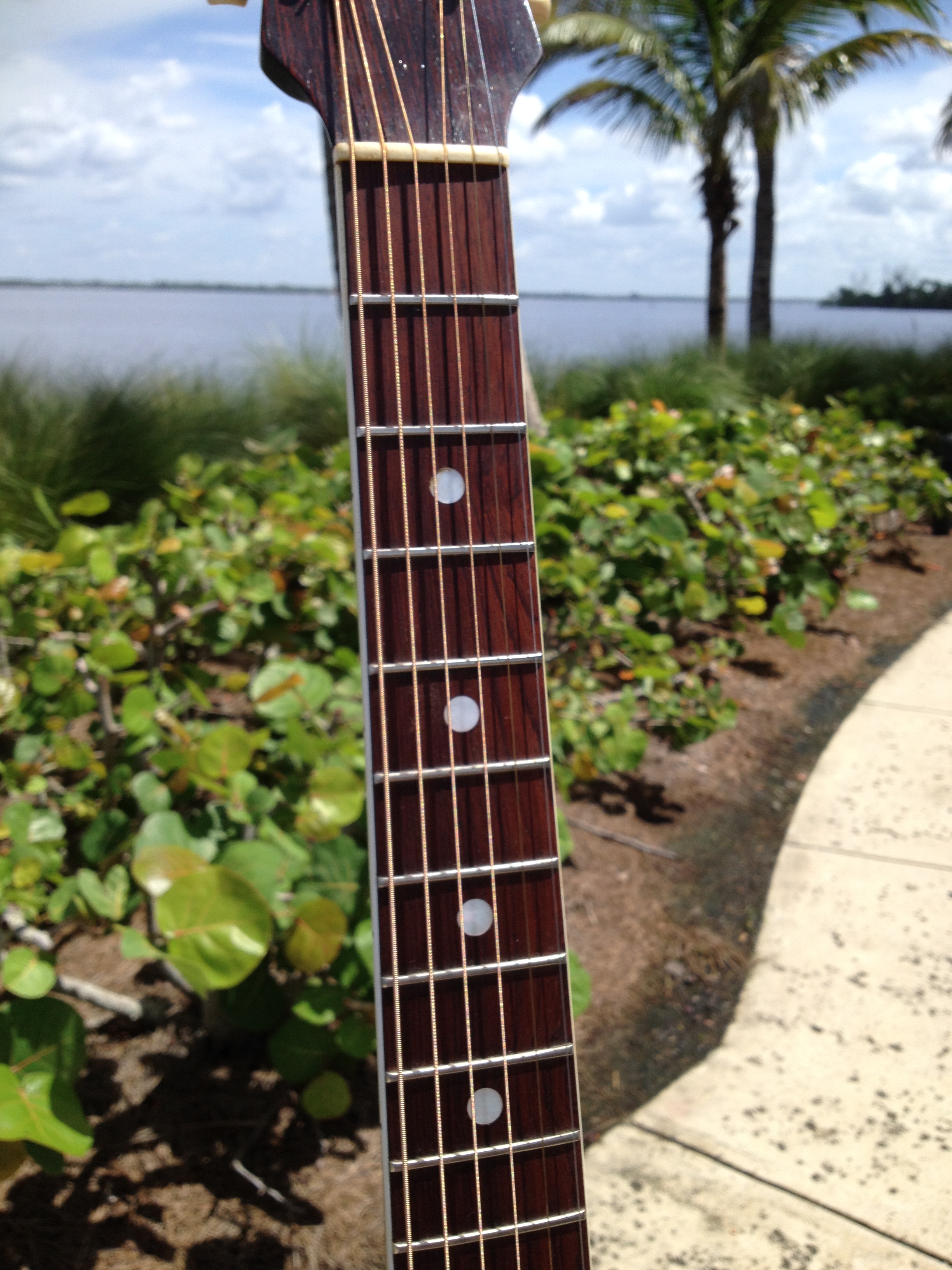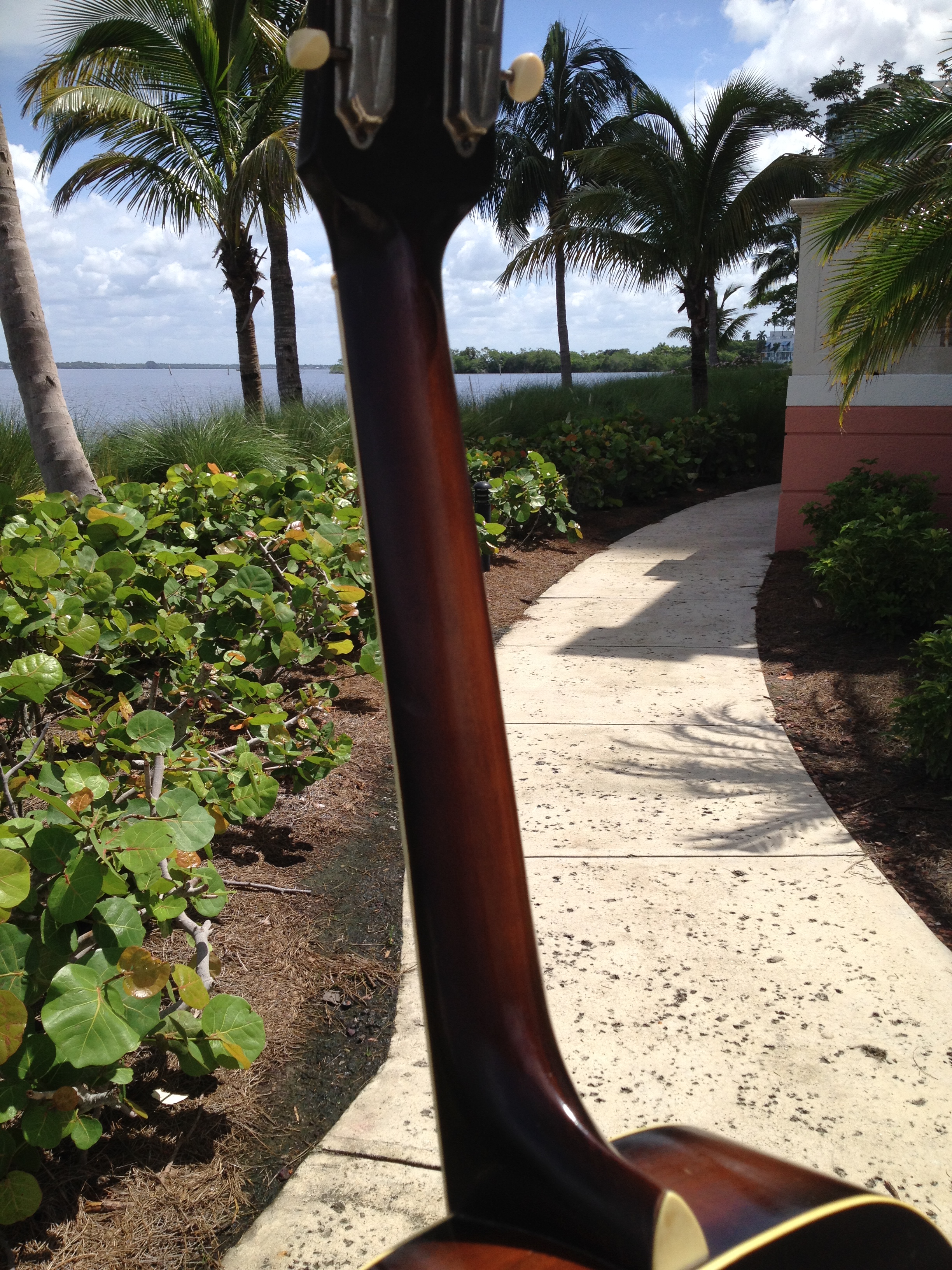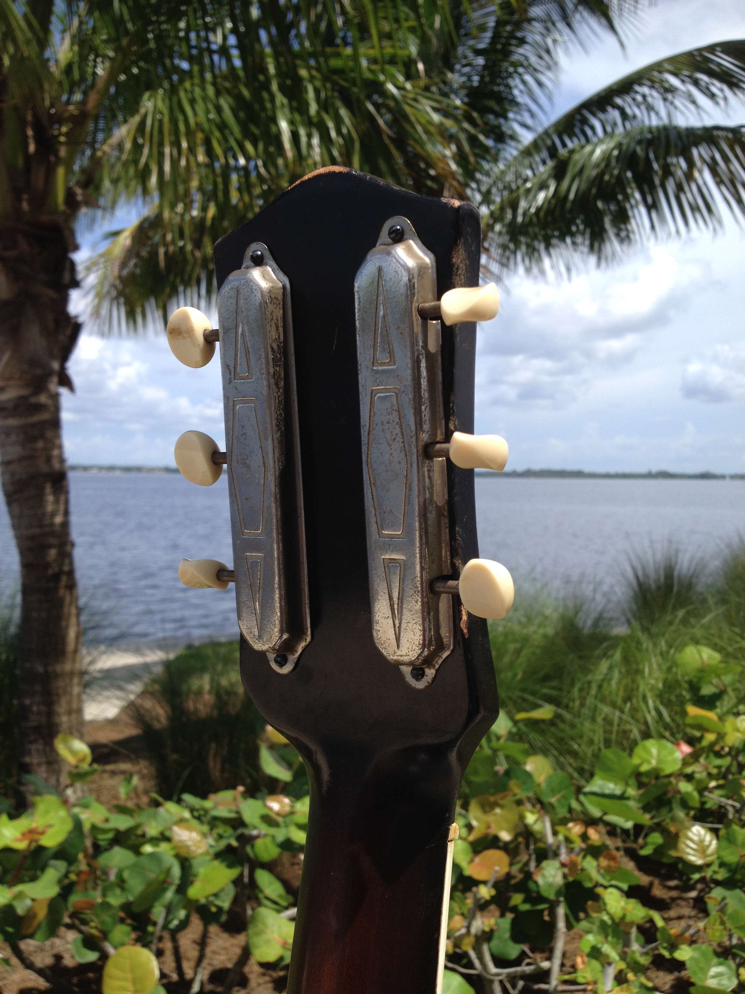 Luthier Ross Teigen reset the neck and did a compression refret to ensure correct neck relief for best setup. All the bracing is intact, the bridge and bridge plate are untouched originals including the original bridge screws placed at the Regal factory. We only had to replace the crumbled plastic tuner buttons with correct Antique Acoustics replicas.