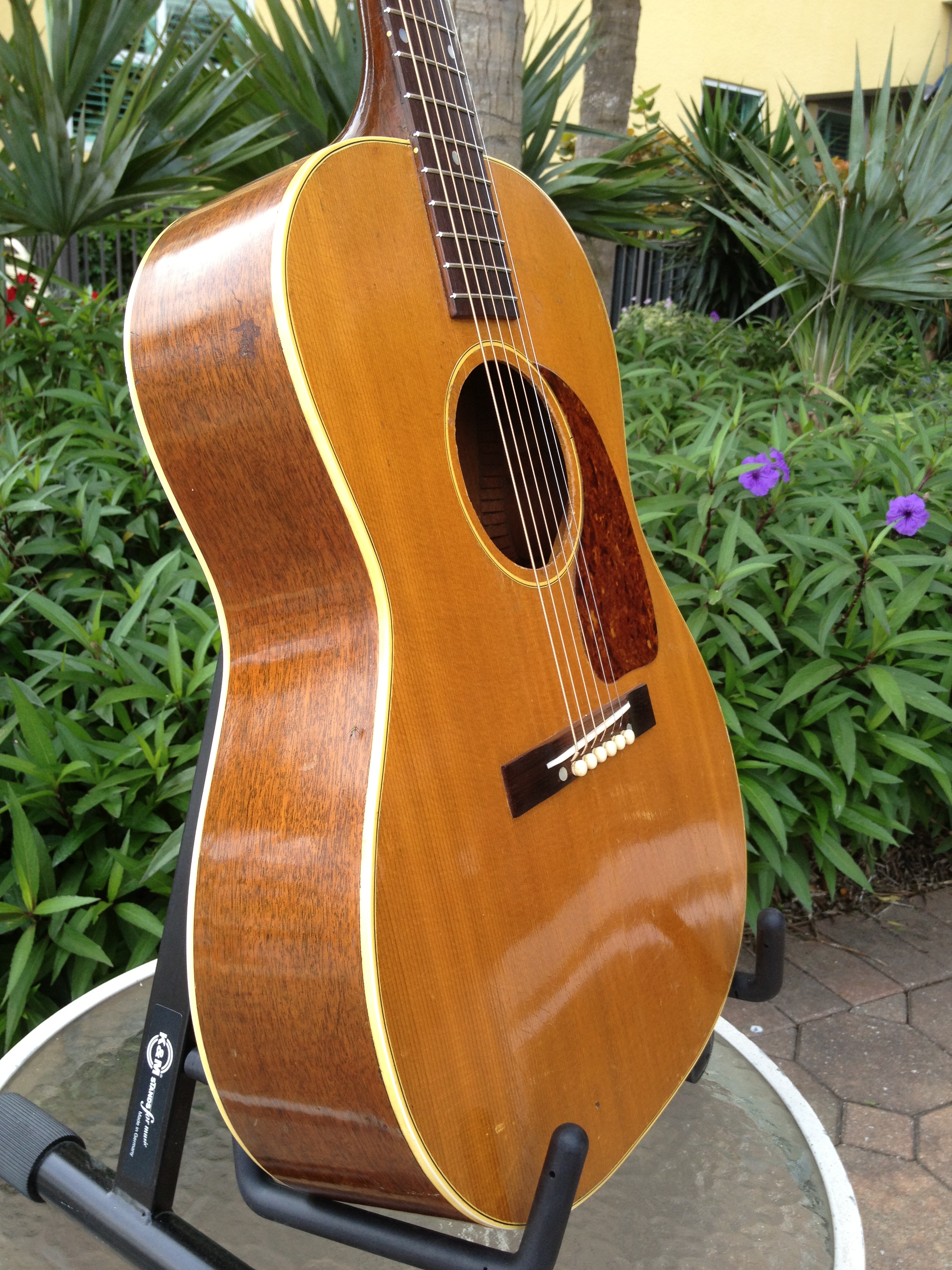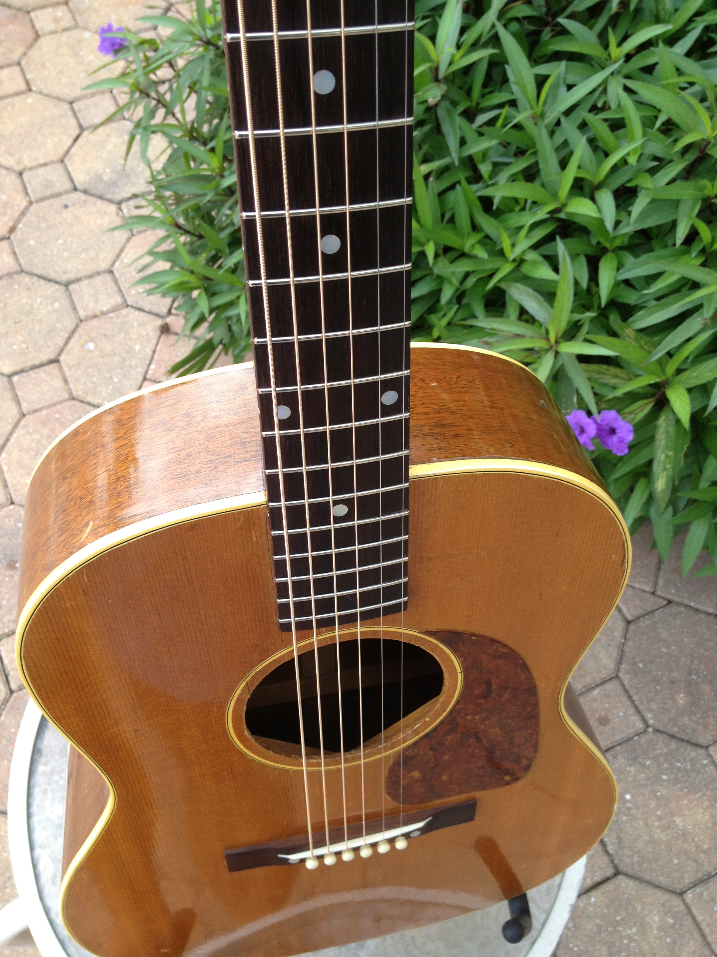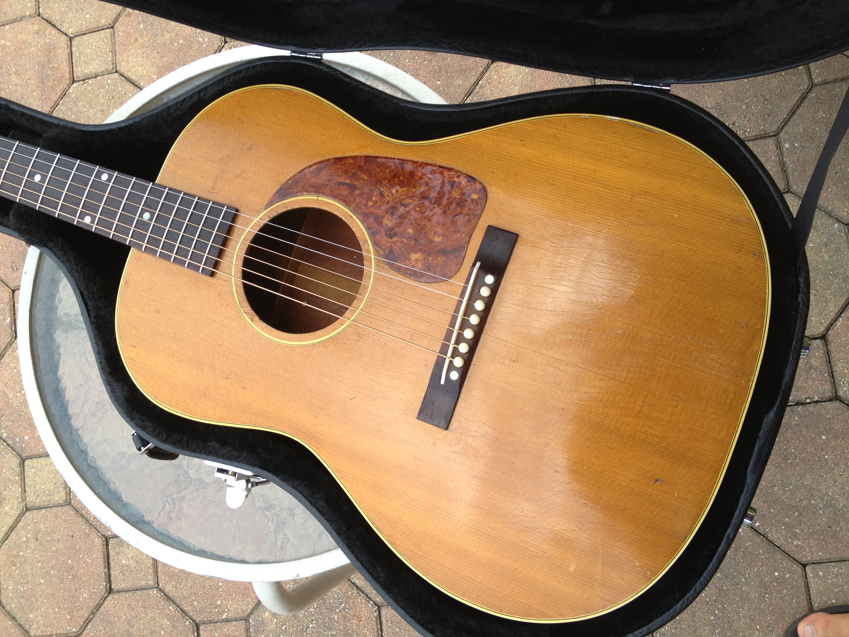 Found in amazingly clean condition with the finish intact, what restoration work needed was lovingly performed by luthier David Hatchard to bring this LG-3 back to optimal playing condition. David closed an open top seam separation and repaired a few hairline cracks and re glued a few of the typical loose braces and performed a complete refret to make the playing surface a dream. David’s fretwork is a thing to behold – intonation is precise, notes ring true, your bends are clean and easy. Action is set to 3/32″ low E and 2/32″ high E. All work to ensure the guitar will be maintenance free with no compromises for the accomplished player or collector.