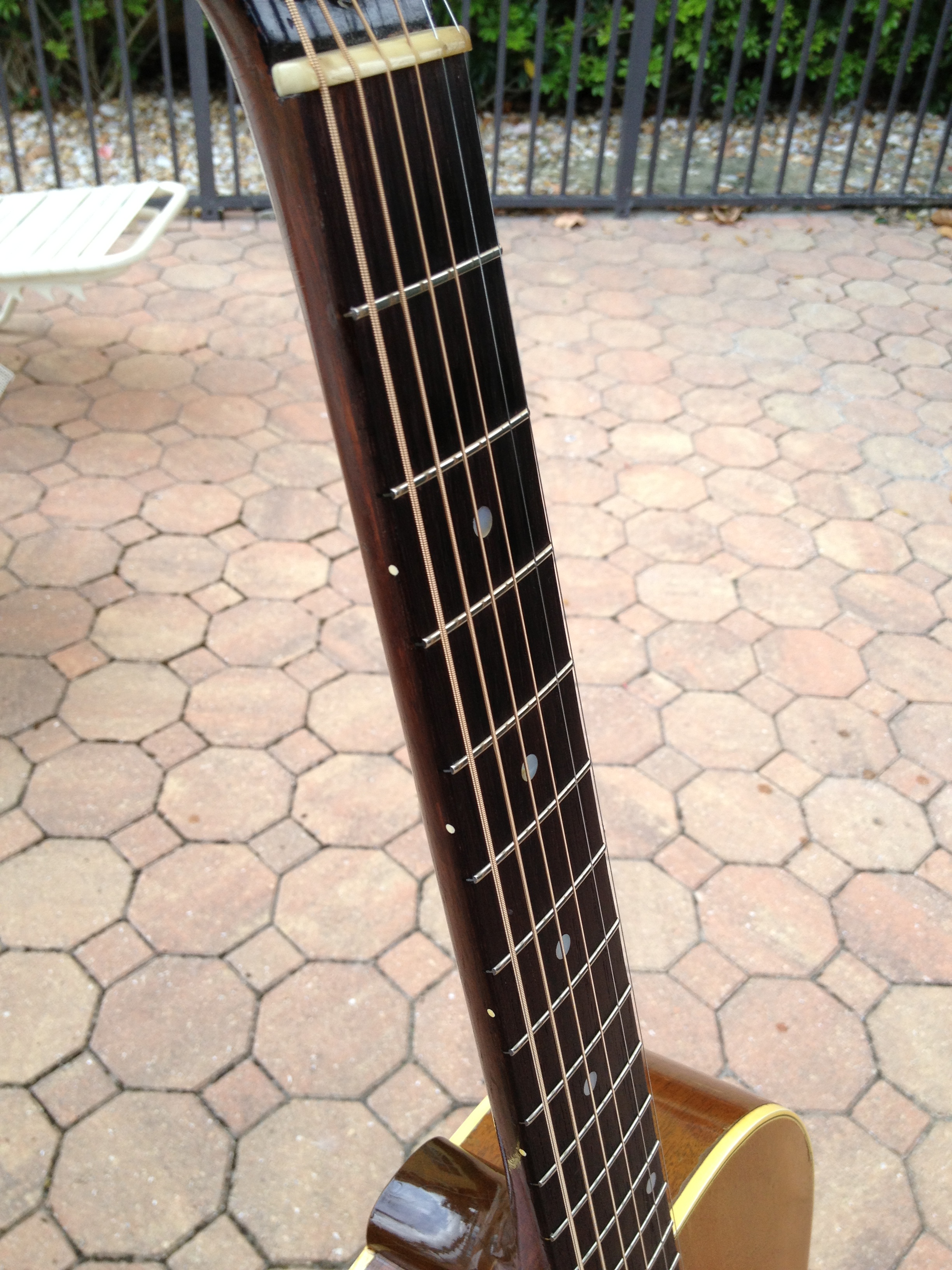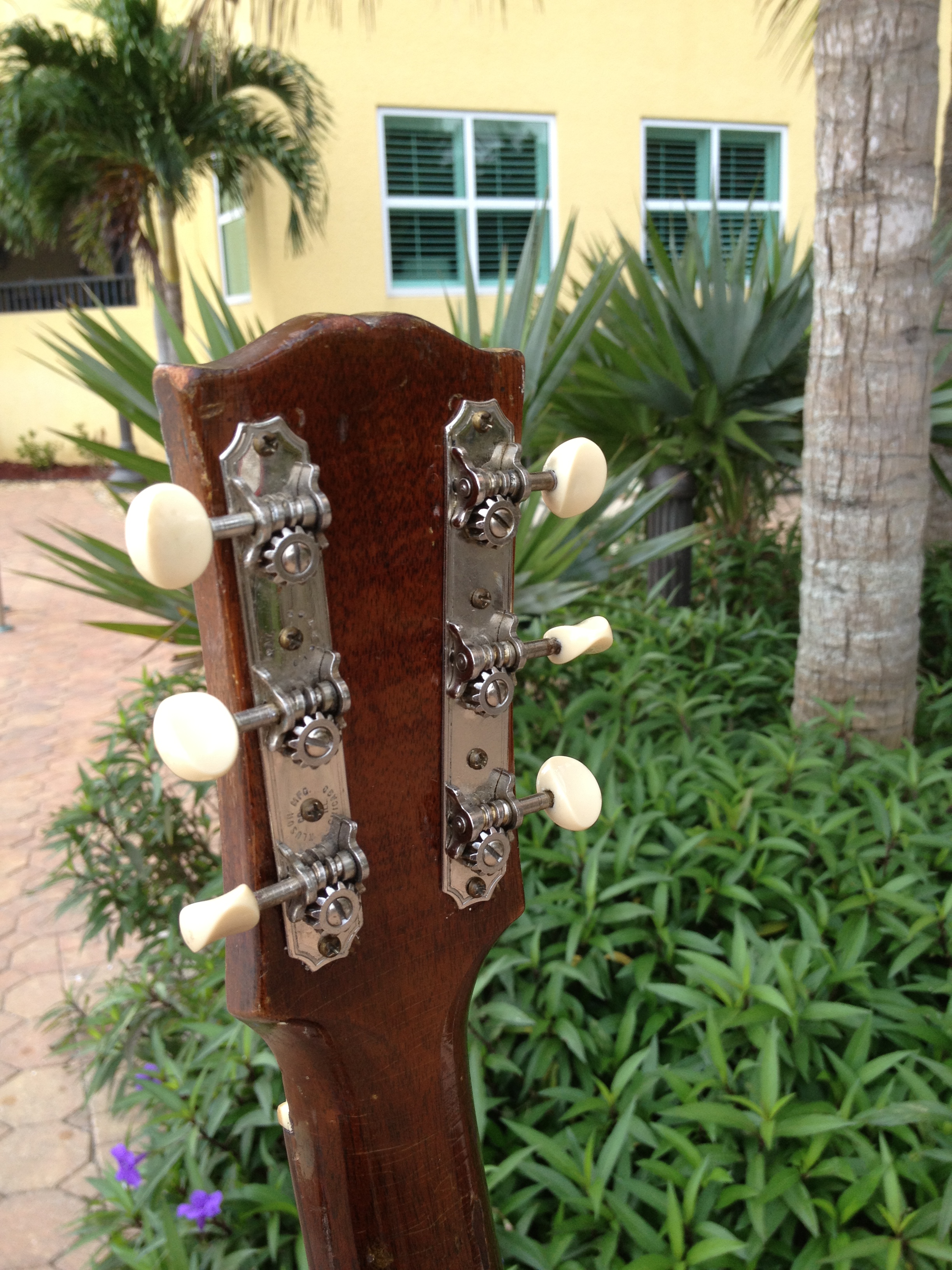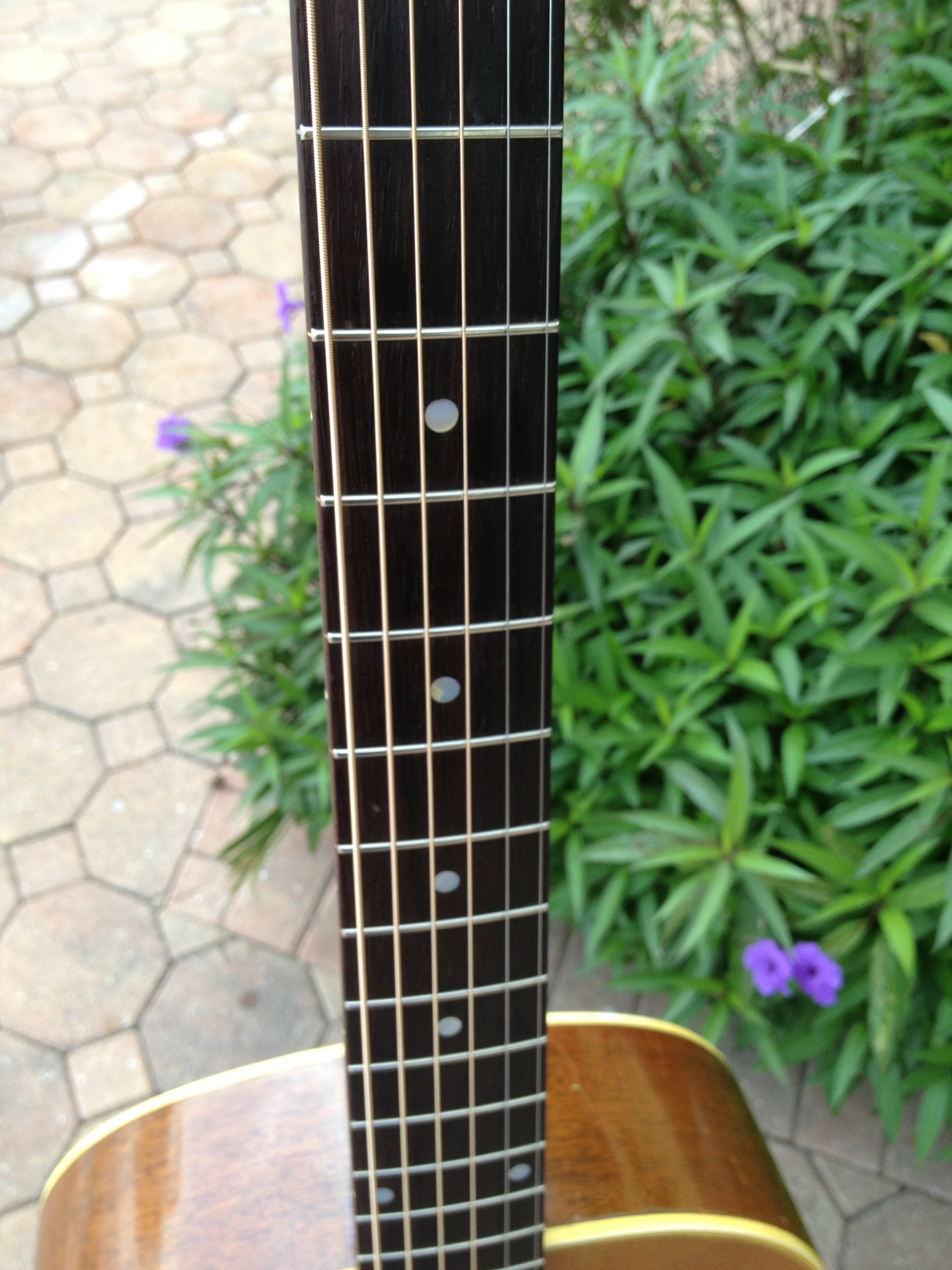 Found in amazingly clean condition with the finish intact, what restoration work needed was lovingly performed by luthier David Hatchard to bring this LG-3 back to optimal playing condition. David closed an open top seam separation and repaired a few hairline cracks and re glued a few of the typical loose braces and performed a complete refret to make the playing surface a dream. David’s fretwork is a thing to behold – intonation is precise, notes ring true, your bends are clean and easy. Action is set to 3/32″ low E and 2/32″ high E. All work to ensure the guitar will be maintenance free with no compromises for the accomplished player or collector.