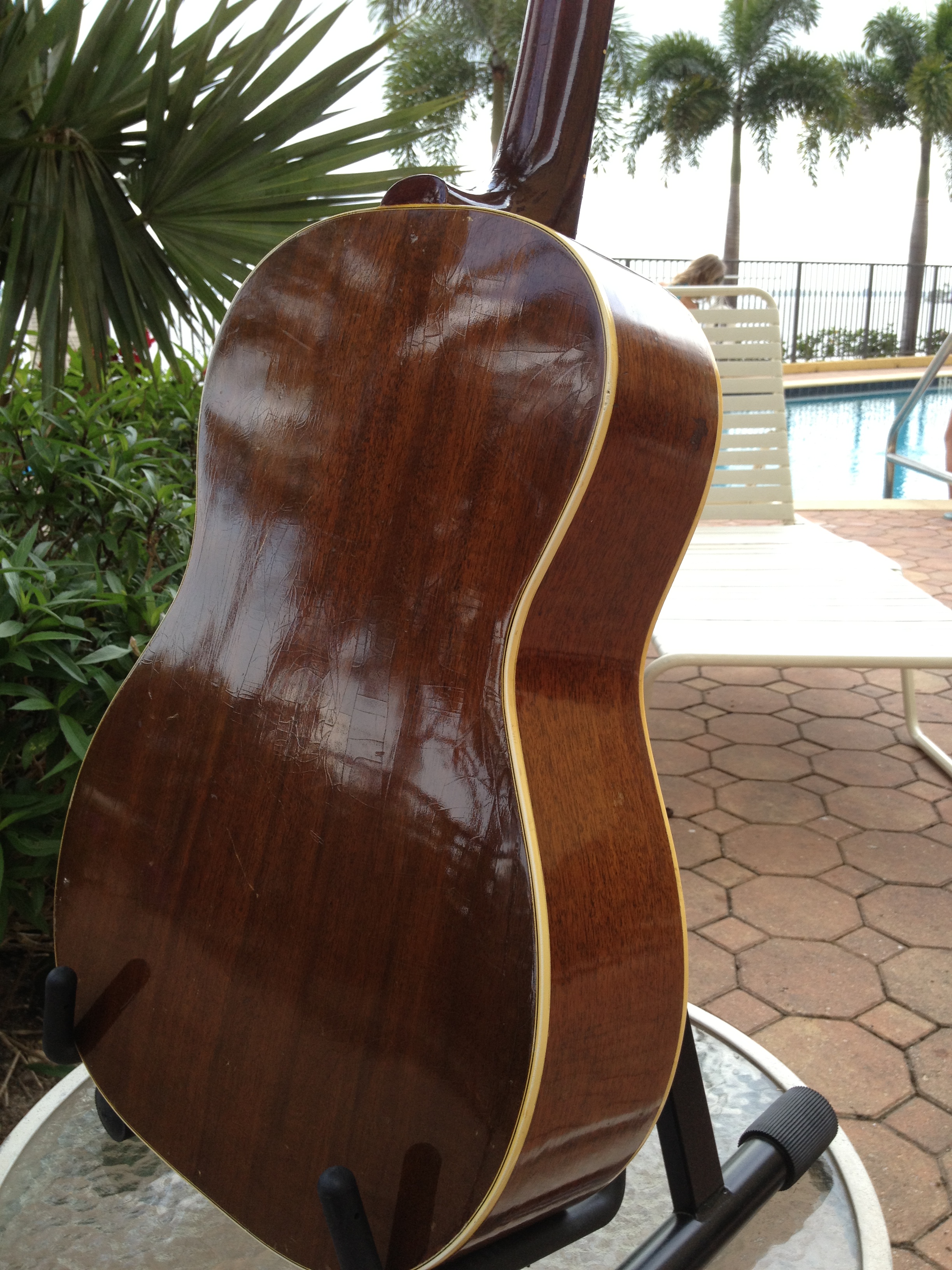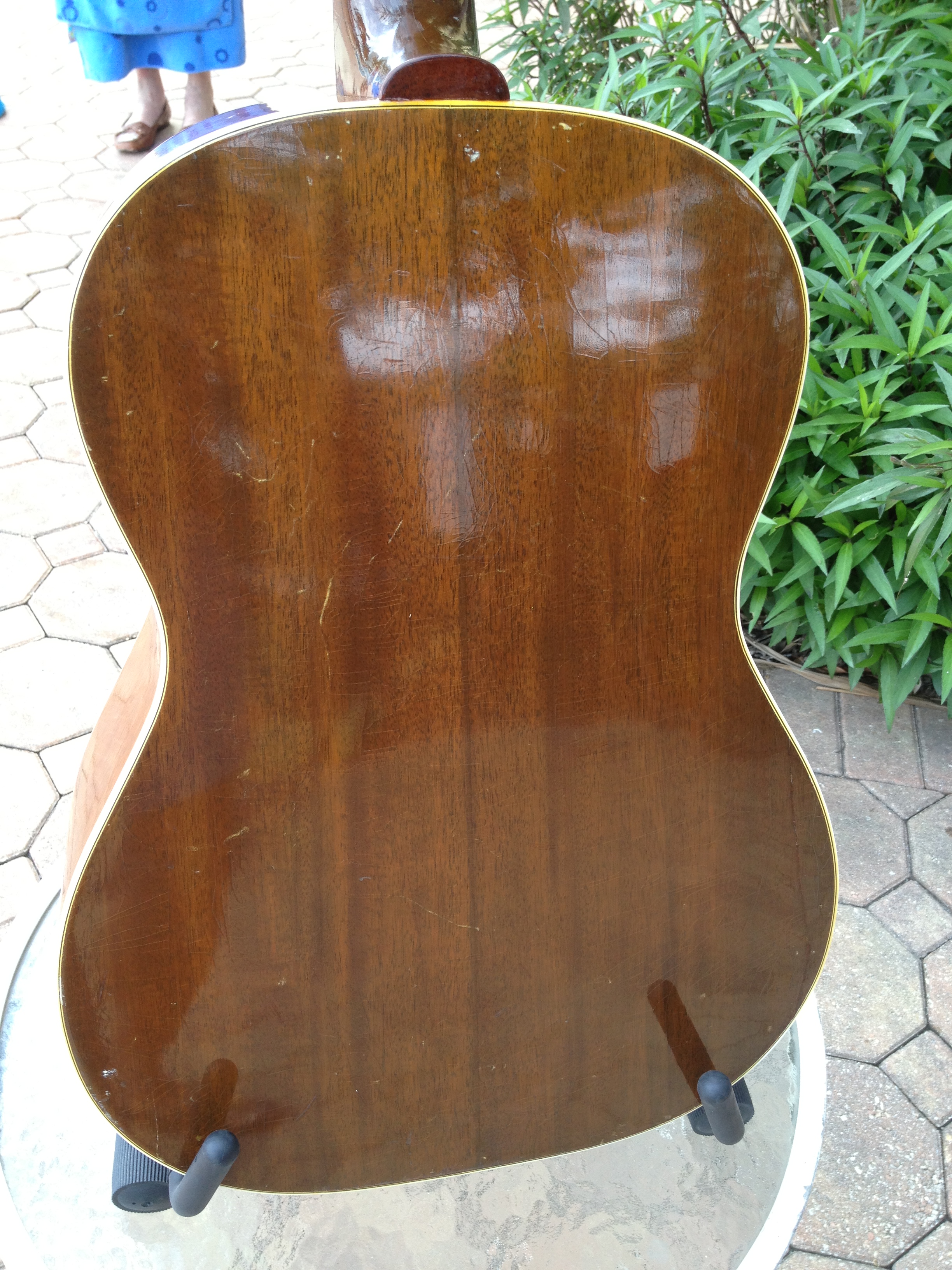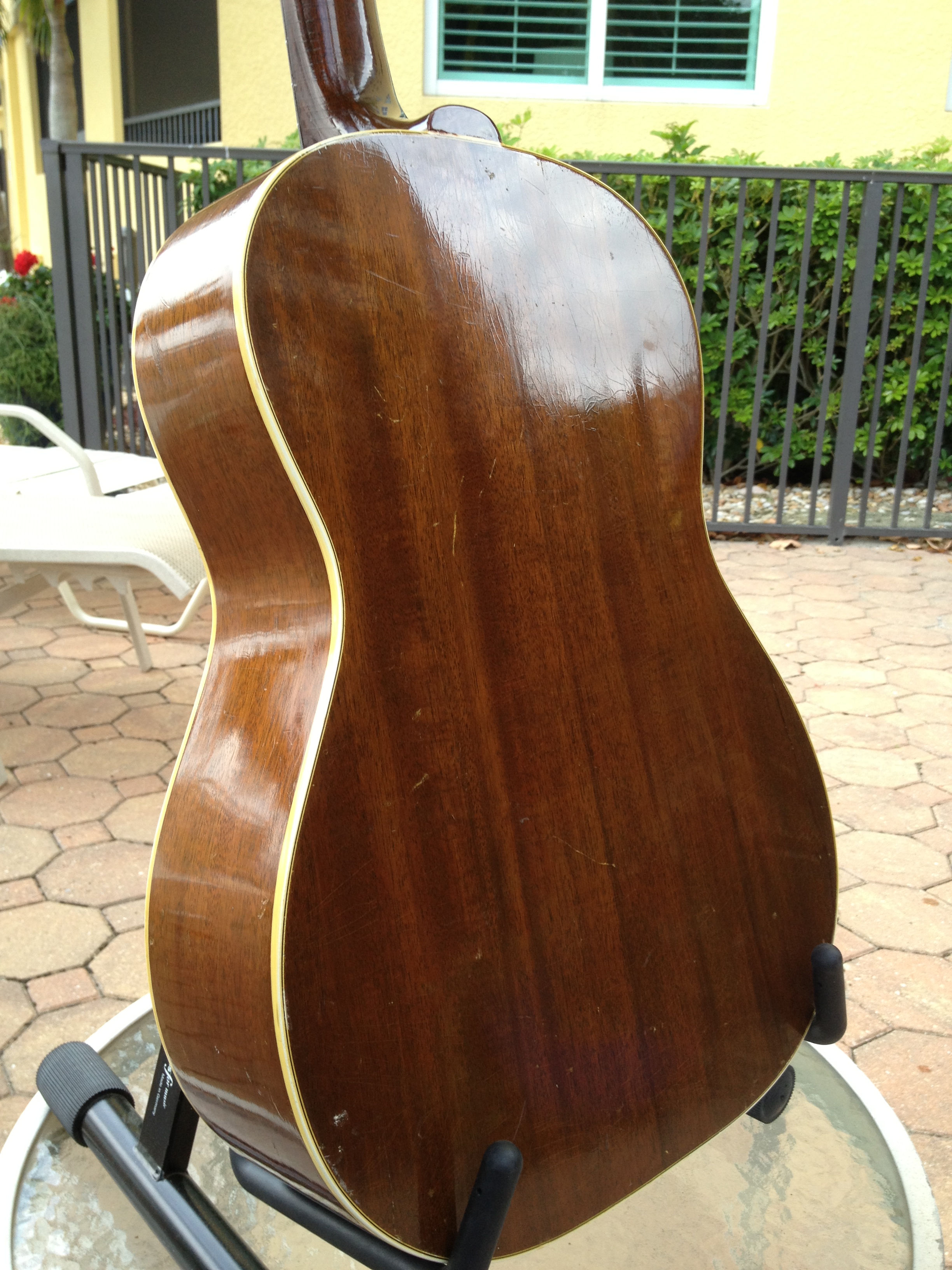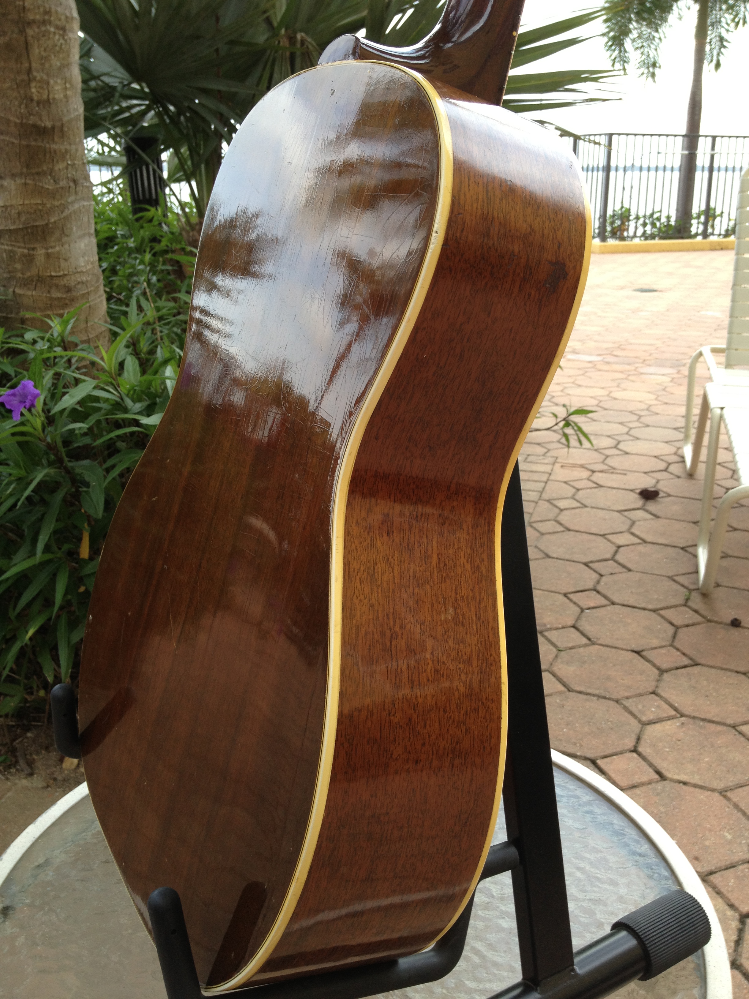 Features include a high grade and scarce for the day natural finish spruce top, solid mahogany back and sides and a single piece easy to play medium profile yet comfortable (not baseball bat size) solid mahogany carved neck measuring ~ 1 11/16″ at the nut. This wartime LG3 has the knife sharp bracing with a fully functional adjustable truss rod and a square neck block.