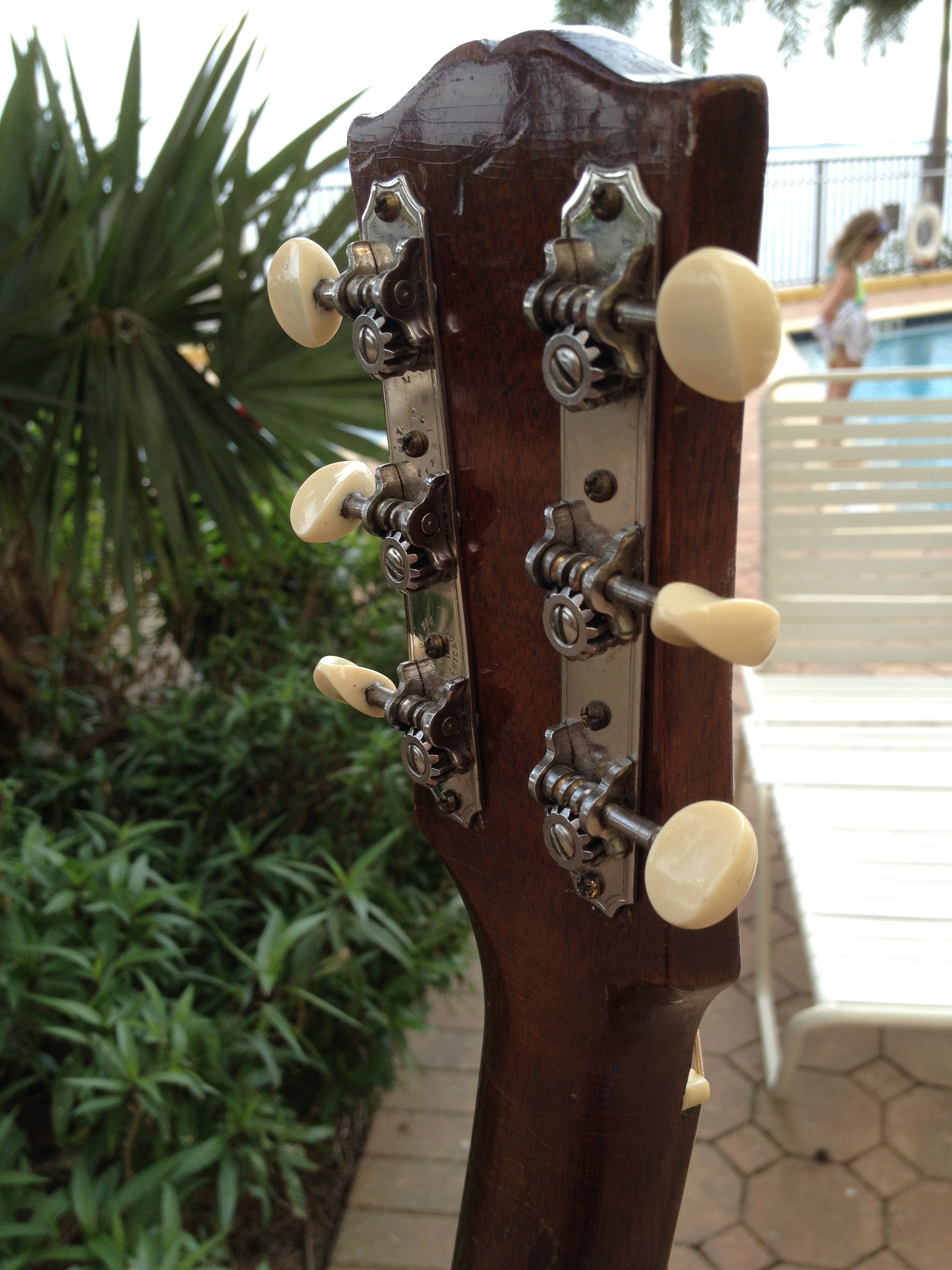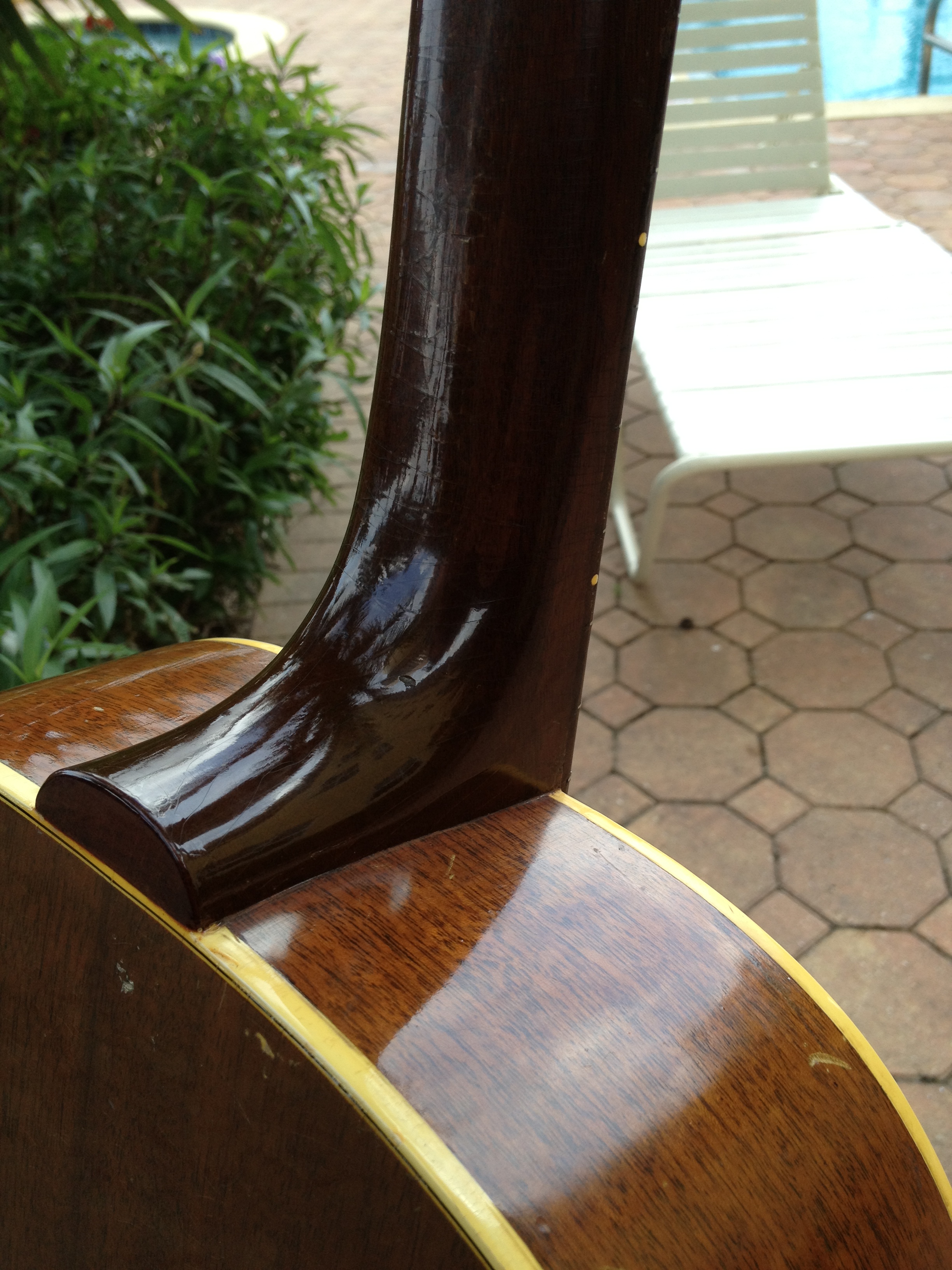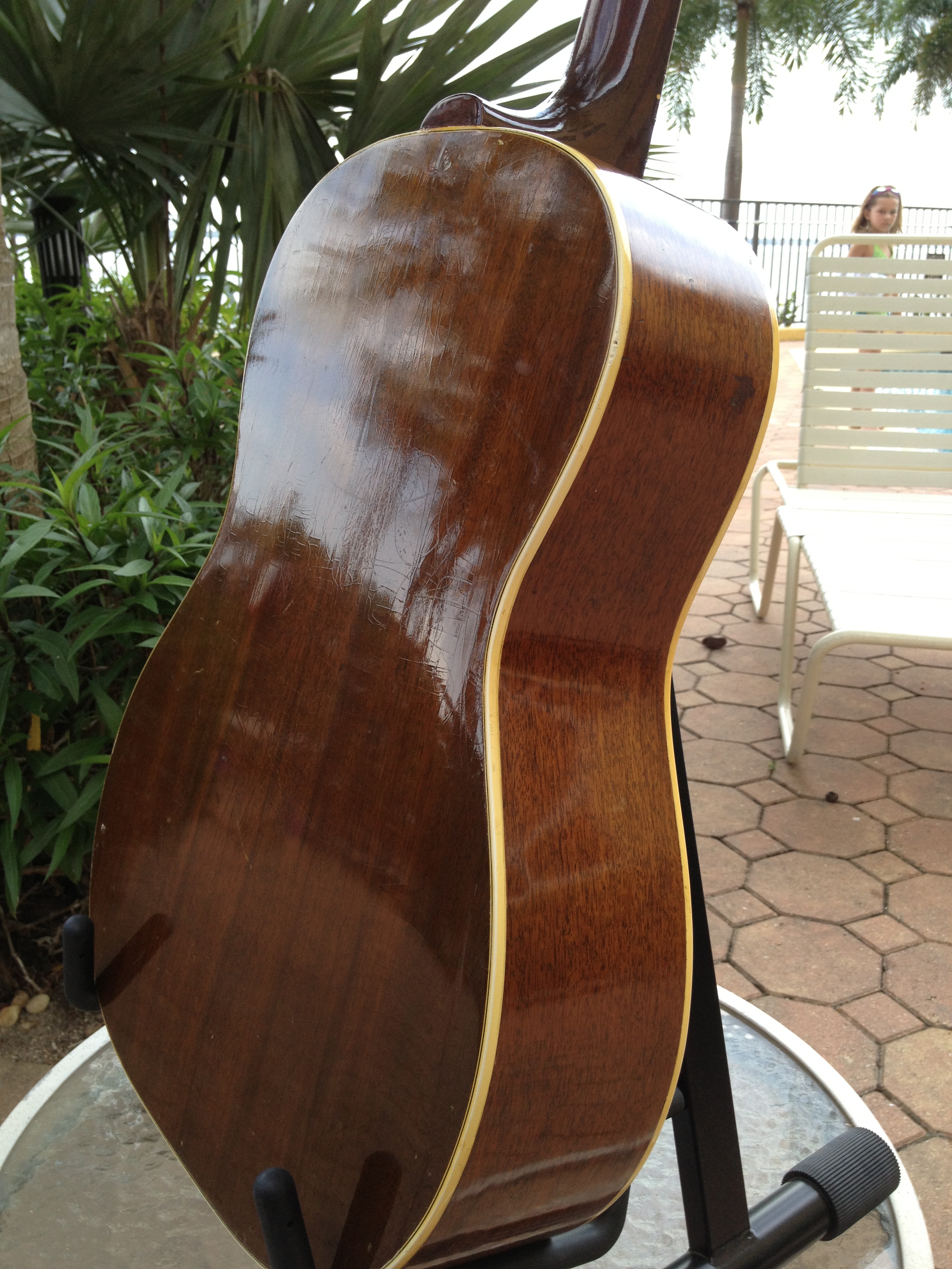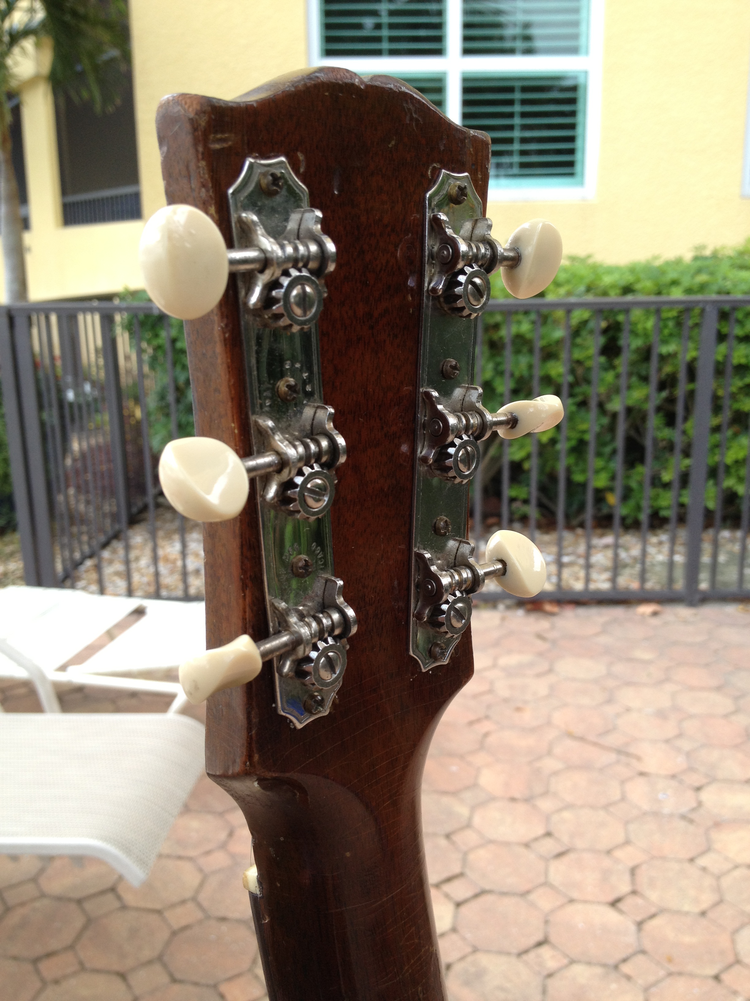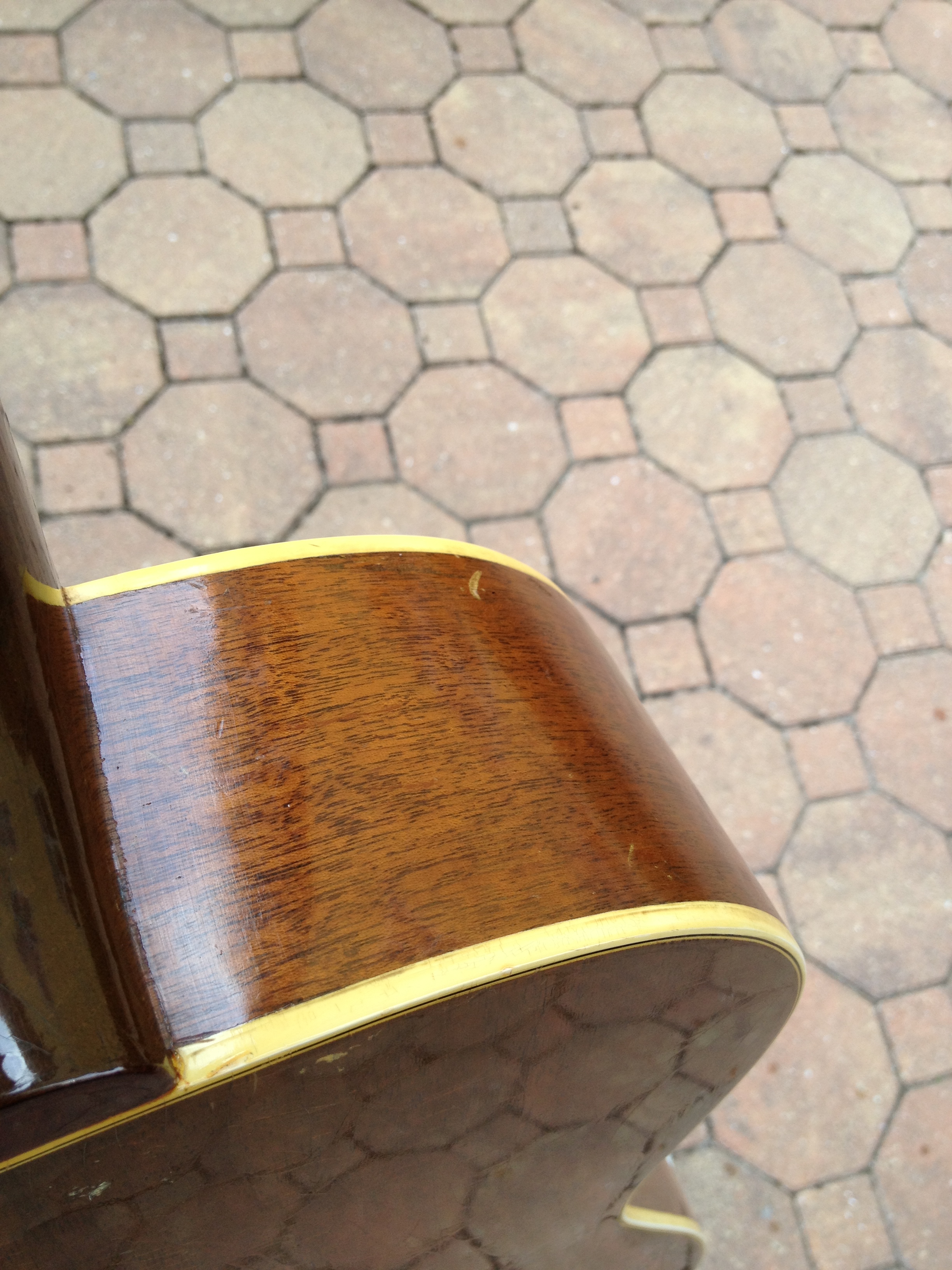 Features include a high grade and scarce for the day natural finish spruce top, solid mahogany back and sides and a single piece easy to play medium profile yet comfortable (not baseball bat size) solid mahogany carved neck measuring ~ 1 11/16″ at the nut. This wartime LG3 has the knife sharp bracing with a fully functional adjustable truss rod and a square neck block.