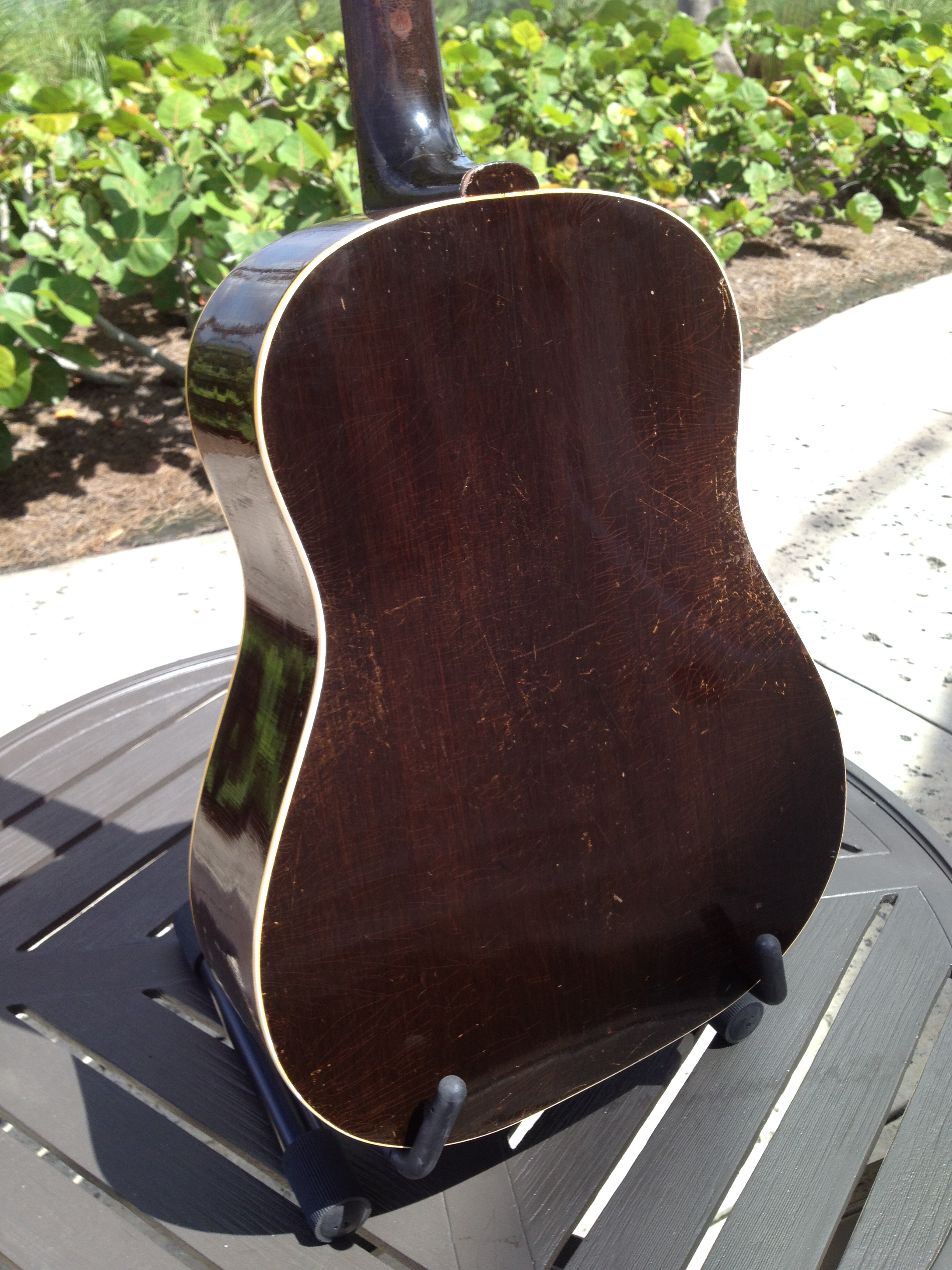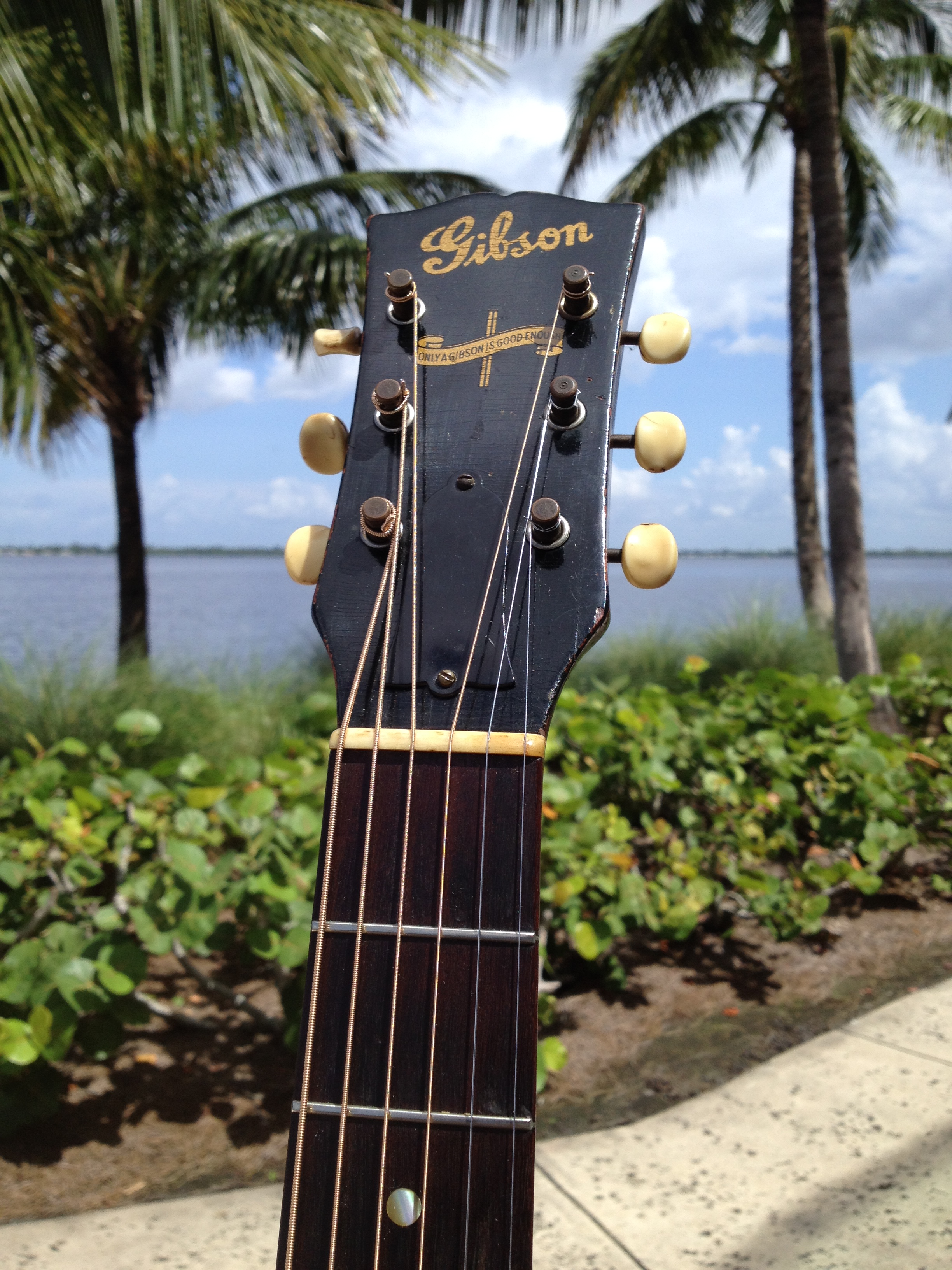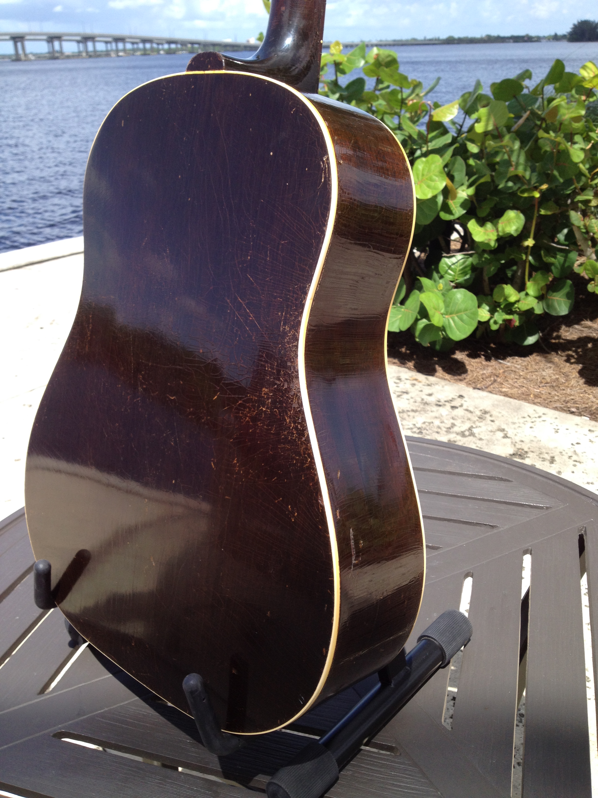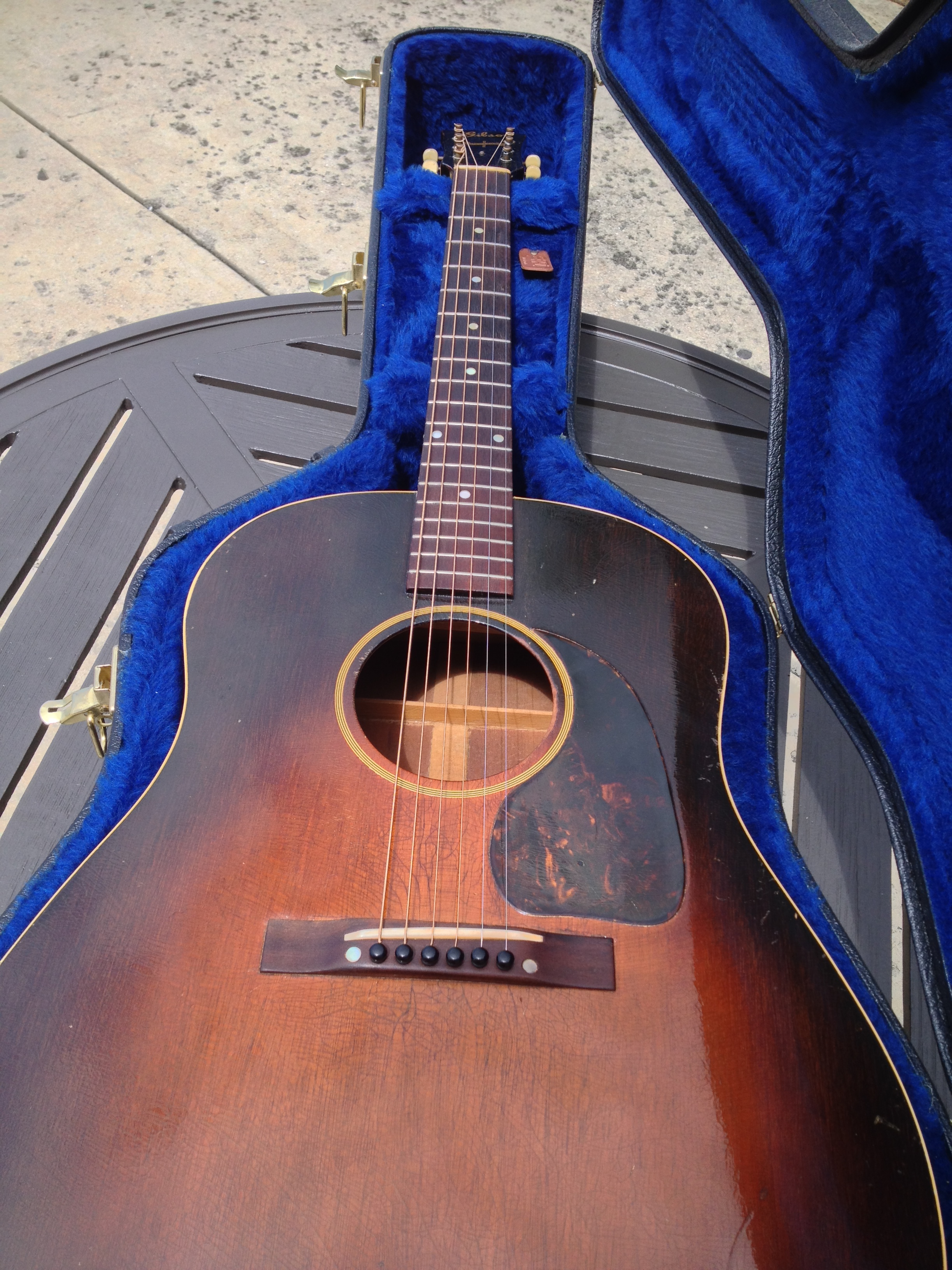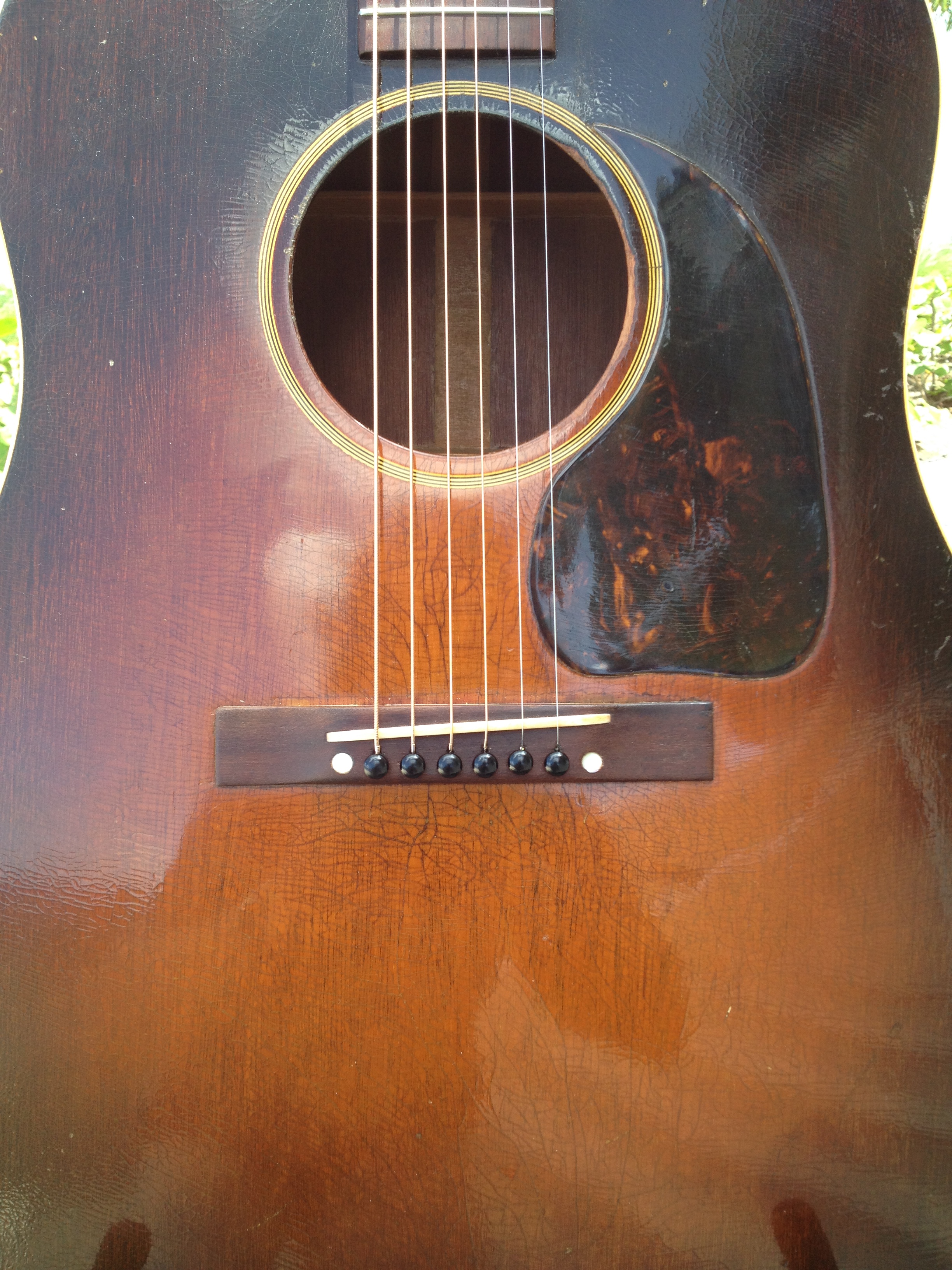 After acquisition, all conservation expertly performed by Ross Teigen Guitars of Naples Florida which was basically a tune up consisting of a flawless neck re set, re glue one back brace and re glue the bridge which had been off at some point in the past. Touched up the area around the bridge and installed a new (aged) bone saddle, the bone nut is original. And installed Antique Acoustics replica Gibson bridge pins (yes, the originals are in the case) ….. Voilà !!