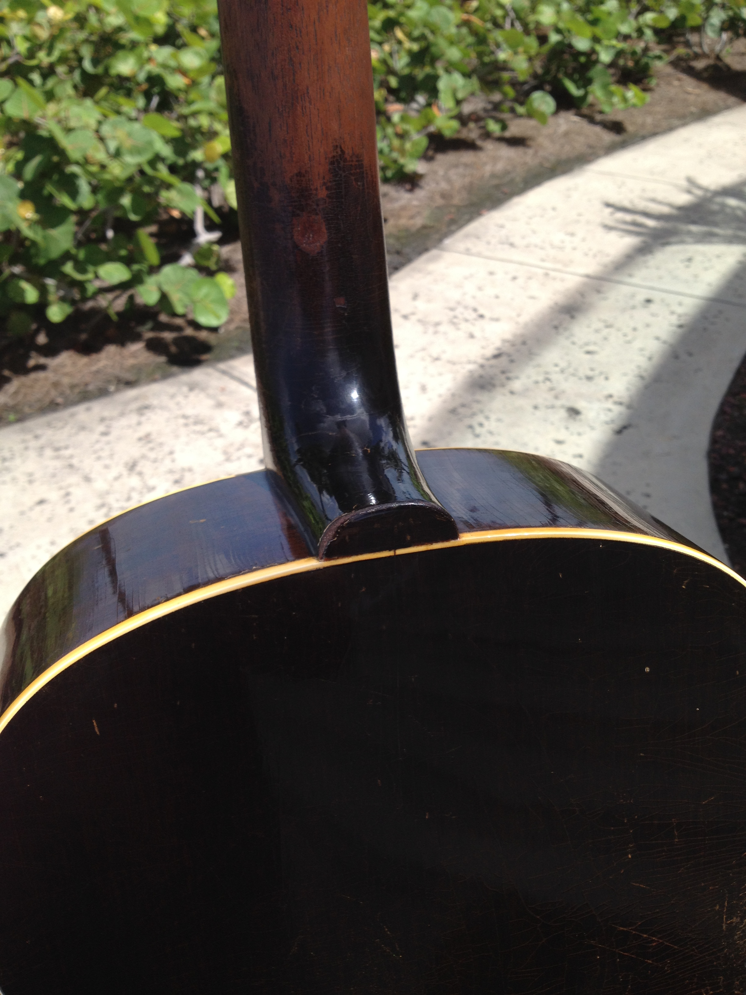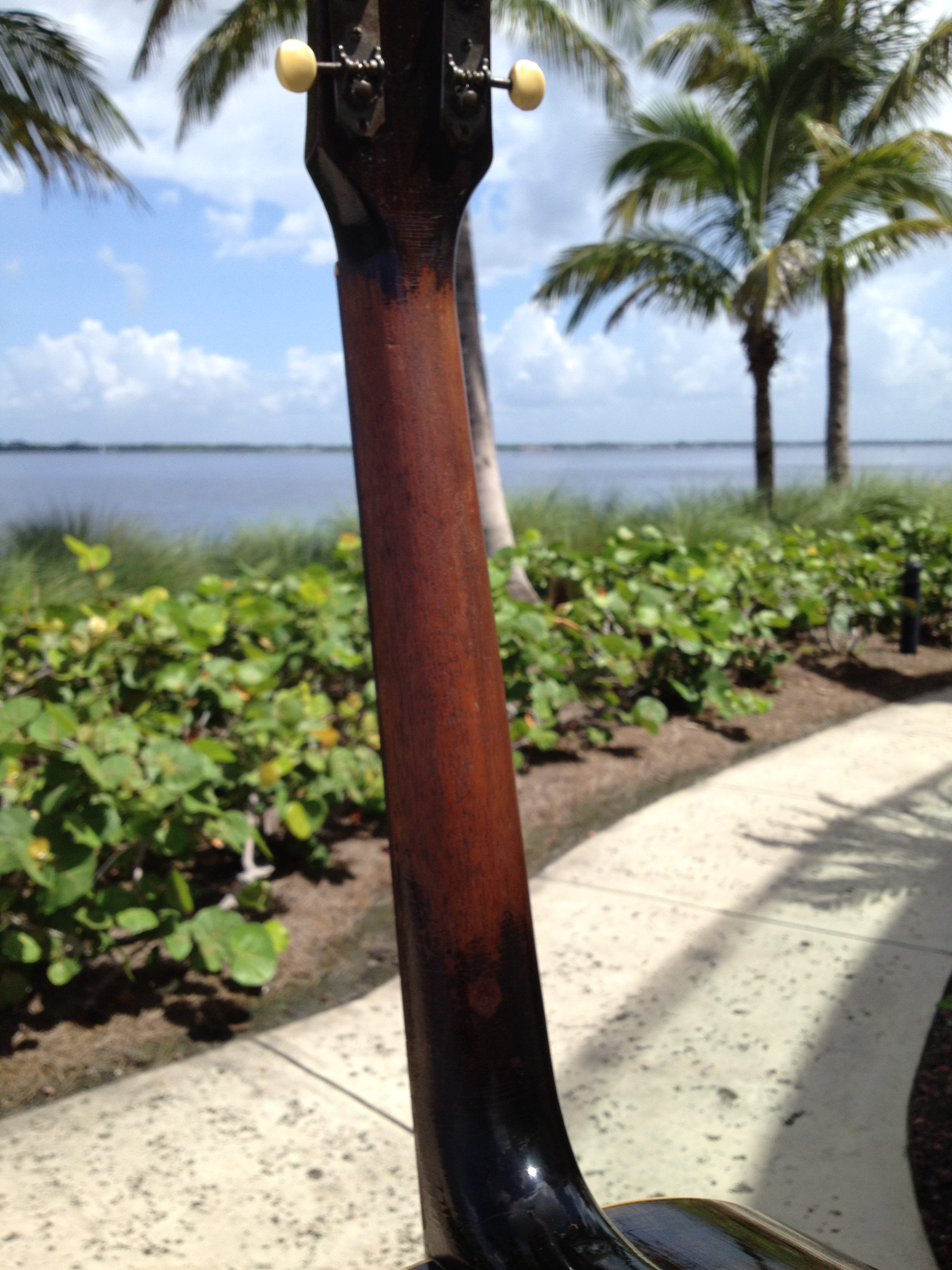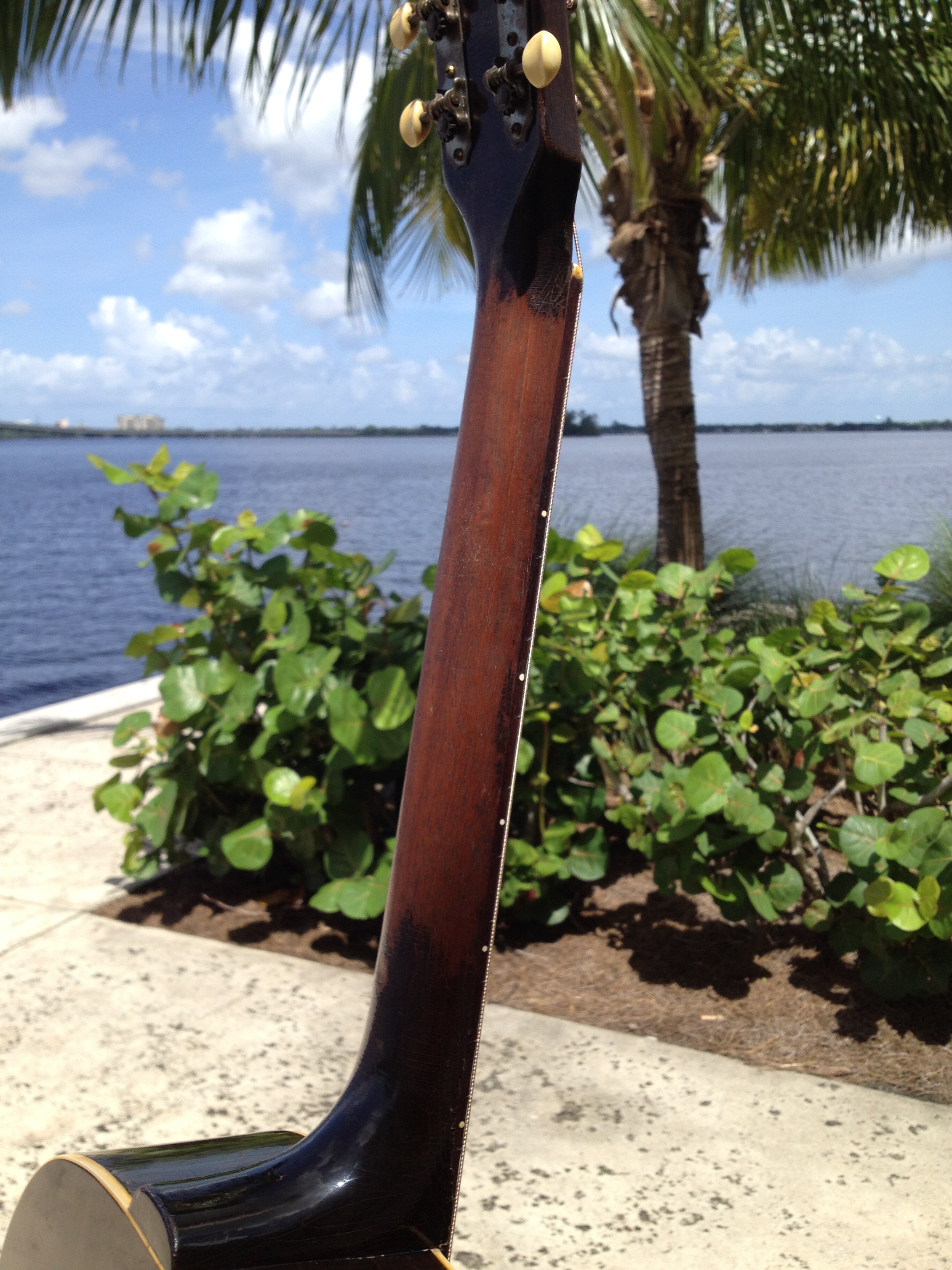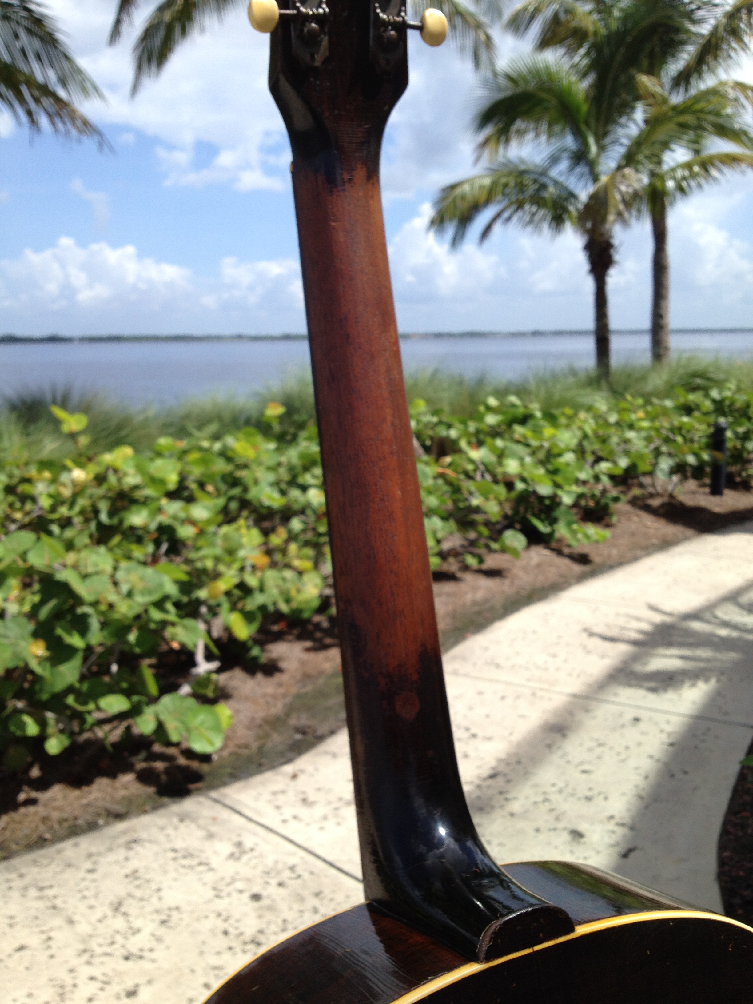 Comfortable and well worn oval shaped neck measuring no more than ~ 1″ in depth, certainly not the baseball bat neck of the examples found without adjustable truss rods.