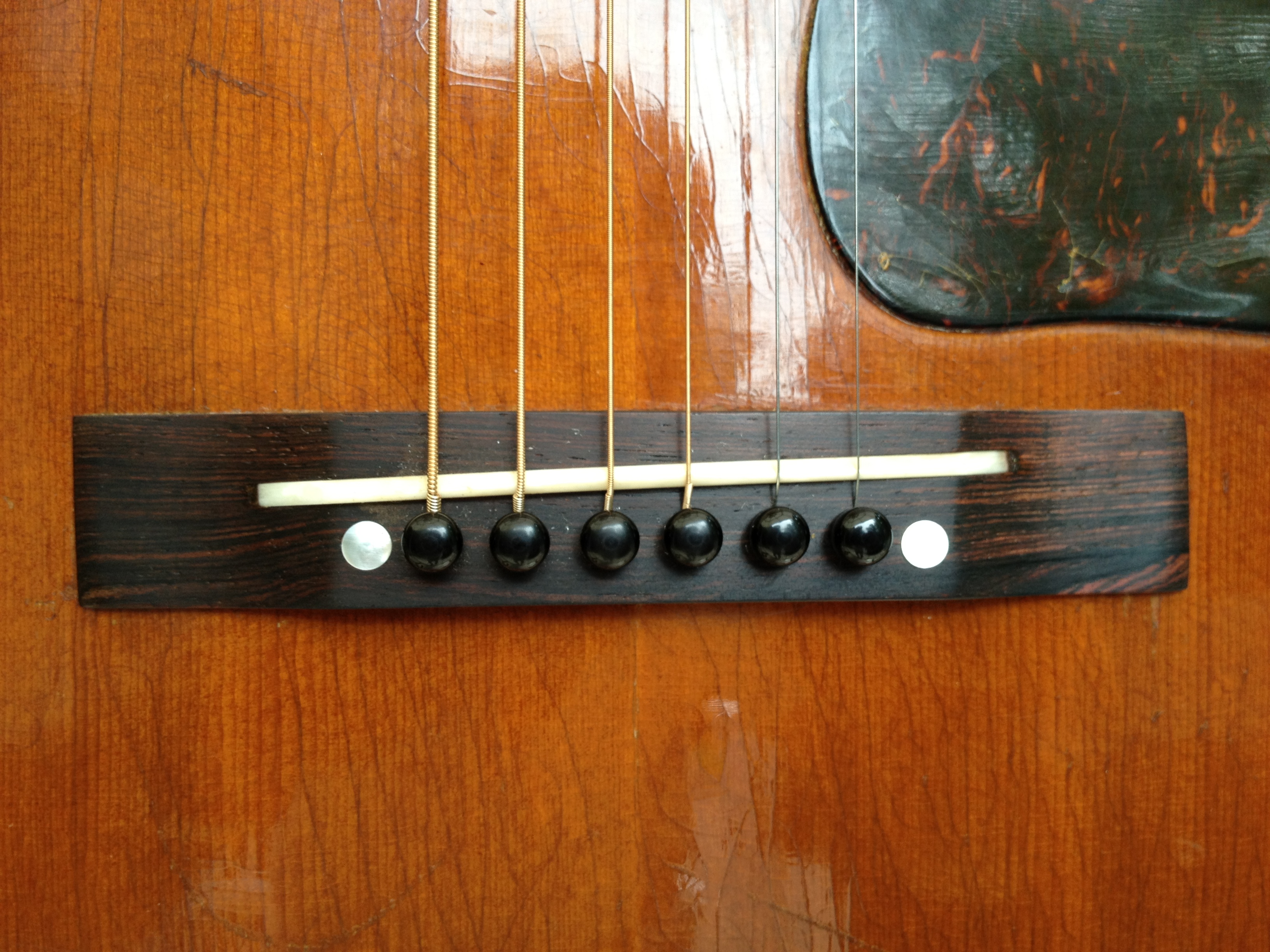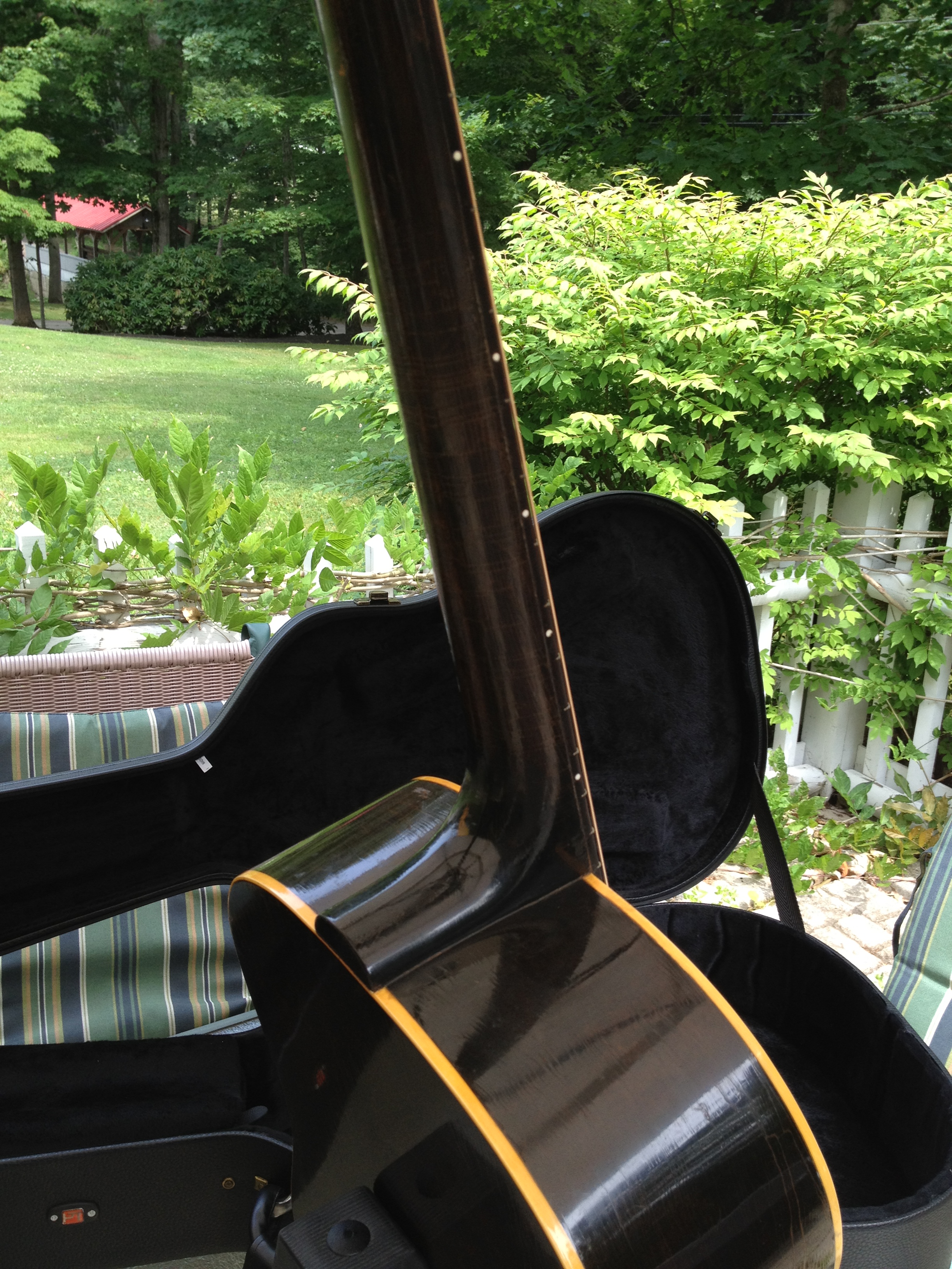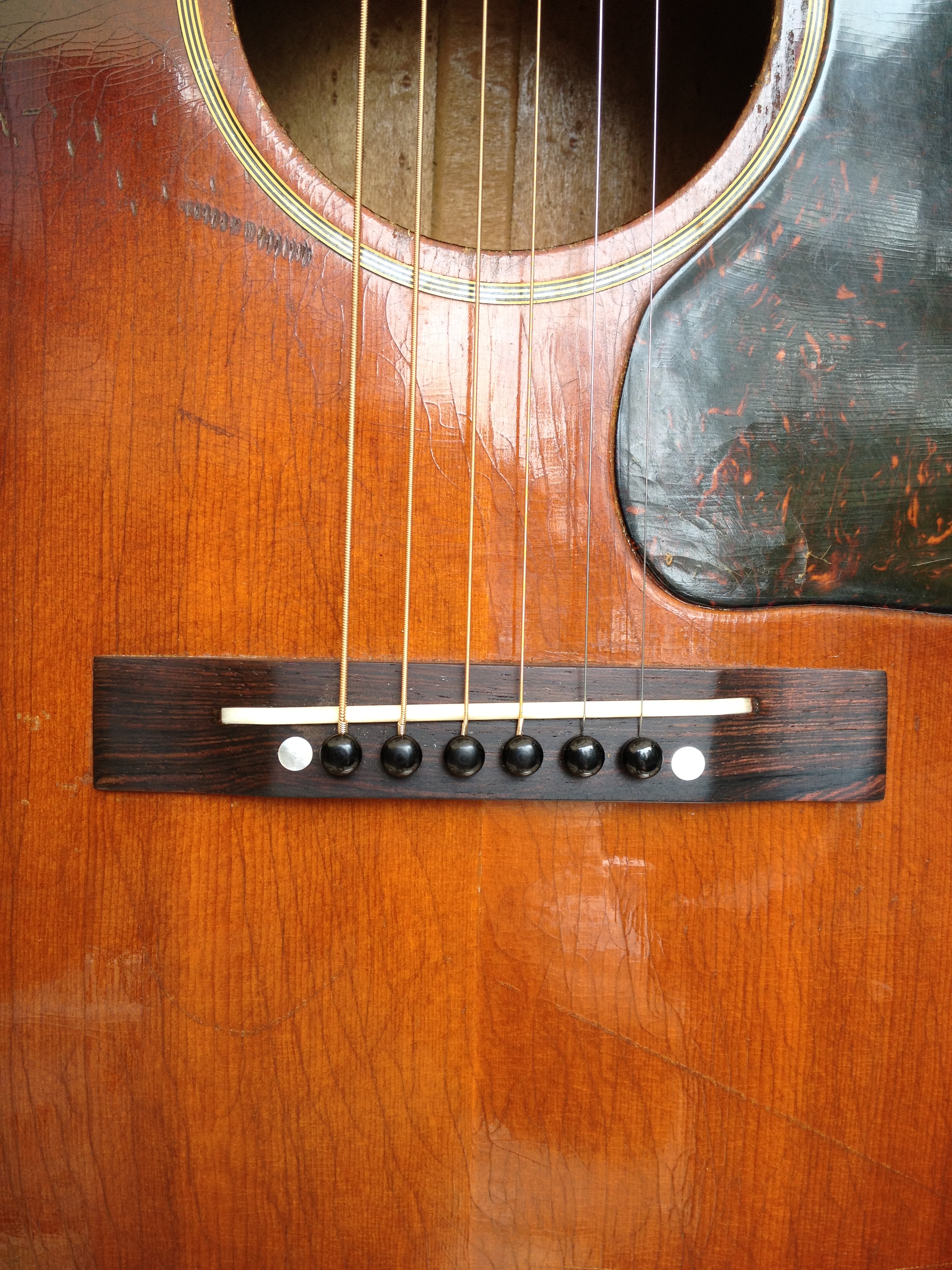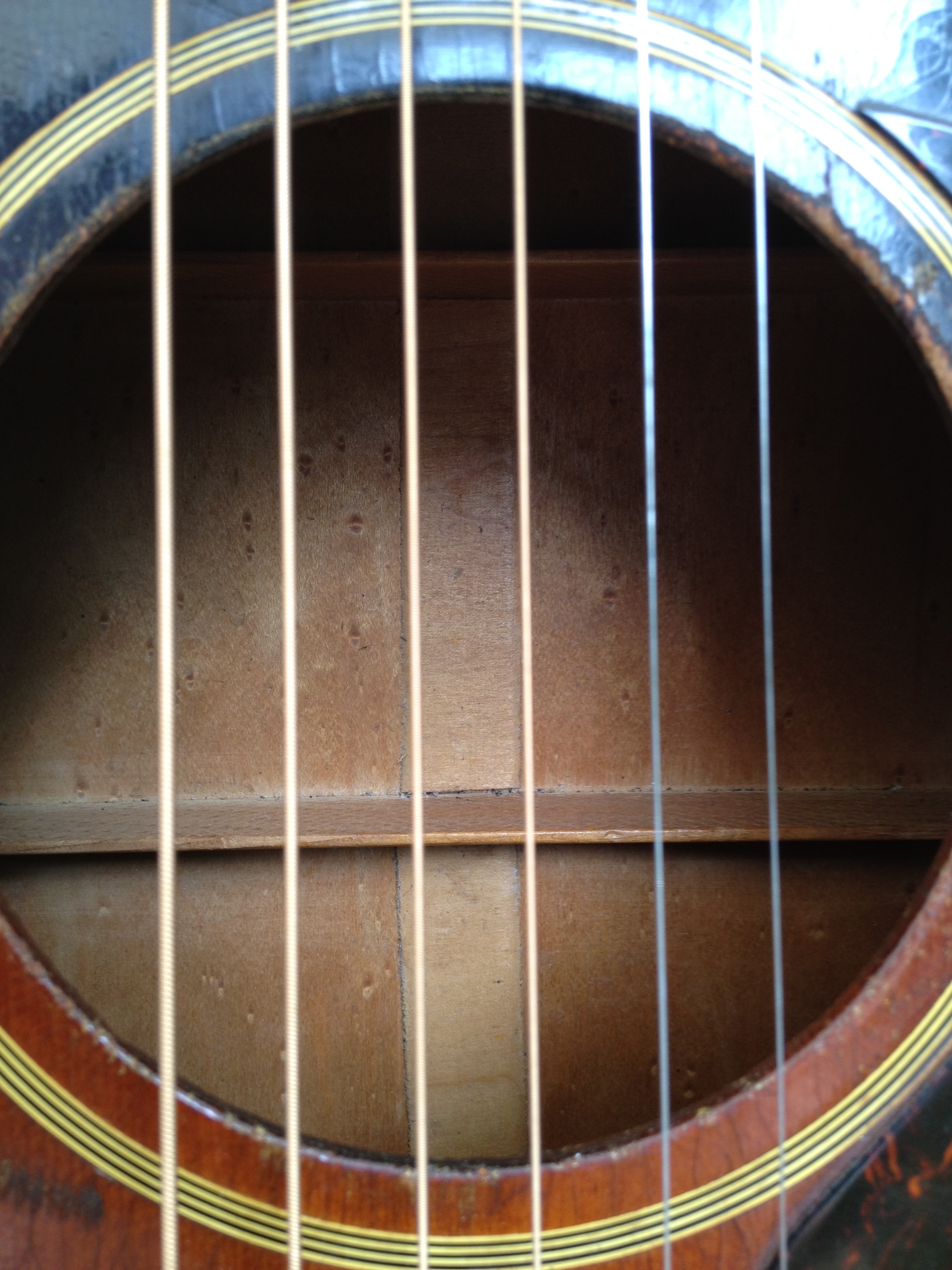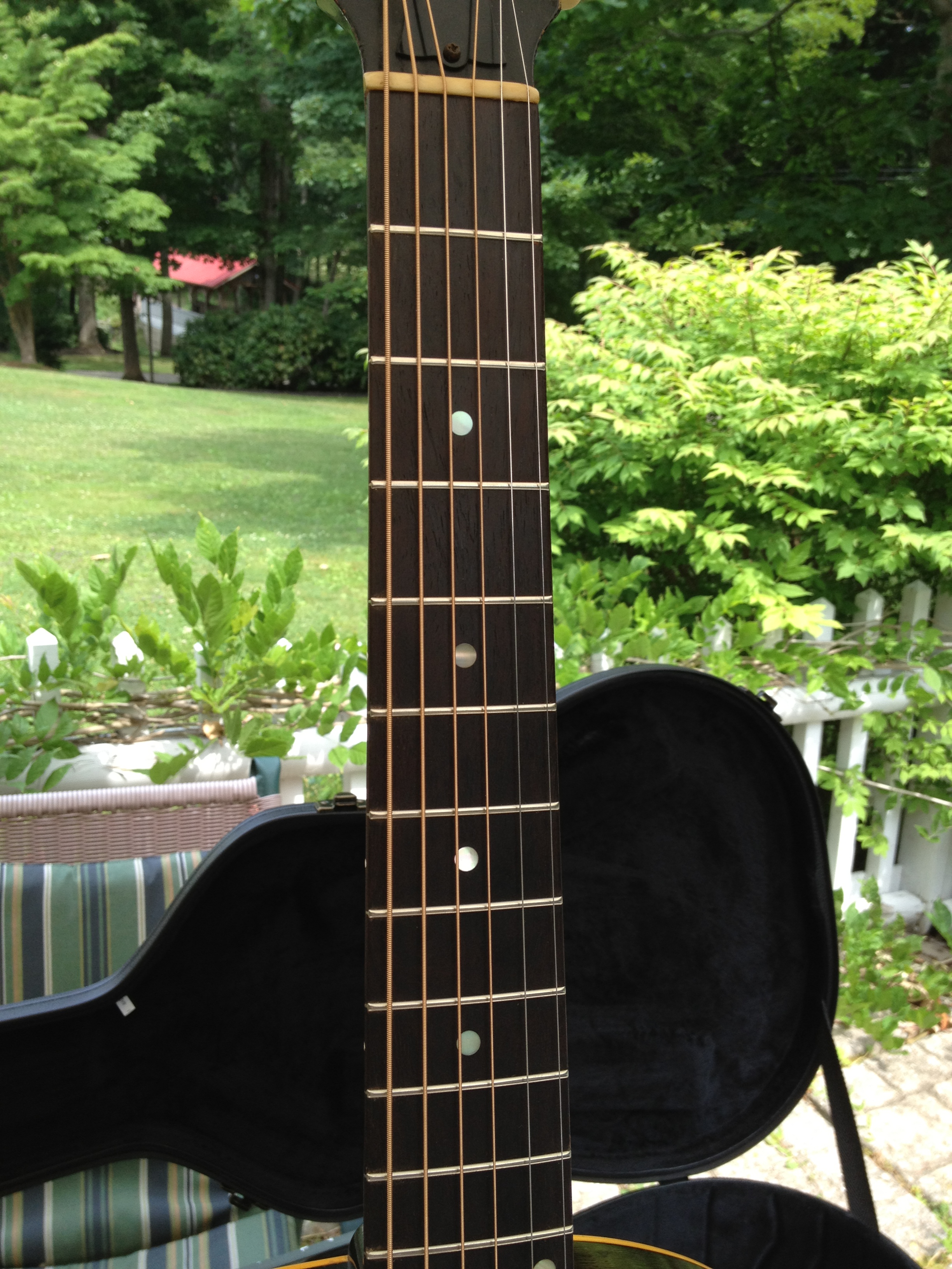 The professional set up is at 3 1/3 and 2 1/3 with proper string break and perfect intonation. No evidence of a prior neck re set. We did however do a proper refret and installed a beautifully crafted old growth Brazilian rosewood replica bridge with an aged bone saddle. Not a centimeter over sized and properly hide glued to the Adirondack top. The 1 3/4″ nut is original and a set of Willi Henkes authentic repro bridge pins from Germany were added. Exquisitely executed work performed by David Hatchard.