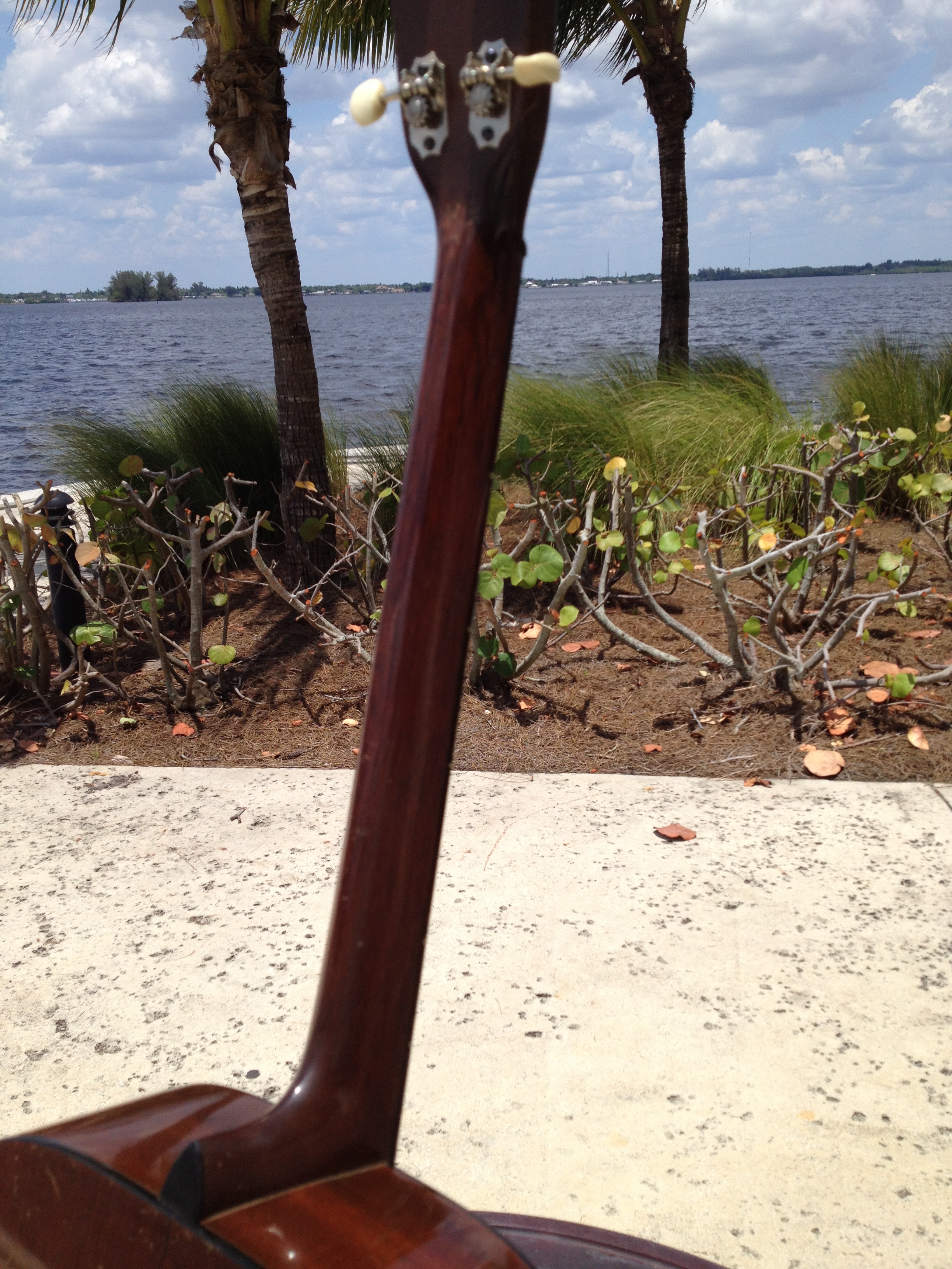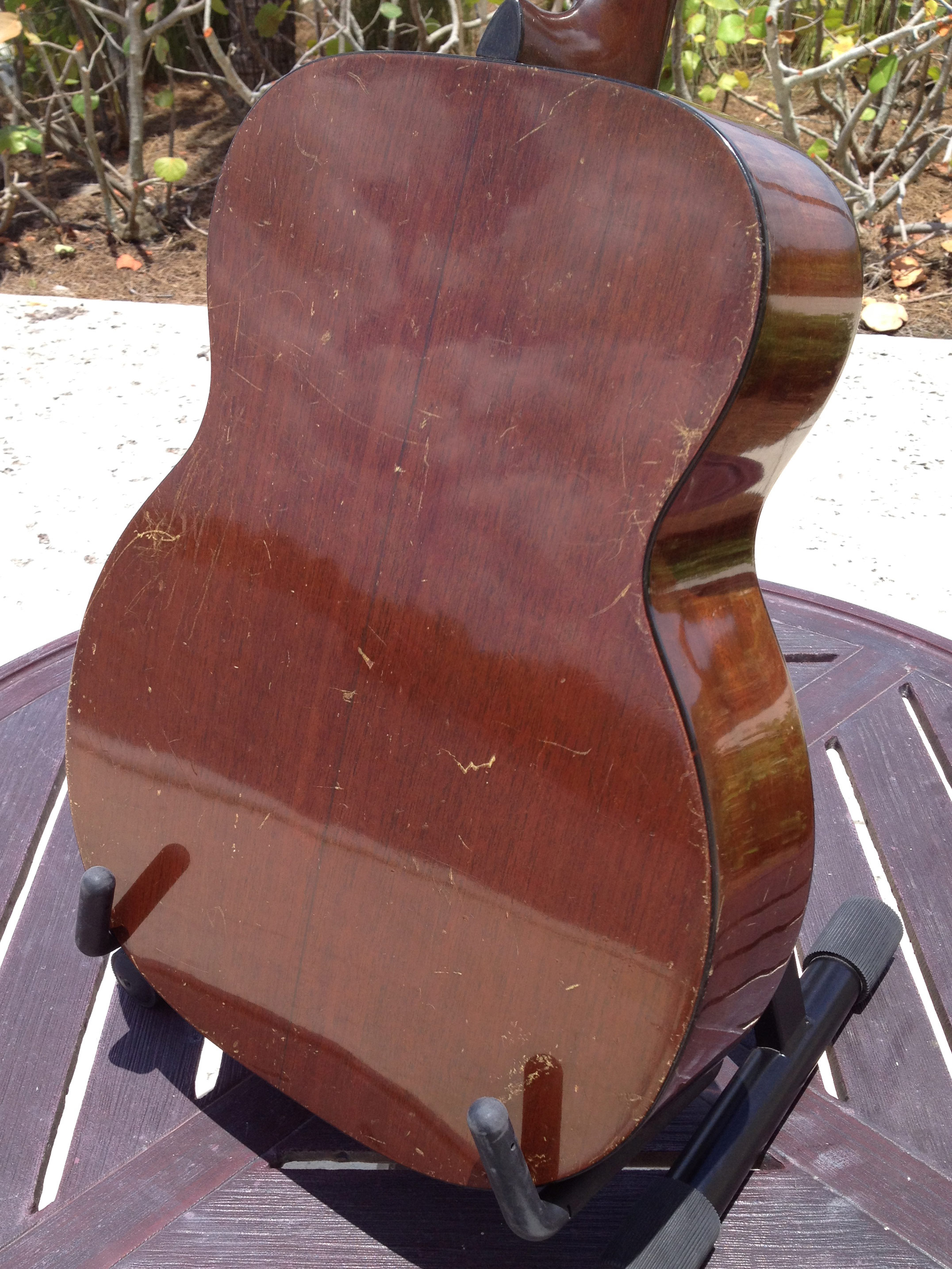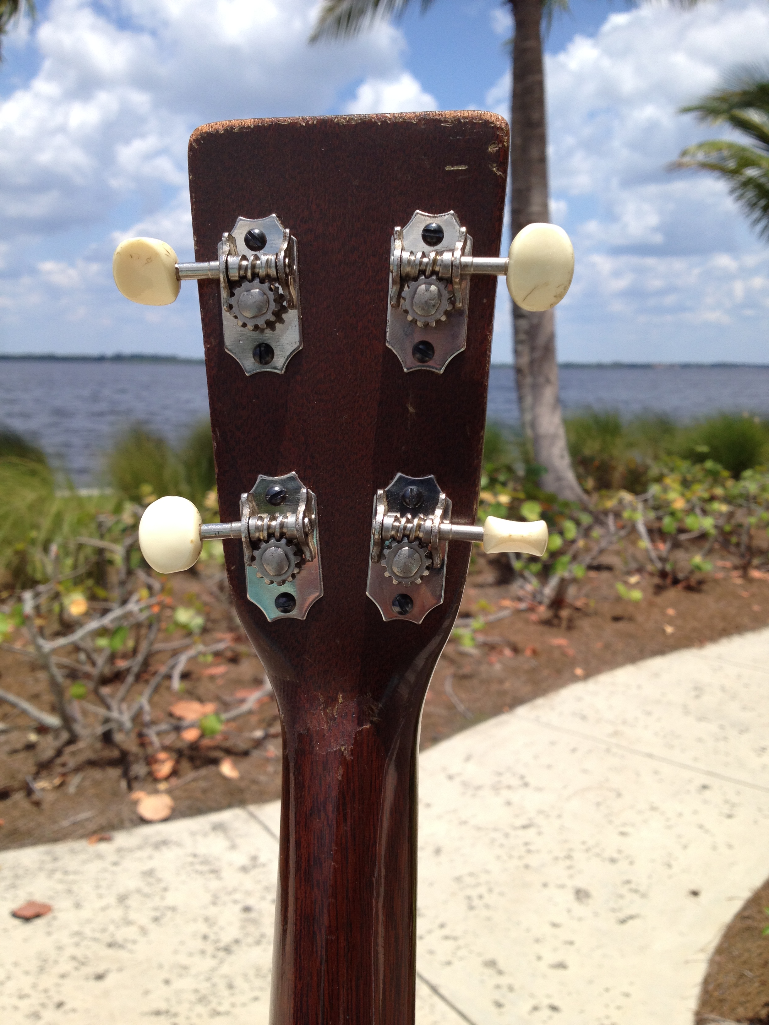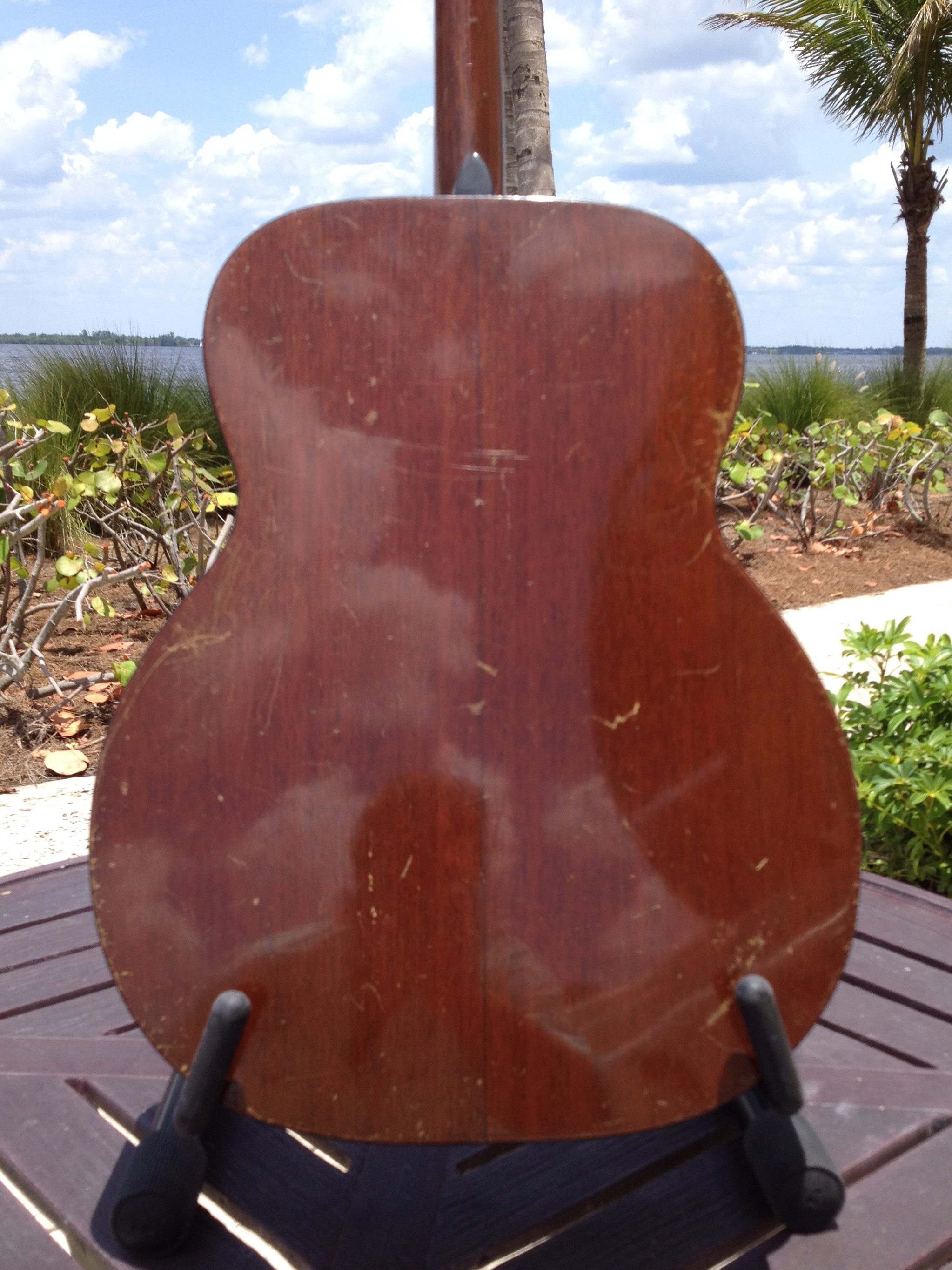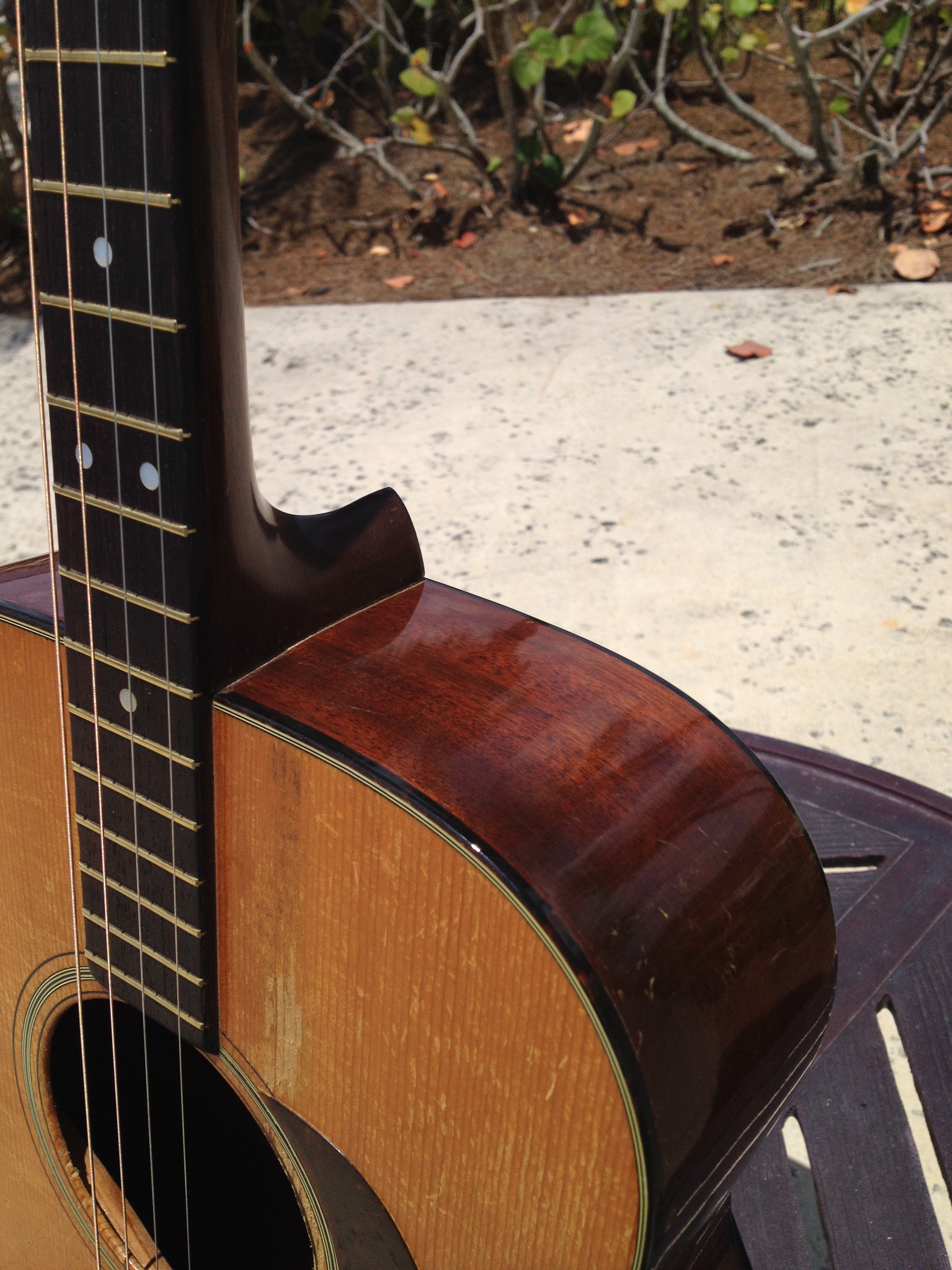 Luthier Ross Teigen of Naples, Florida performed routine maintenance work including re glue of some loose braces, dressing the original war time brass frets, and perform a comfortable set up. We currently have it strung with medium guitar strings tuned DGBE. We also recommend tenor tuning (CGDA) with John Pearse tenor strings and would be happy to ship it to you either way. Mandolin family players will prefer the CGDA tuning for the familiar intervals, while guitarists will find playing the top four strings of a guitar the most familiar. This truly is a thinking players guitar.