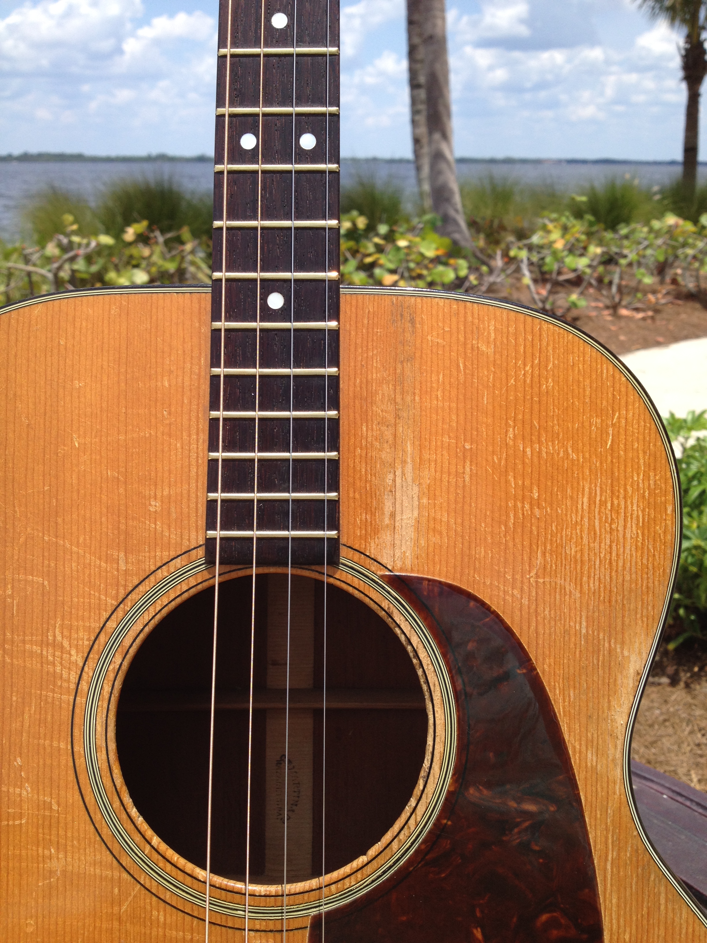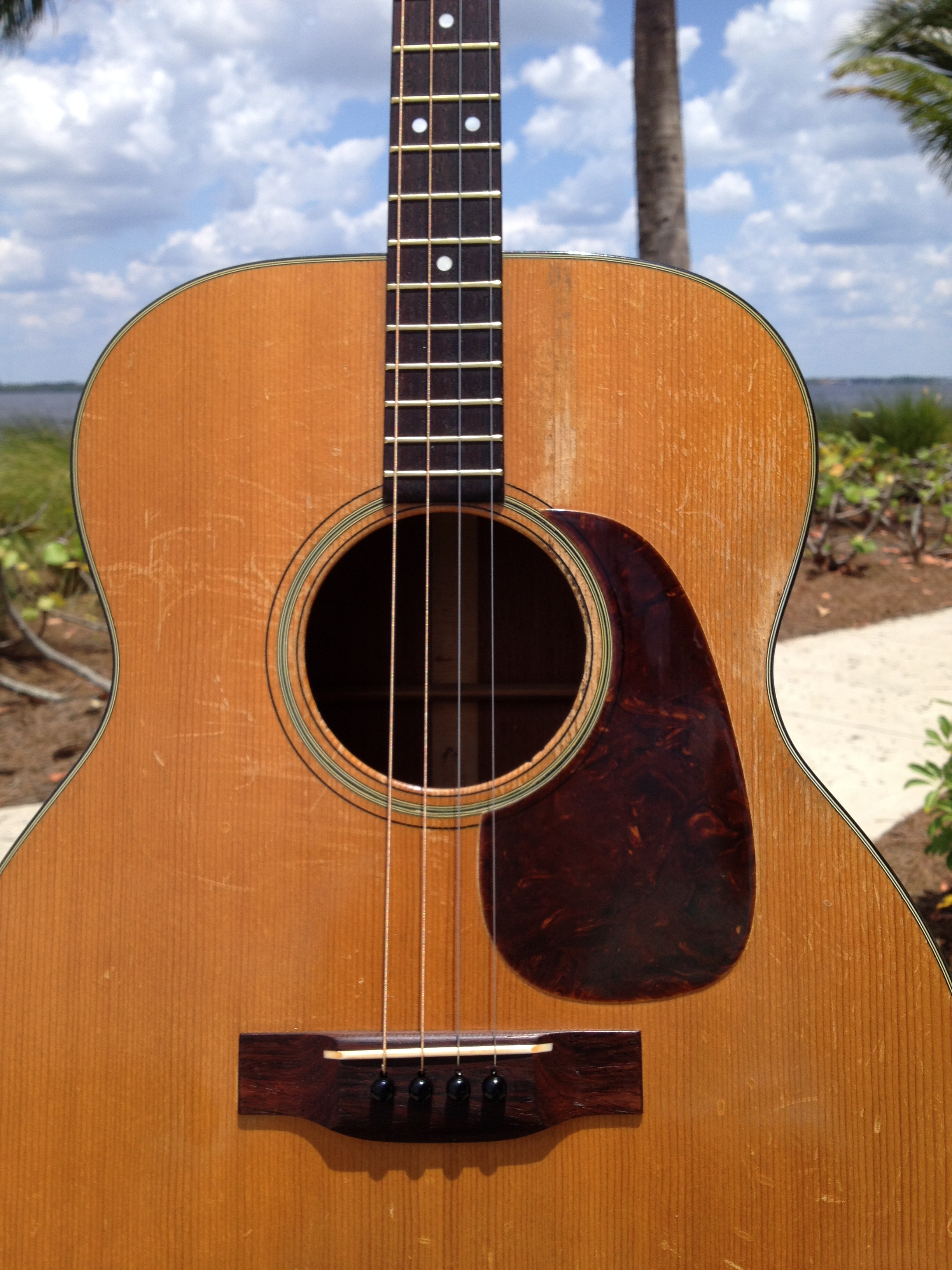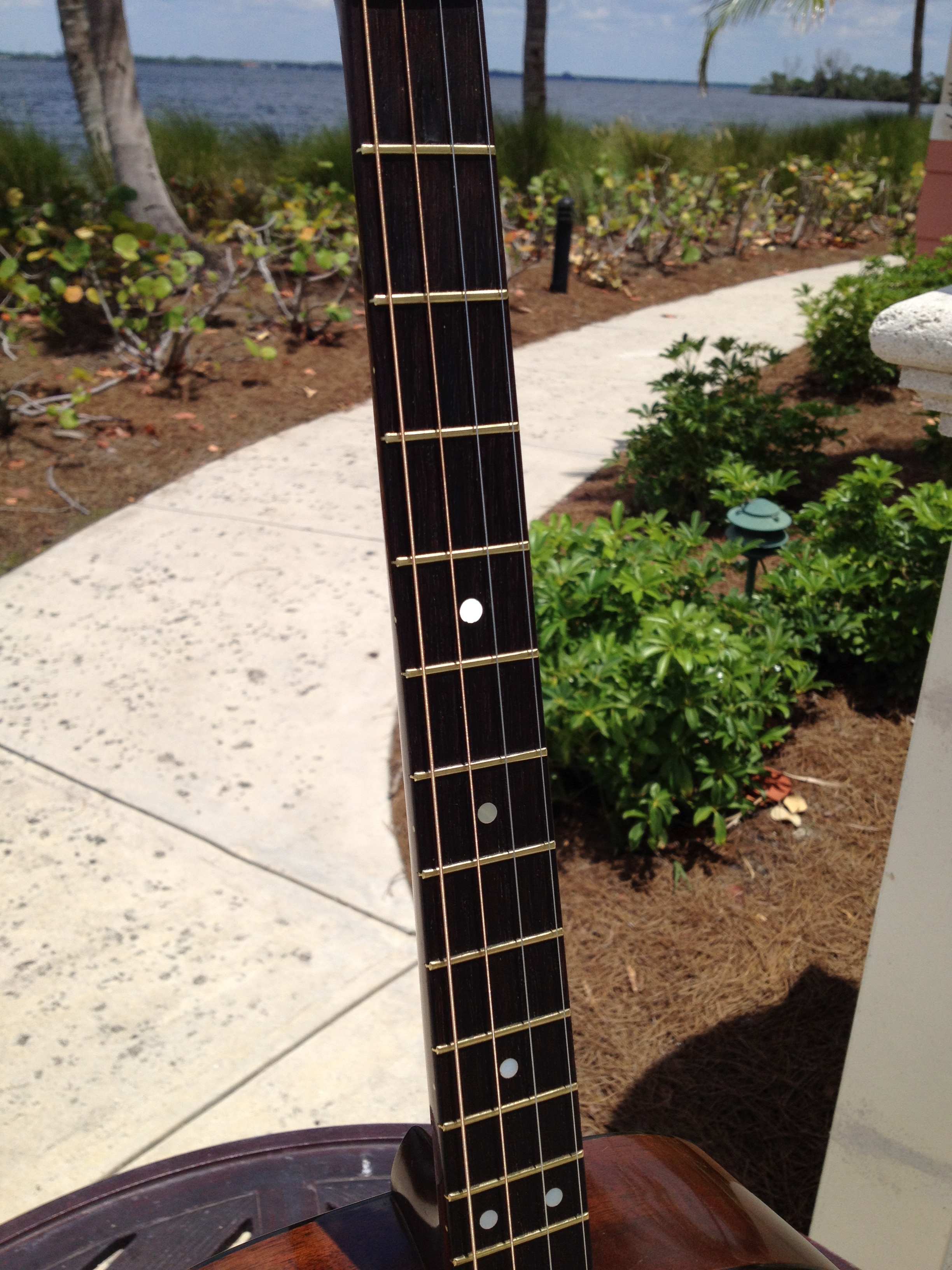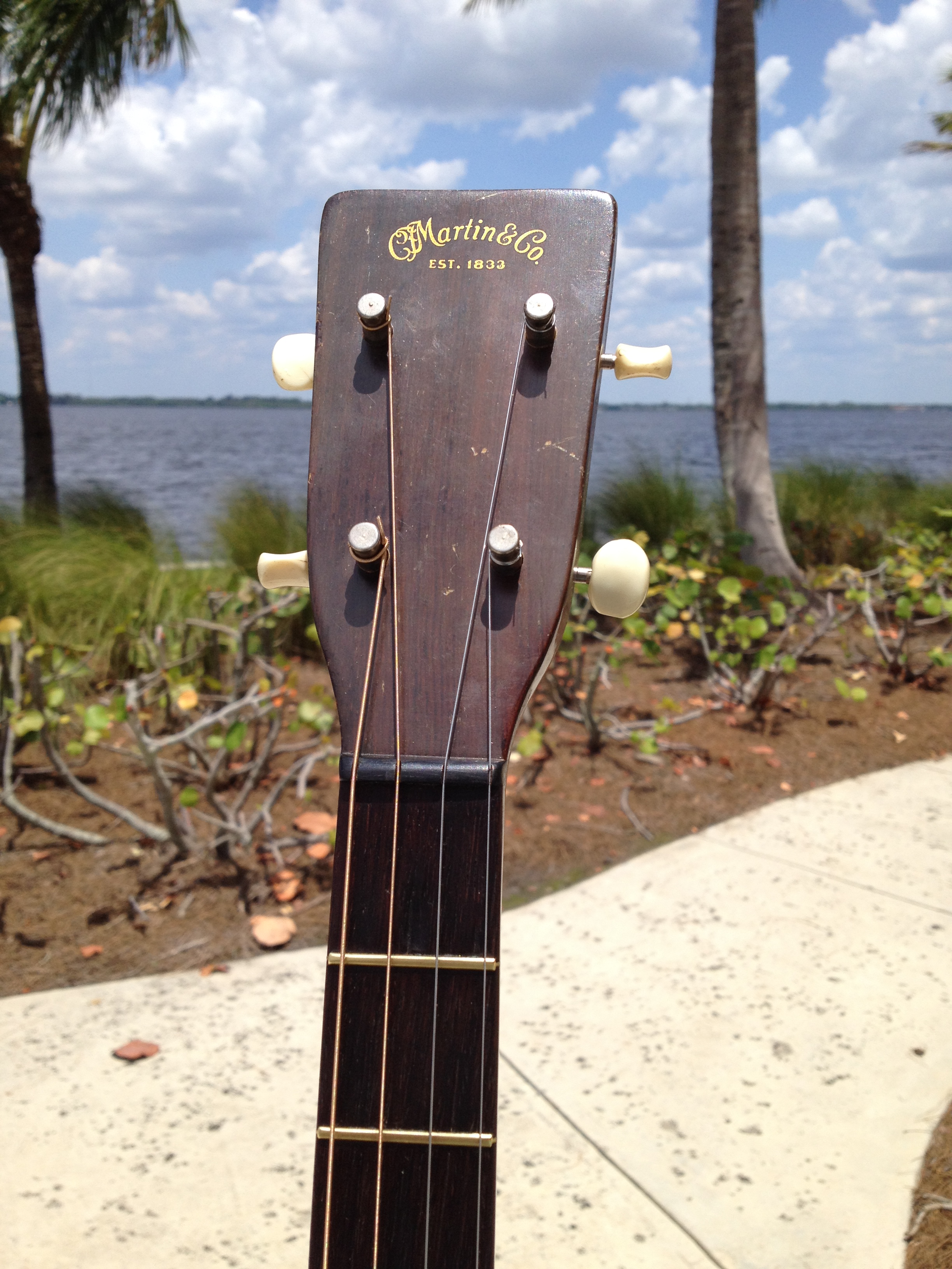 Luthier Ross Teigen of Naples, Florida performed routine maintenance work including re glue of some loose braces, dressing the original war time brass frets, and perform a comfortable set up. We currently have it strung with medium guitar strings tuned DGBE. We also recommend tenor tuning (CGDA) with John Pearse tenor strings and would be happy to ship it to you either way. Mandolin family players will prefer the CGDA tuning for the familiar intervals, while guitarists will find playing the top four strings of a guitar the most familiar. This truly is a thinking players guitar.