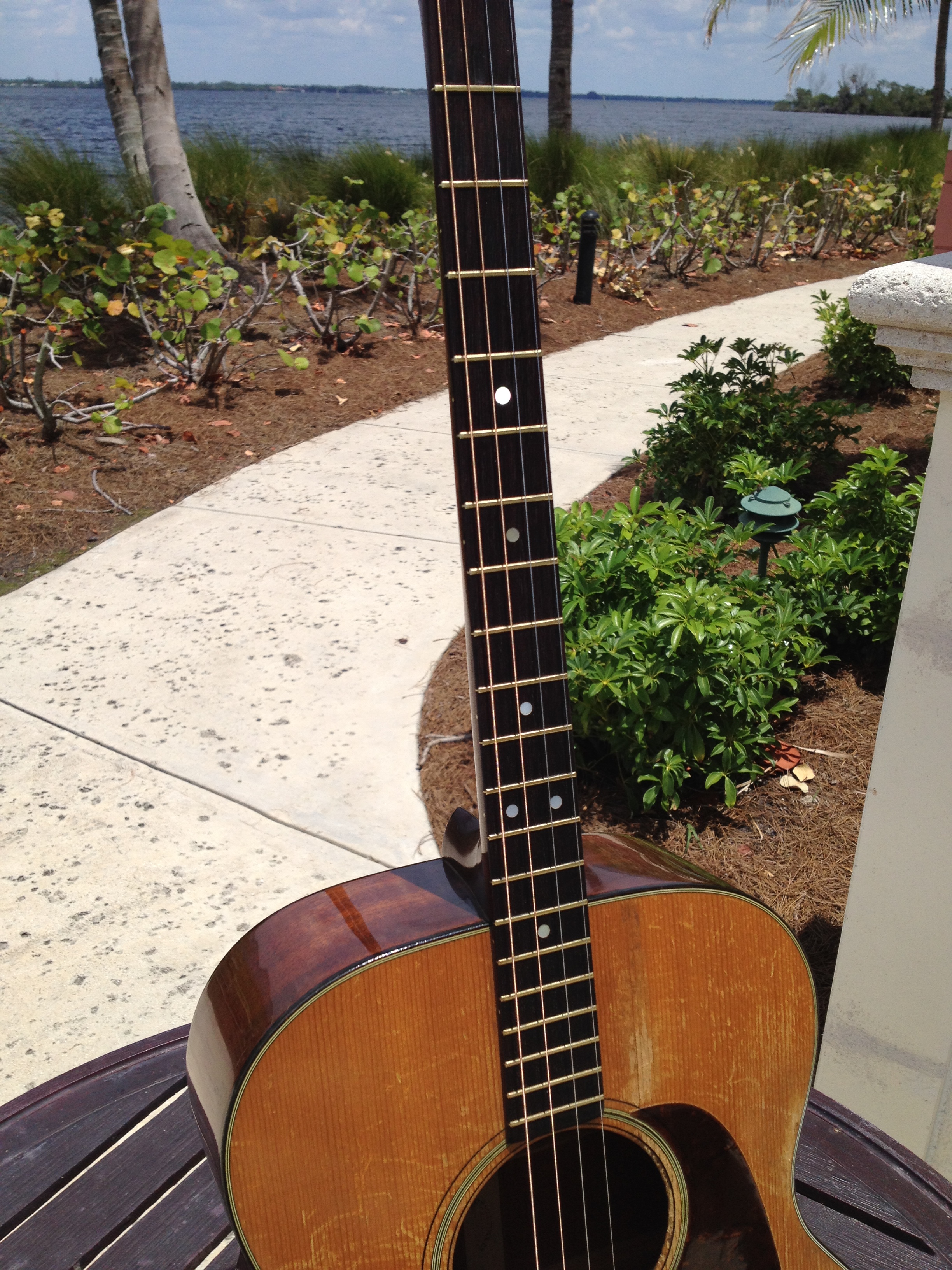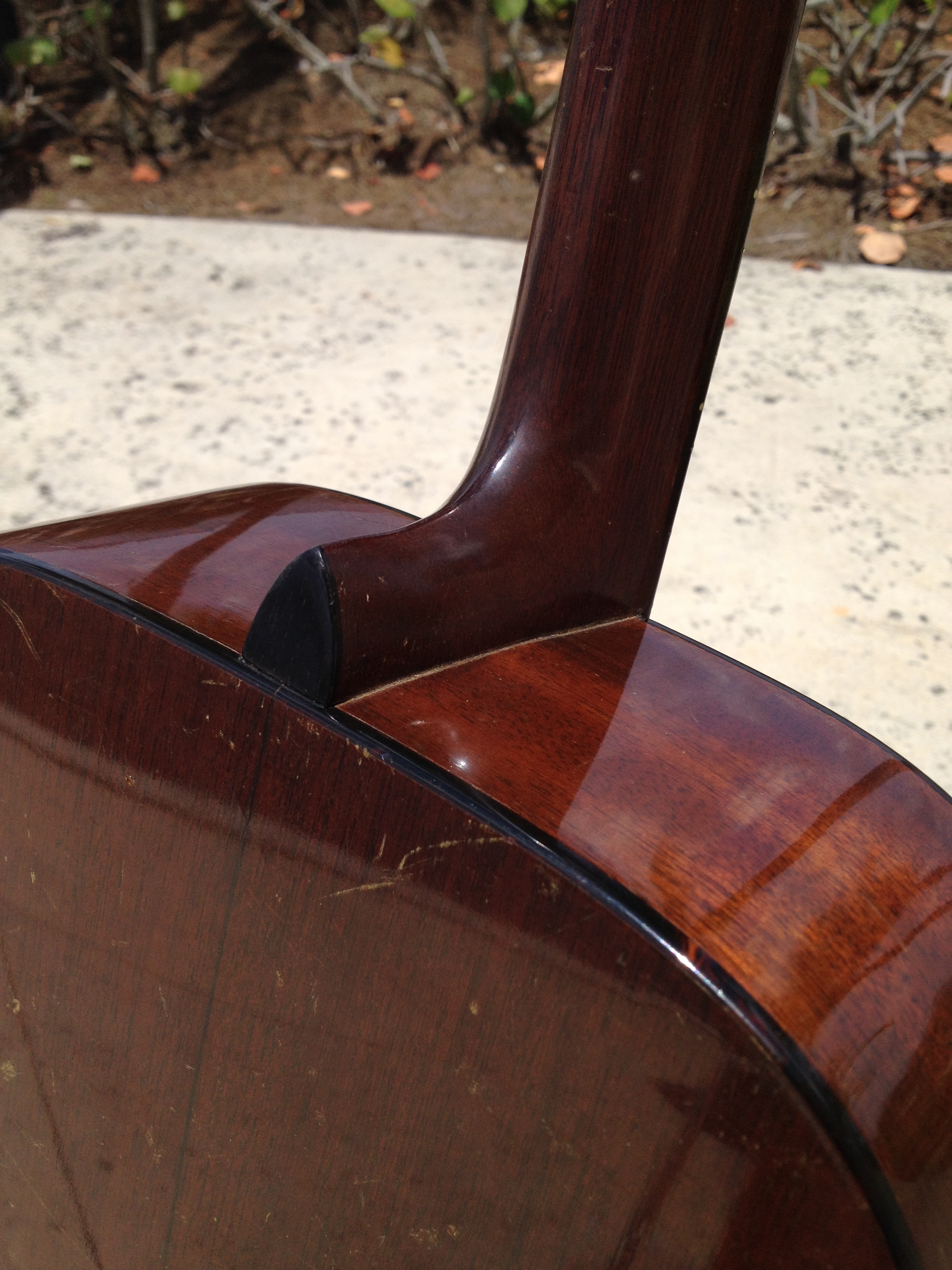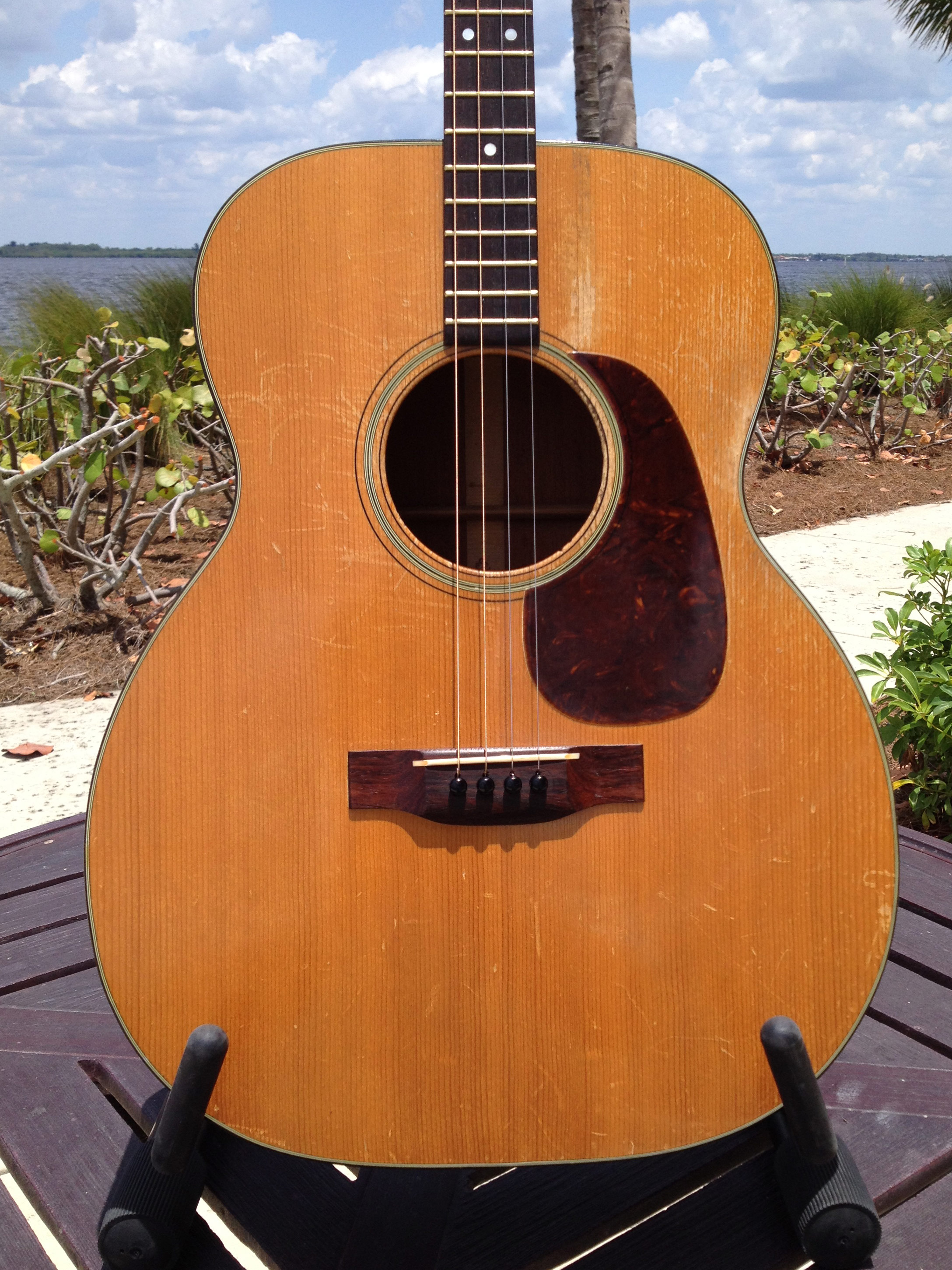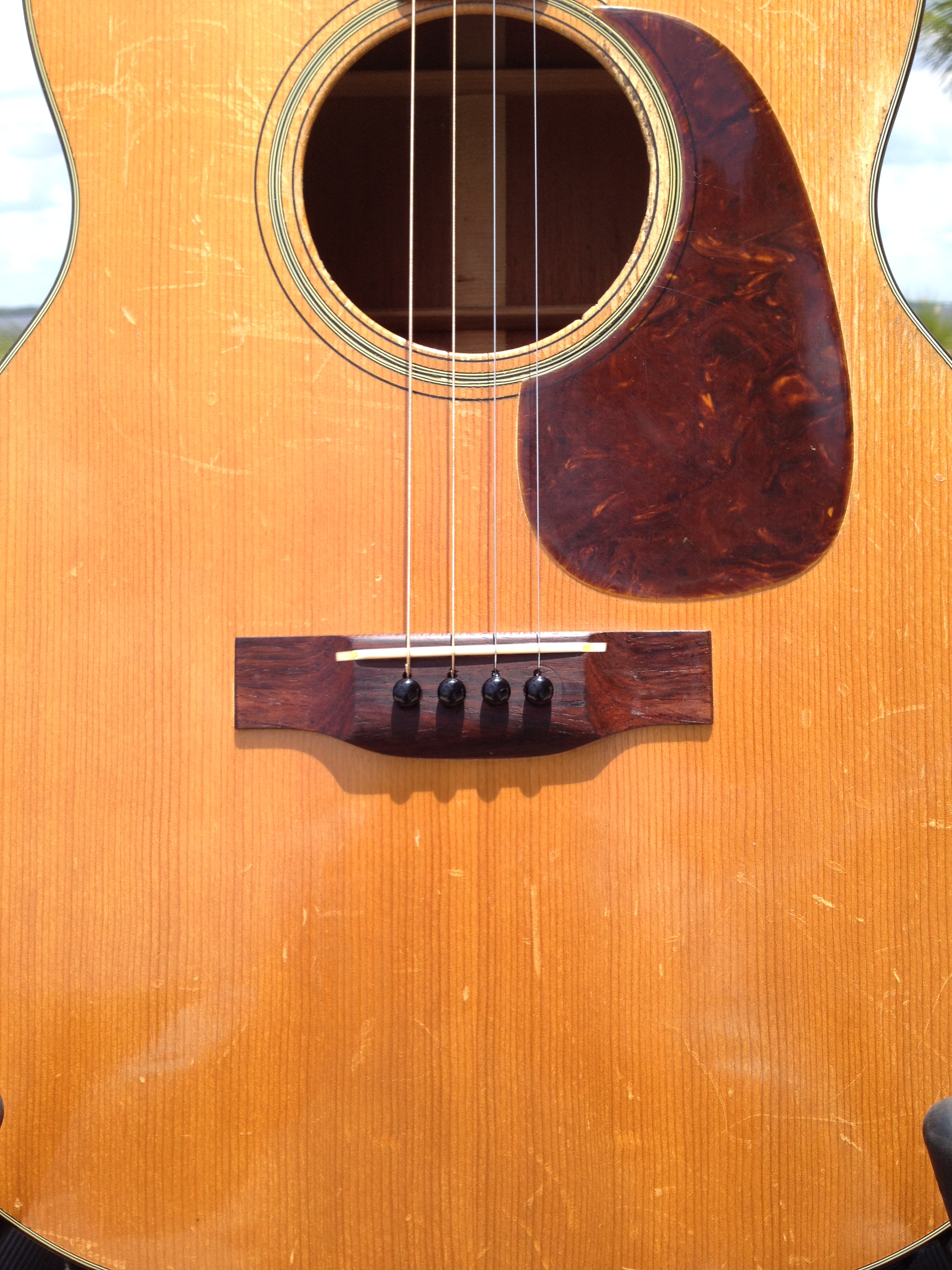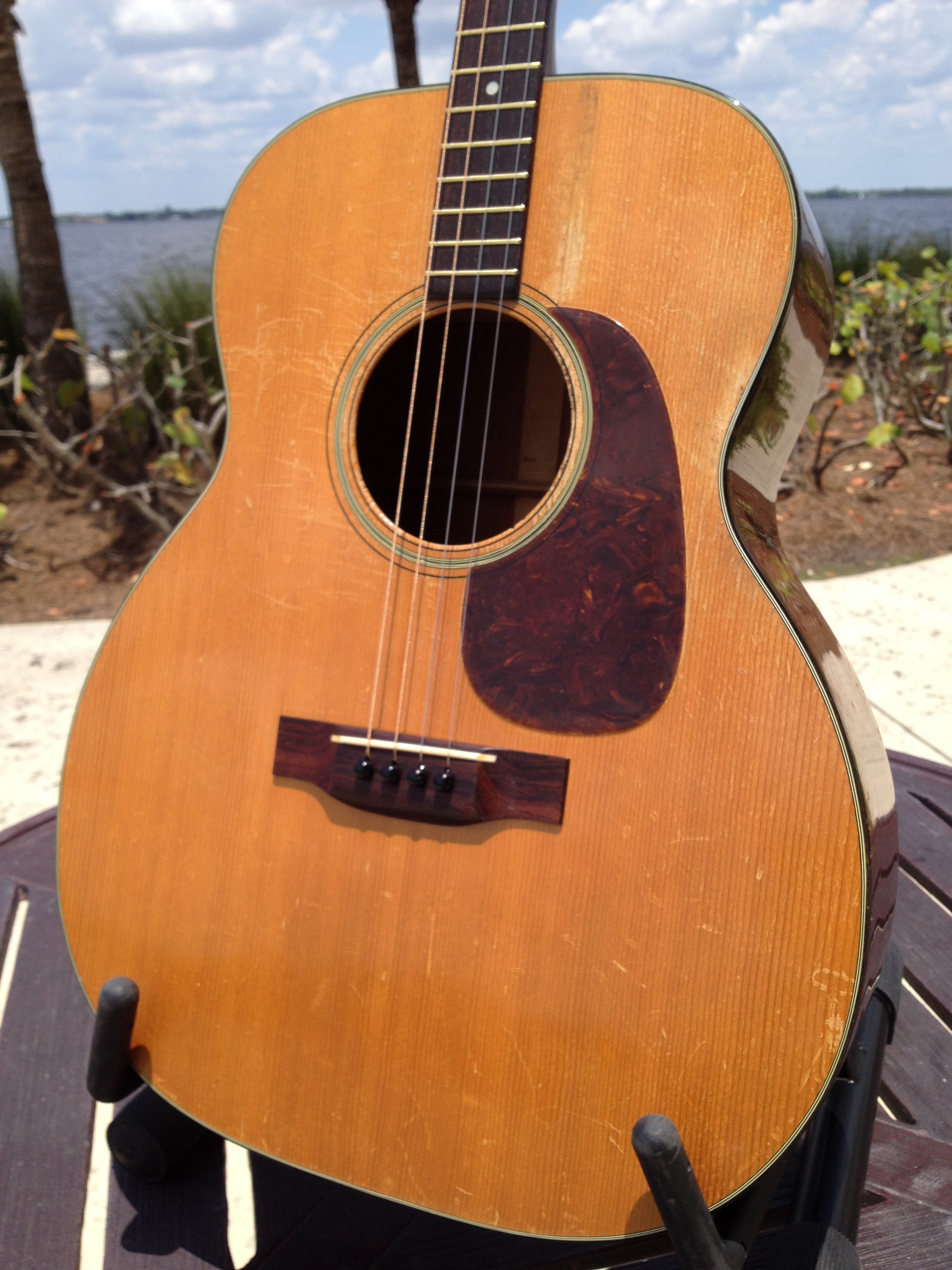 Luthier Ross Teigen of Naples, Florida performed routine maintenance work including re glue of some loose braces, dressing the original war time brass frets, and perform a comfortable set up. We currently have it strung with medium guitar strings tuned DGBE. We also recommend tenor tuning (CGDA) with John Pearse tenor strings and would be happy to ship it to you either way. Mandolin family players will prefer the CGDA tuning for the familiar intervals, while guitarists will find playing the top four strings of a guitar the most familiar. This truly is a thinking players guitar.