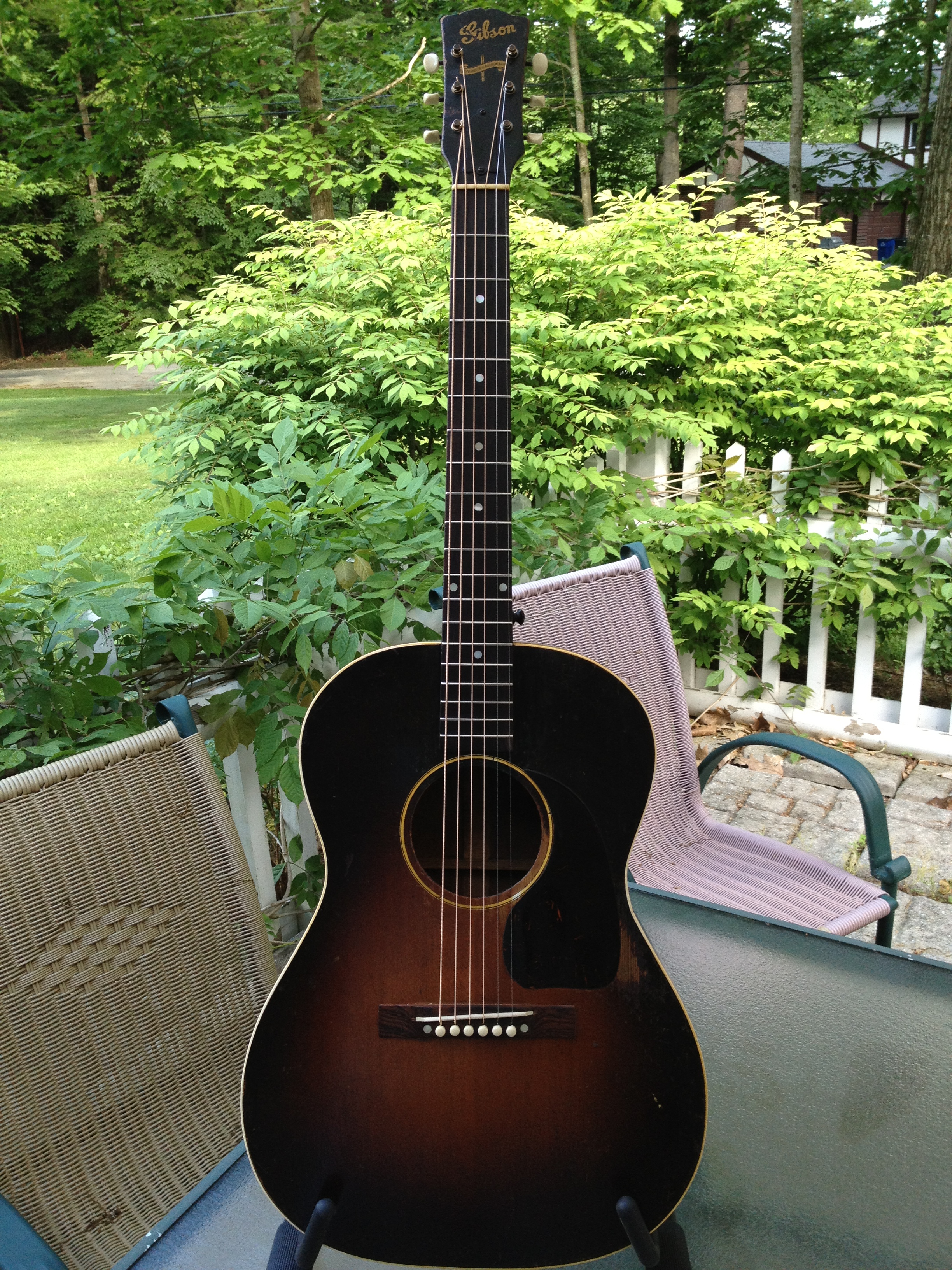 1945 Gibson LG2 with the Banner Headstock. Stunning wartime survivor and a lively player. Desirable two piece Adirondack spruce top, single piece mahogany back and sides. Scalloped X bracing with a 24 3/4″ scale, 1 3/4″ nut and featuring the single piece solid mahogany neck with the rounded chunky profile and a fully functional adjustable truss rod and mahogany blocks. Nice flat top with a clean original finish and no over-spray and crack free sans an invisible under the pick guard hairline you can’t find and some minor battle scratches and honest pick wear.