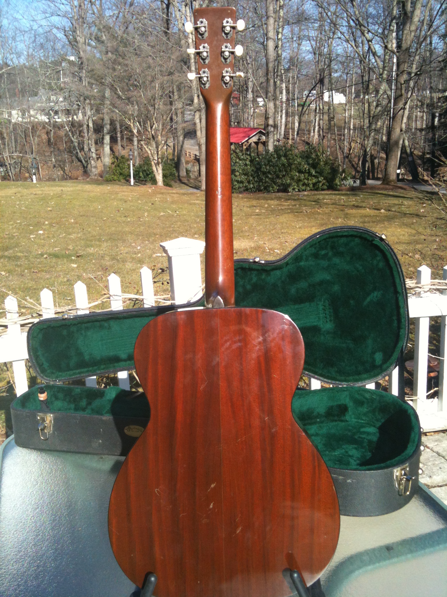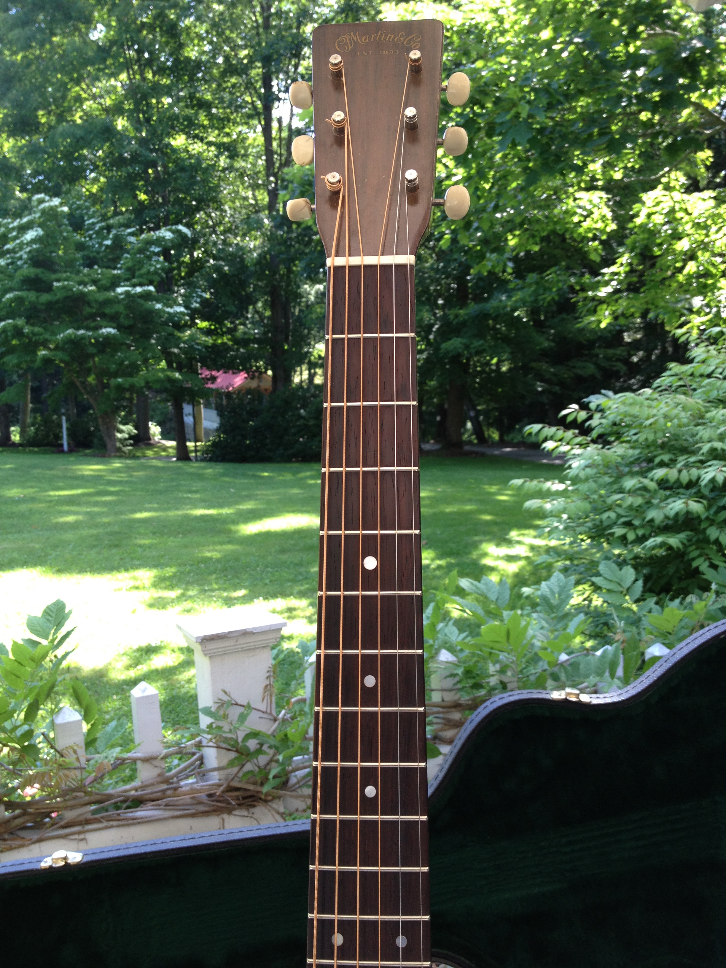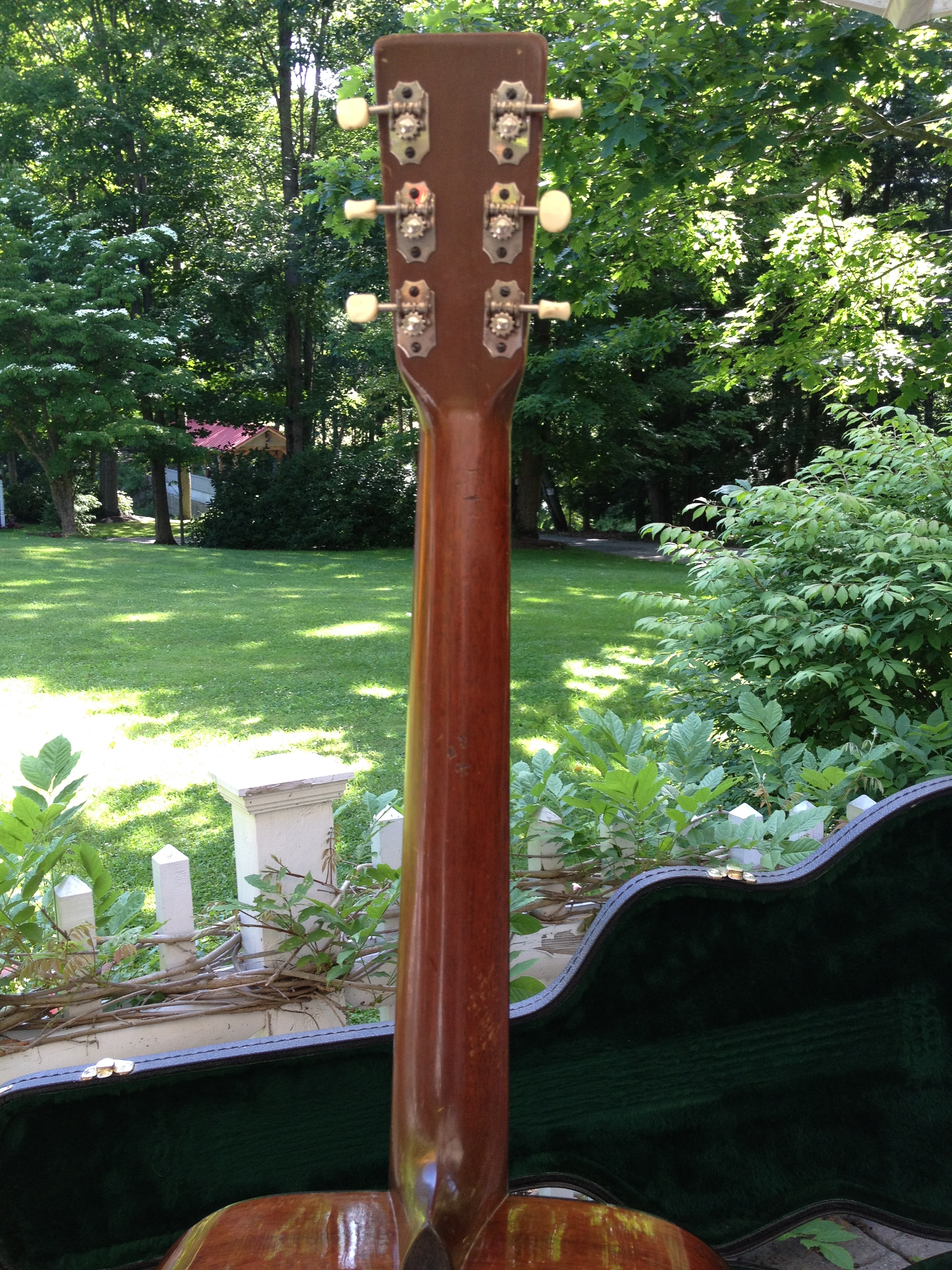 S/N 90787 places this guitar approx mid 1945. Quite a comfy neck with 1 11/16″ nut, non metallic ebony truss rod, action set at 3-2 with proper string break and perfect intonation.