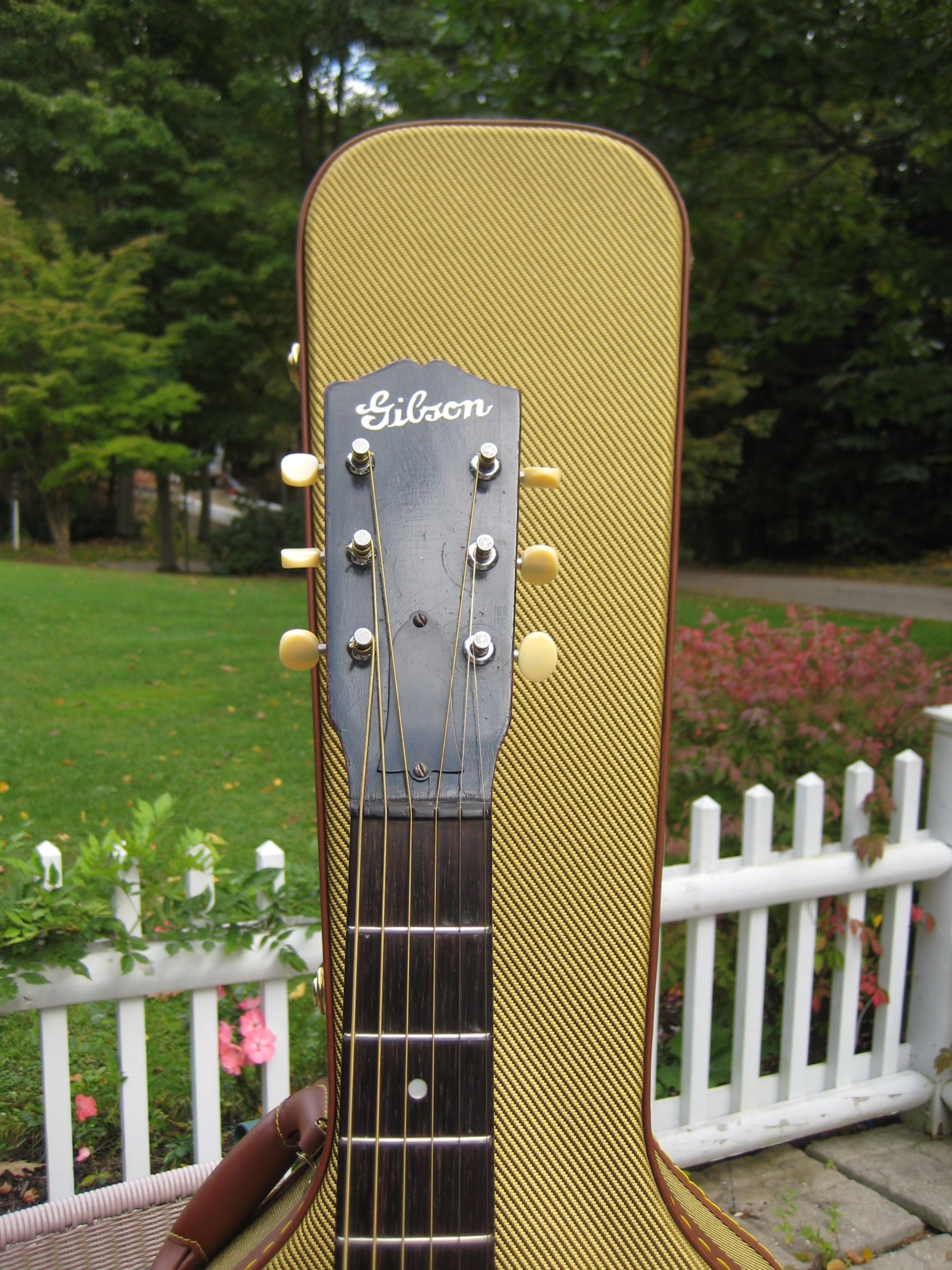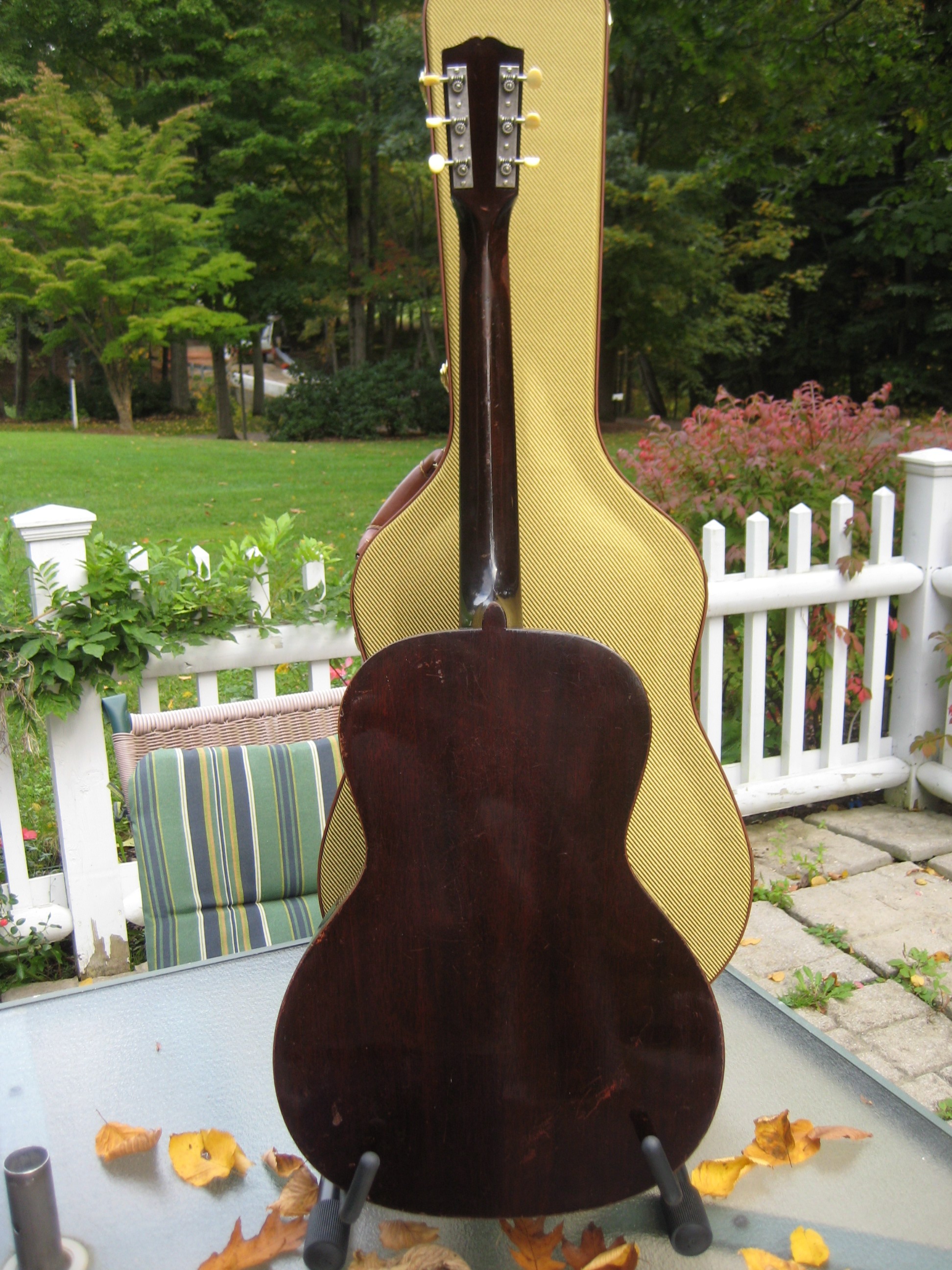 Totally crack free top, back and sides. Say again…TOTALLY CRACK FREE!! Sunning player. Pro luthier cared for and set up for finger style picking and slide work. No re finish. Pure original Vintage joy! Absolutely no funny business what-so-ever other than currently set up with a vintage appropriate set of Stew Mac tuners that keep excellent tuning. No nasty holes showing.