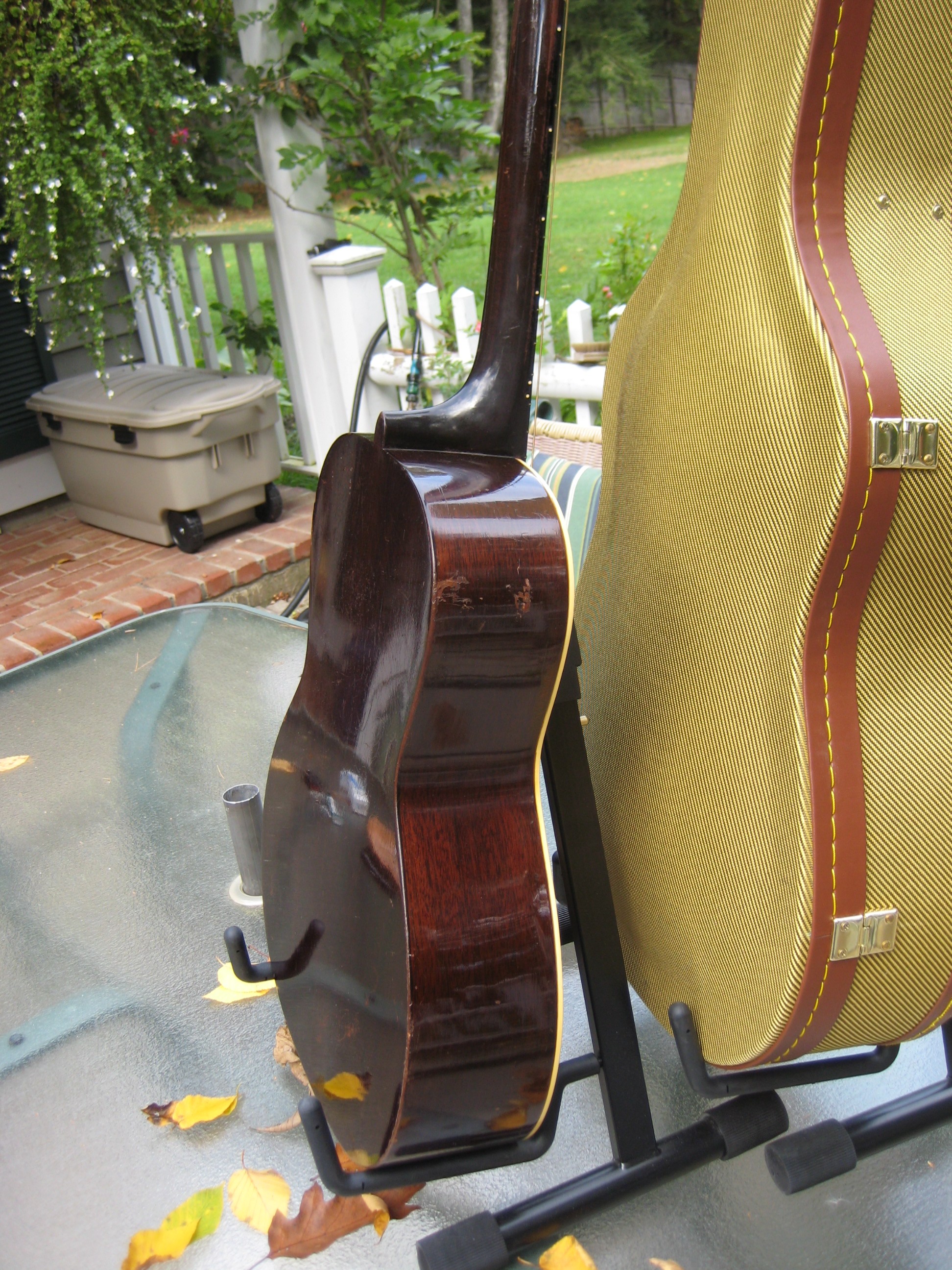 Has some wear on the sides and back and there is that mojo top scratching but the finish is all original with some of the most stunning crazing you have ever seen on the top and that ancient pick rash on the bottom of sound hole. Back of neck is honestly worn.