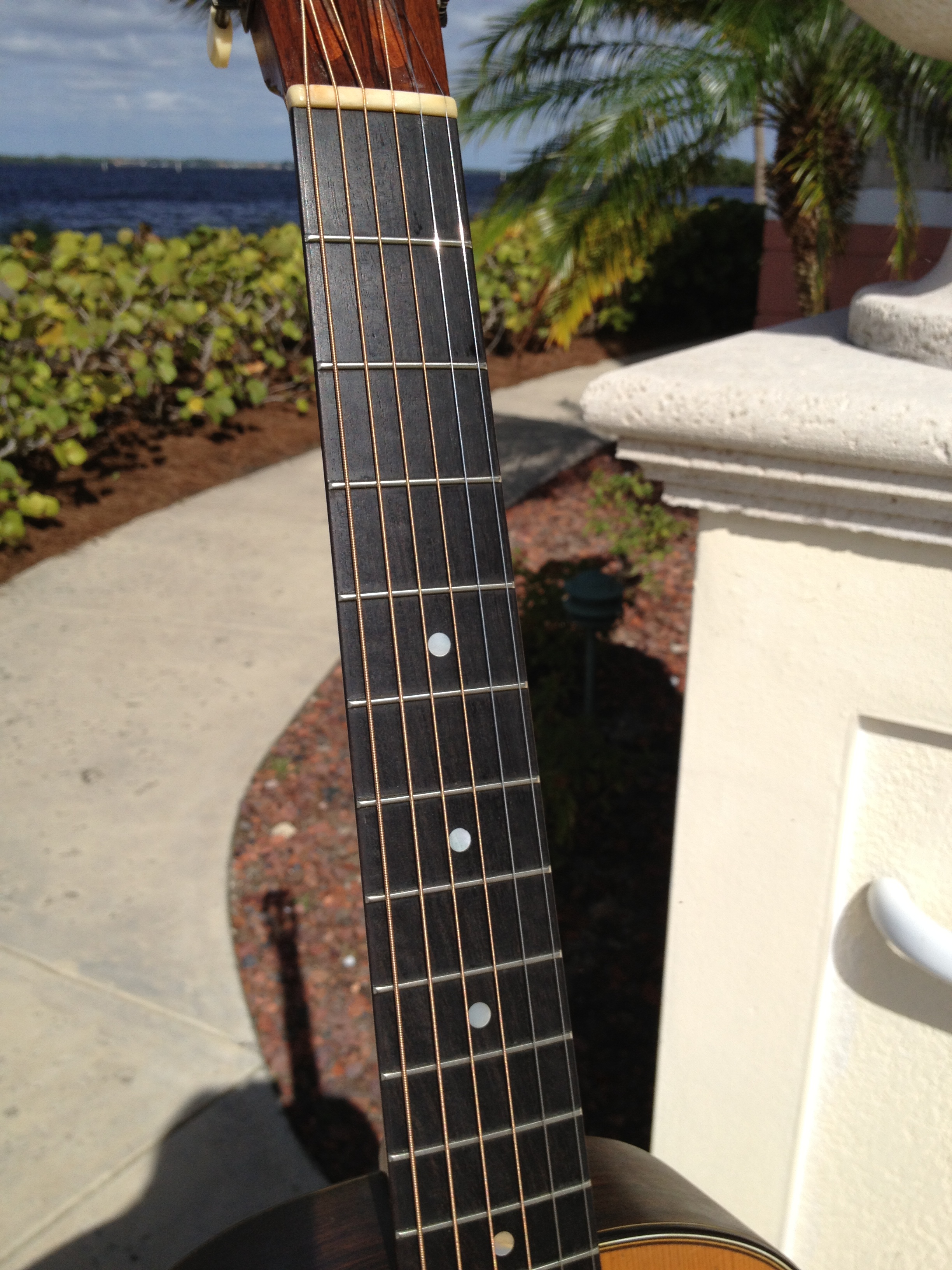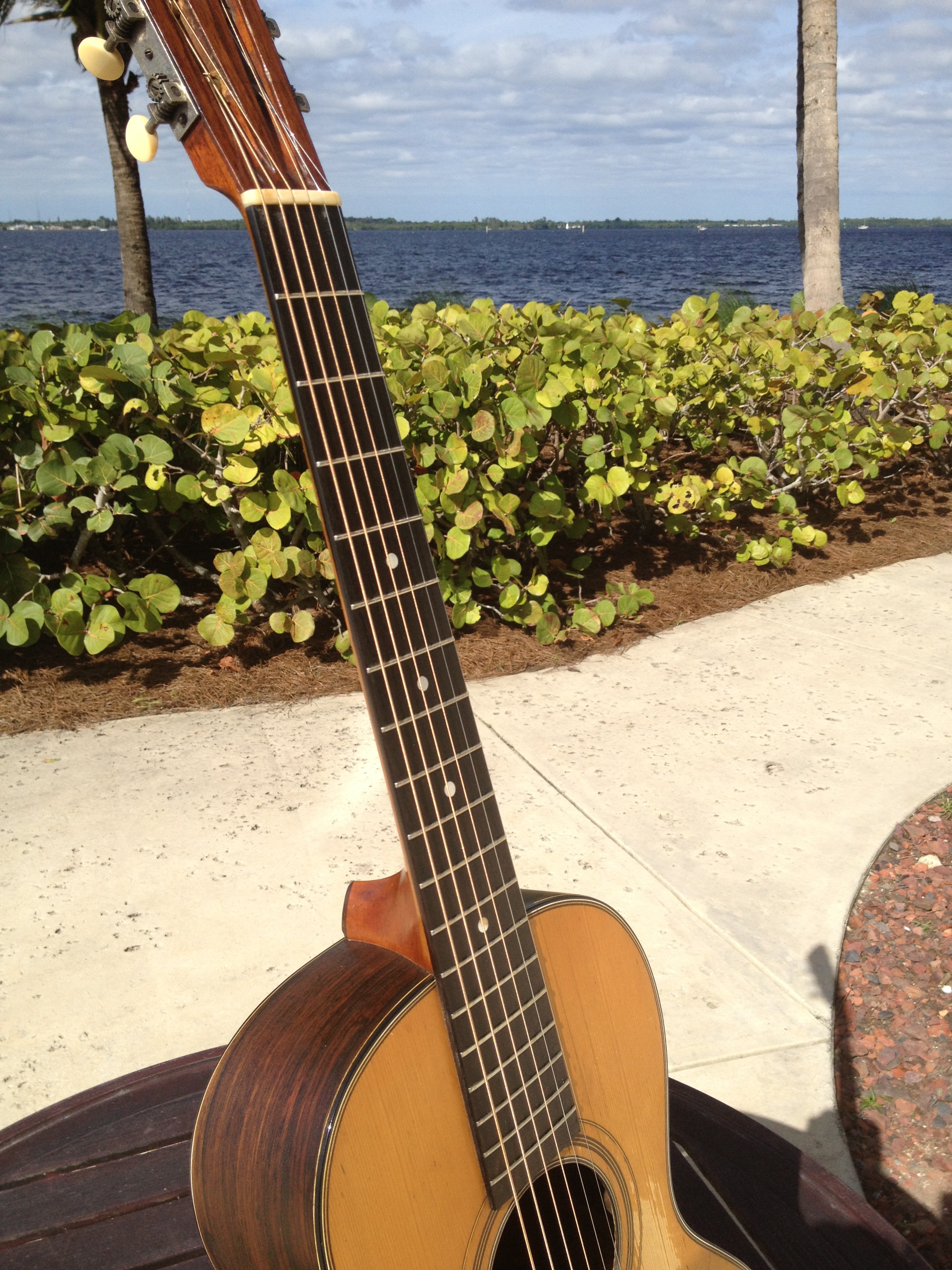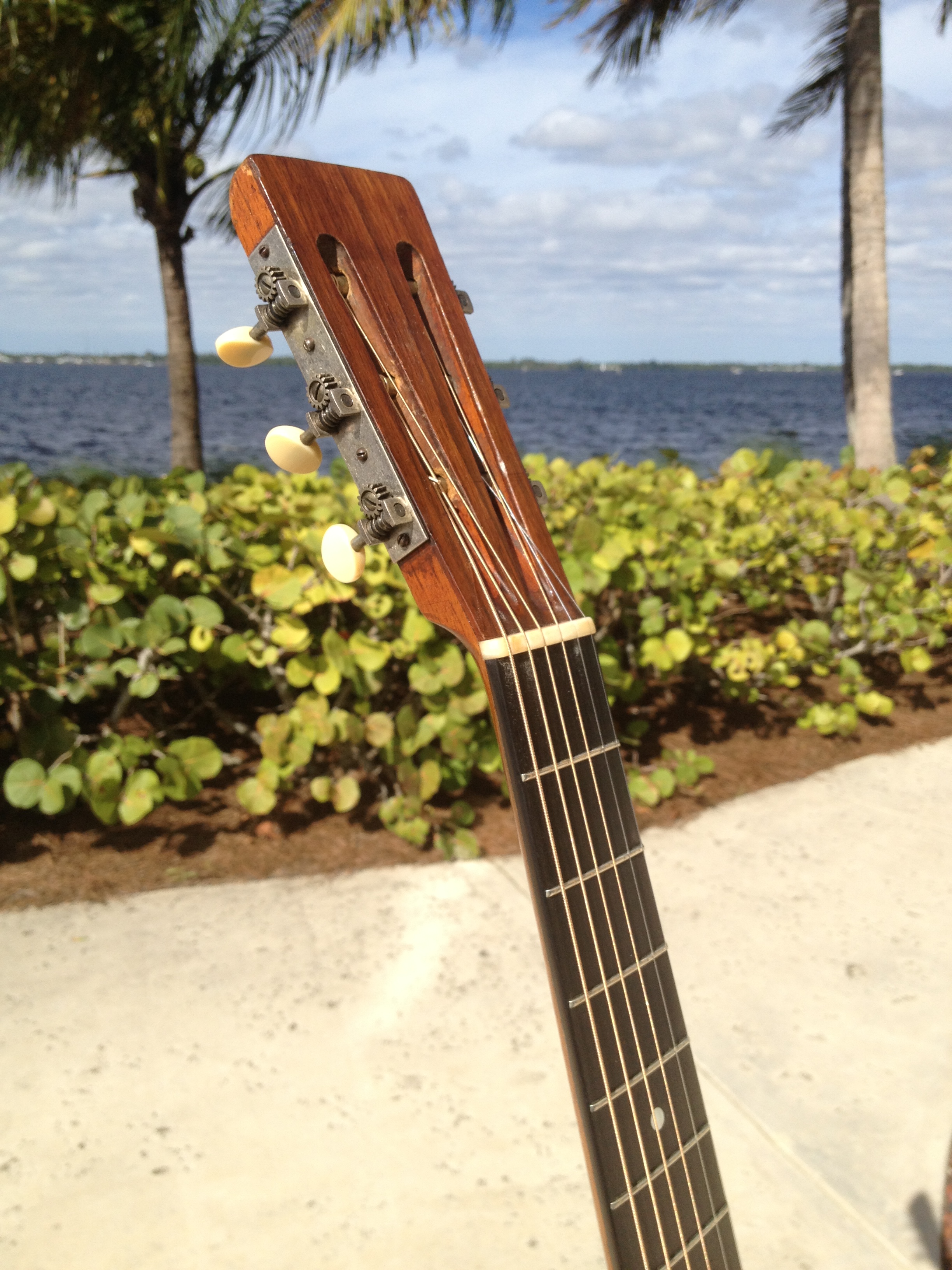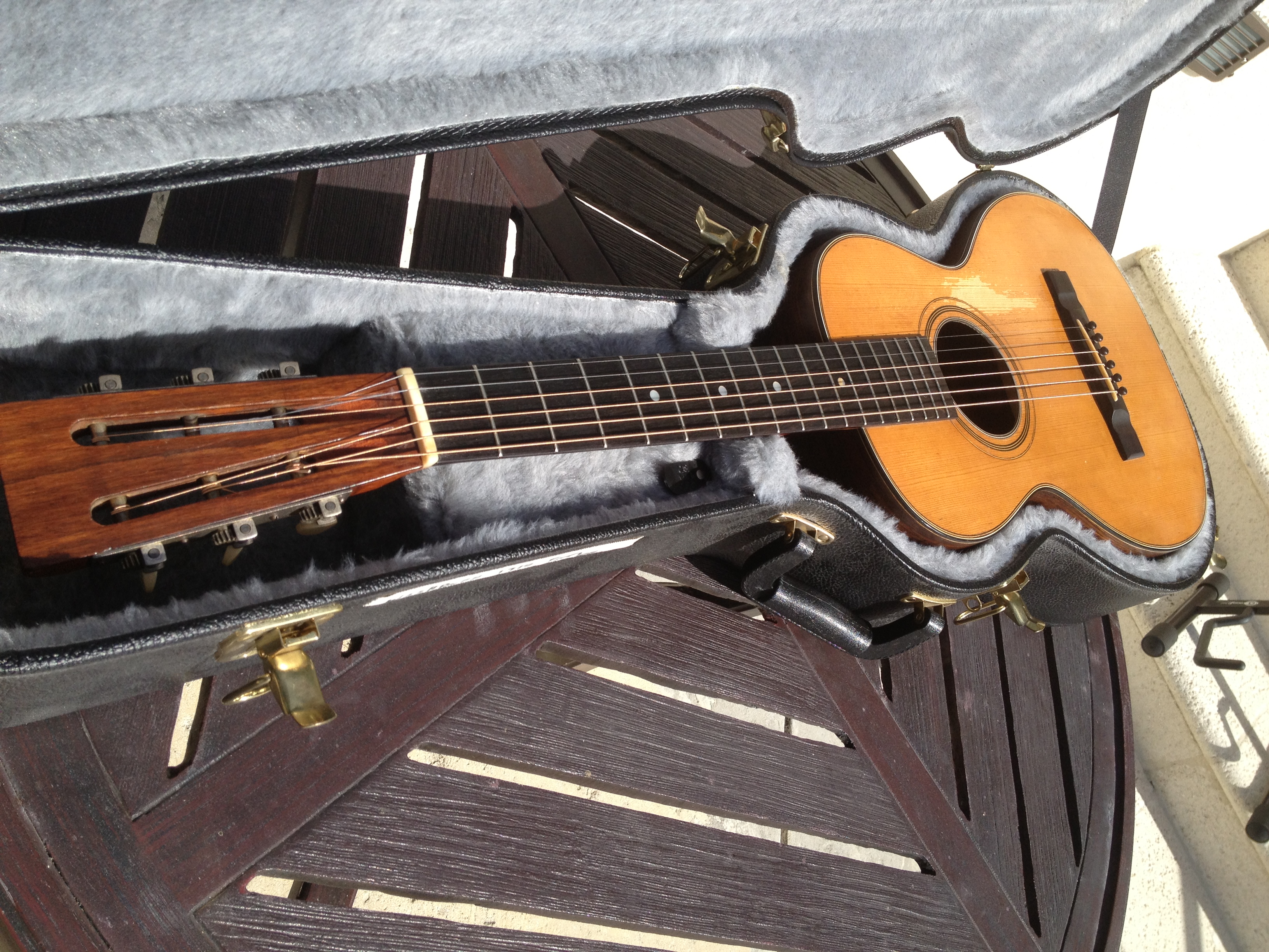 I’ve always loved Parlors and this example has the nice Brazilian rosewood back and sides, Adirondack red spruce top and is a true jewel. Vintage appropriate replica tuners and we think a fine quality ebony replica bridge matching the ebony fret board and topped off with a rosewood overlay on the peg head.