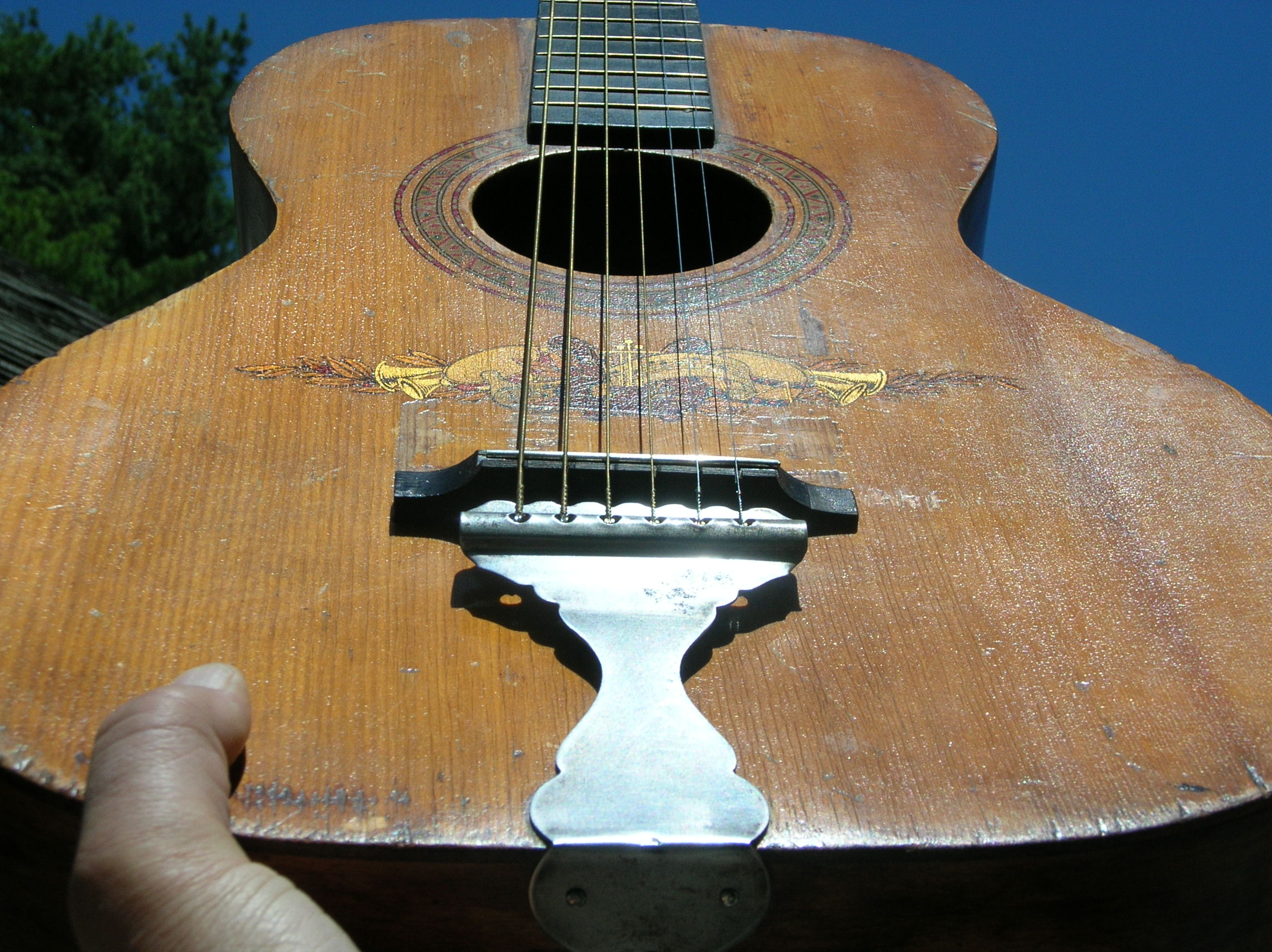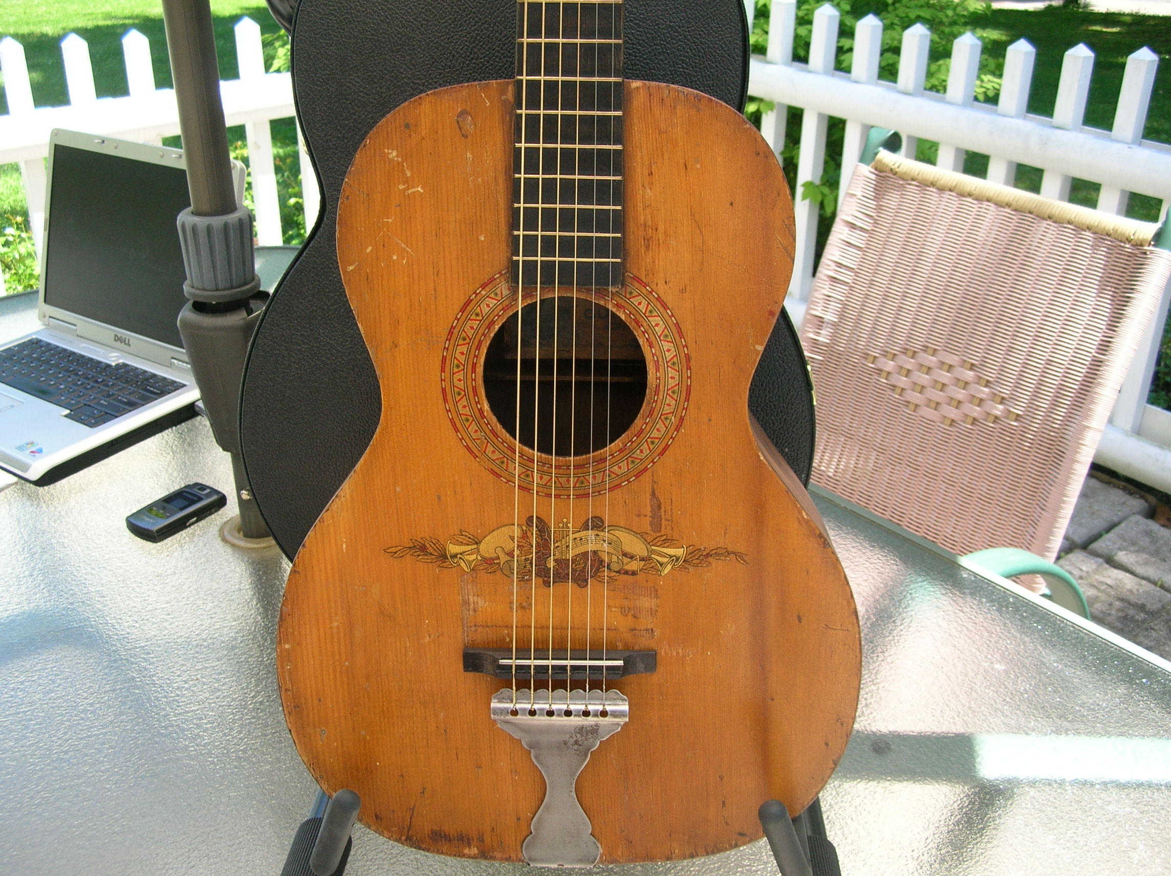 ca 1920s Stella Concert. Sweet old survivor-relic. Natural top with stained birch back and sides. All original. Pro neck set and set up. Accurately measured electronically for optimum intonation. Floating bridge position seen is the best. Lots of old cracks with professionally executed cleats inside but all stable with no cosmetic issues.