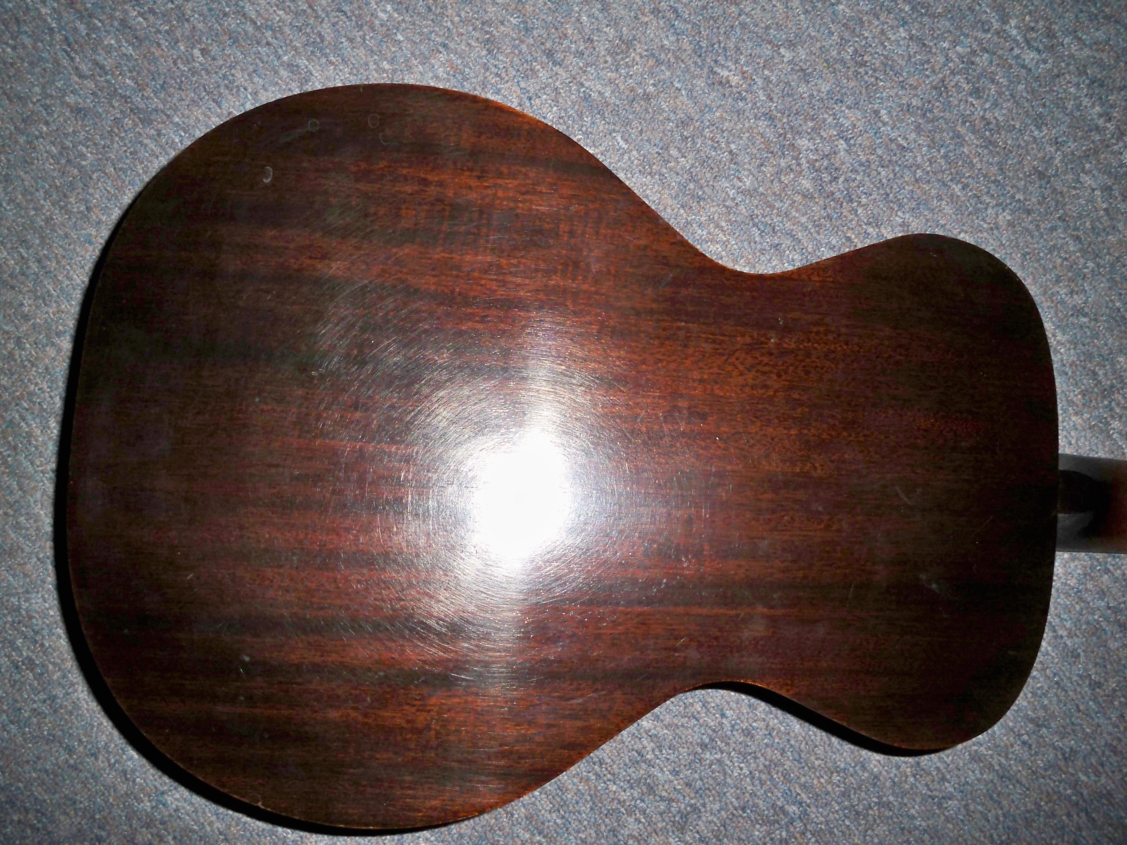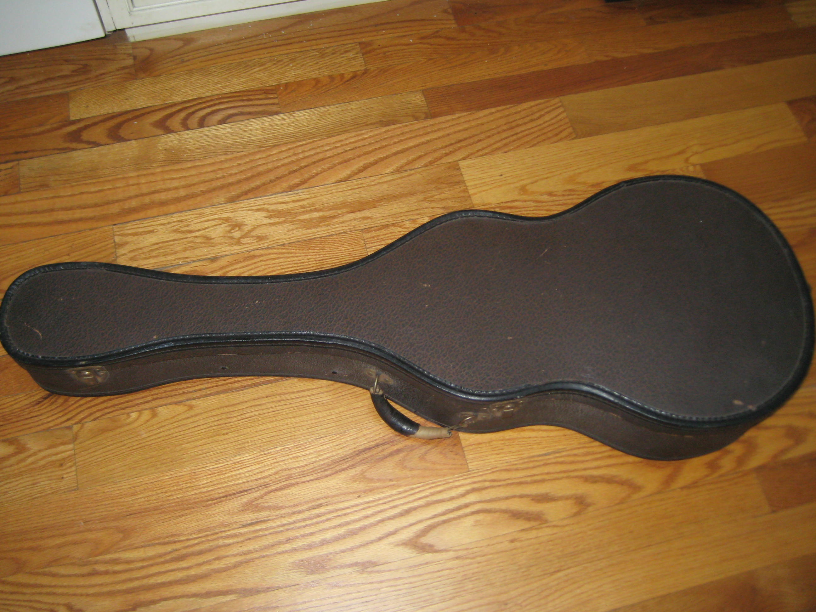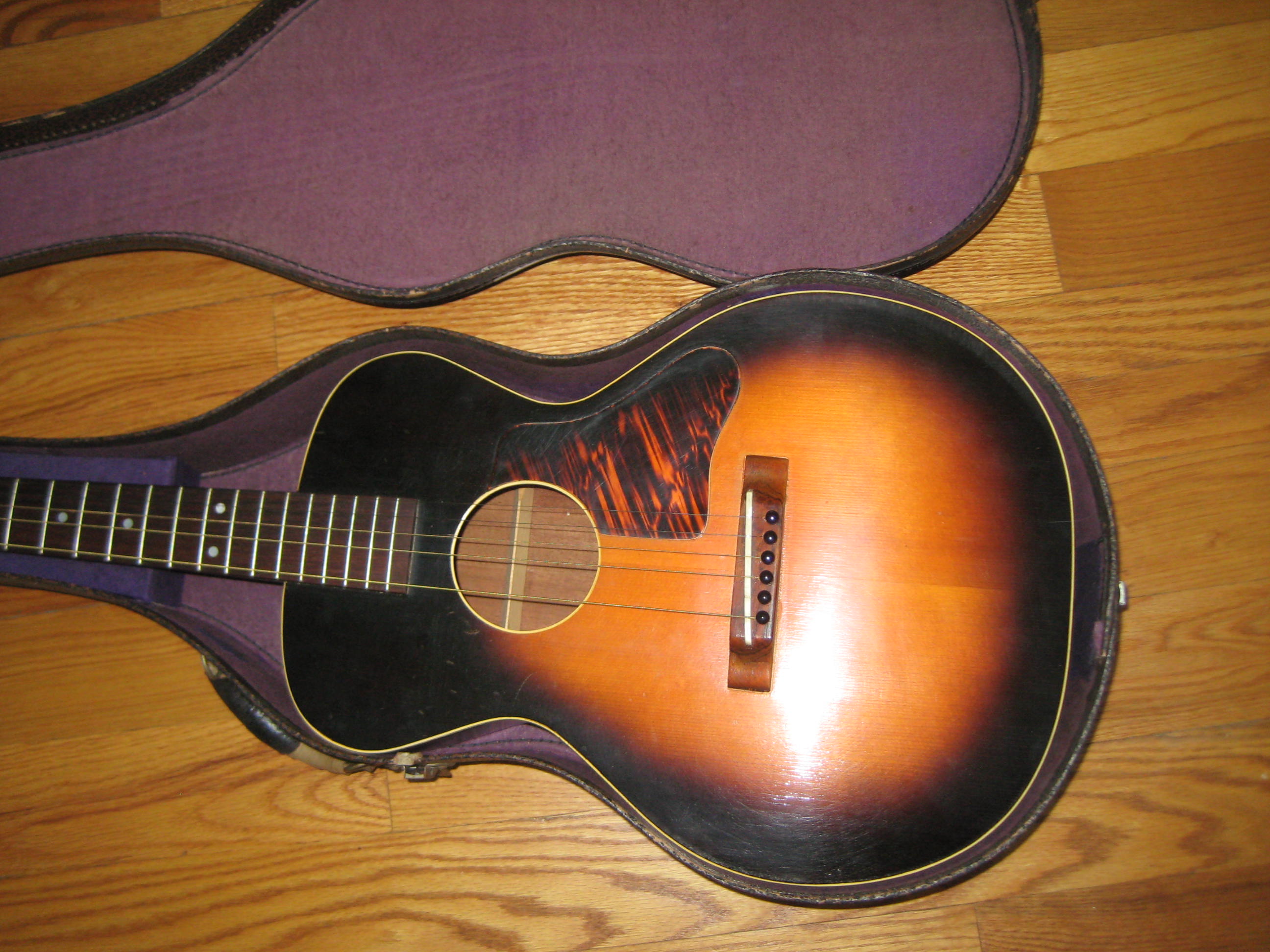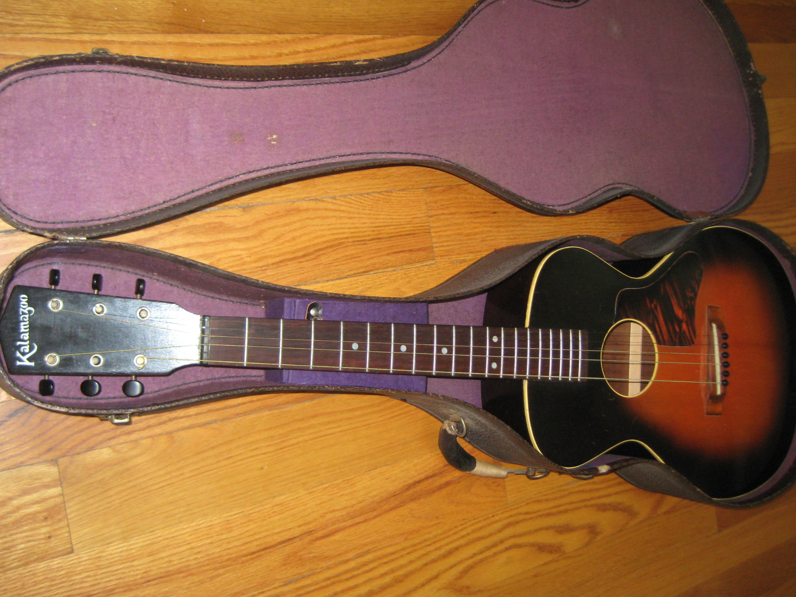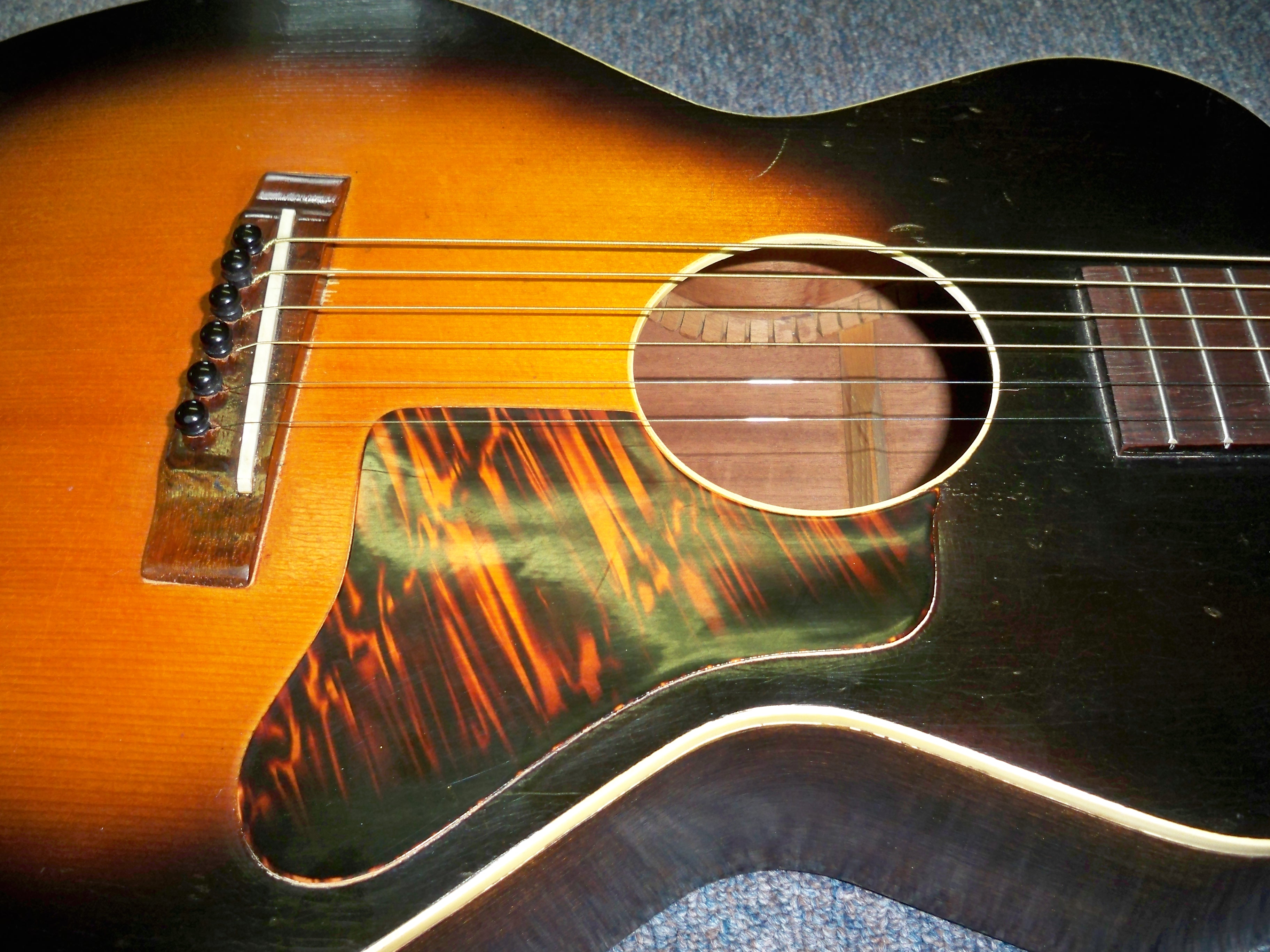 Sunburst top, mahogany back, sides and neck with Adirondack spruce top. This little 3/4 guitar was a later addition to the Kalamazoo line, available from 1937-41. Built on the pattern of the 1920′s Gibson TG-1 Tenor guitar body, the Sport Model is a dainty girlie girl tight-waisted design.