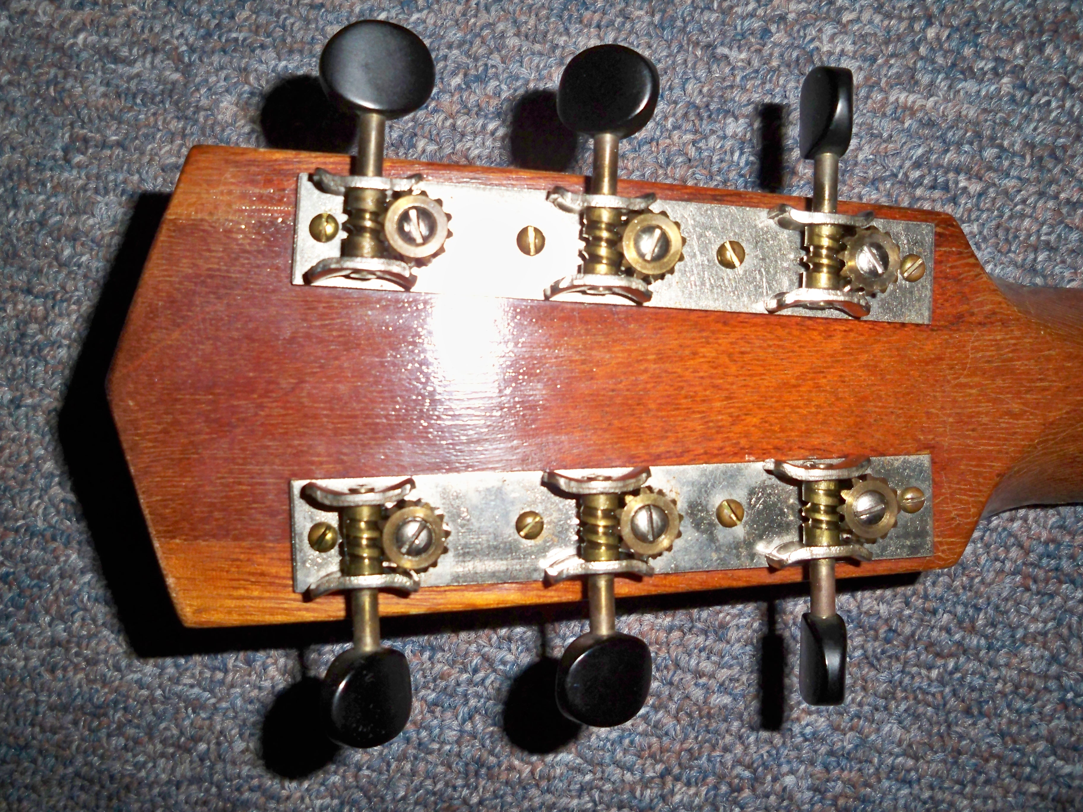 The neck is very slim with a fairly sharp “V” profile. Overall length is 36 3/8″, 12 5/8″ wide at lower bout, and 3 7/8″ depth. Scale length is 23″. Width of new ebony nut is 1 9/16″ with action set at 3-2 and the proper string break across a new bone saddle. All original with some honest play wear yet crack free and in great condition…a true survivor!