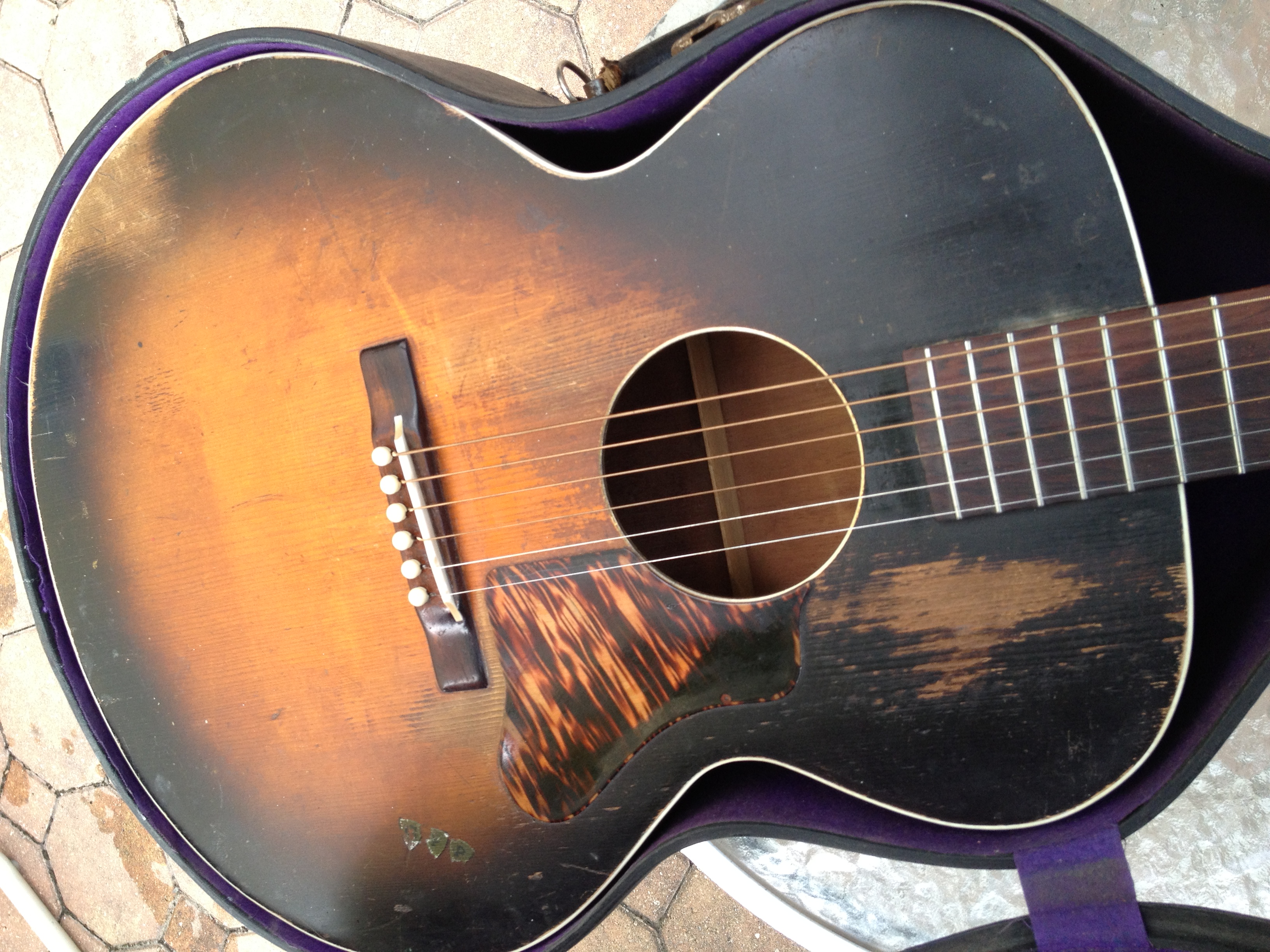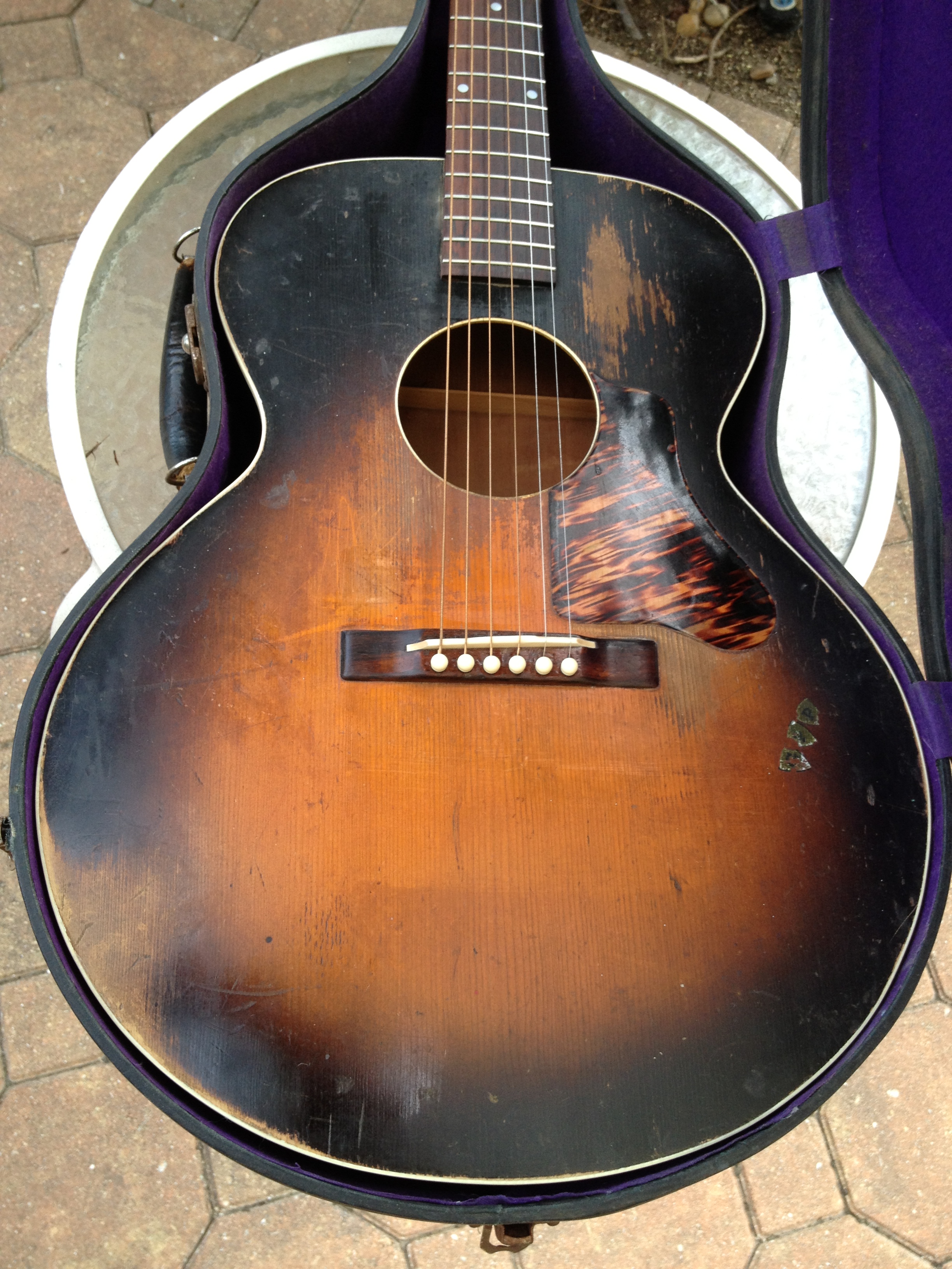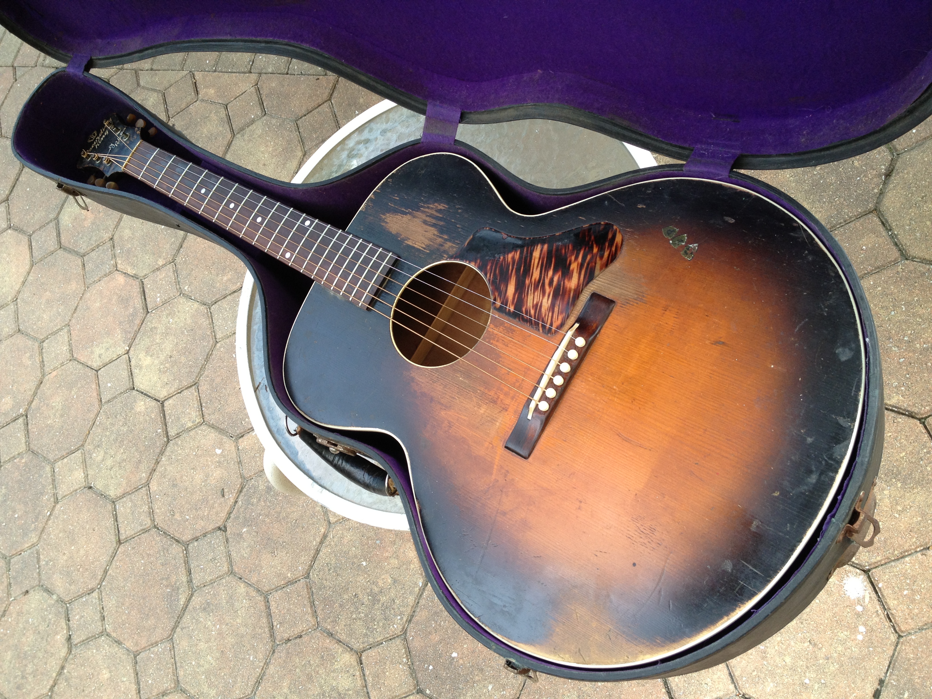 Sans the bracing modification,photos attached, this guitar is totally original including the sunburst finish, now oxidized to a cool mojo. Rare to find these guitars and this one is oh so honest. The largest of the Gibson Depression era budget line flat tops. Check out the scan from my 1939 Montgomery Ward catalog…. notice the little stickers offered to “personalize” with your initials, as seen on the lower bout of this example.