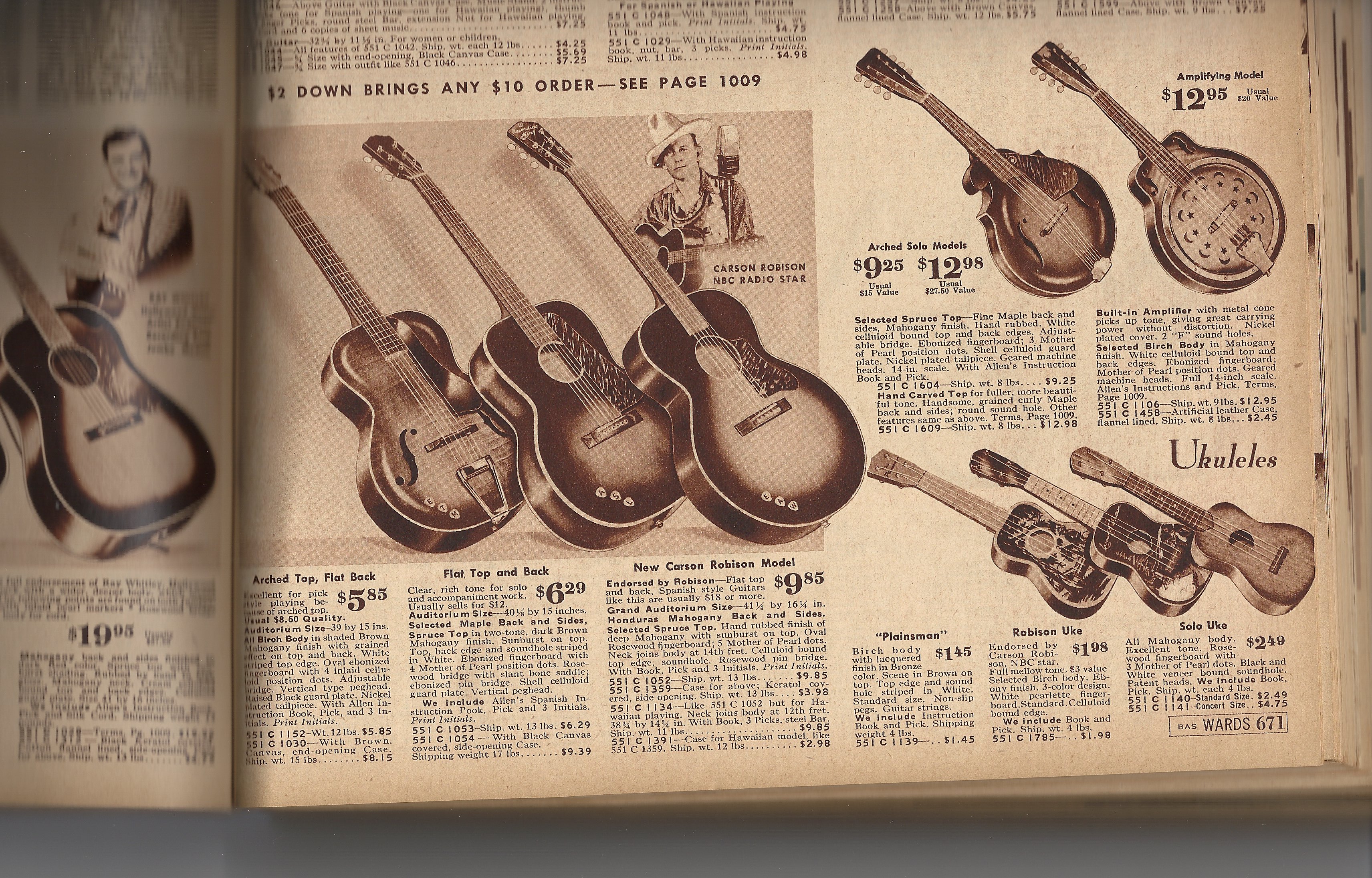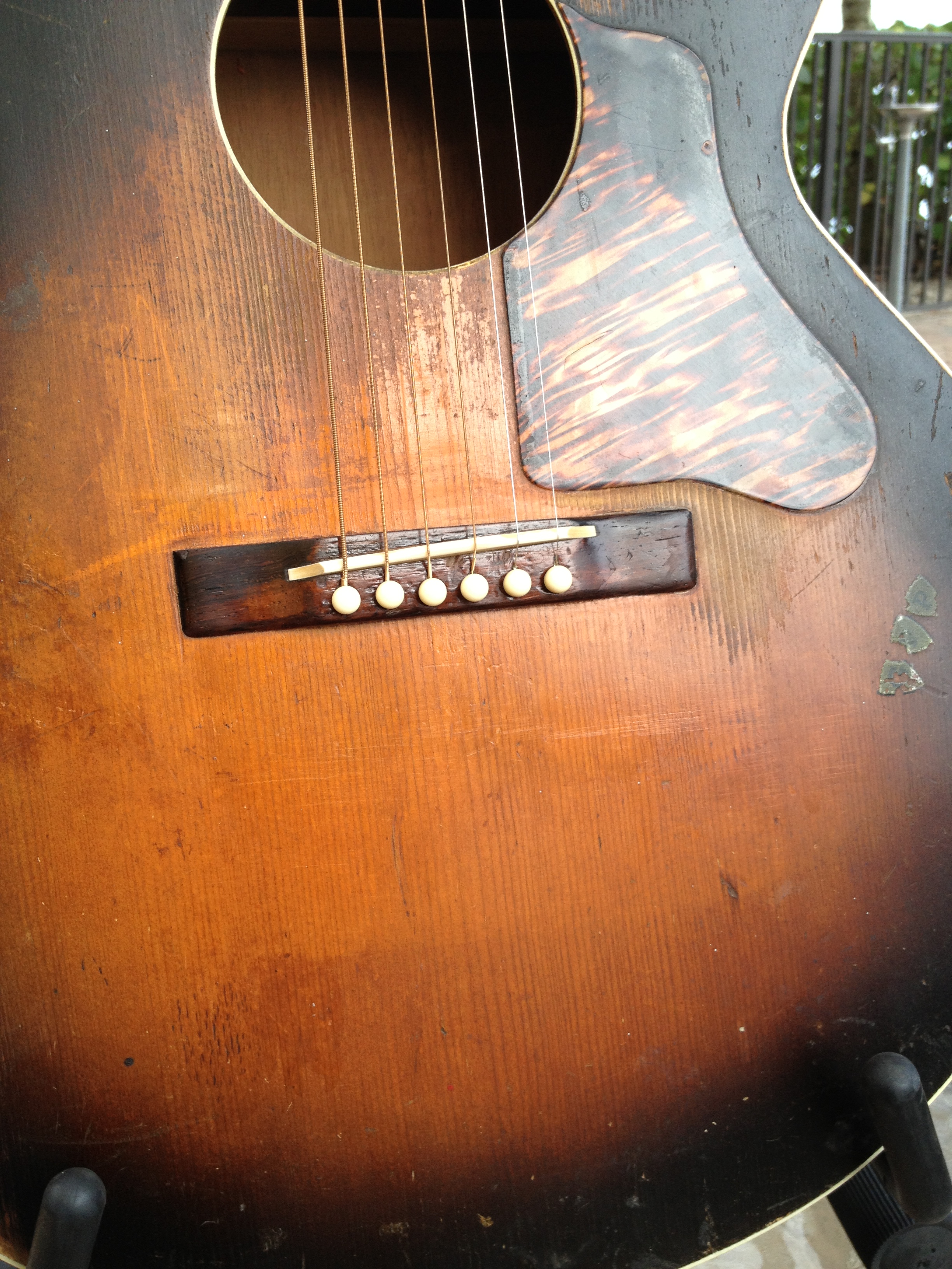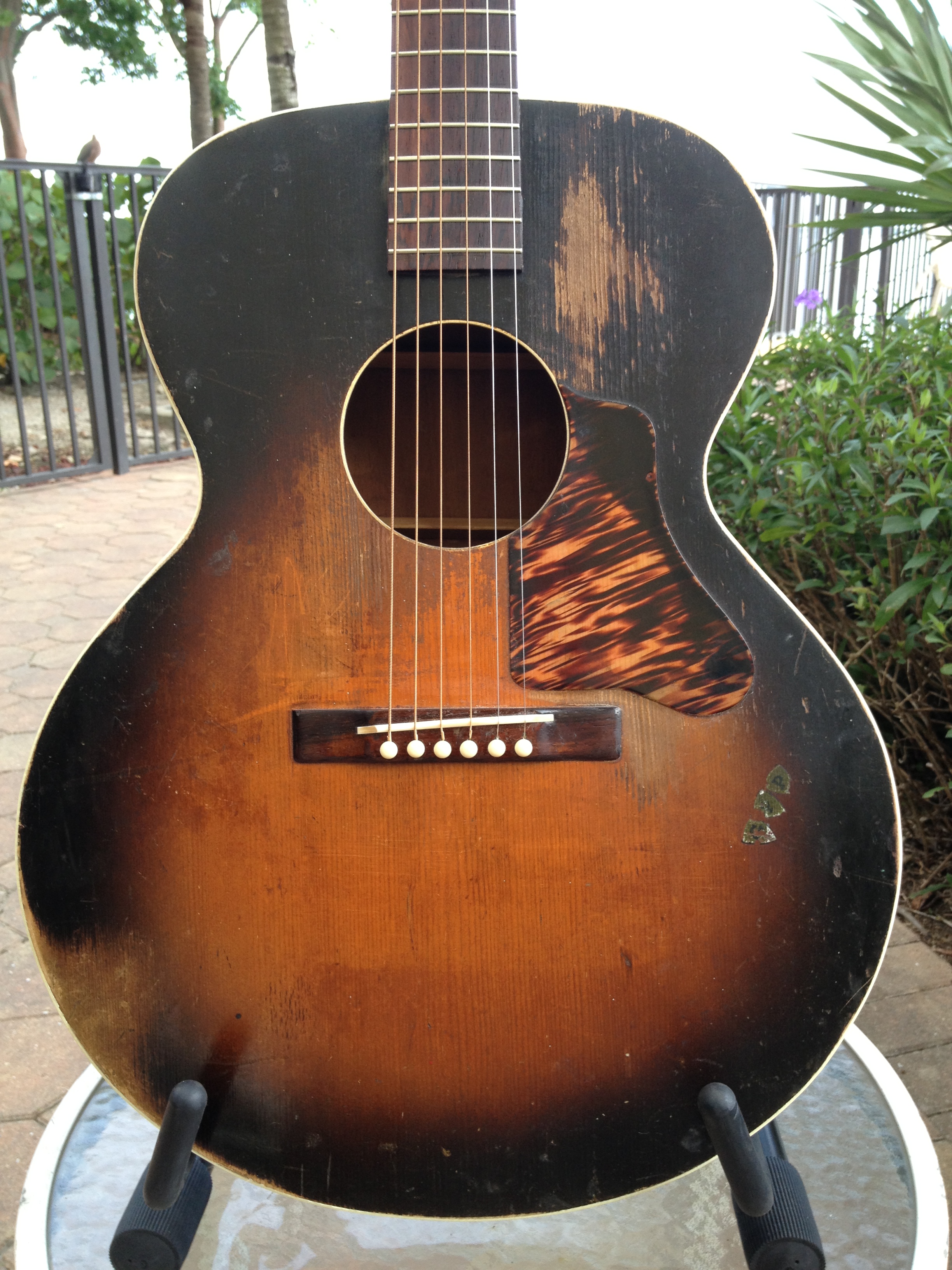 Sans the bracing modification,photos attached, this guitar is totally original including the sunburst finish, now oxidized to a cool mojo. Rare to find these guitars and this one is oh so honest. The largest of the Gibson Depression era budget line flat tops. Check out the scan from my 1939 Montgomery Ward catalog…. notice the little stickers offered to “personalize” with your initials, as seen on the lower bout of this example.