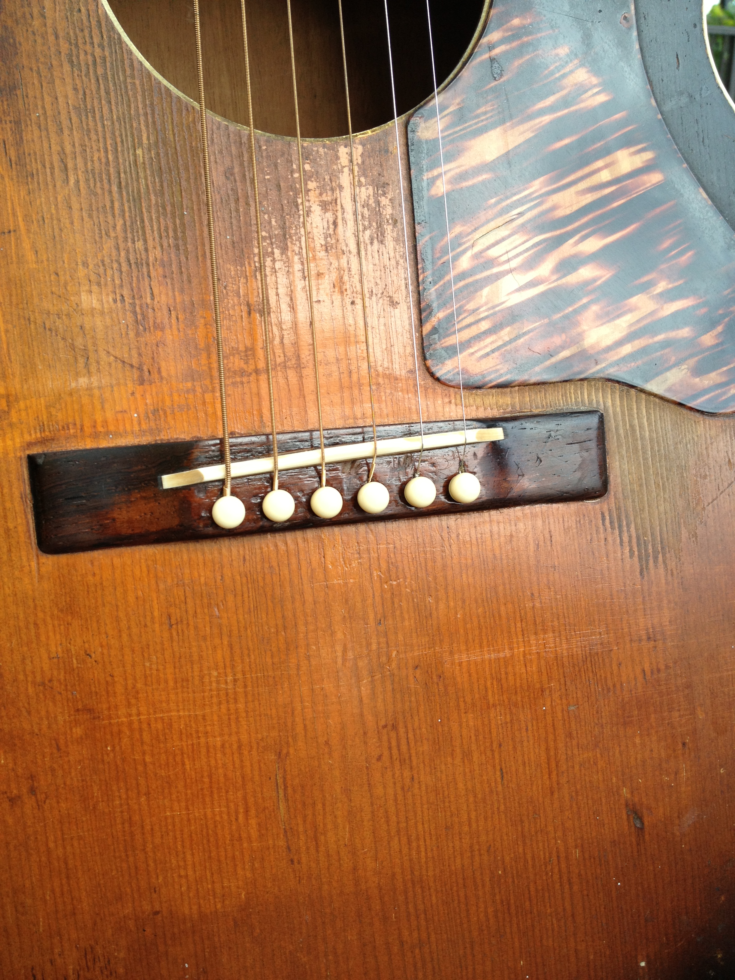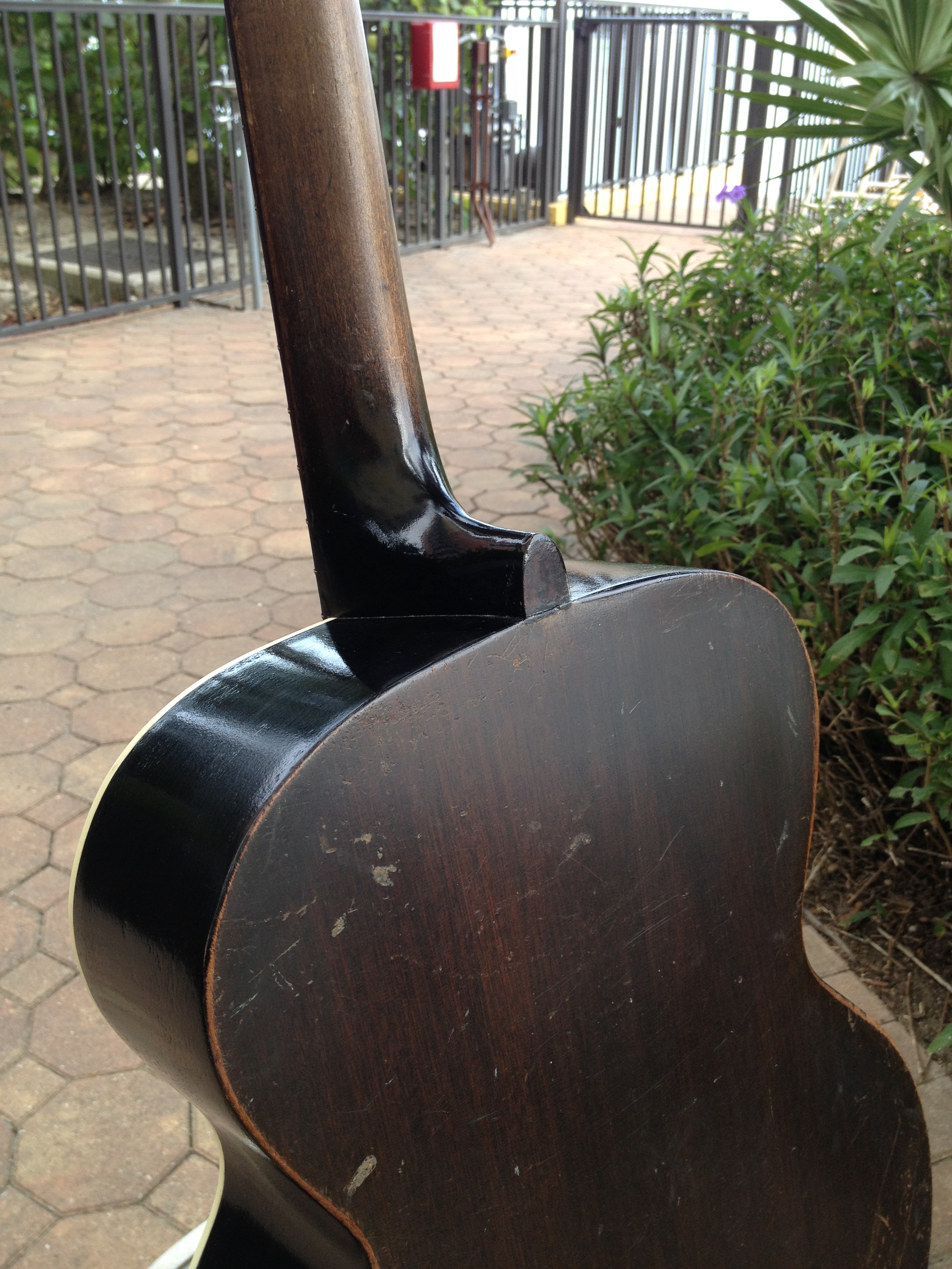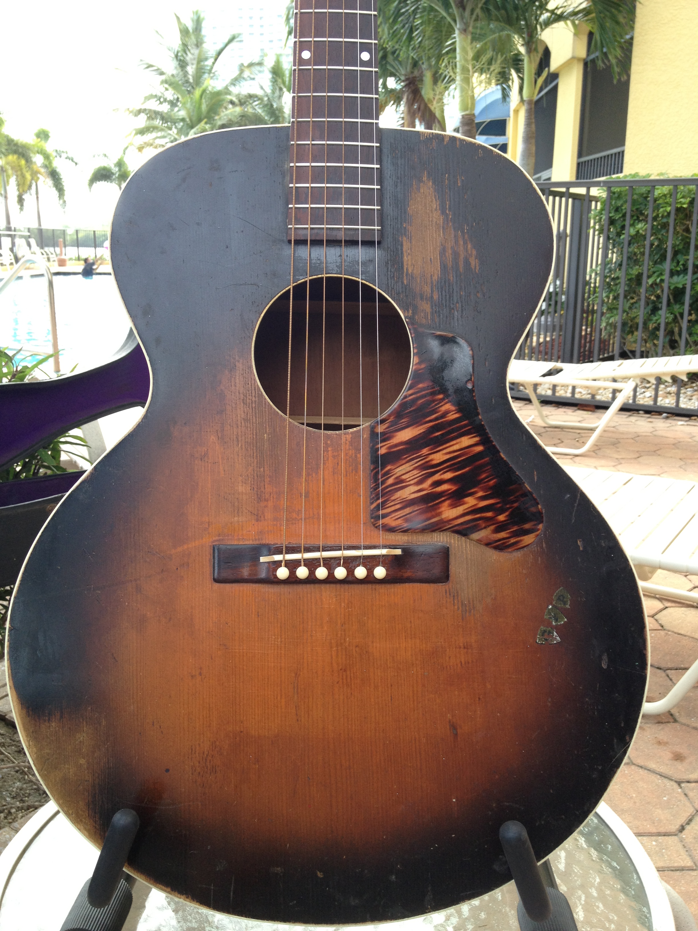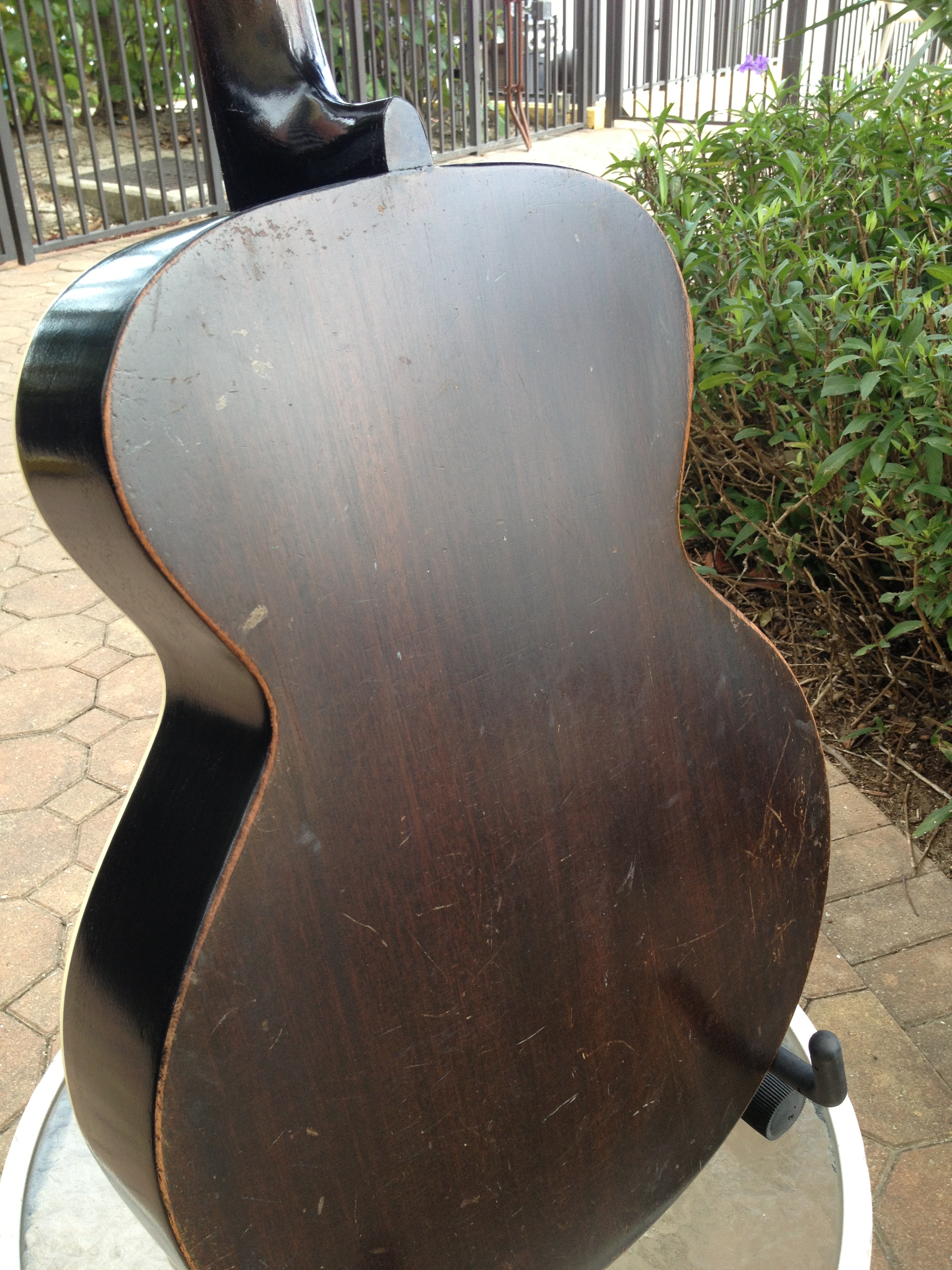 We think this guitar has a very cool look to the crack free top and the work we’ve done includes Gibson style X bracing, fretboard divots tastefully filled, completely re fretted, sides refinished and top re bound with old school fibroid ivory, neck re set with new saddle and professional set up with action at 3-2 with proper string break across the saddle and perfect intonation. Includes the extremely rare and very cool original amber tuner buttons on the Kluson tuners and a fresh set of Willi Henkes authentic reproduction bridge pins from Germany. FON stamped on the back of headstock reads EW-760