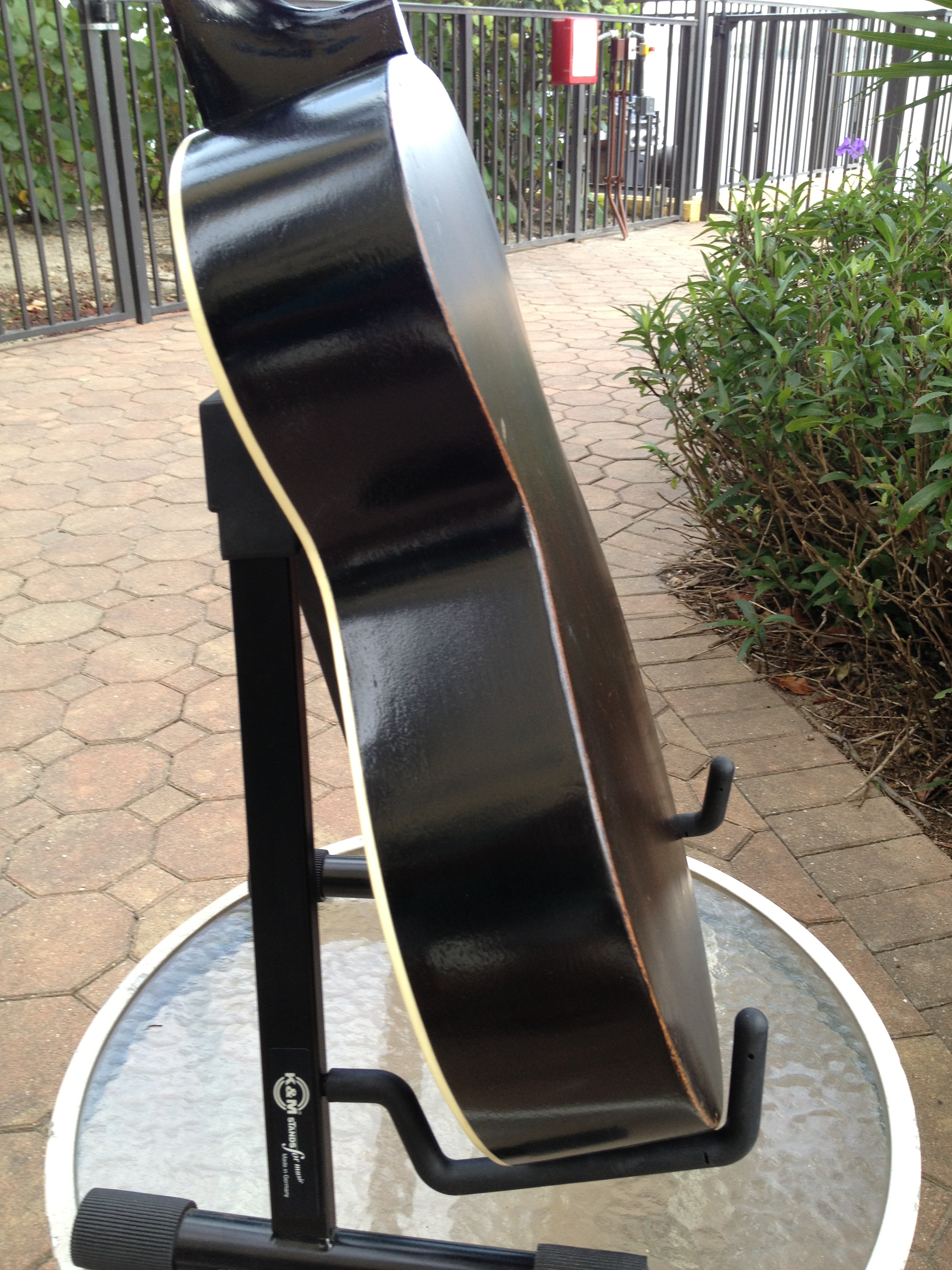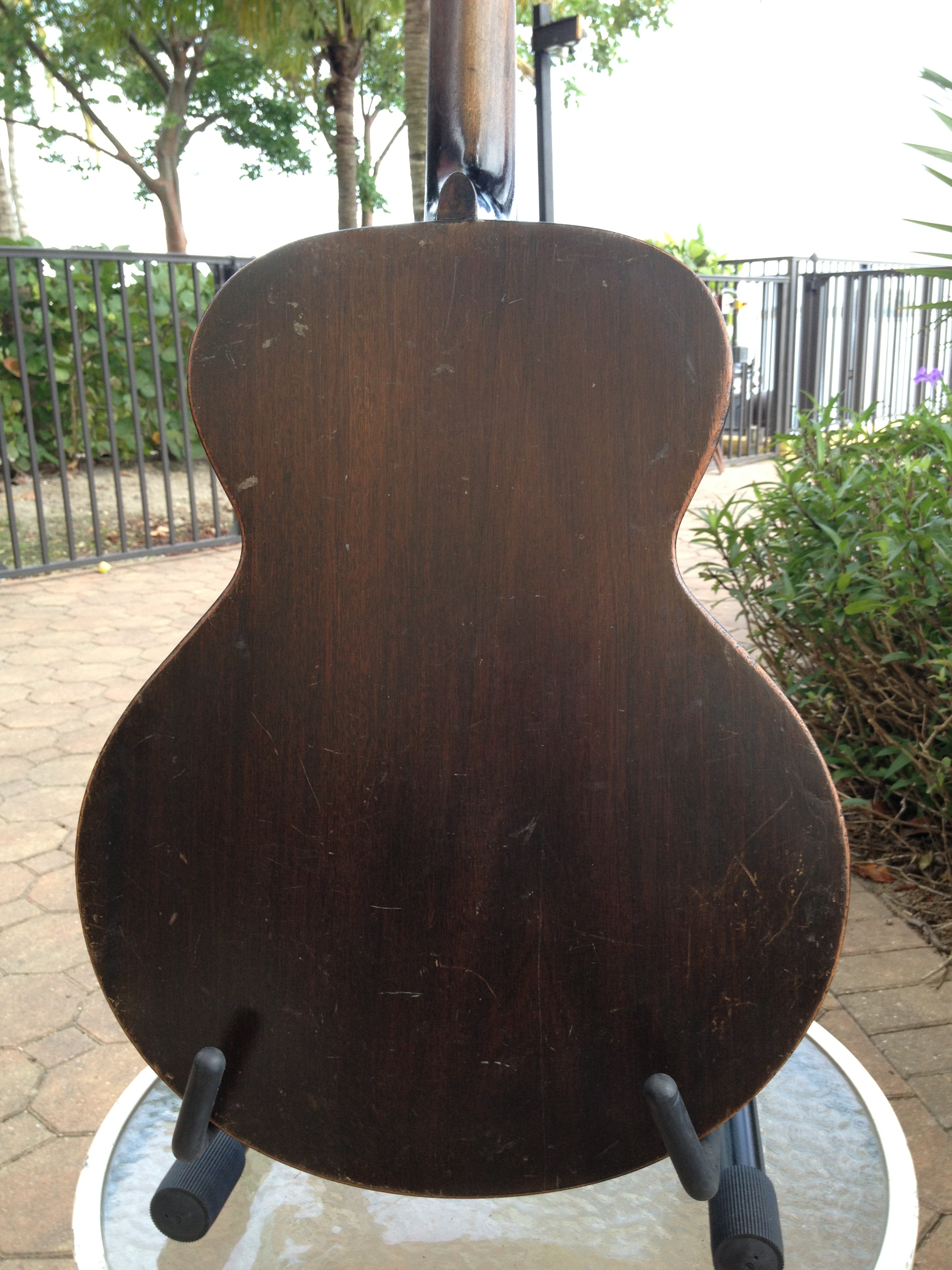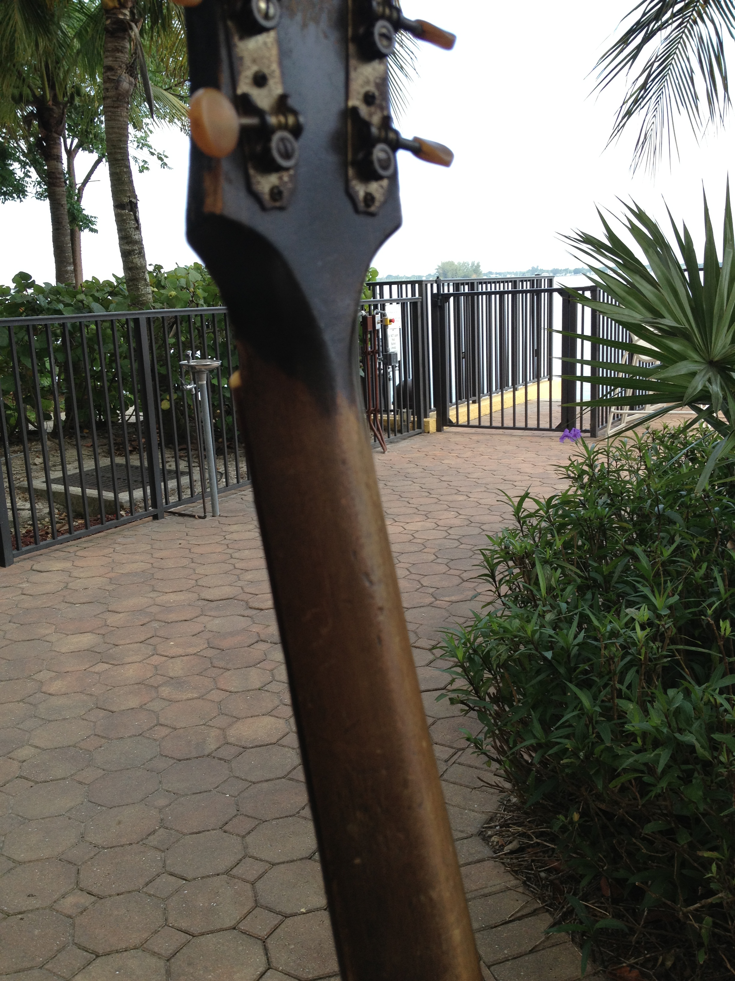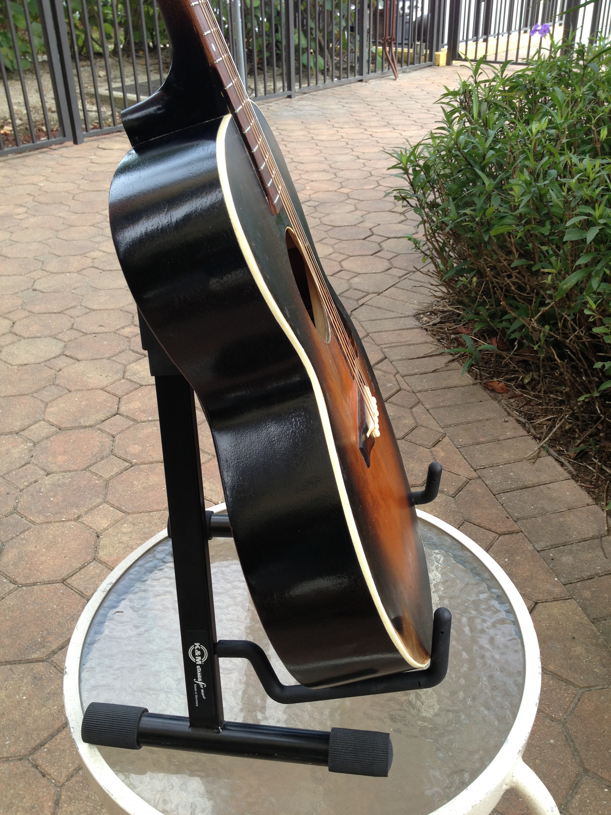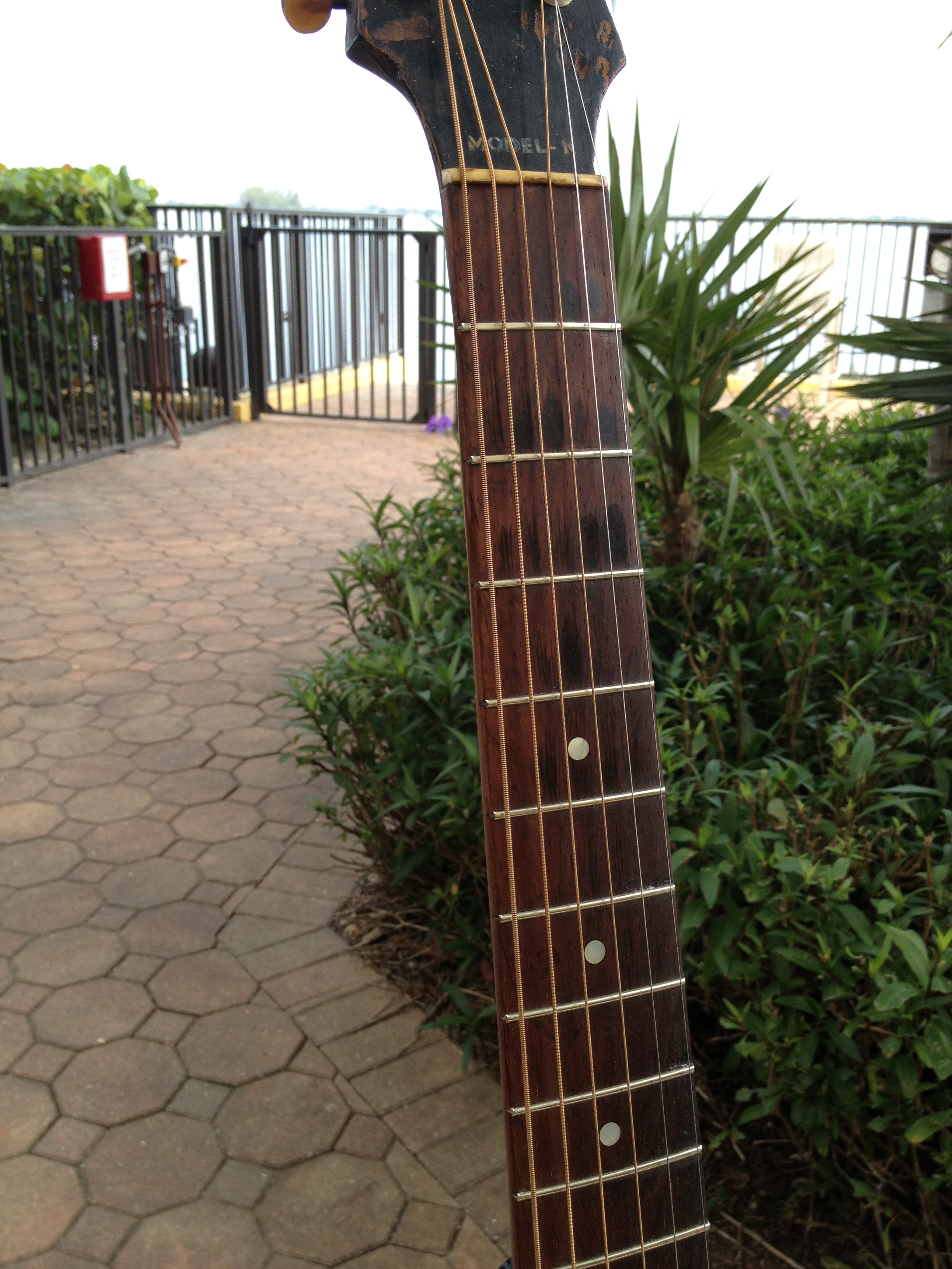 We think this guitar has a very cool look to the crack free top and the work we’ve done includes Gibson style X bracing, fretboard divots tastefully filled, completely re fretted, sides refinished and top re bound with old school fibroid ivory, neck re set with new saddle and professional set up with action at 3-2 with proper string break across the saddle and perfect intonation. Includes the extremely rare and very cool original amber tuner buttons on the Kluson tuners and a fresh set of Willi Henkes authentic reproduction bridge pins from Germany. FON stamped on the back of headstock reads EW-760