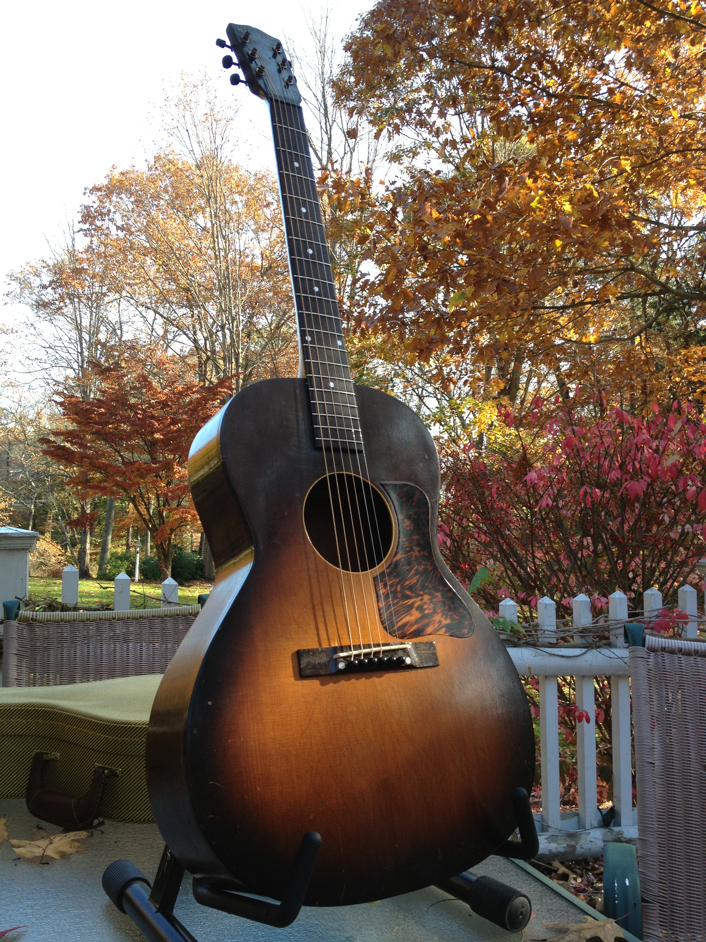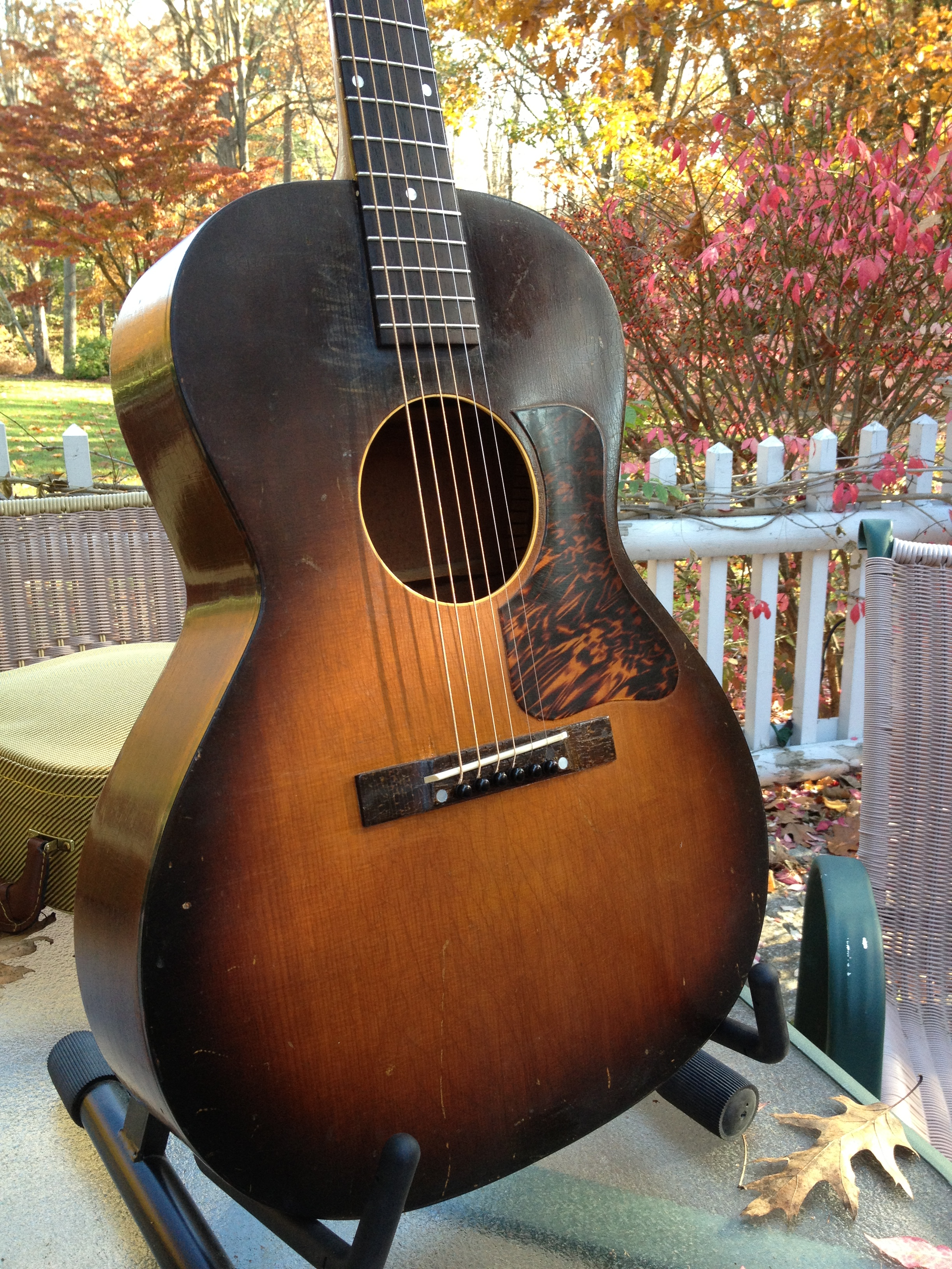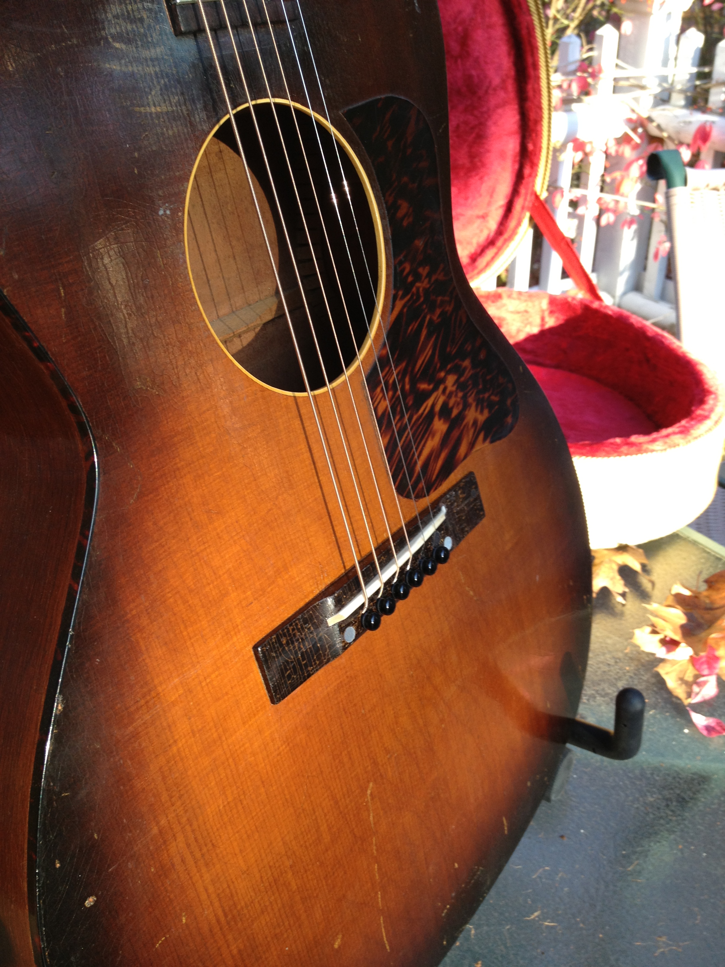 Gibson – Kalamazoo KG12, red spruce top with mahogany back and sides. Rare in the series of Kalamazoo flat tops… these KG-12s came at the end of the production, but in our opinion, they are some of the best sounding examples of the entire line. Gibson certainly had these ladder braced beauties all figured out by the early 1940s and the sound of this one proves it! Similar to its sisters, the KGN-12 and the Orioles, these examples have the red spruce tops, but have the light stained mahogany back, sides and neck rather than maple. The sweet finish is similar to Martins ice tea shading with the nitrocellulose tortoise shell binding.