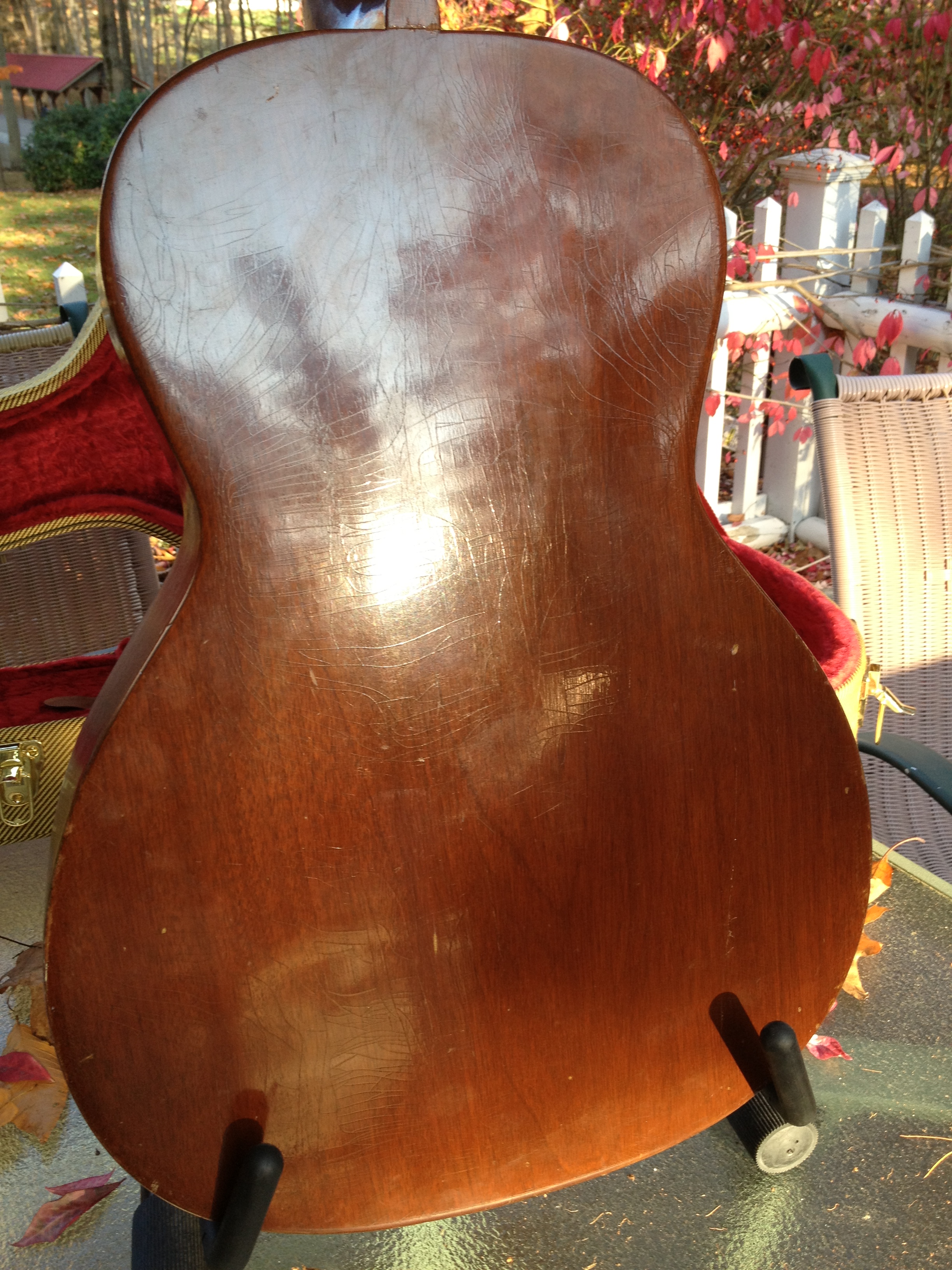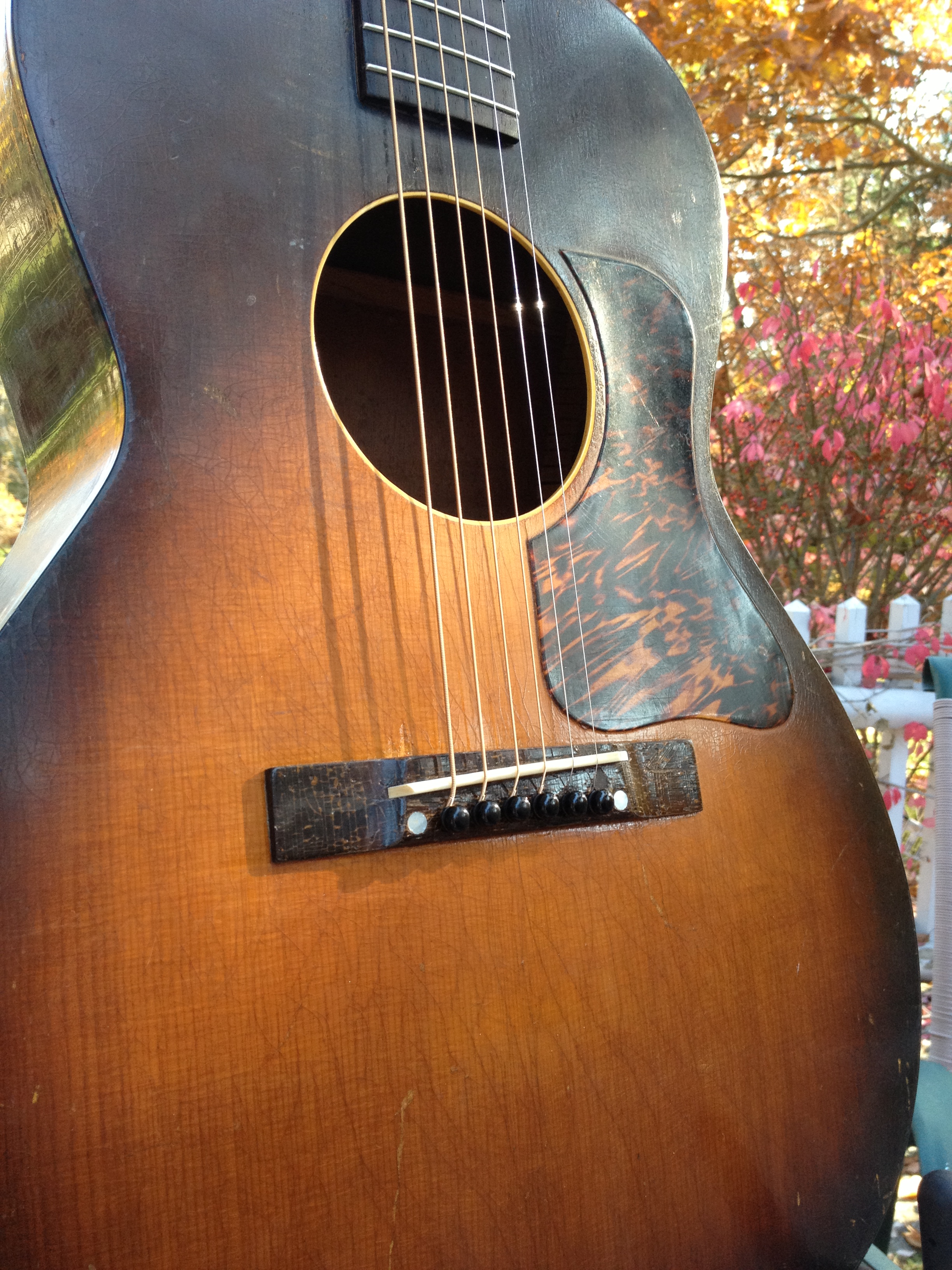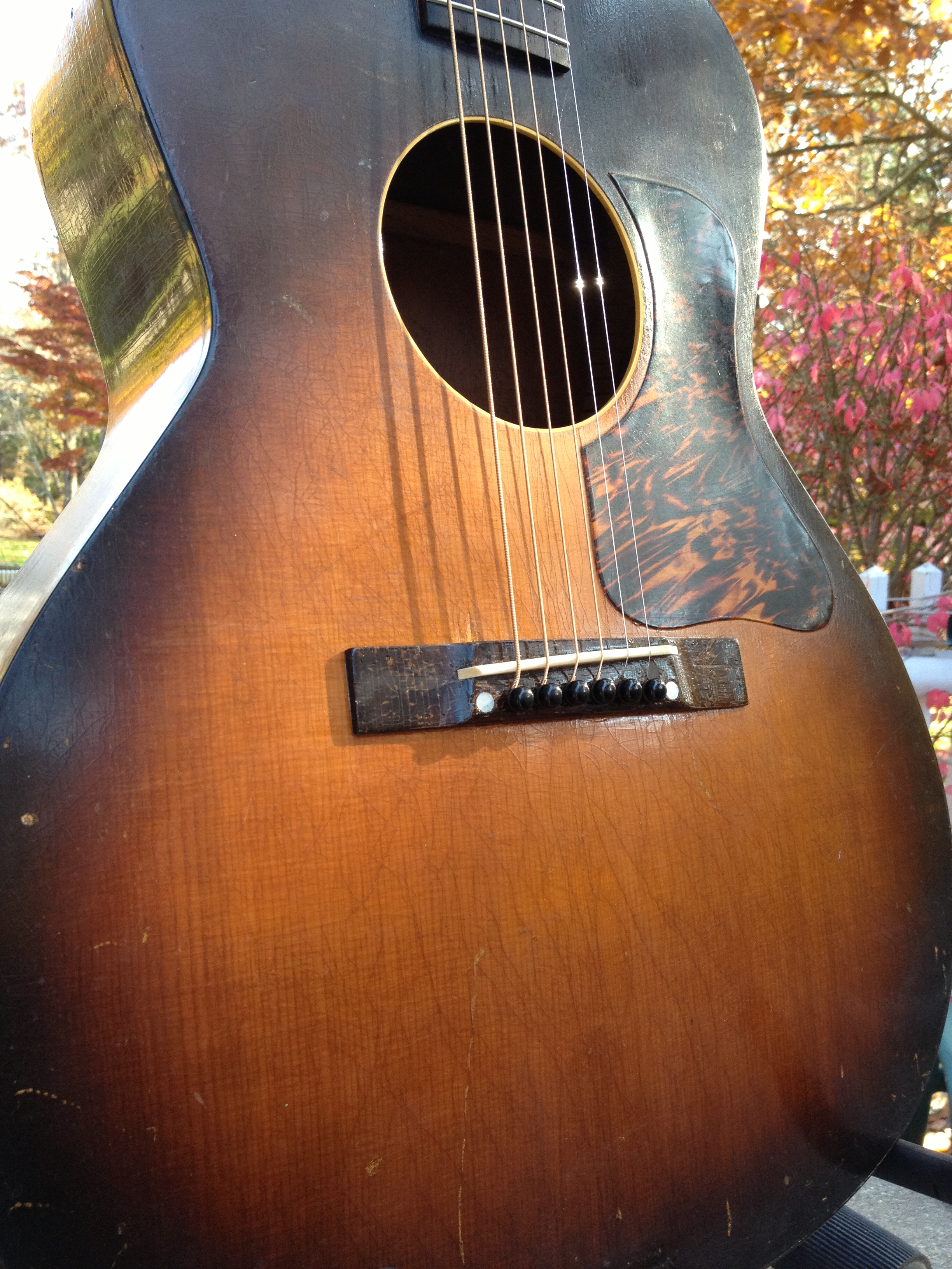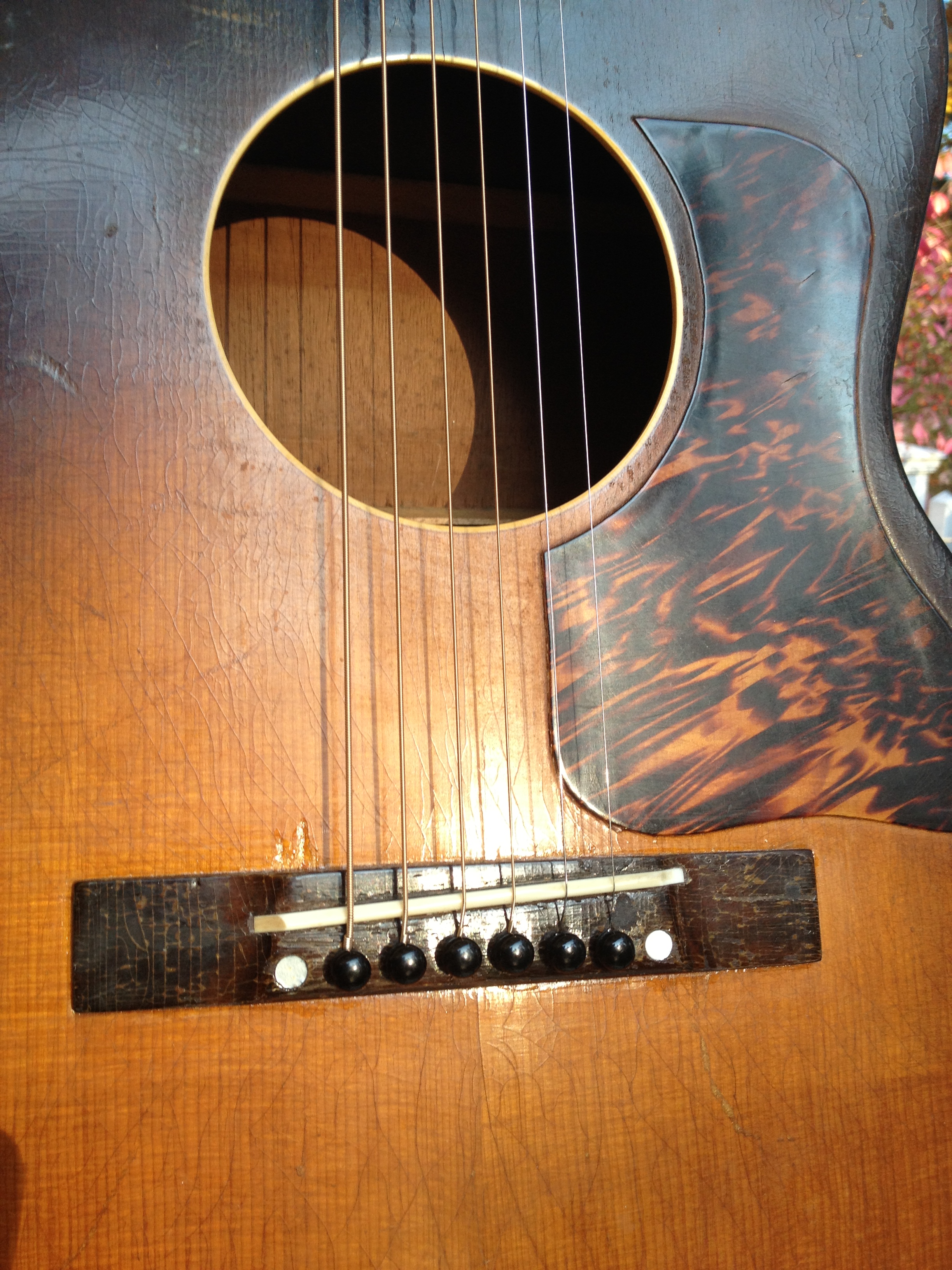 The original finish has that depression era Gibson crazing both top and back but no glaring blemishes and crack free sans a minor backside well repaired hairline, yet it does have some honest pick and capo rash because it’s 70 years old and the real deal.