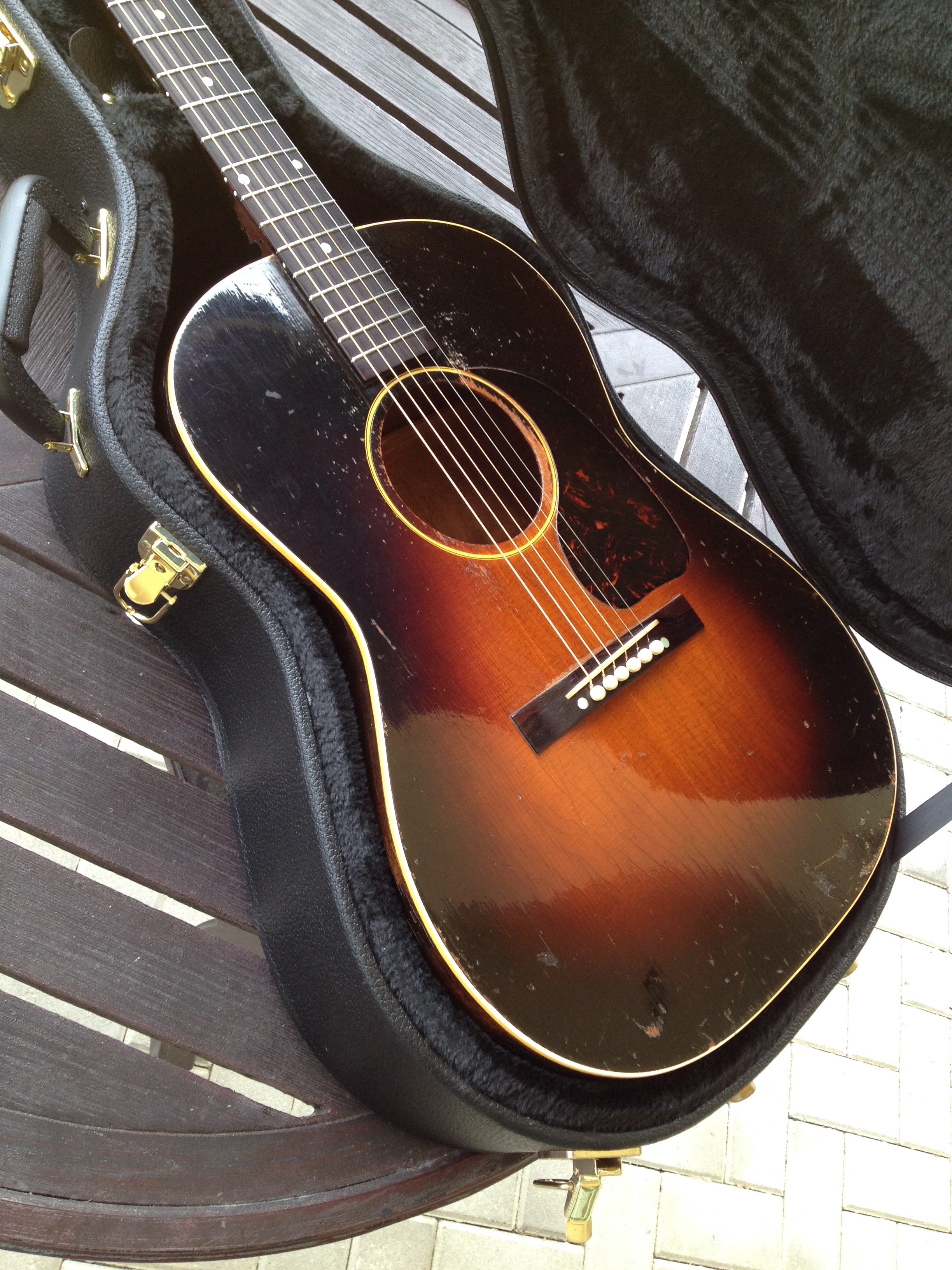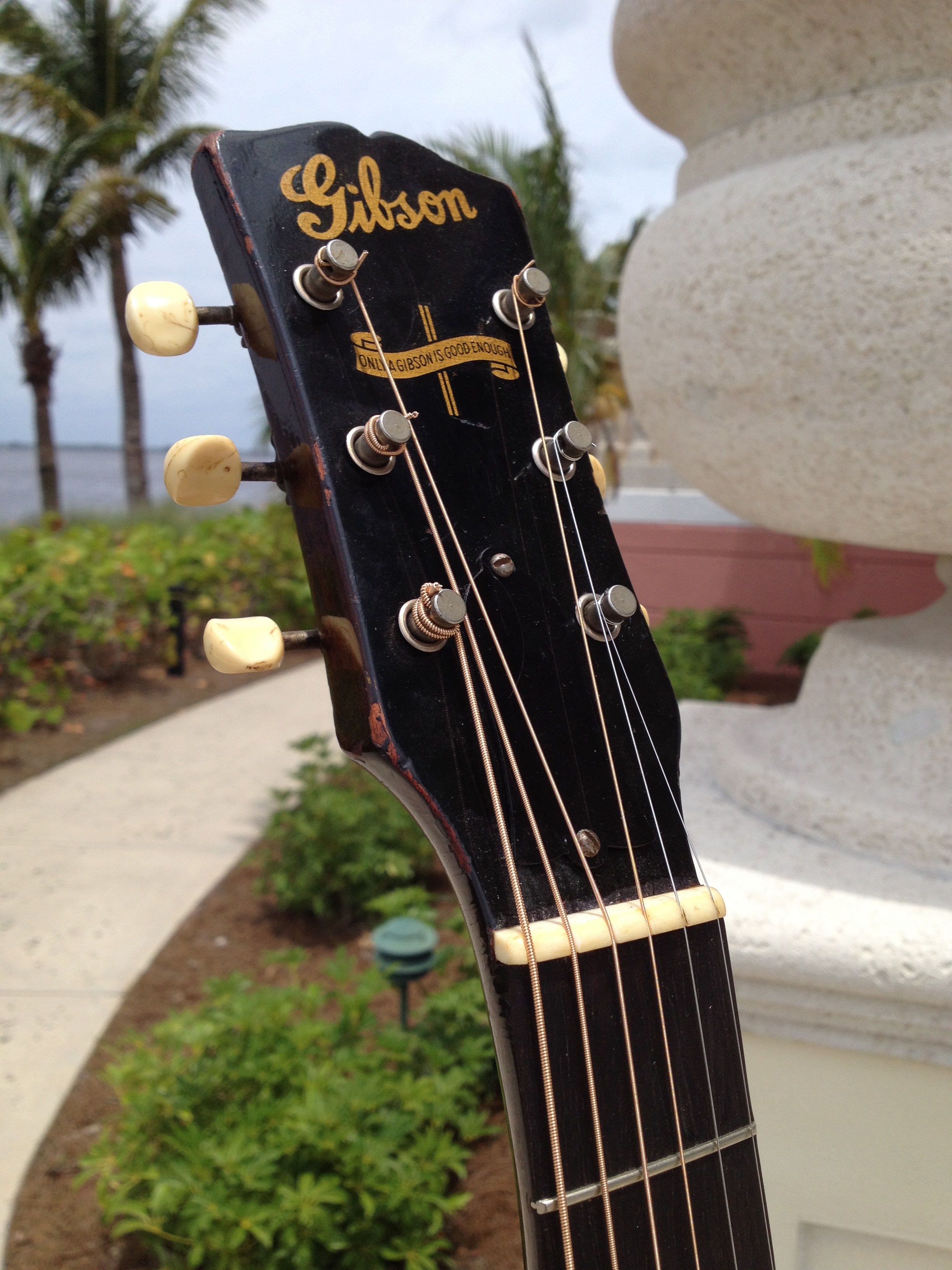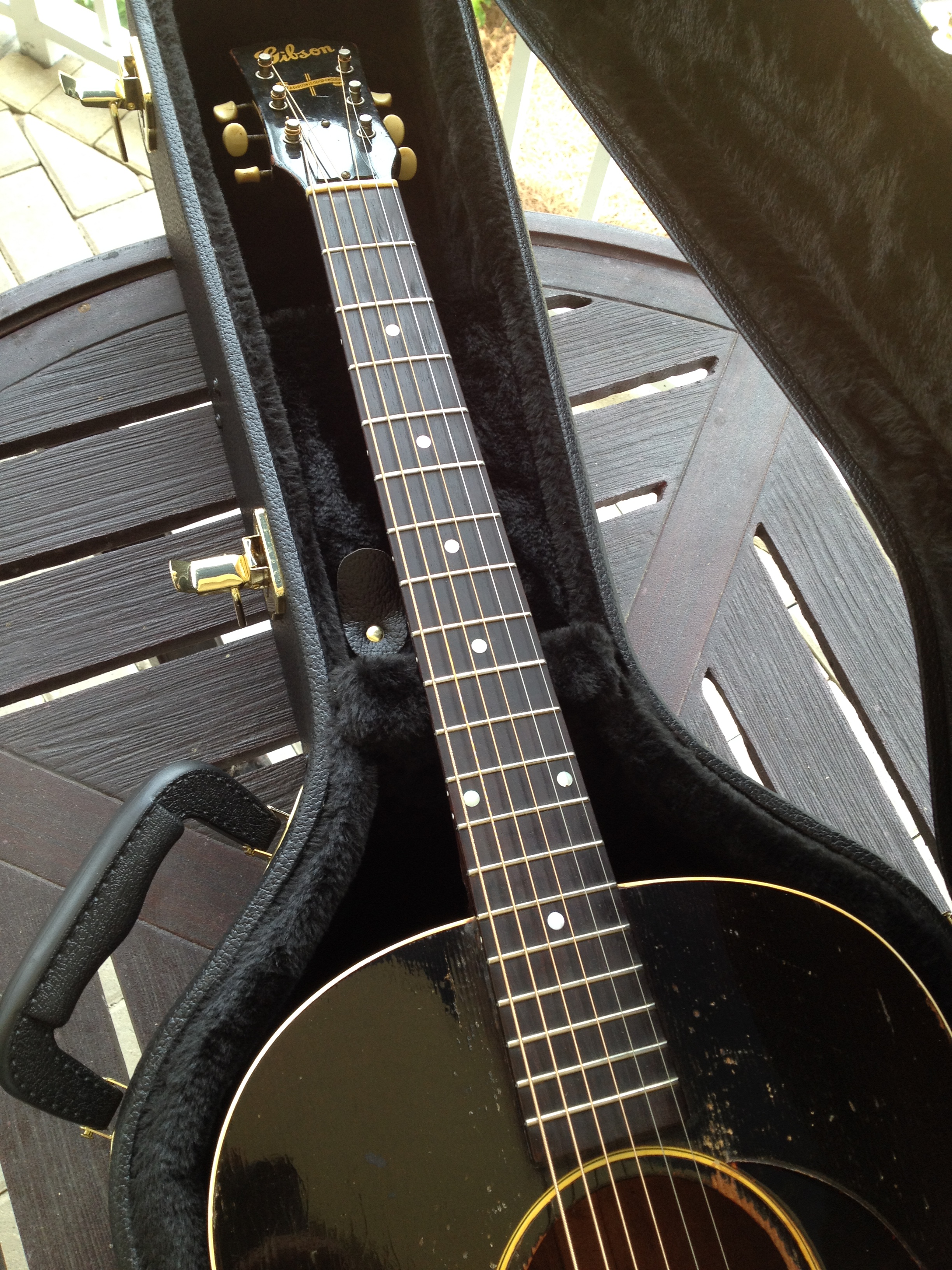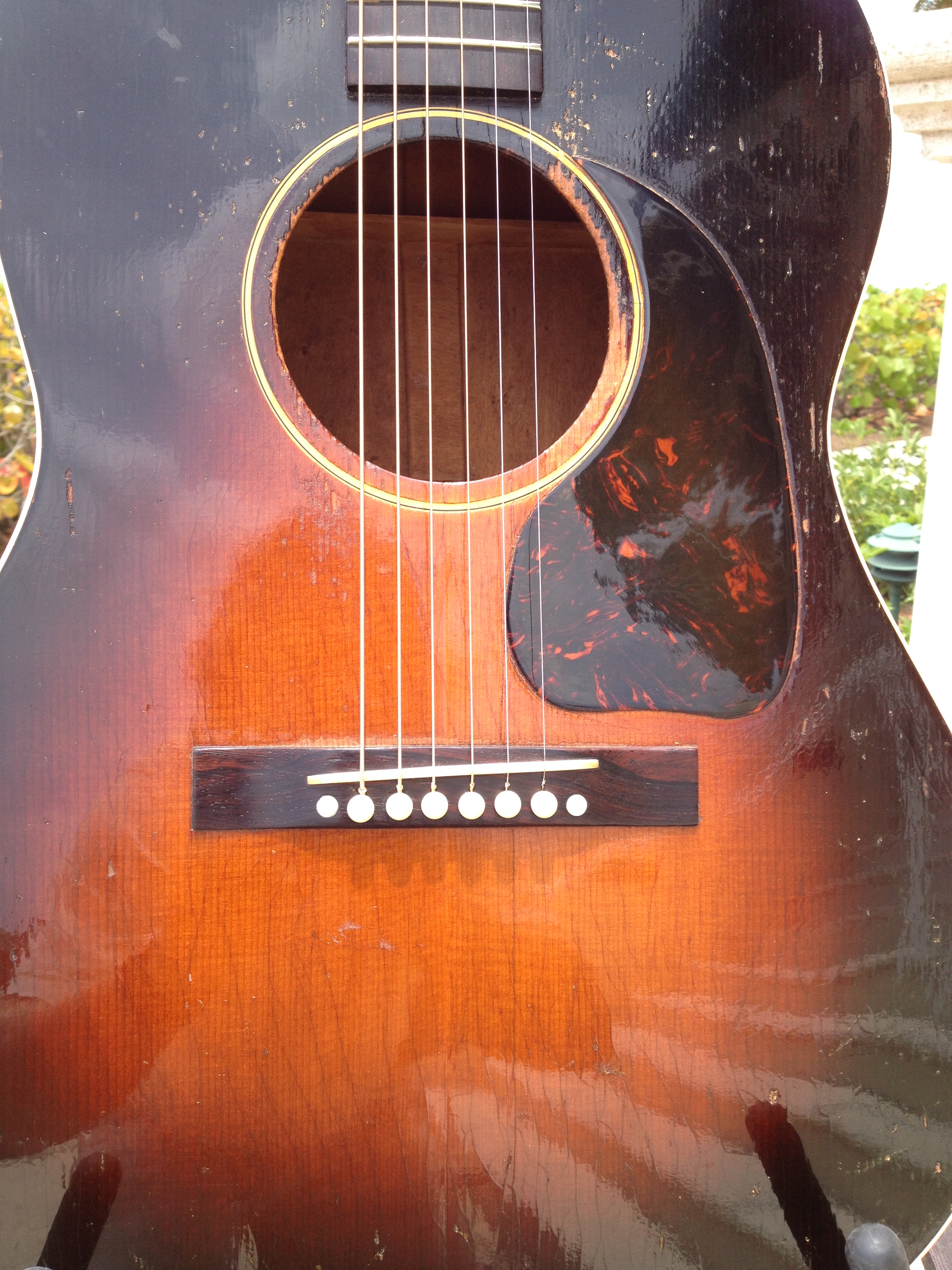 Master luthier, Ross Teigen of Naples Florida painstakingly re glued every brace and tone bar, re set the neck, fabricated a new bone saddle, replaced every fret, re glued the pick guard and cleaned up some old top cracks. The tuners are original and Ross cleaned them and they remain fully functional. The bridge pins are replacement Antique Acoustics replica Gibson pins from Willi Henkes of Germany. No refinish was performed; the top was just buffed out. This guitar is considered original with a proper functional restoration comparable to belt and hose replacements on a vintage car.