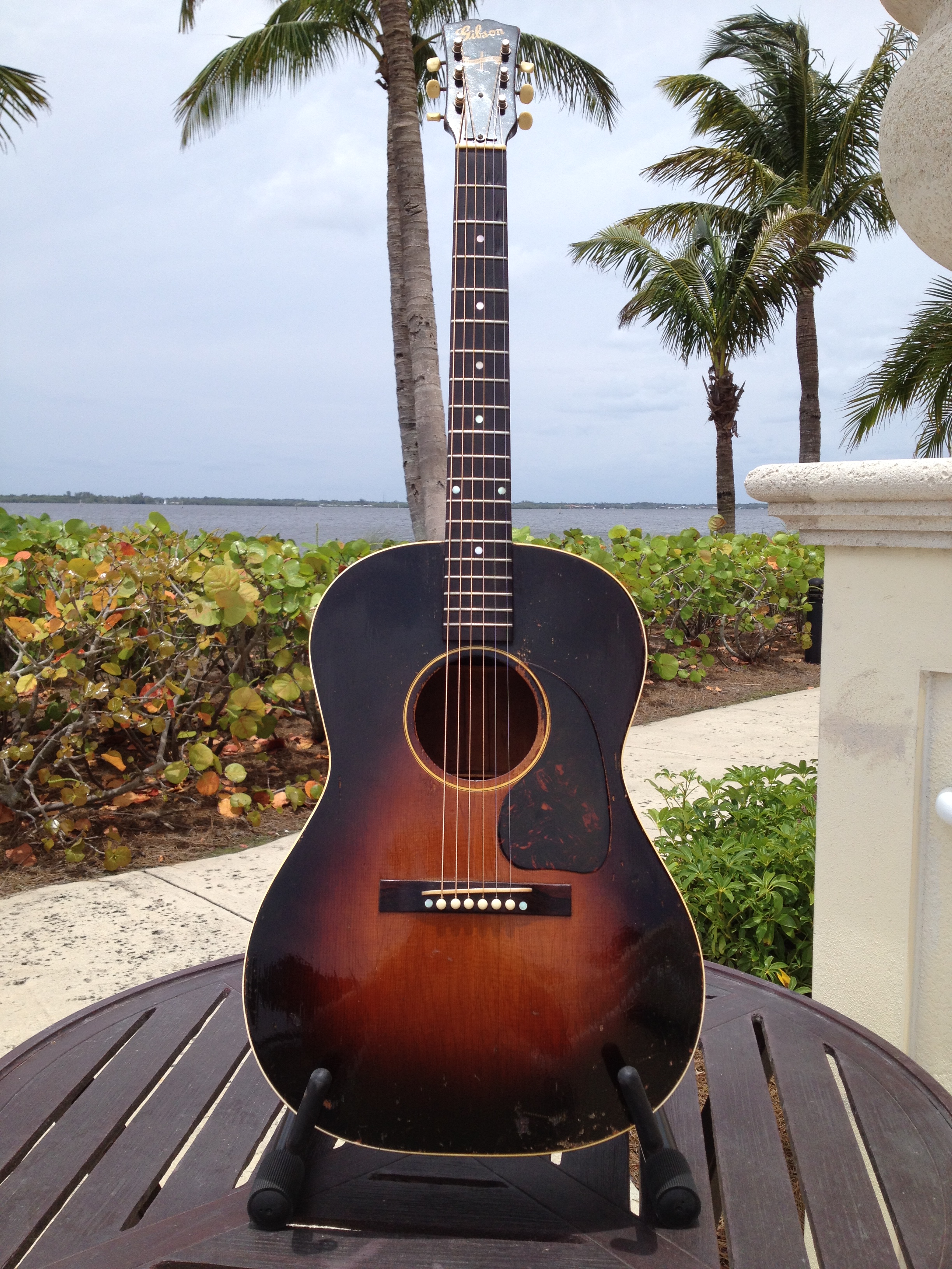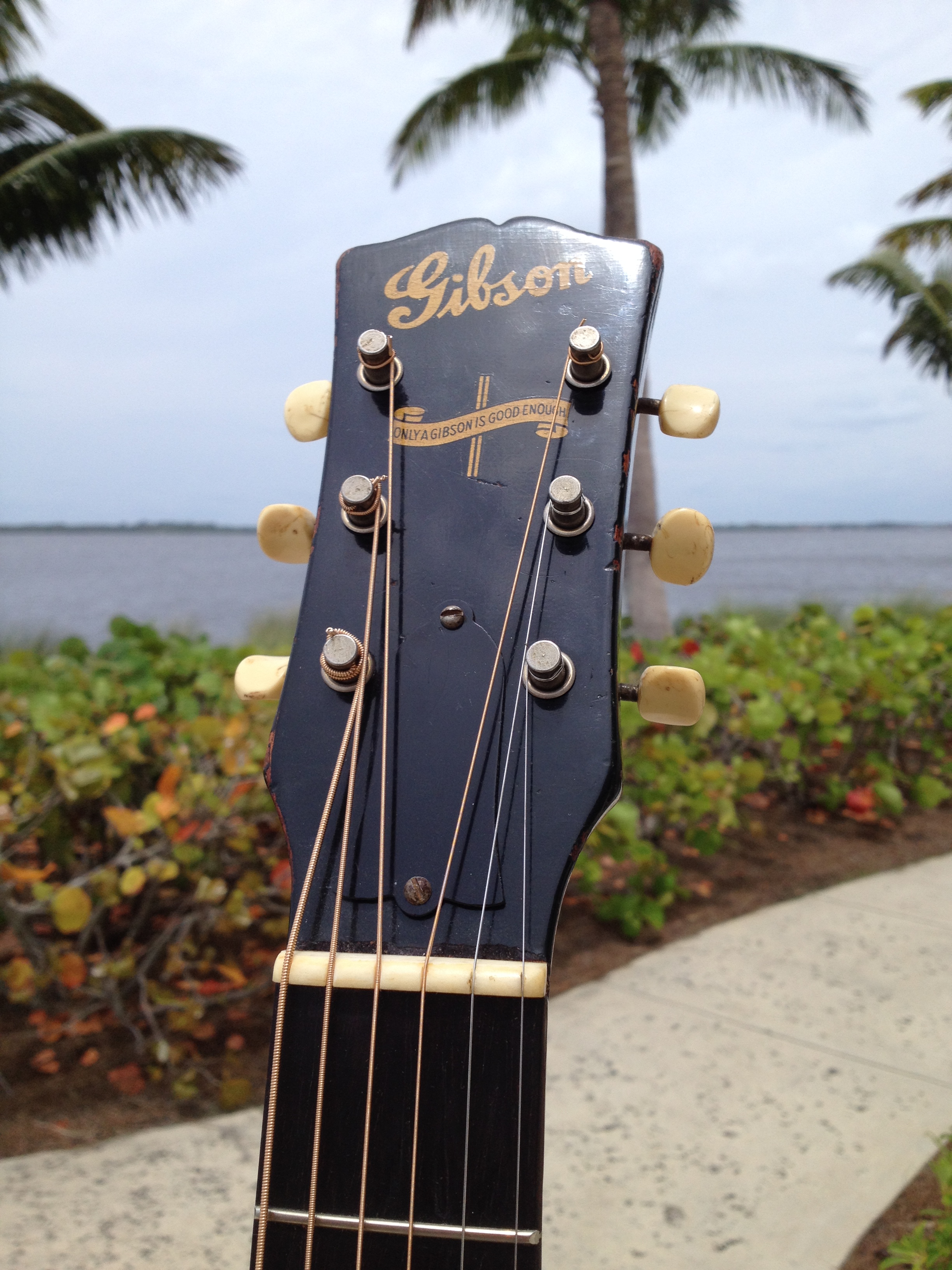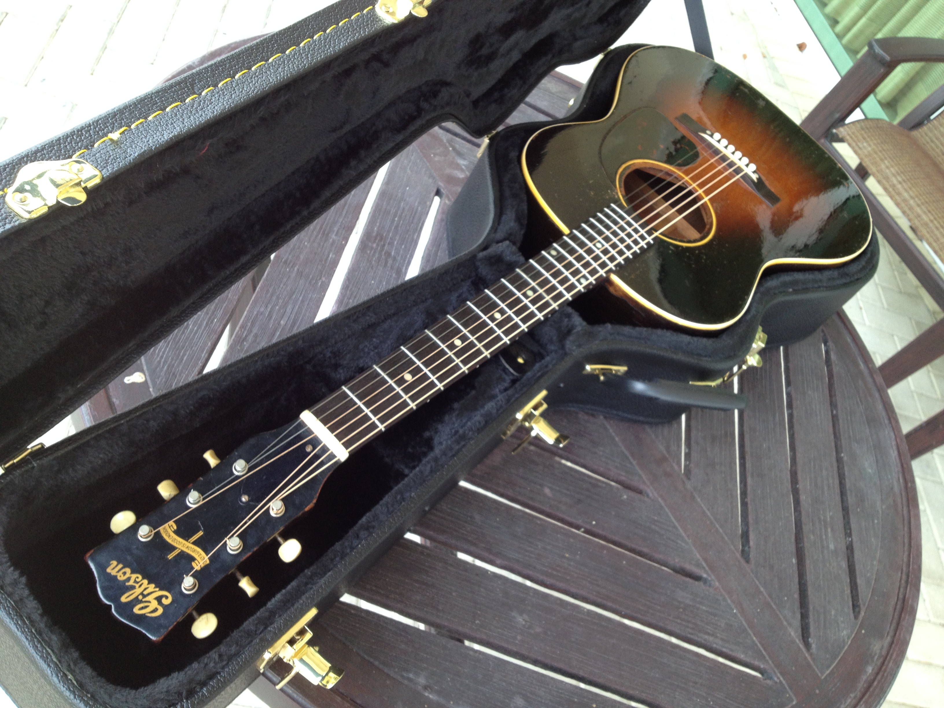 Master luthier, Ross Teigen of Naples Florida painstakingly re glued every brace and tone bar, re set the neck, fabricated a new bone saddle, replaced every fret, re glued the pick guard and cleaned up some old top cracks. The tuners are original and Ross cleaned them and they remain fully functional. The bridge pins are replacement Antique Acoustics replica Gibson pins from Willi Henkes of Germany. No refinish was performed; the top was just buffed out. This guitar is considered original with a proper functional restoration comparable to belt and hose replacements on a vintage car.